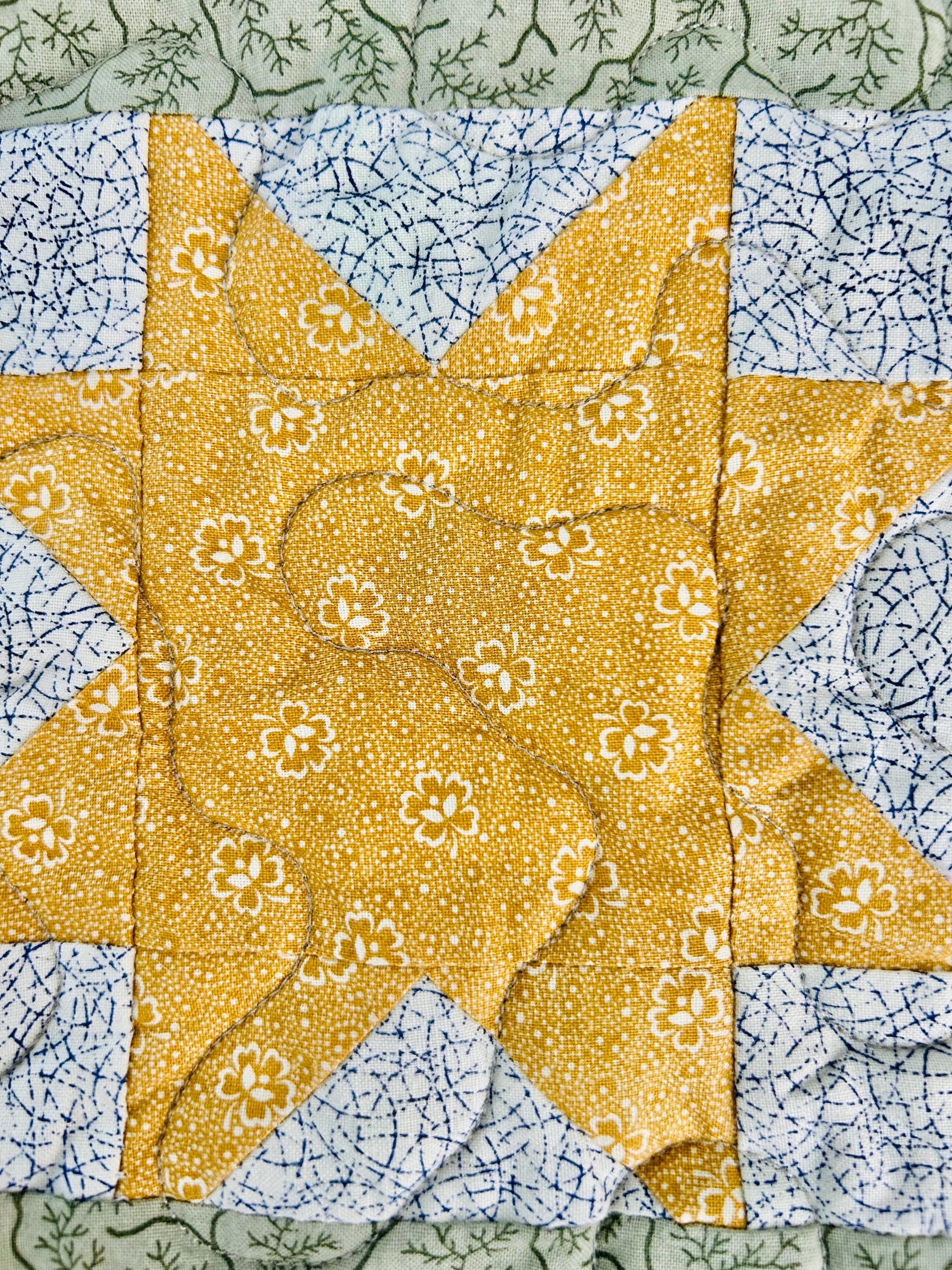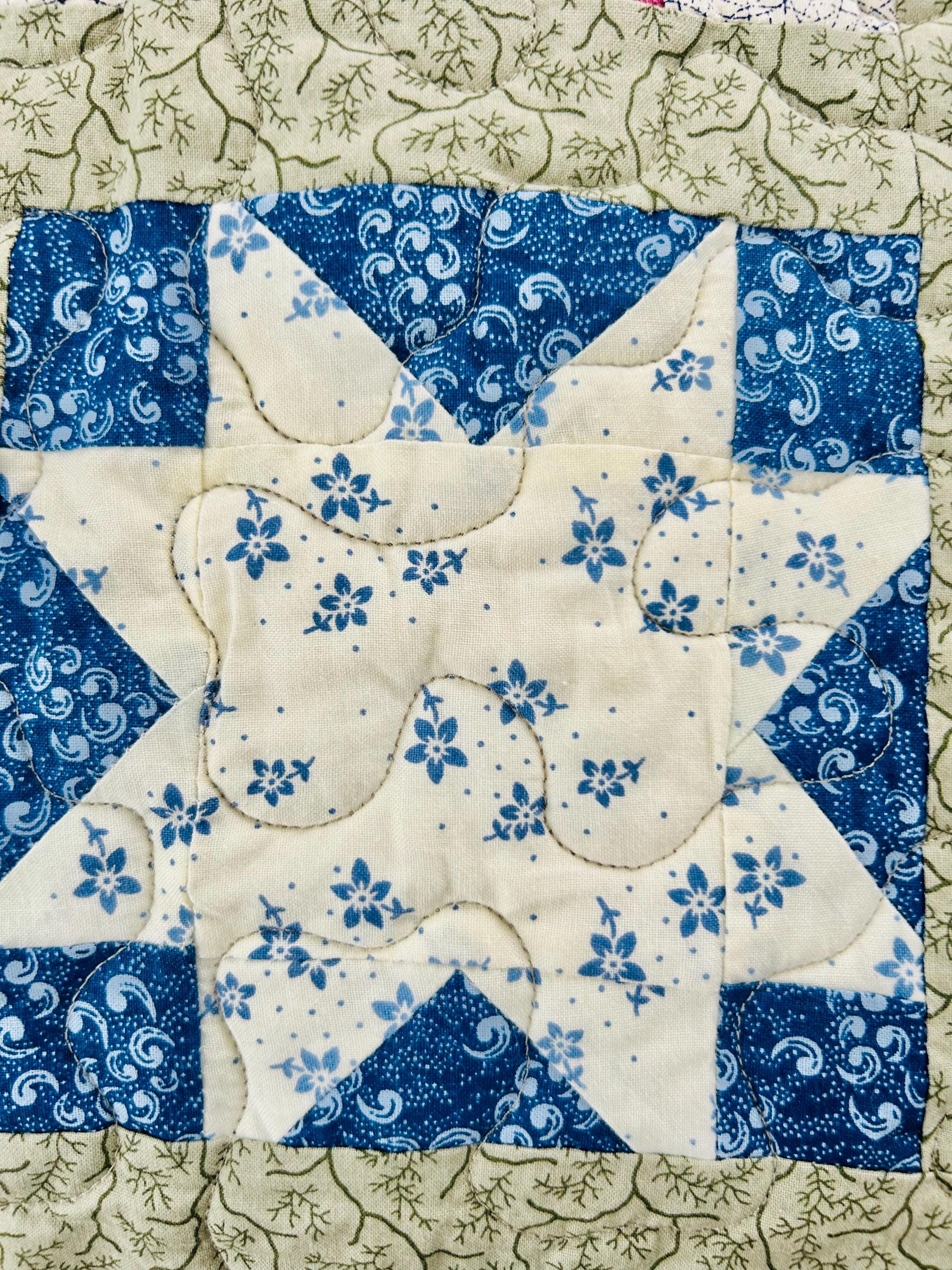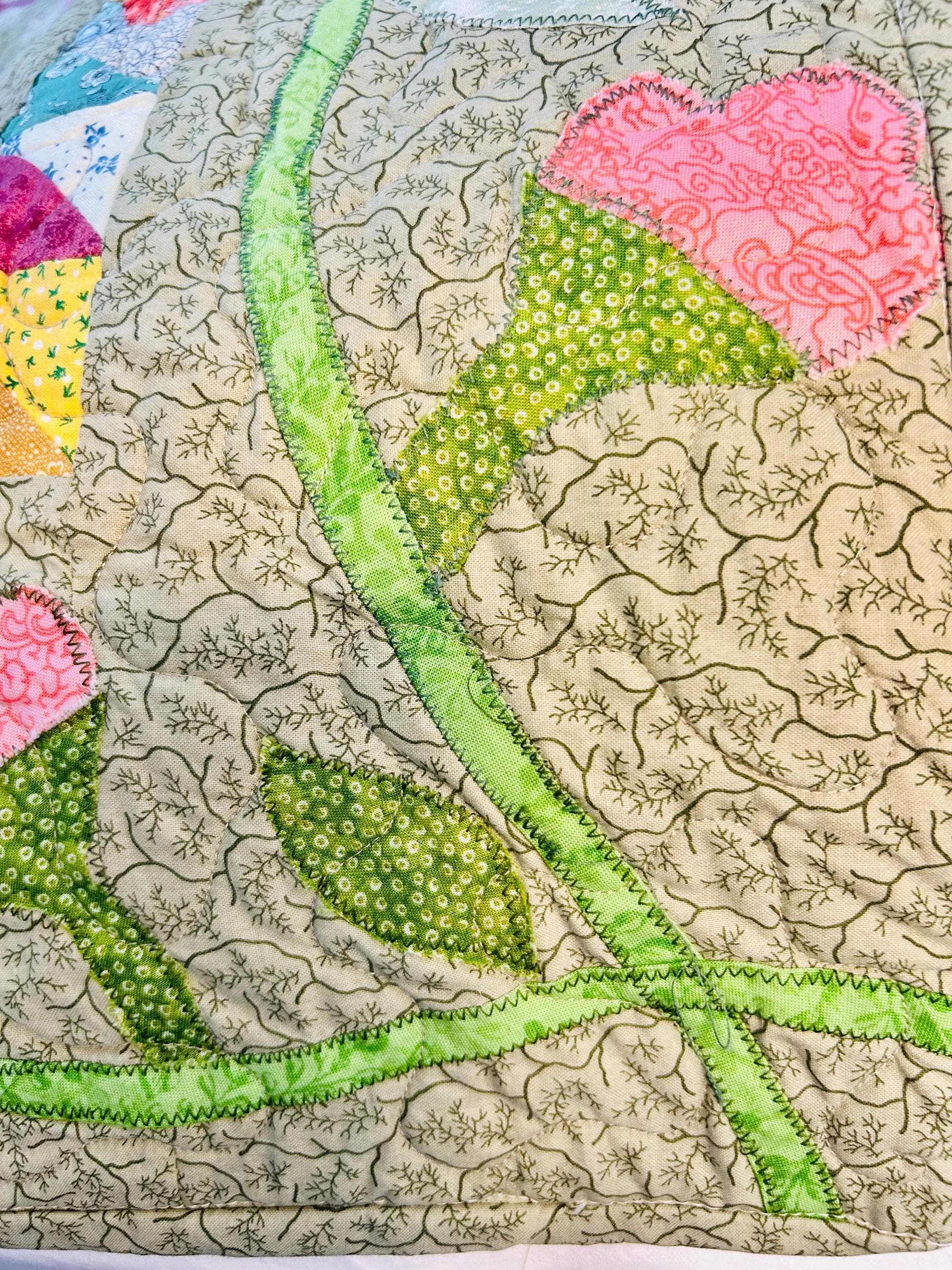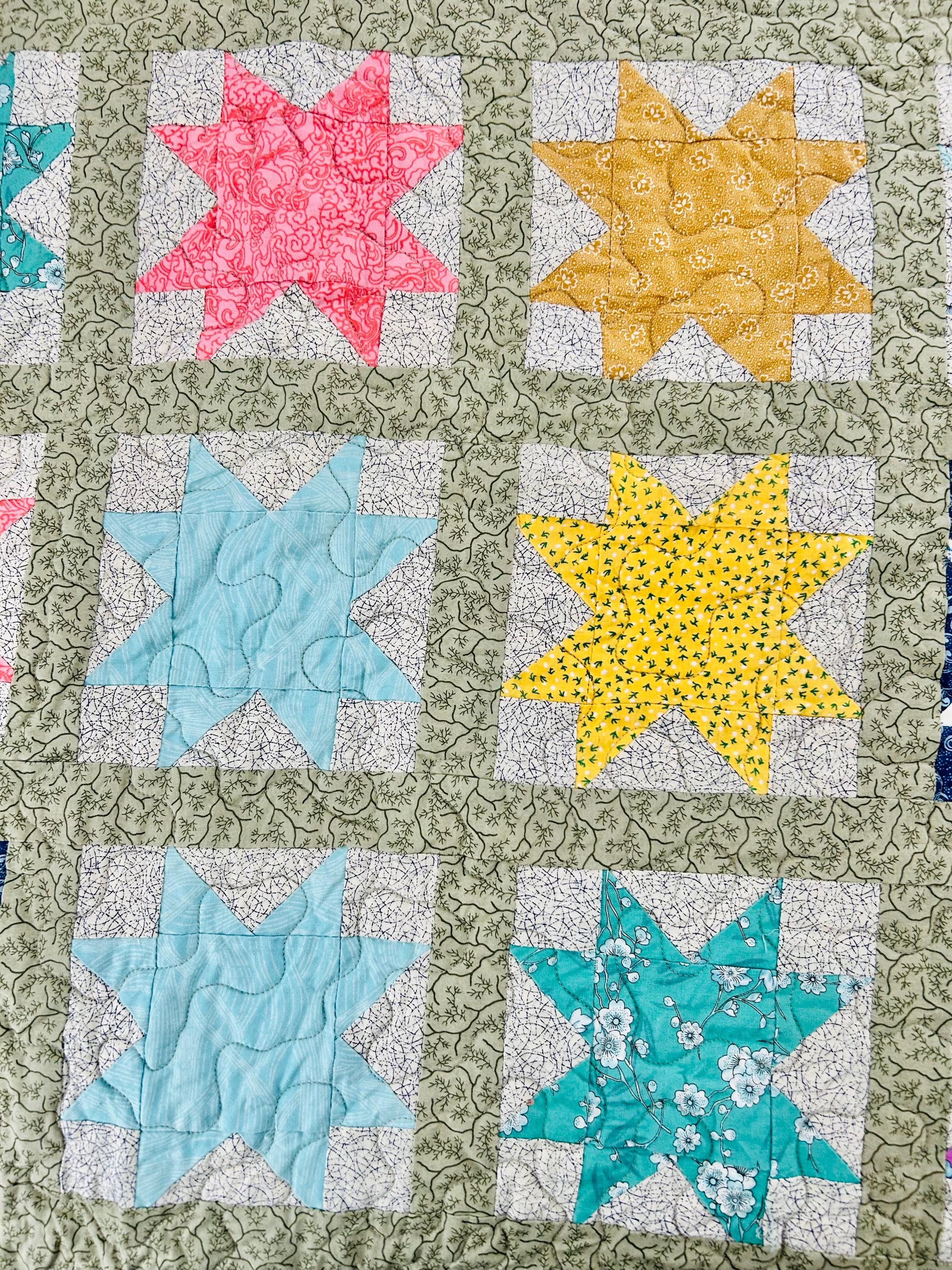 Details • Pattern: Ohio Star • Era: 1990s • Size: 62” x 84” • Construction: Machine pieced • Quilting: Expertly long-arm quilted • Border: Pieced sawtooth border with serpentine appliqué floral outer border • Batting: lightweight • Condition: Excellent vintage condition with bright colors and no issues noted