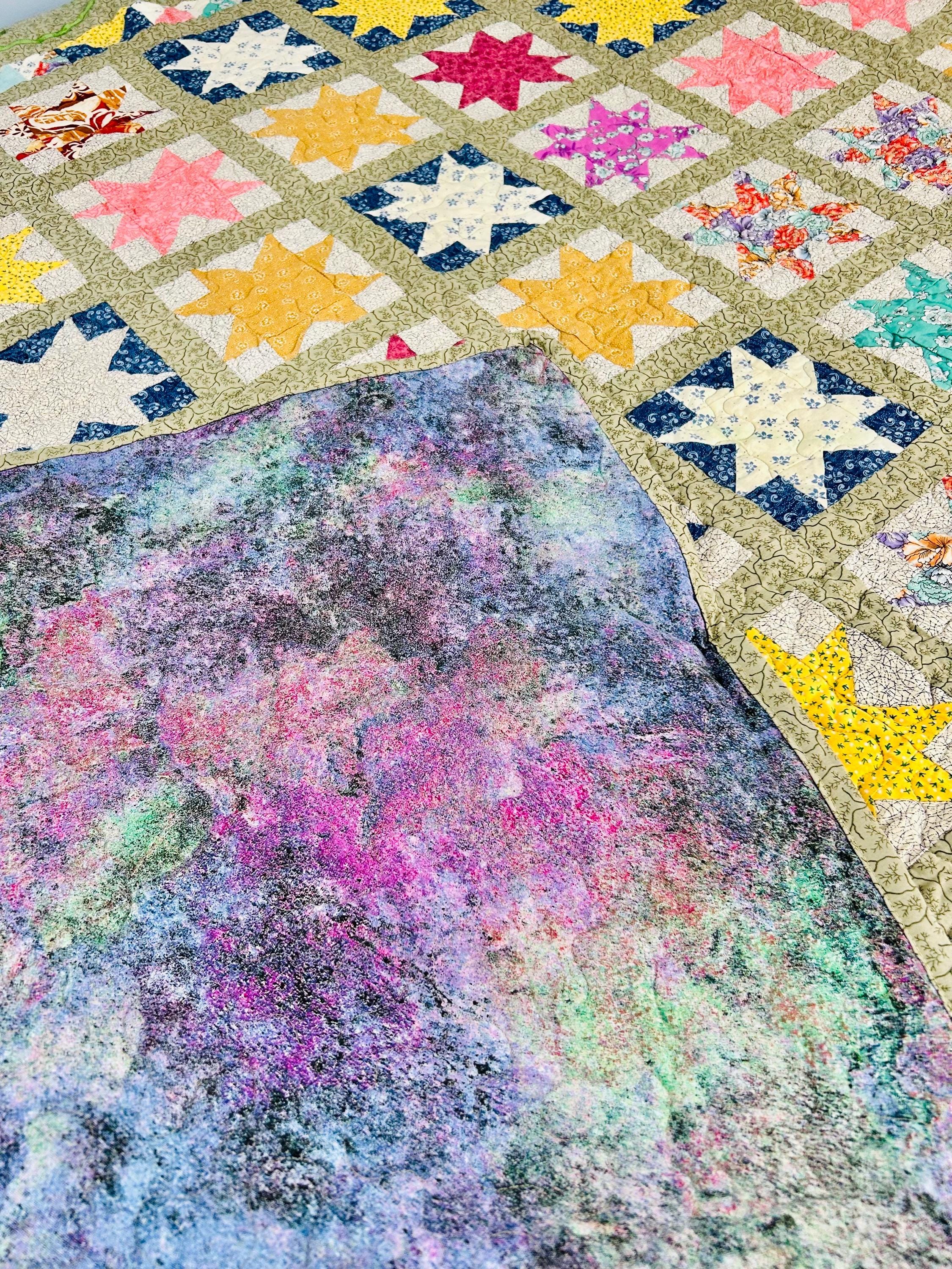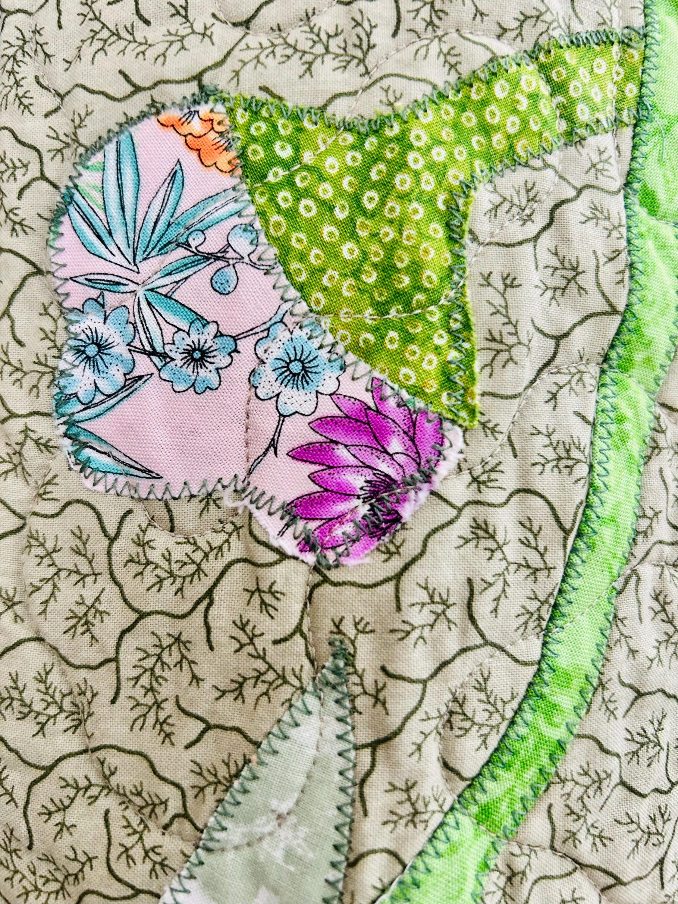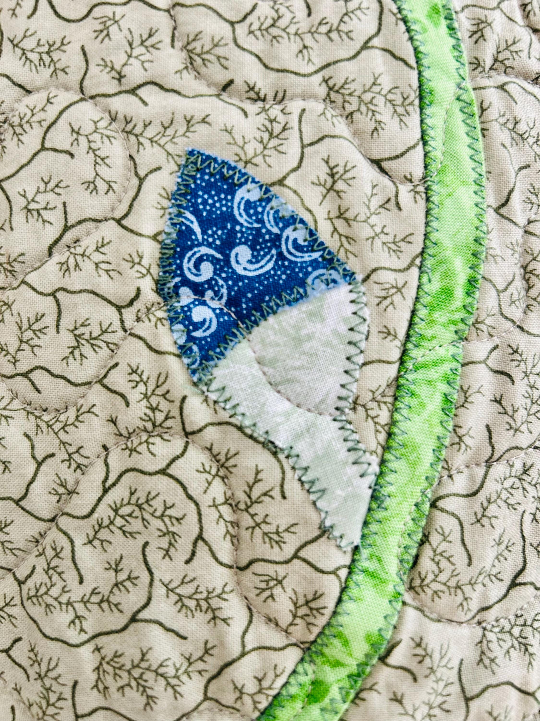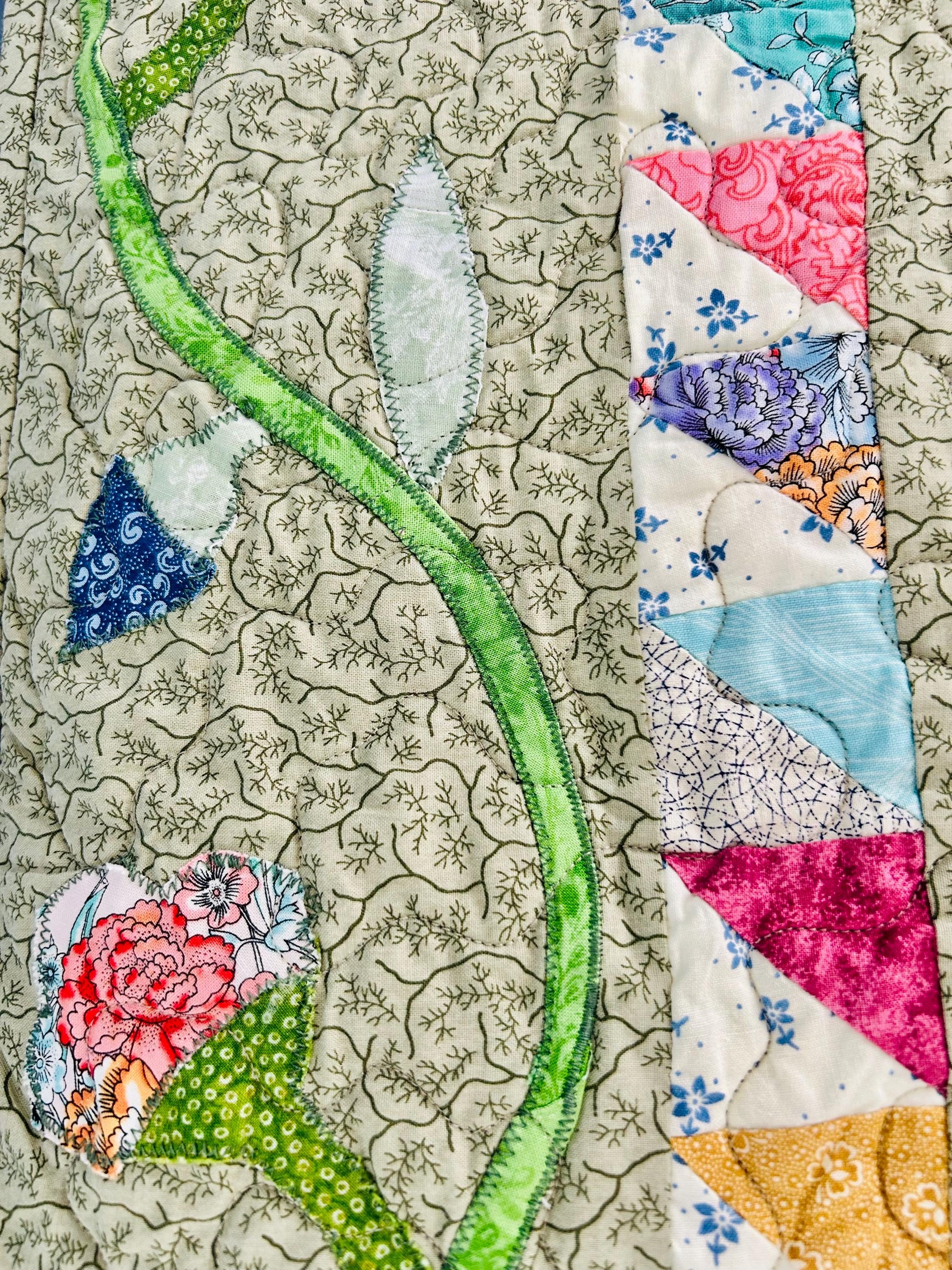 The back is a multi-color cotton while the binding is the same sage green fabric as the front border and has been machine-stitched to both sides. The batting is lightweight.