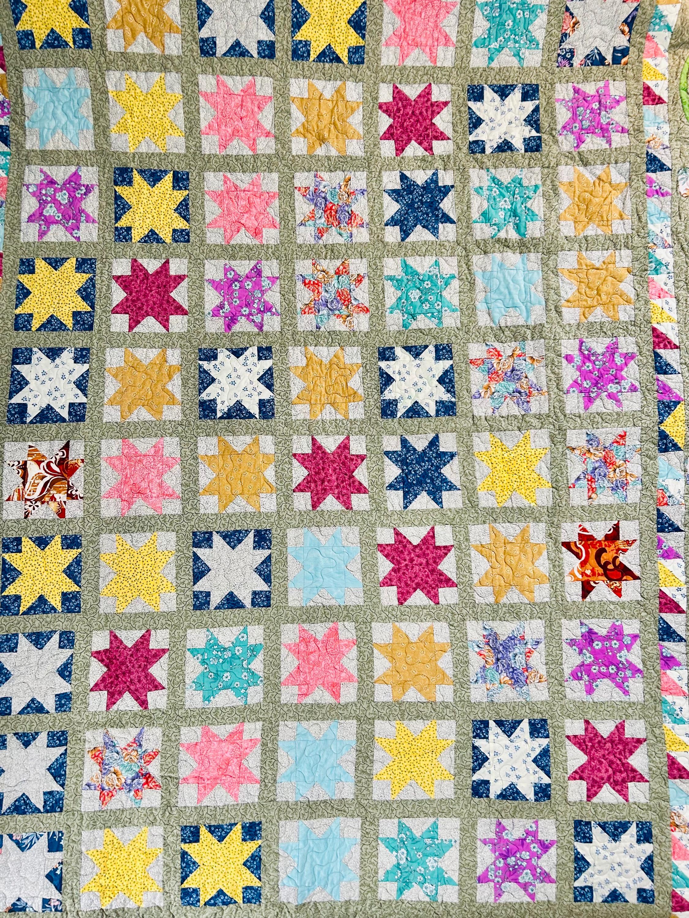 This cheerful and beautifully coordinated 1990s Ohio Star quilt blends traditional patchwork with modern finishing. Entirely long-arm quilted in curves and curlicues, it features a lively grid of bright Ohio Star blocks set against a sage green background, finished with a four-sided sawtooth and serpentine floral border.