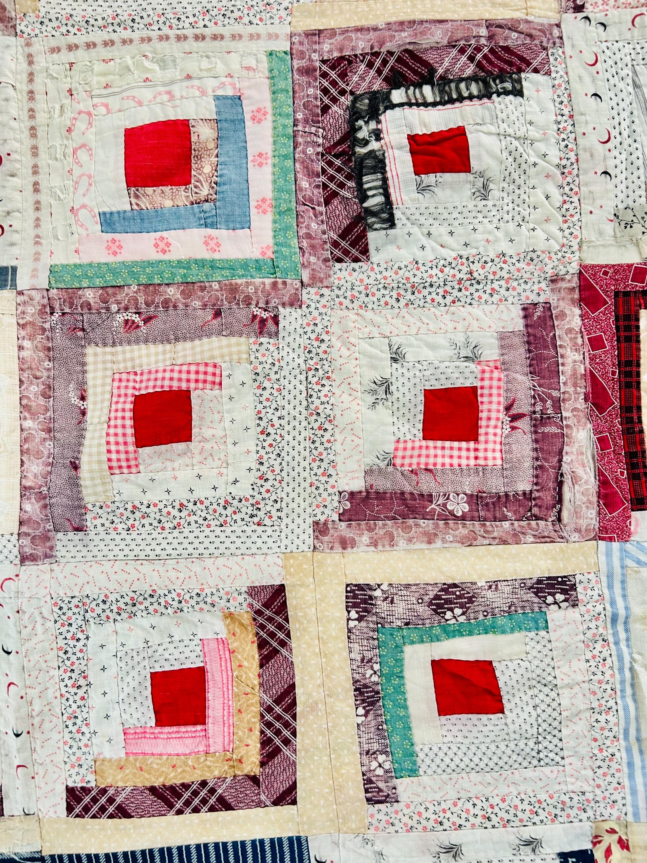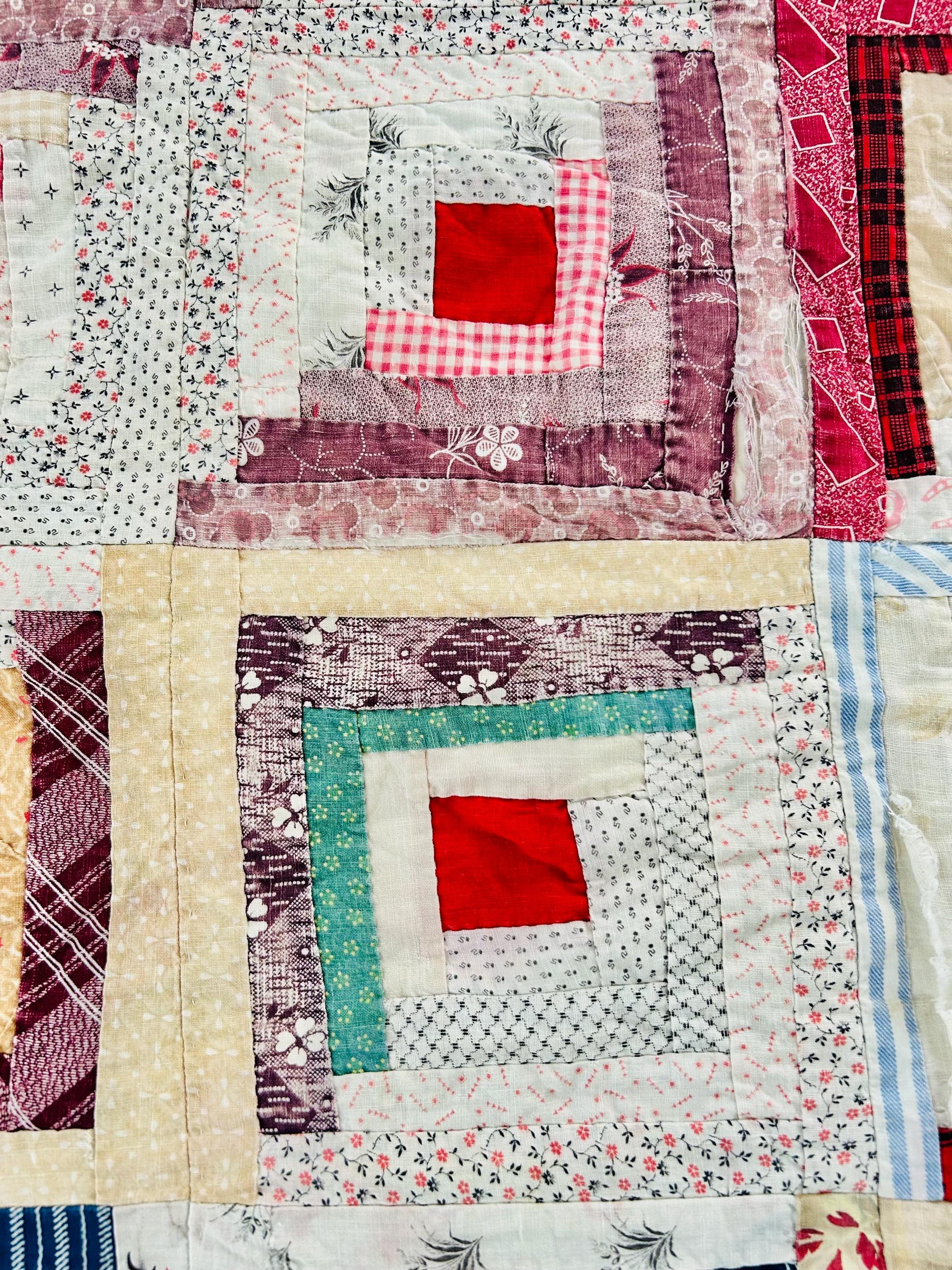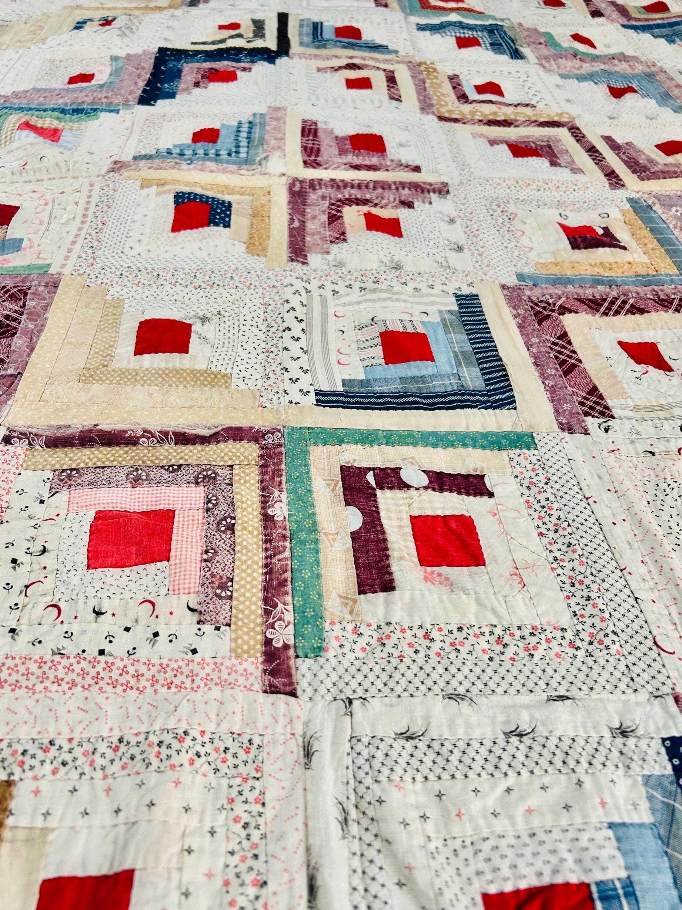 This is a beautiful antique Log Cabin quilt in the classic Barn Raising layout, entirely foundation-pieced, hand-pieced and hand-quilted. It uses a wonderful array of late 19th-century scrap fabrics all surrounding vibrant Turkey red centers. Specifically, the fabrics are late 19th century cottons, including: • Turkey red centers • Indigo and cadet blues • Double pinks and cinnamon pinks • Small-scale shirting prints • Early black-and-white mourning prints • Plaids and woven stripes • Plum, brown, and burgundy prints typical of the 1880s–1900 • Delicate light-ground florals • Early geometrics and dotted prints