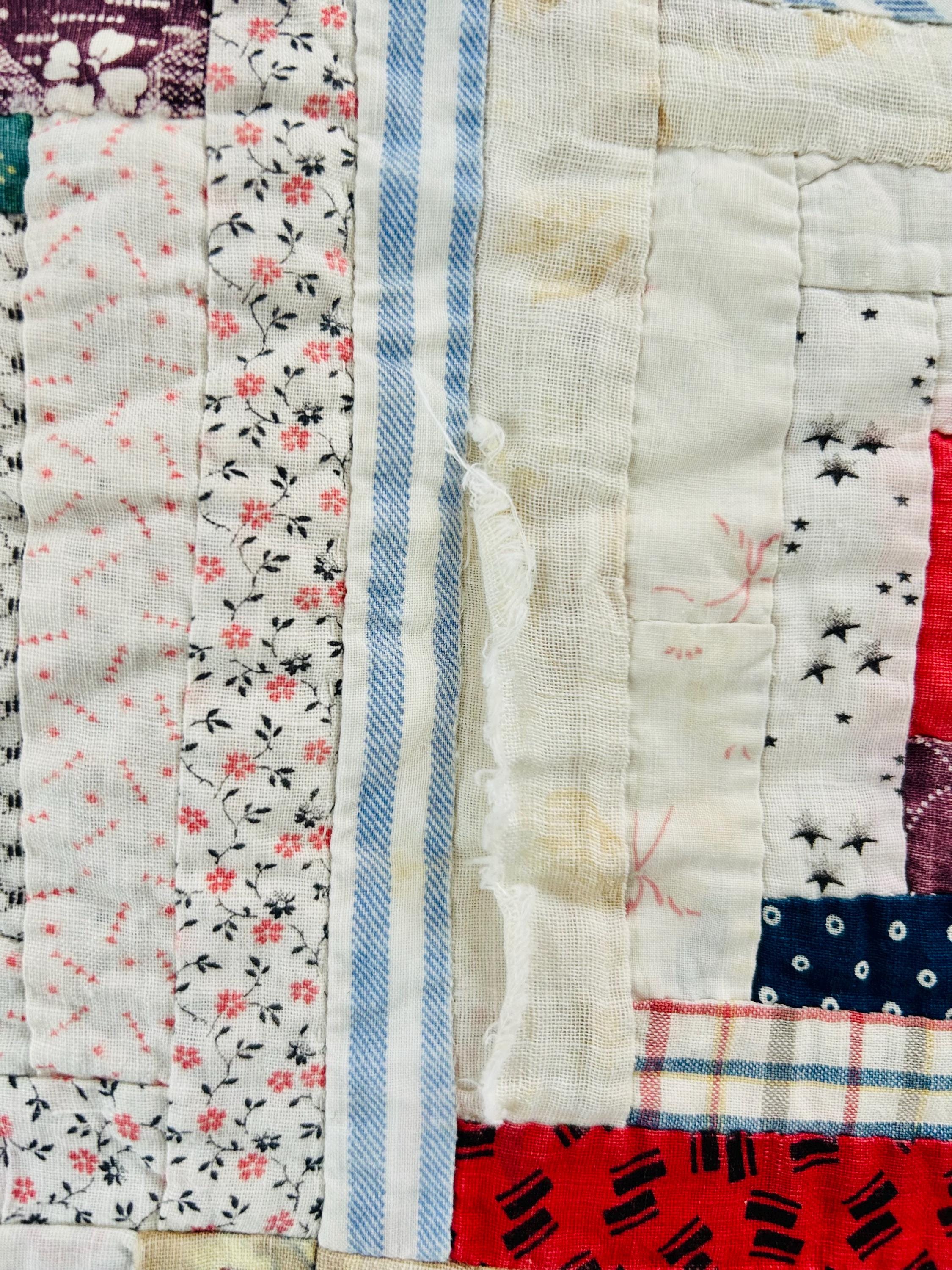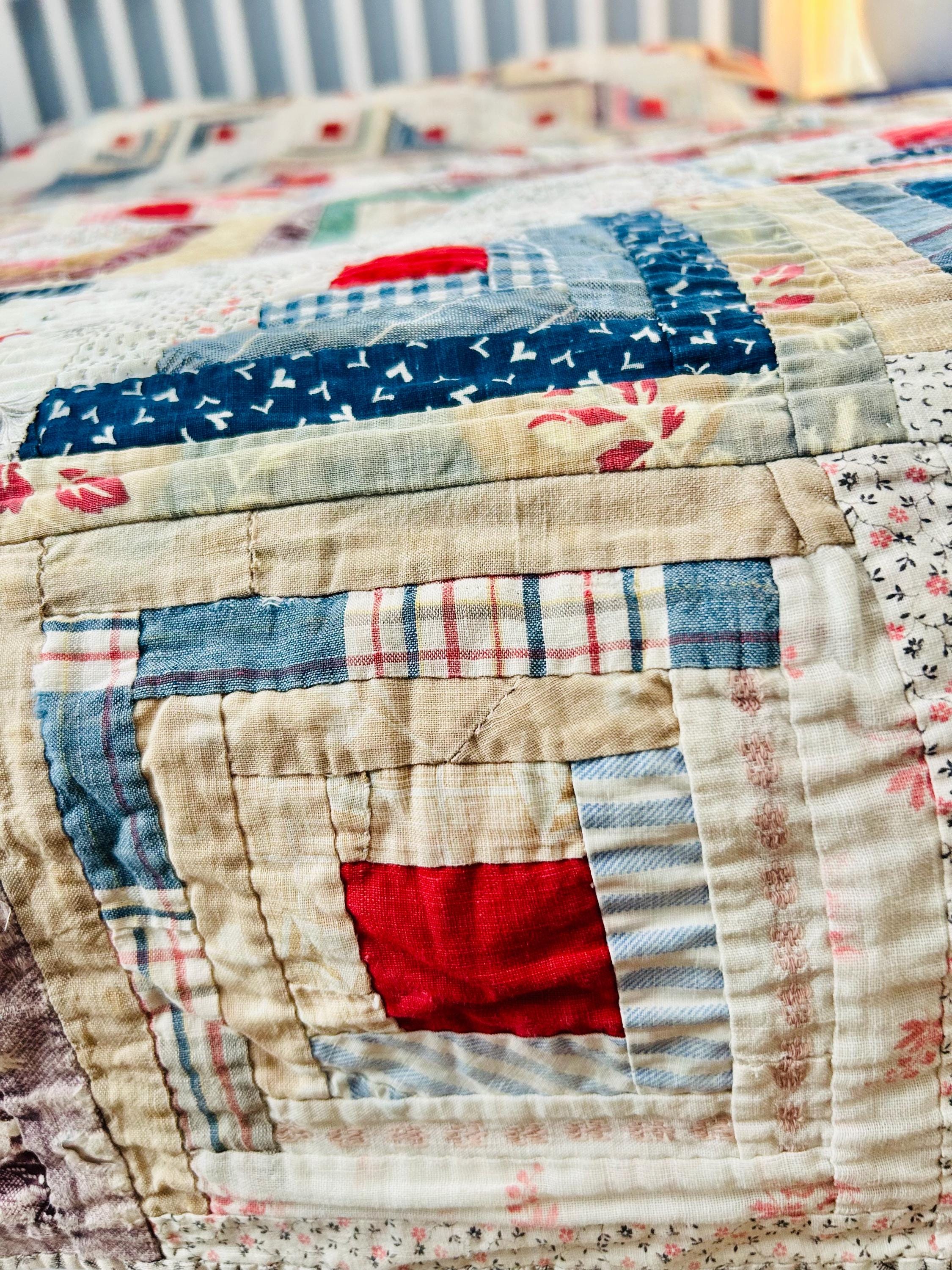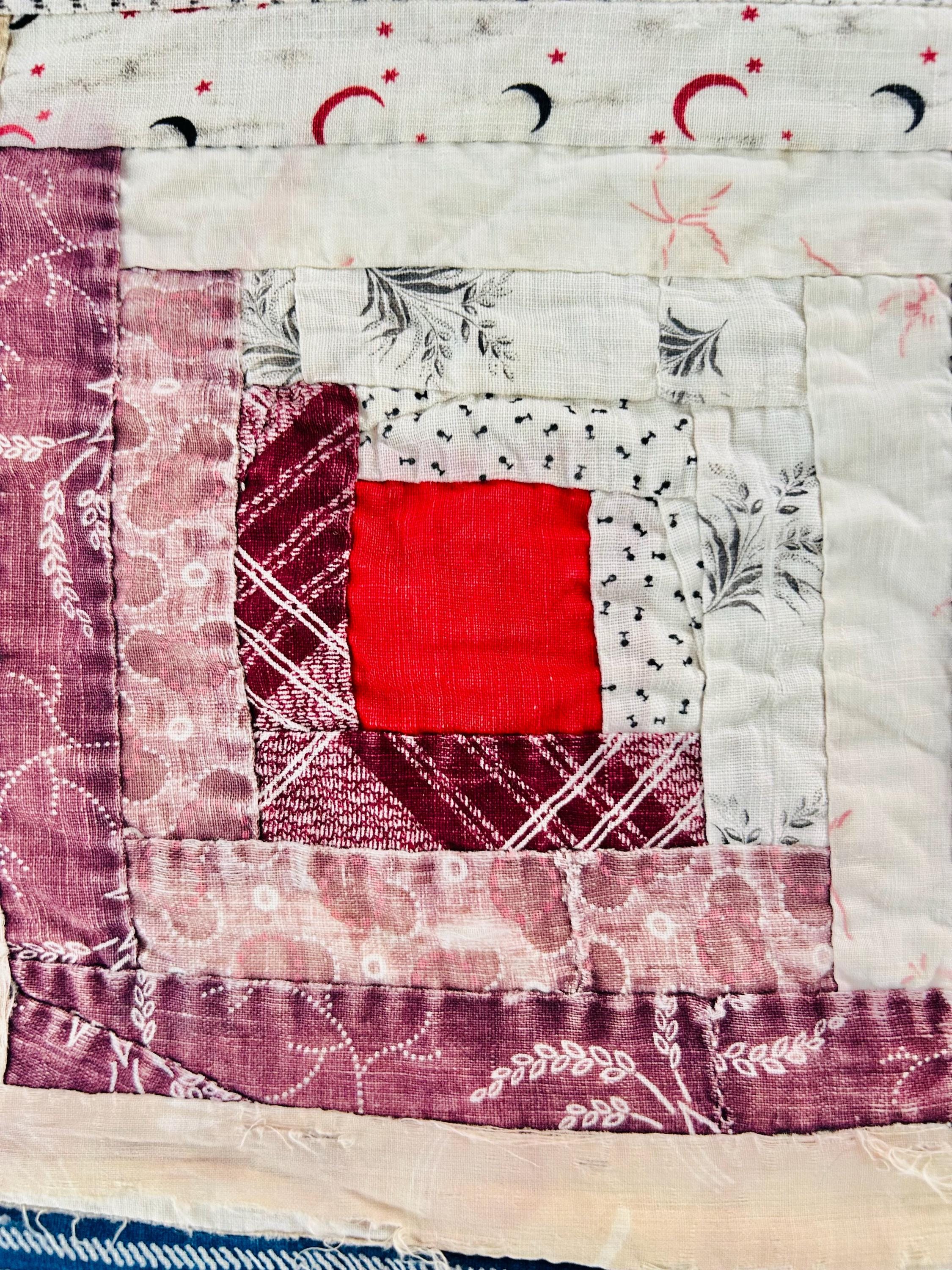 This is a beautiful antique Log Cabin quilt in the classic Barn Raising layout, entirely foundation-pieced, hand-pieced and hand-quilted. It uses a wonderful array of late 19th-century scrap fabrics all surrounding vibrant Turkey red centers. Specifically, the fabrics are late 19th century cottons, including: • Turkey red centers • Indigo and cadet blues • Double pinks and cinnamon pinks • Small-scale shirting prints • Early black-and-white mourning prints • Plaids and woven stripes • Plum, brown, and burgundy prints typical of the 1880s–1900 • Delicate light-ground florals • Early geometrics and dotted prints
