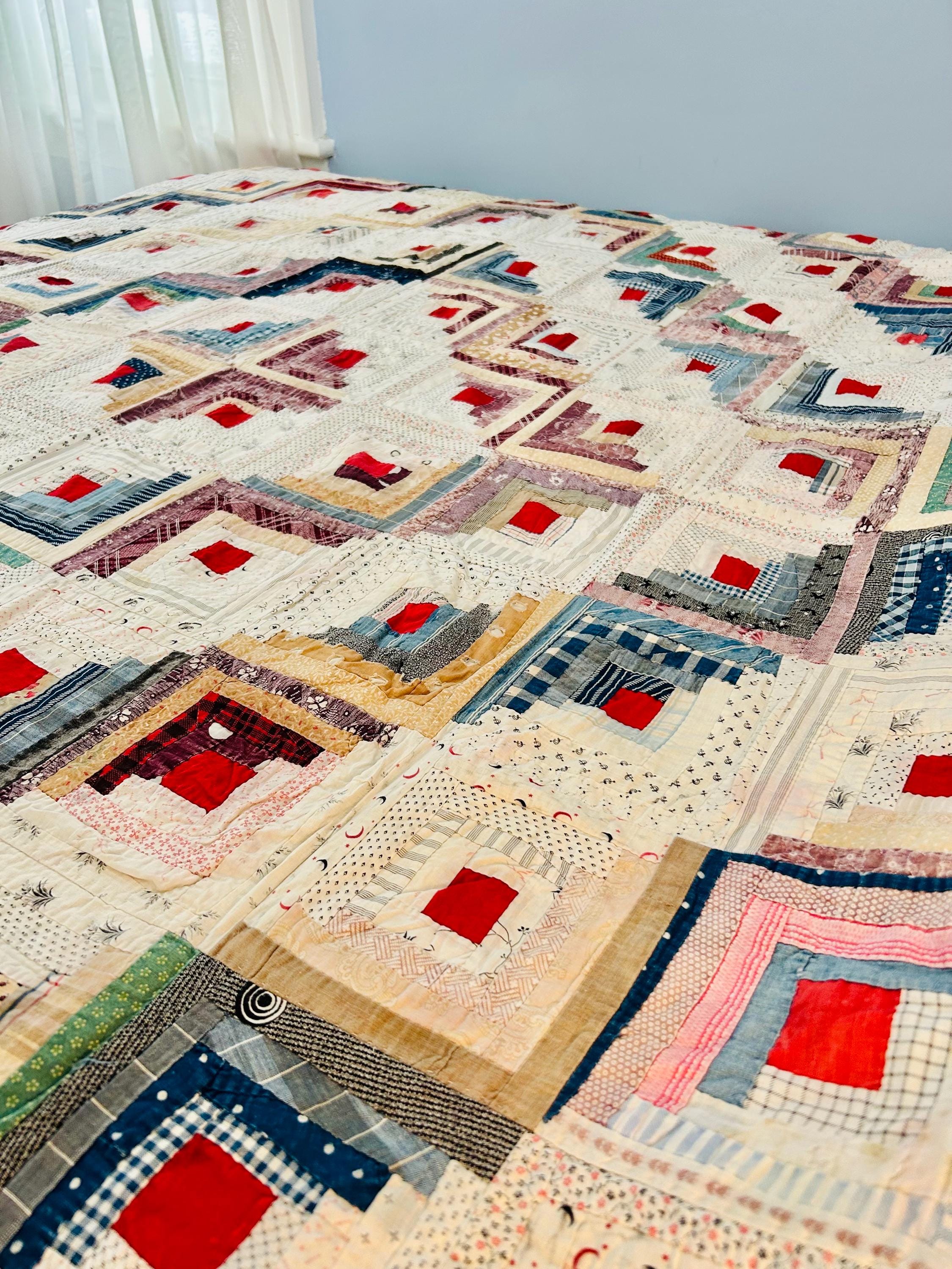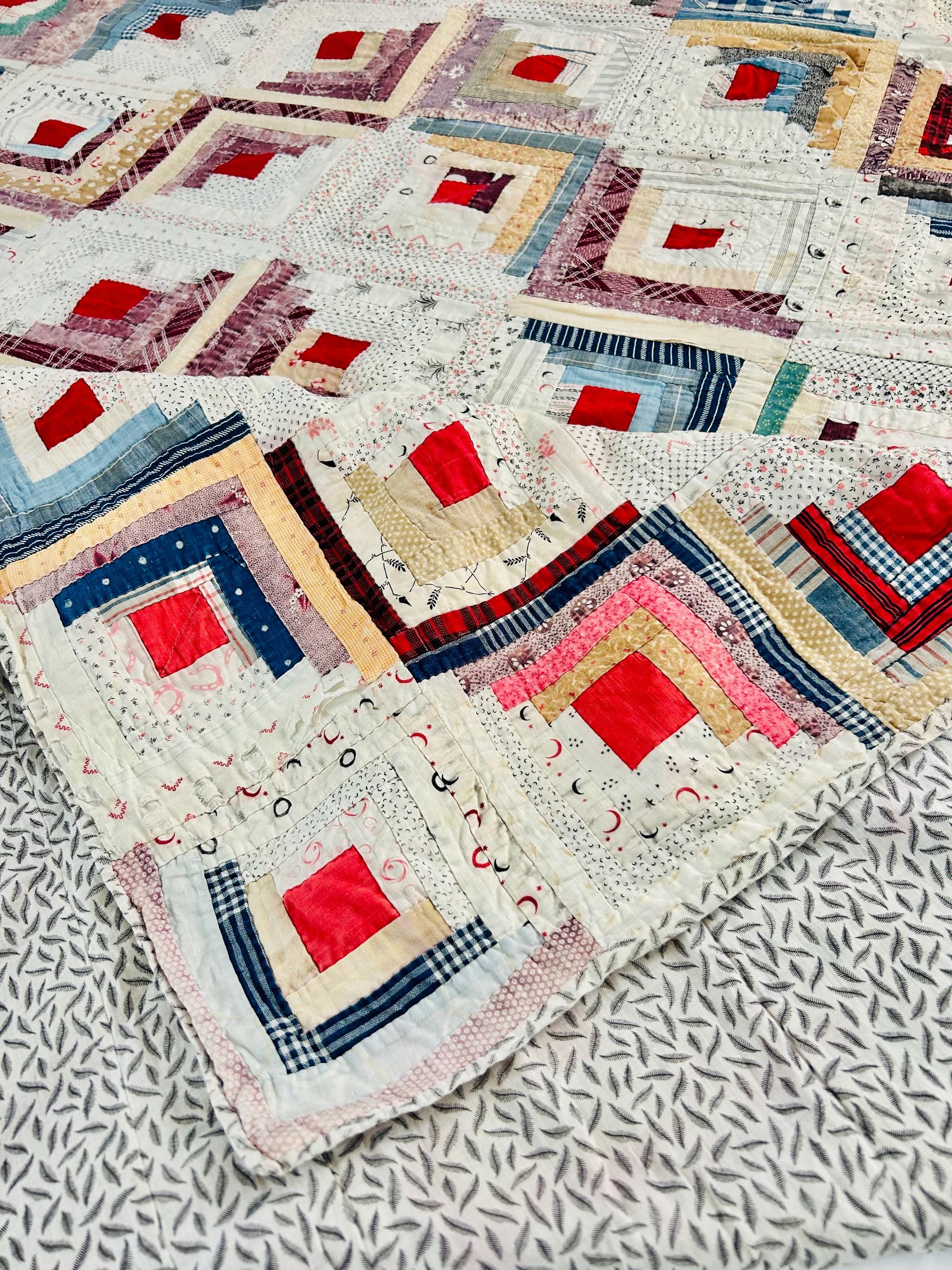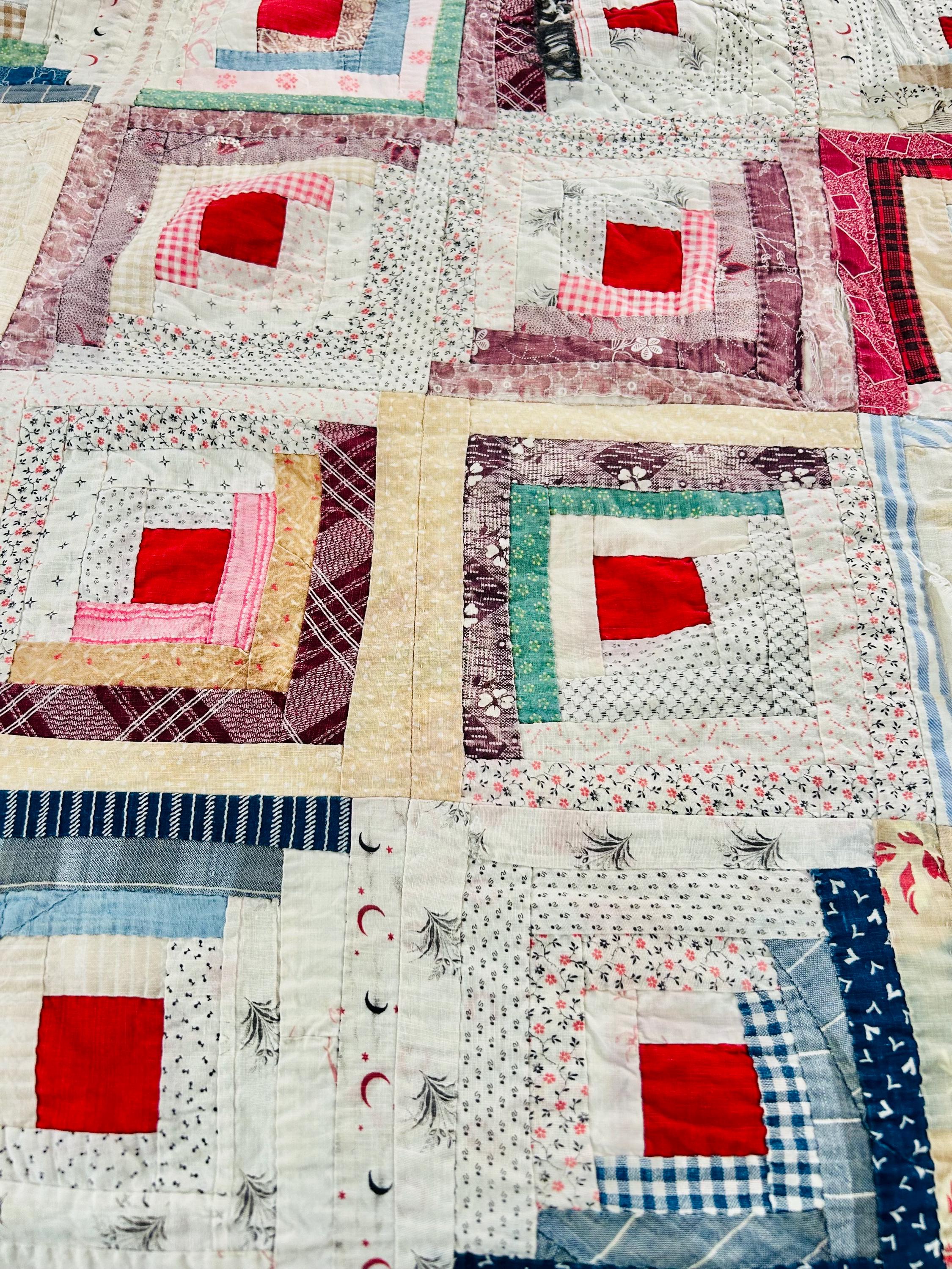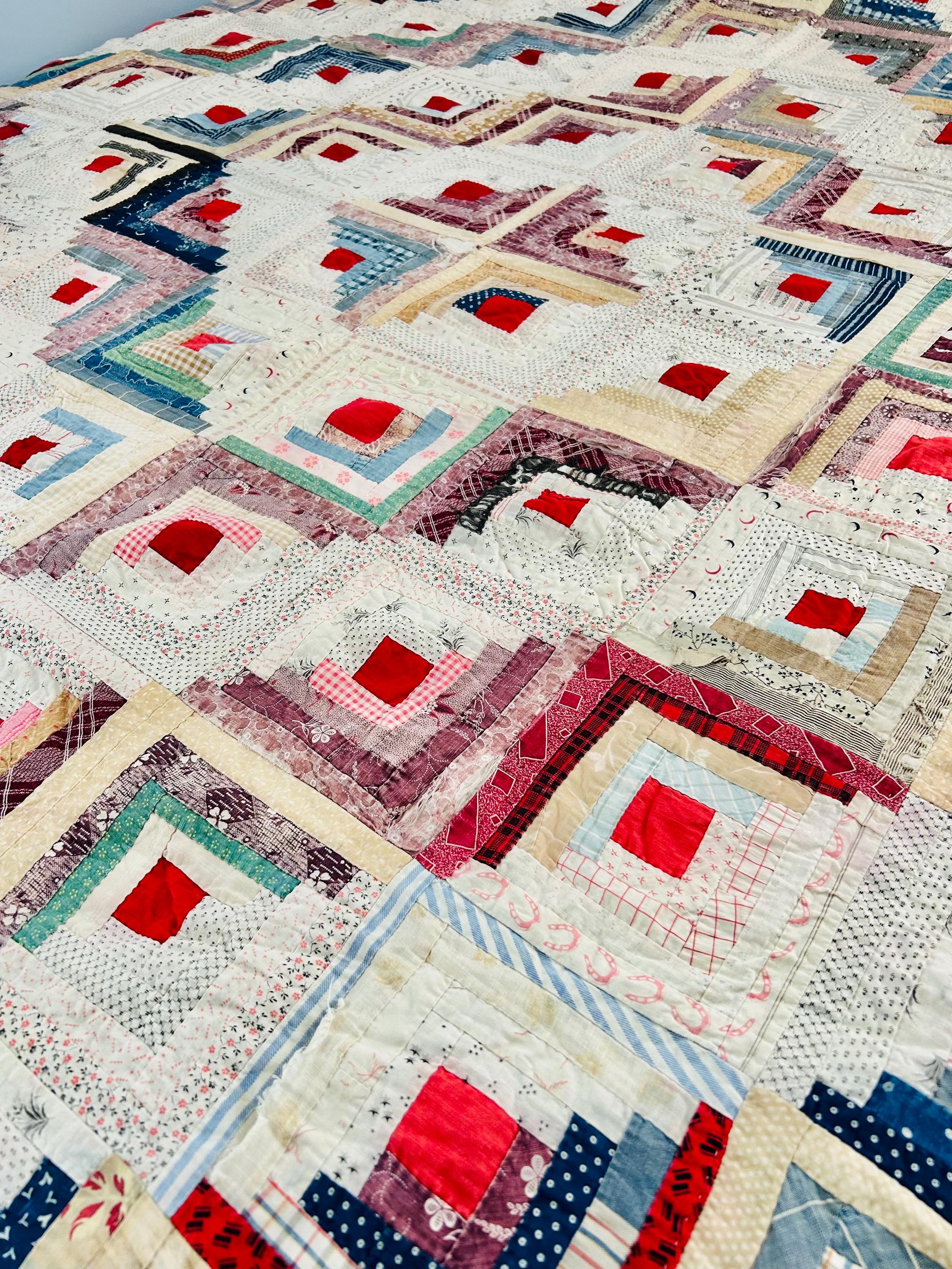 Details: • Entirely hand-pieced • Hand-quilted • Scrap construction • Traditional Barn Raising layout • Red center Log Cabin blocks • Size: 68” x 80”