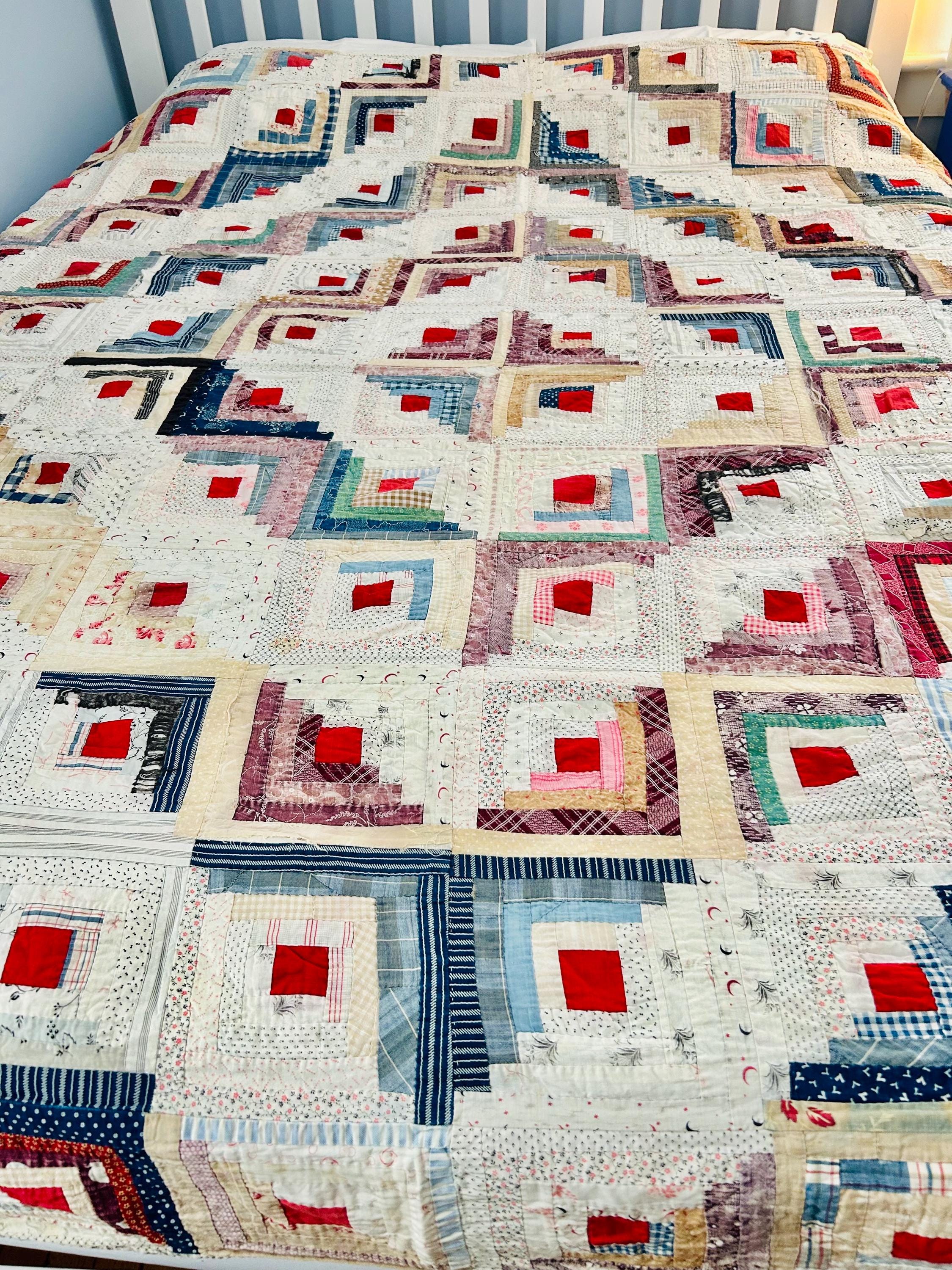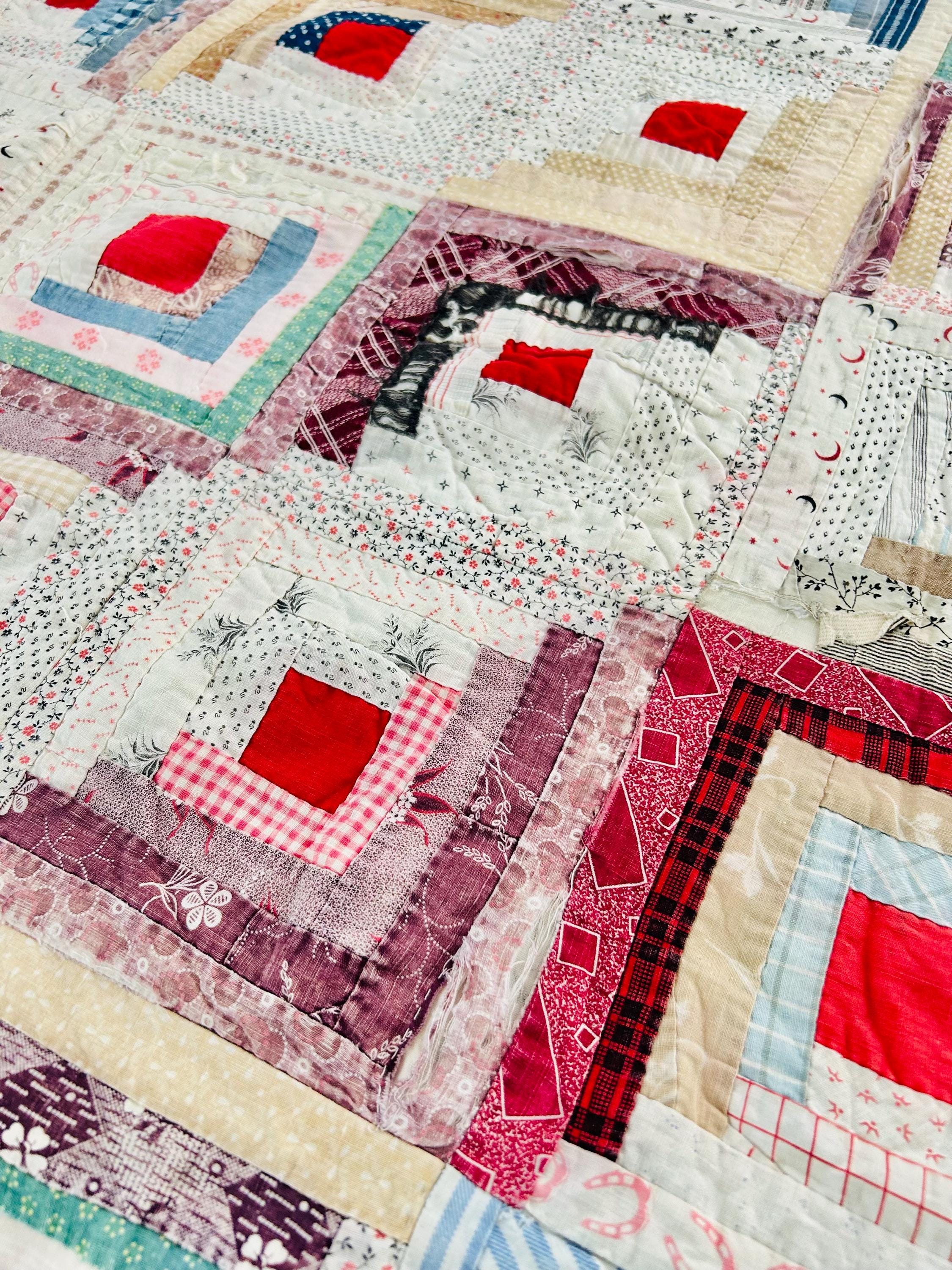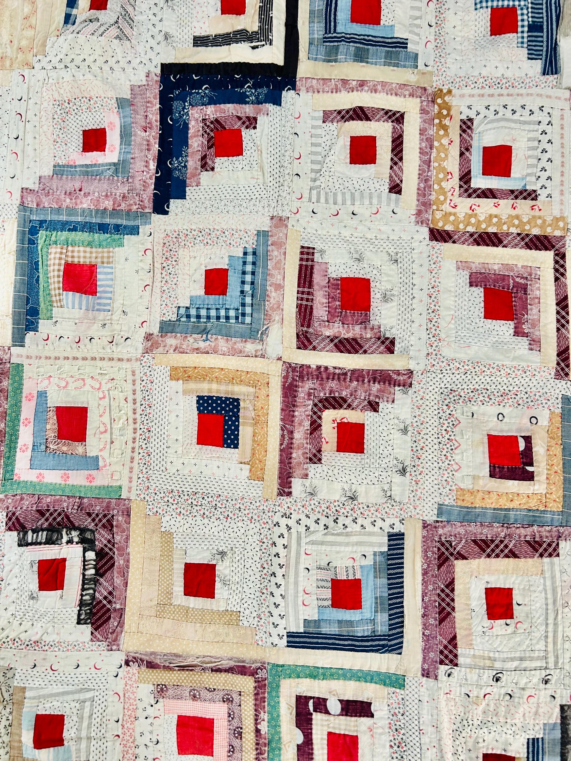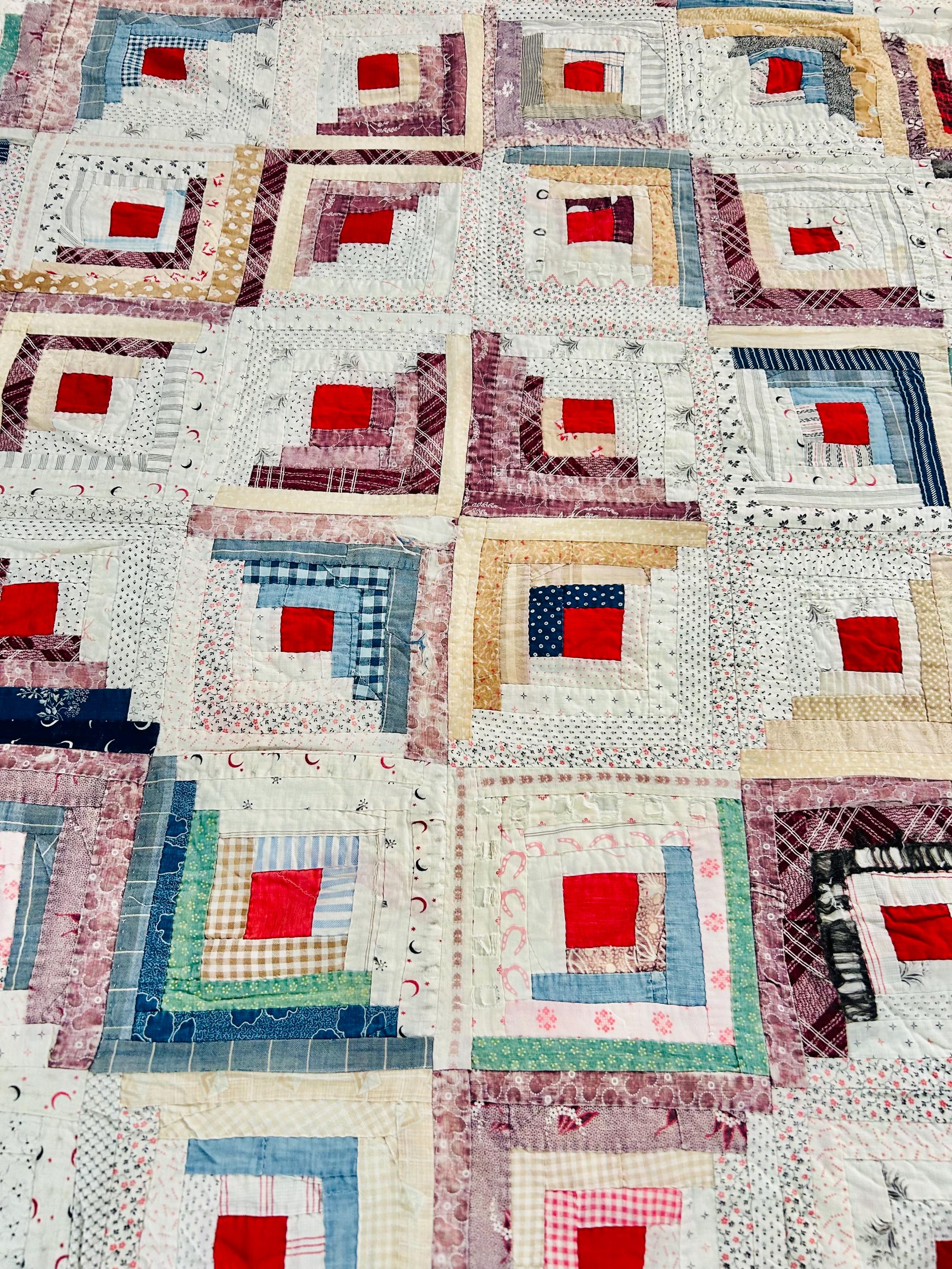 Details: • Entirely hand-pieced • Hand-quilted • Scrap construction • Traditional Barn Raising layout • Red center Log Cabin blocks • Size: 68” x 80”