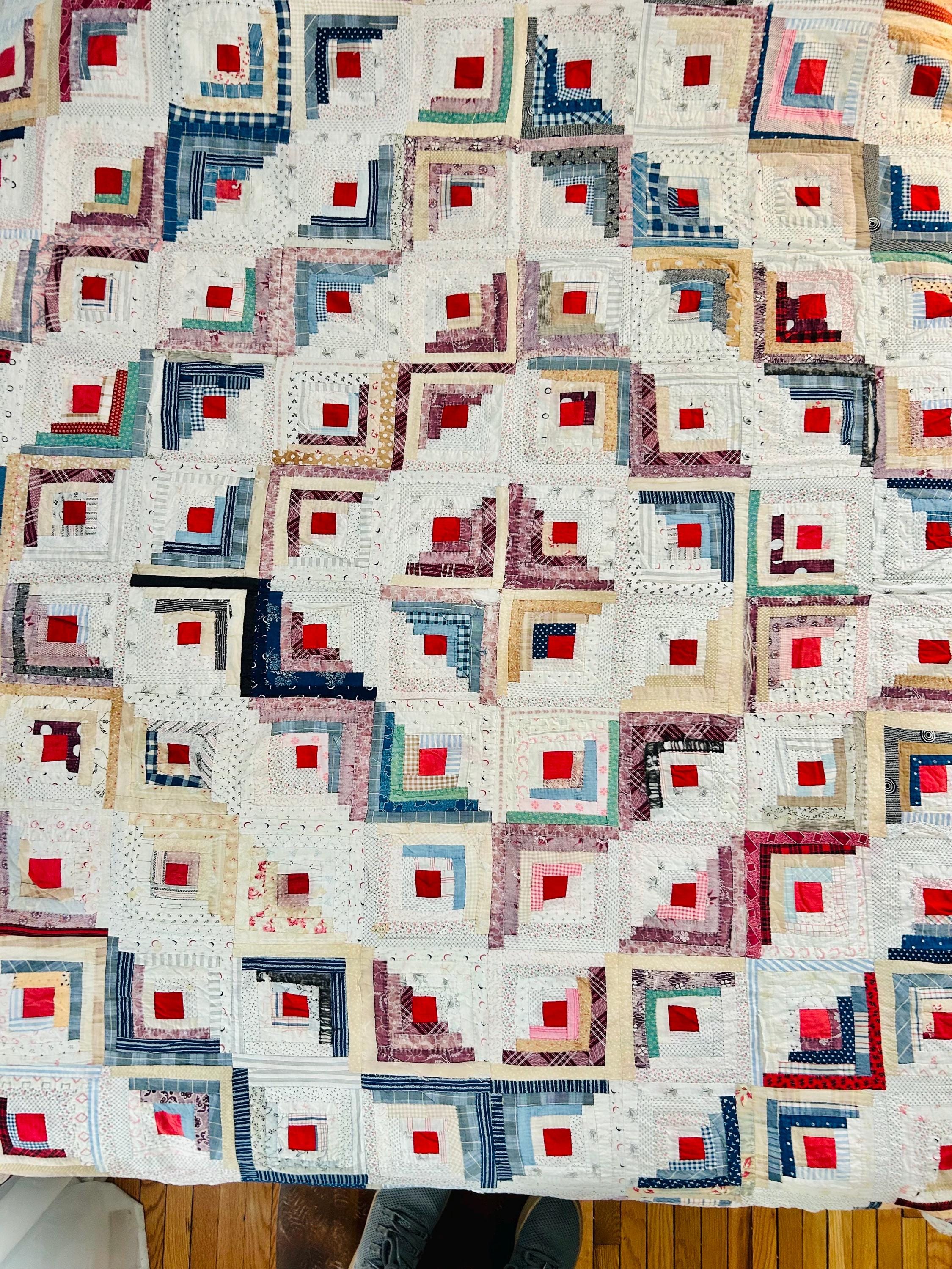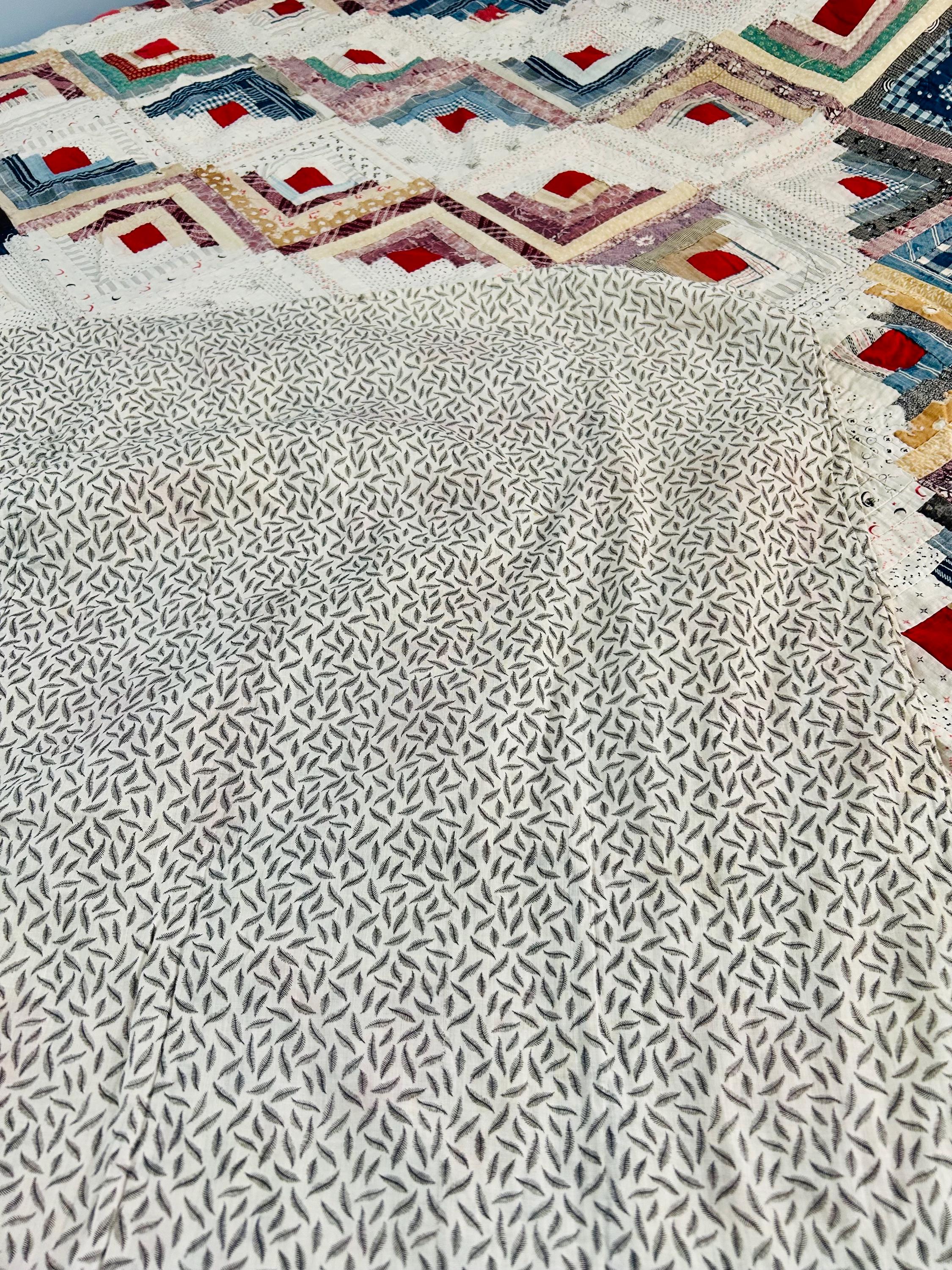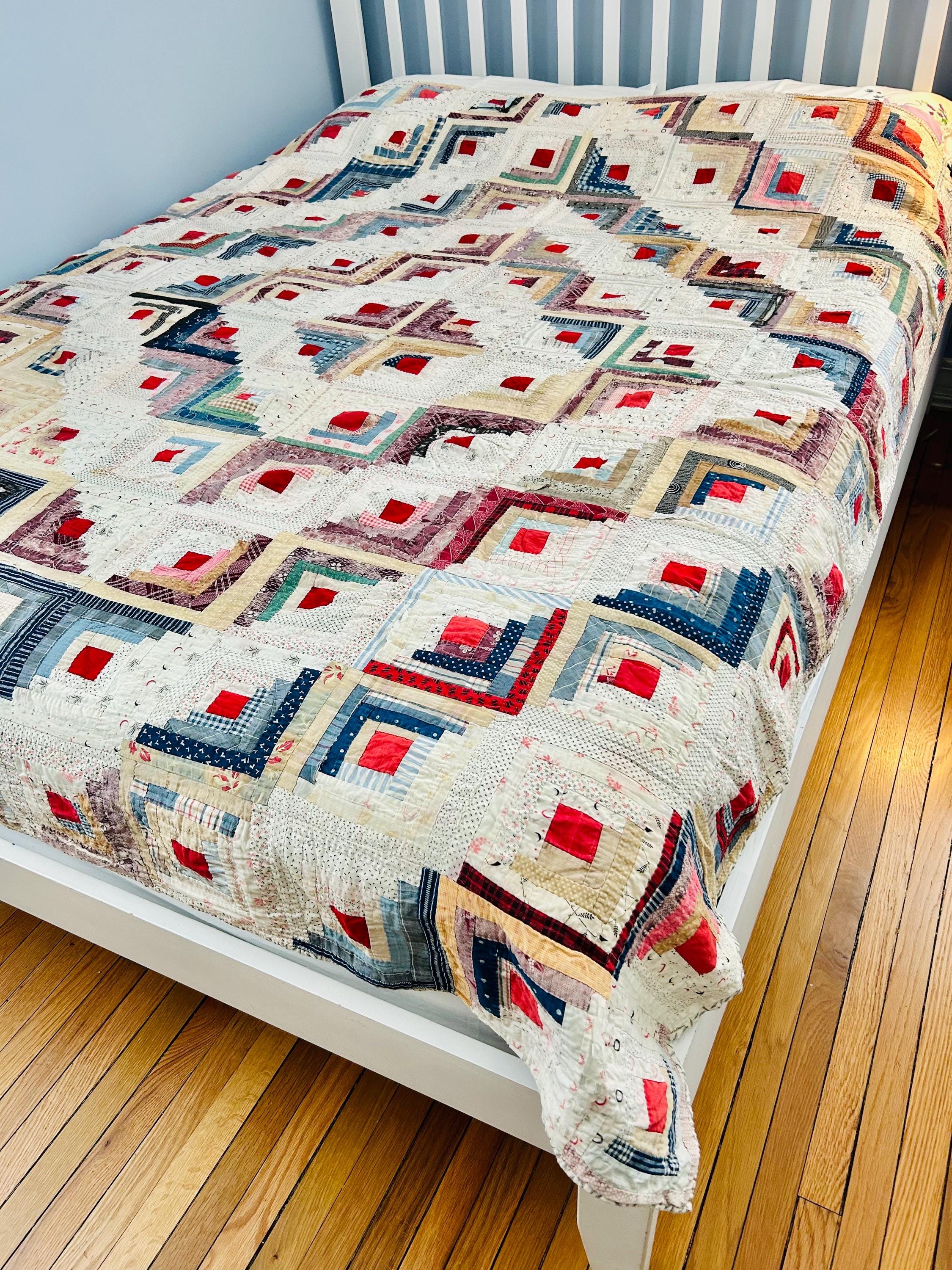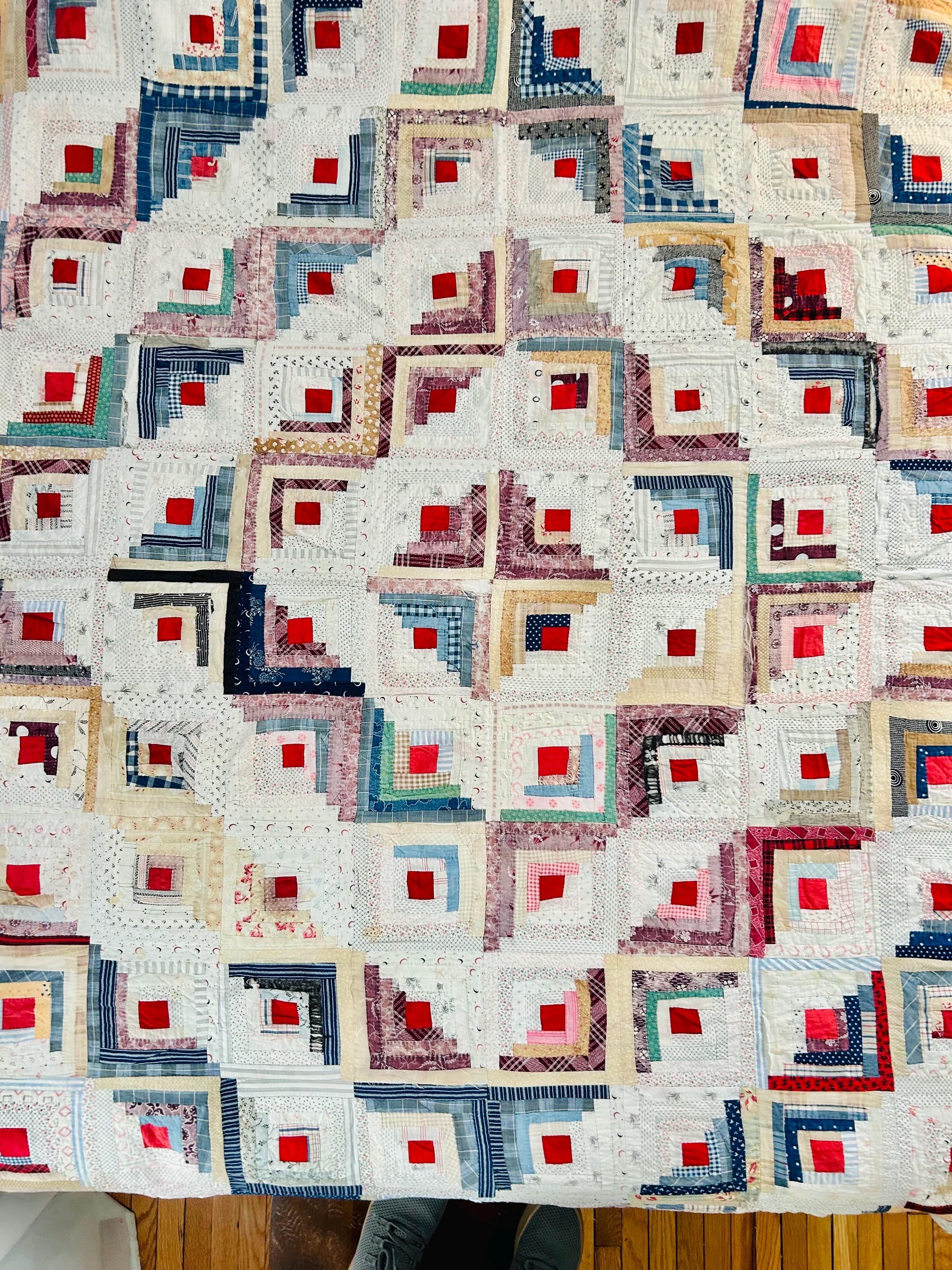 Details: • Entirely hand-pieced • Hand-quilted • Scrap construction • Traditional Barn Raising layout • Red center Log Cabin blocks • Size: 68” x 80”