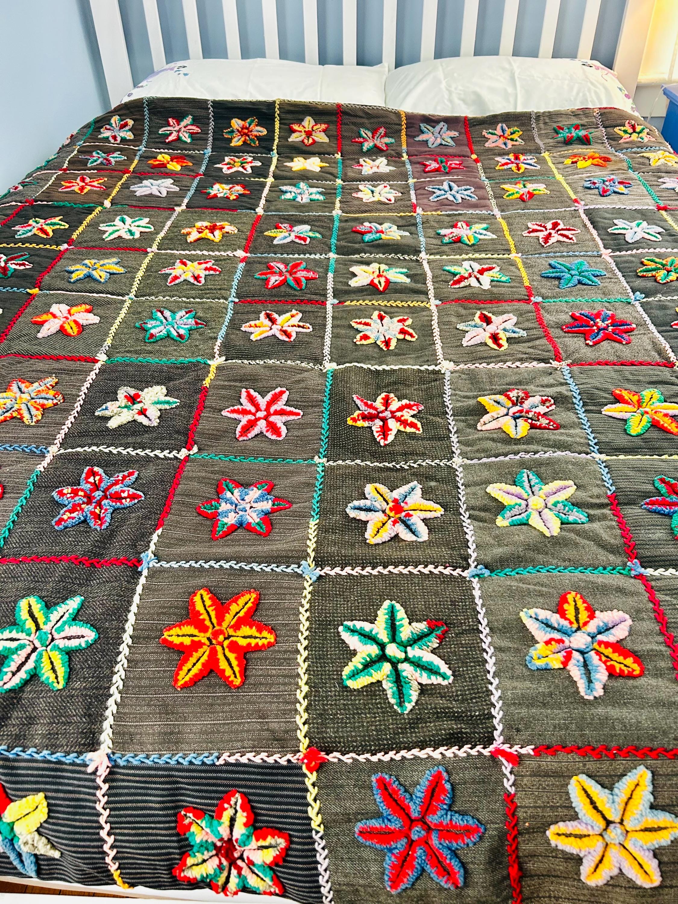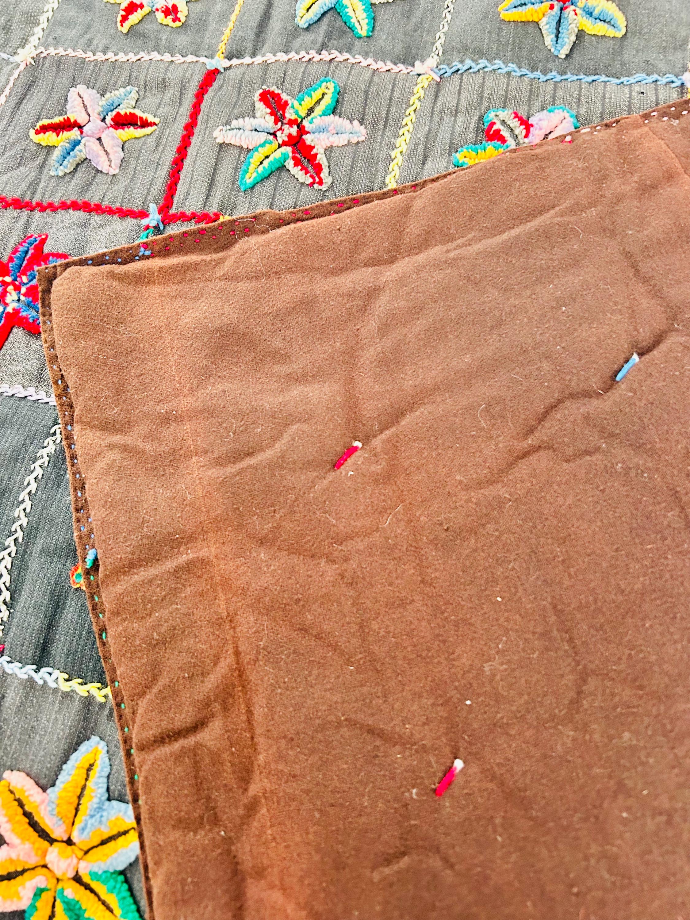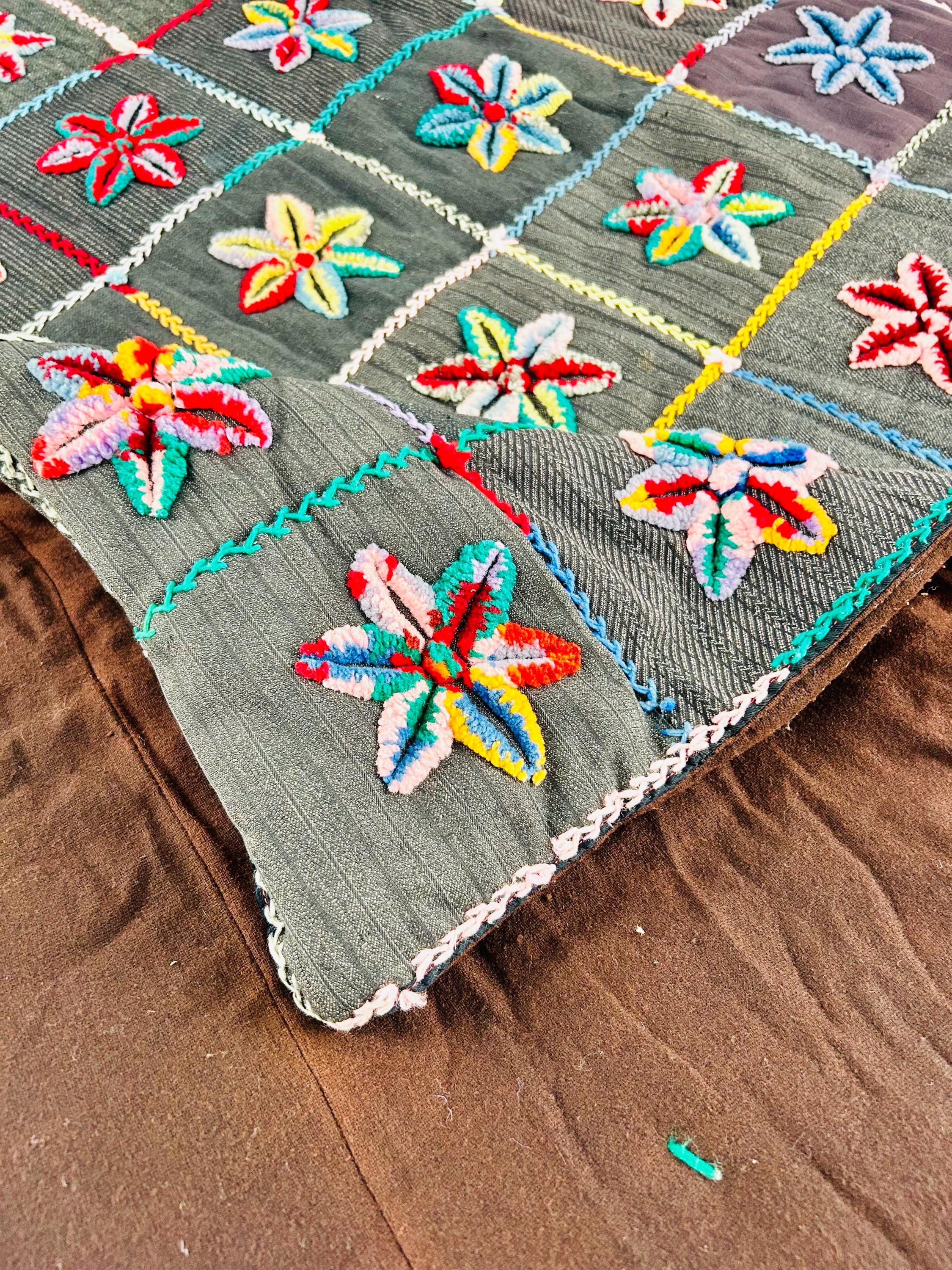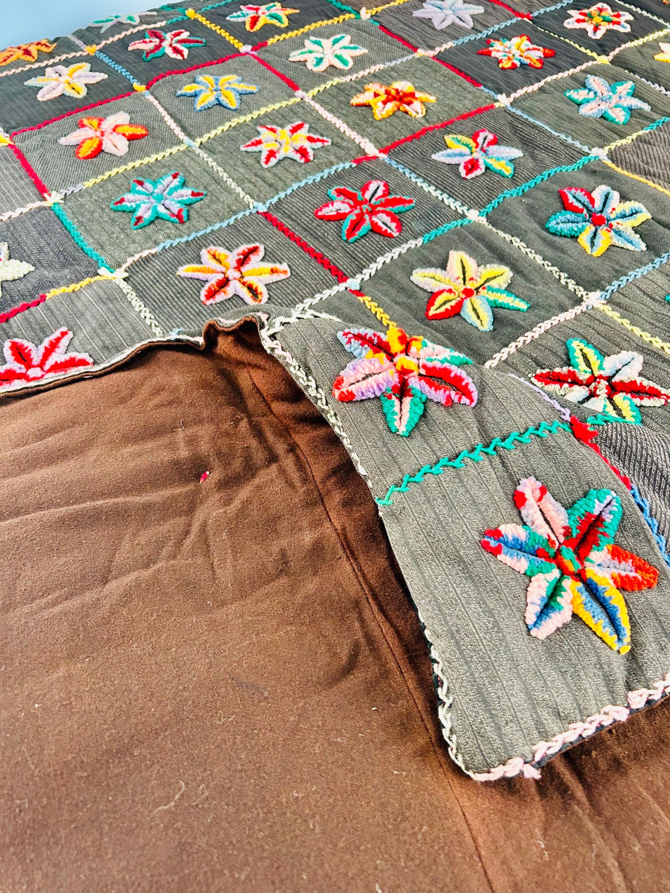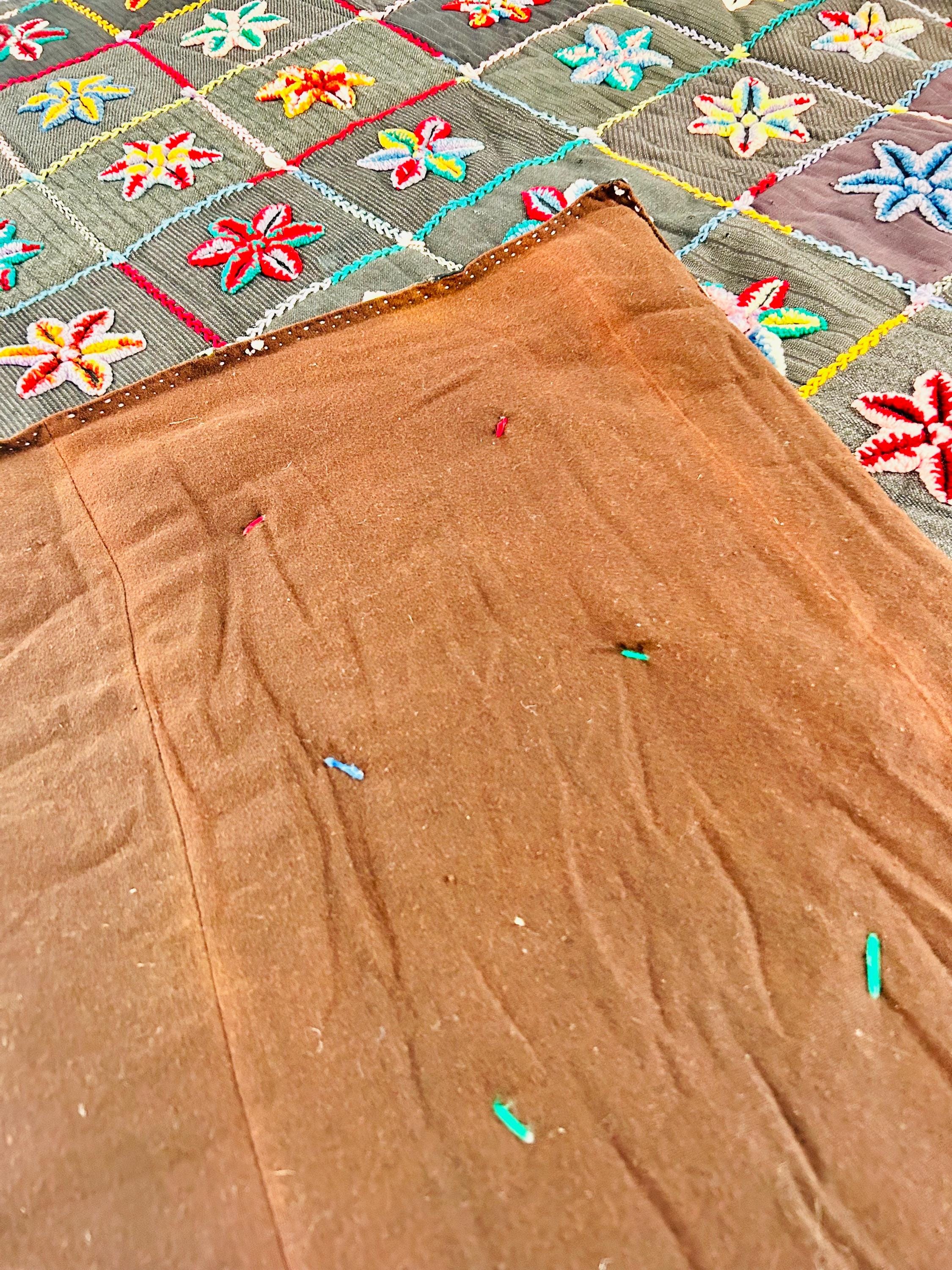 • The Stars: Each star is meticulously punched with variegated cotton and wool yarns, creating a beautiful "kaleidoscope" effect in every block. No two stars are identical. The blocks are joined with a vibrant, hand-stitched Herringbone embroidery. • The Foundation: The stars are set against a "make-do" background of heavy, mid-century wool suitings and twills—likely repurposed garments, a classic hallmark of American folk craft. • The Back & Batting: The back is brown flannel while the quilt has been bound on all four sides by herringbone embroidery. The batting is fluffy and thick.