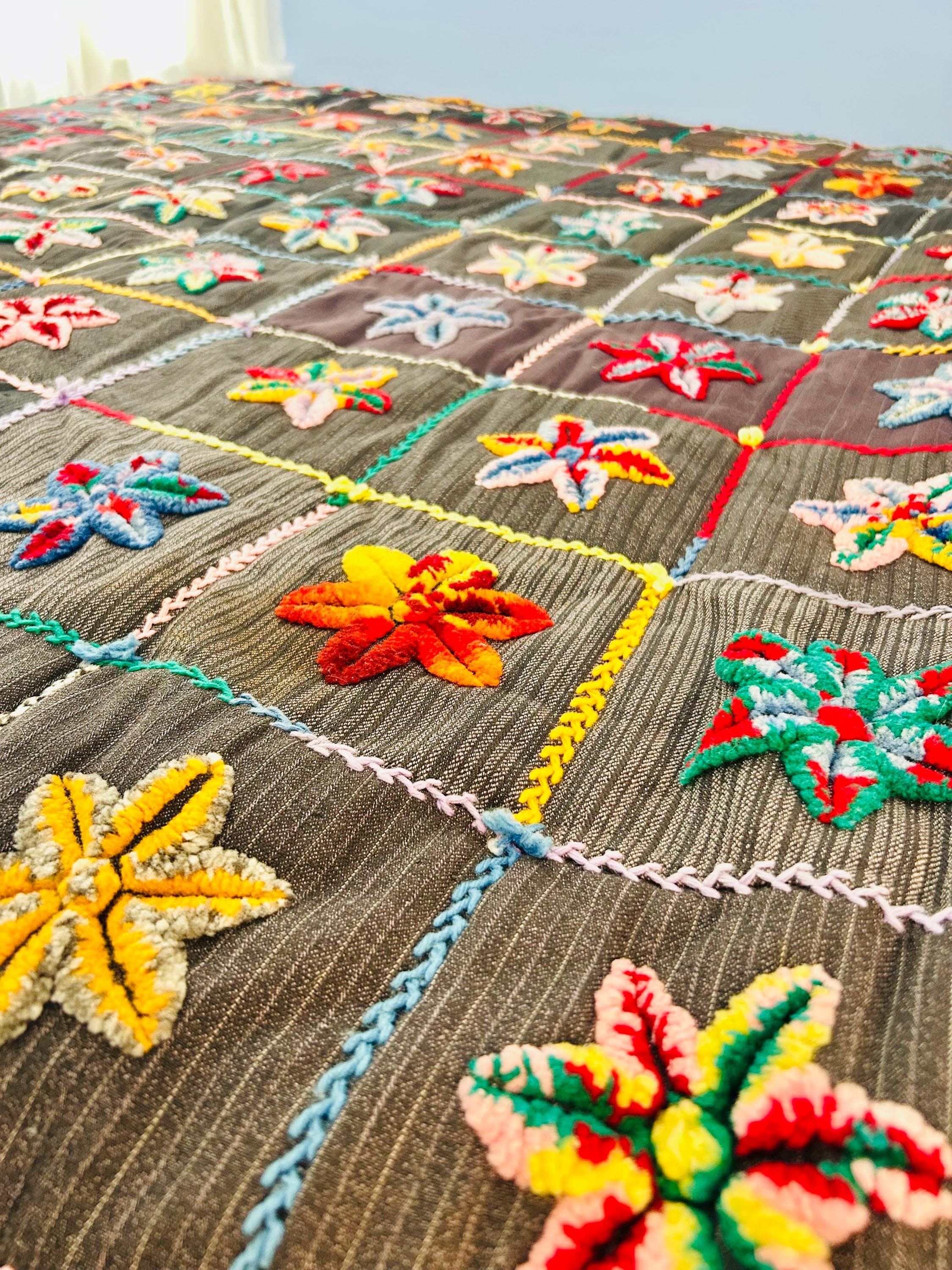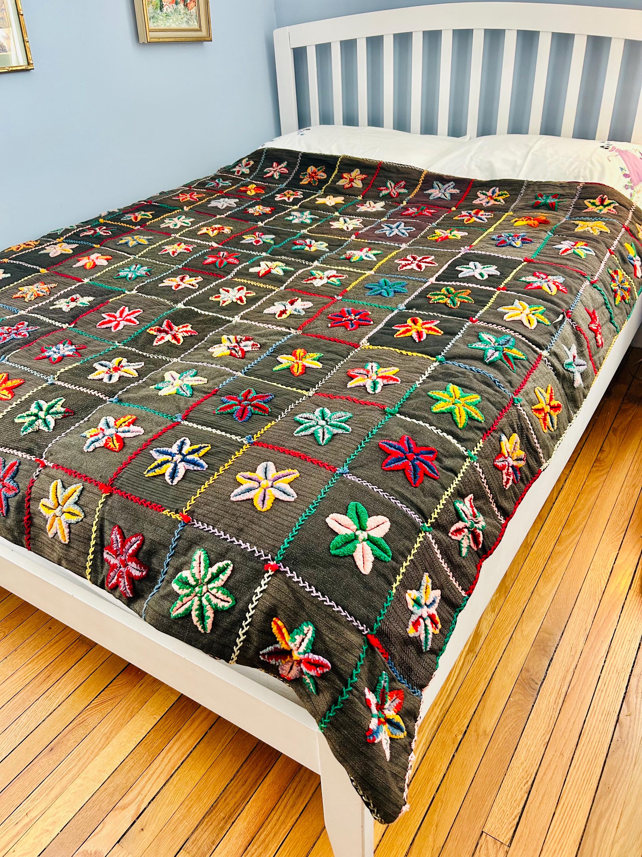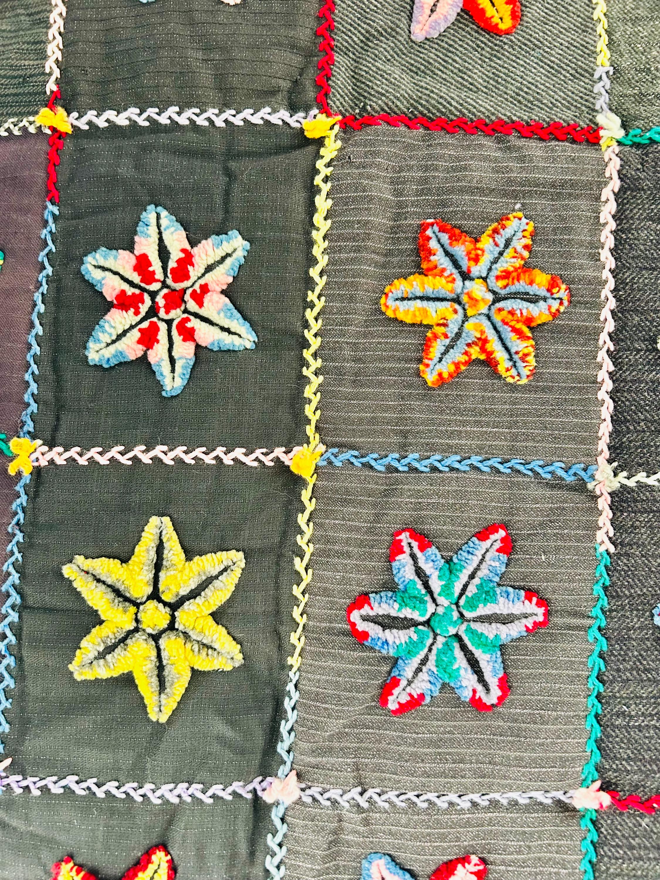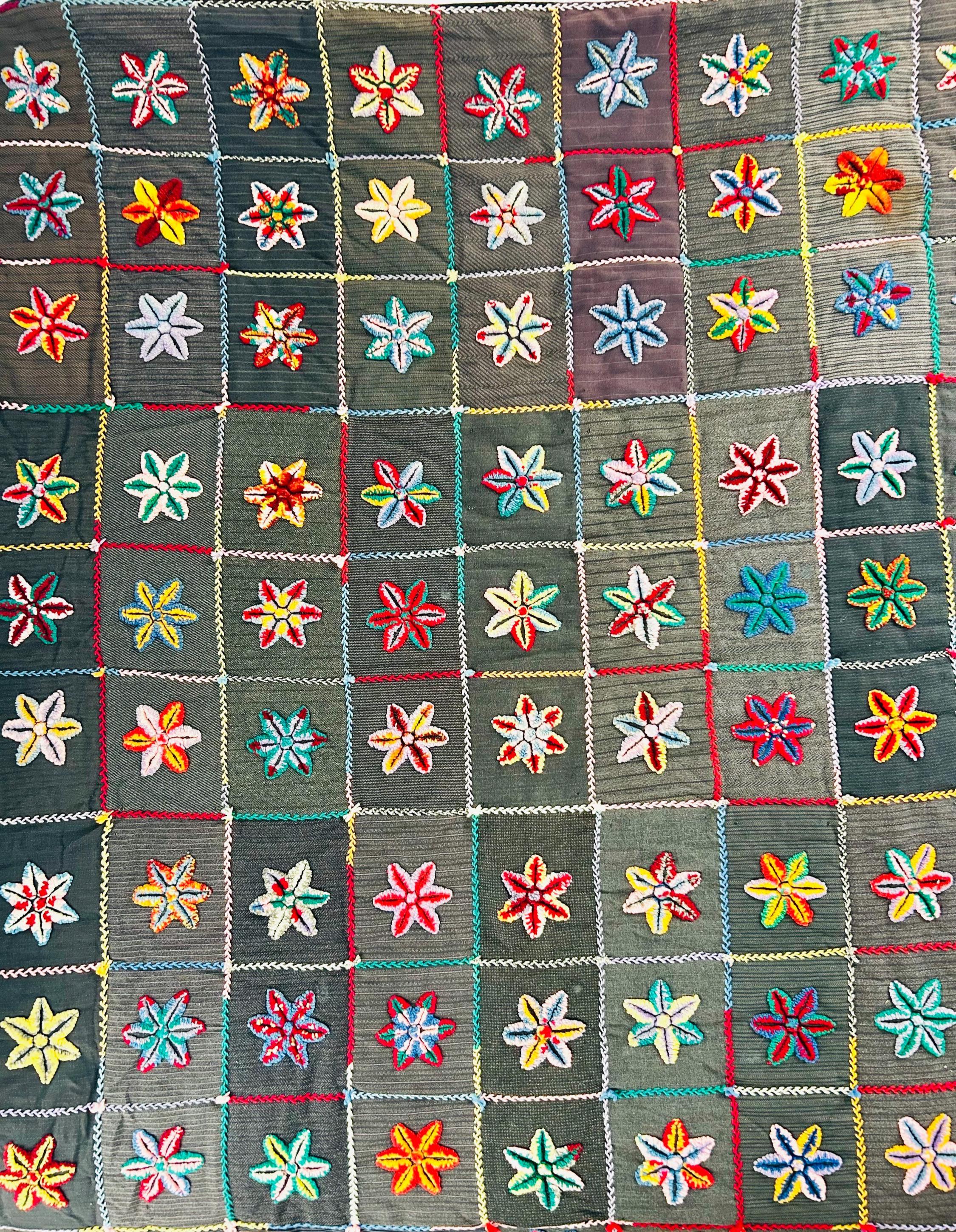 • The Stars: Each star is meticulously punched with variegated cotton and wool yarns, creating a beautiful "kaleidoscope" effect in every block. No two stars are identical. The blocks are joined with a vibrant, hand-stitched Herringbone embroidery. • The Foundation: The stars are set against a "make-do" background of heavy, mid-century wool suitings and twills—likely repurposed garments, a classic hallmark of American folk craft. • The Back & Batting: The back is brown flannel while the quilt has been bound on all four sides by herringbone embroidery. The batting is fluffy and thick.