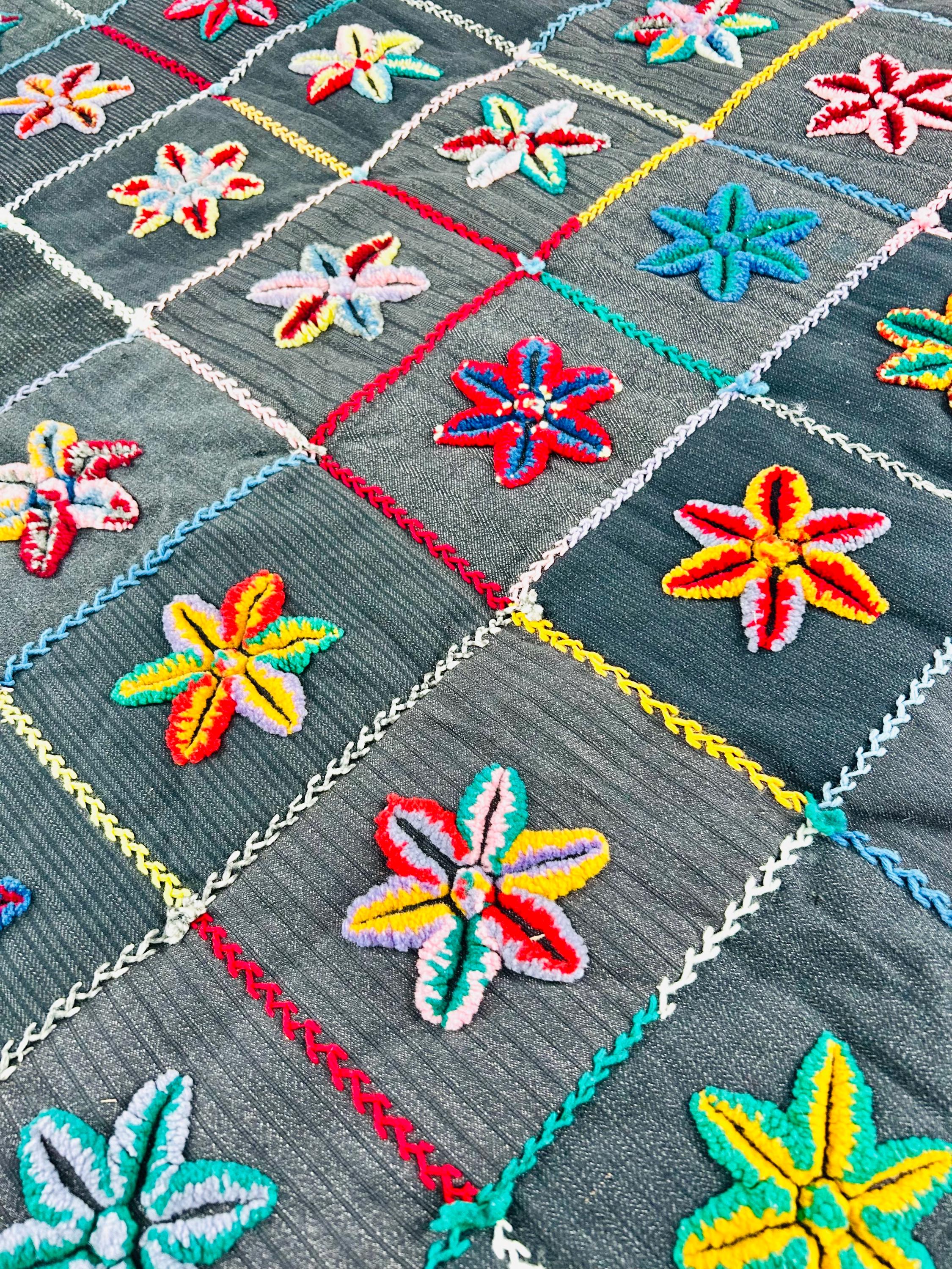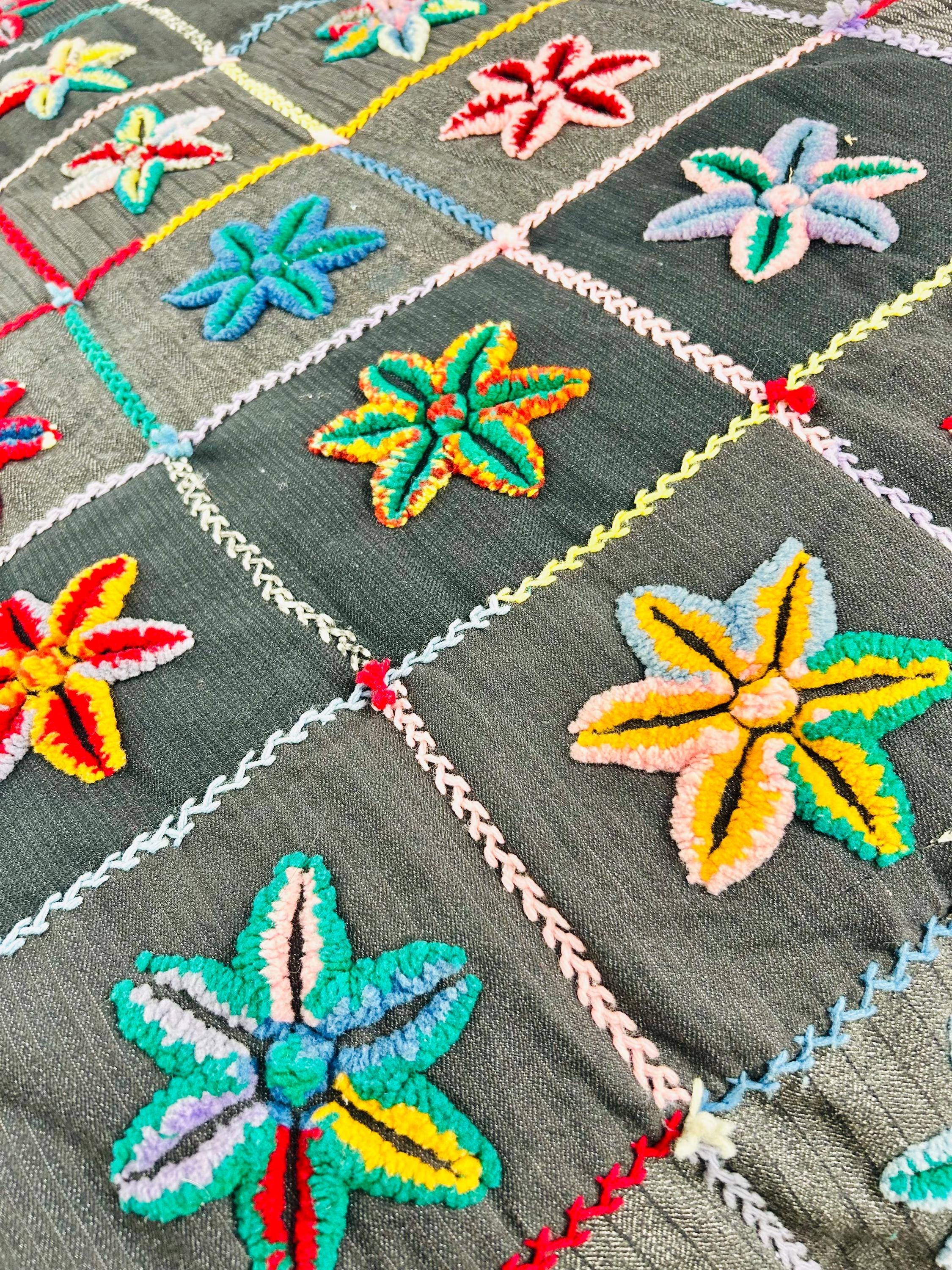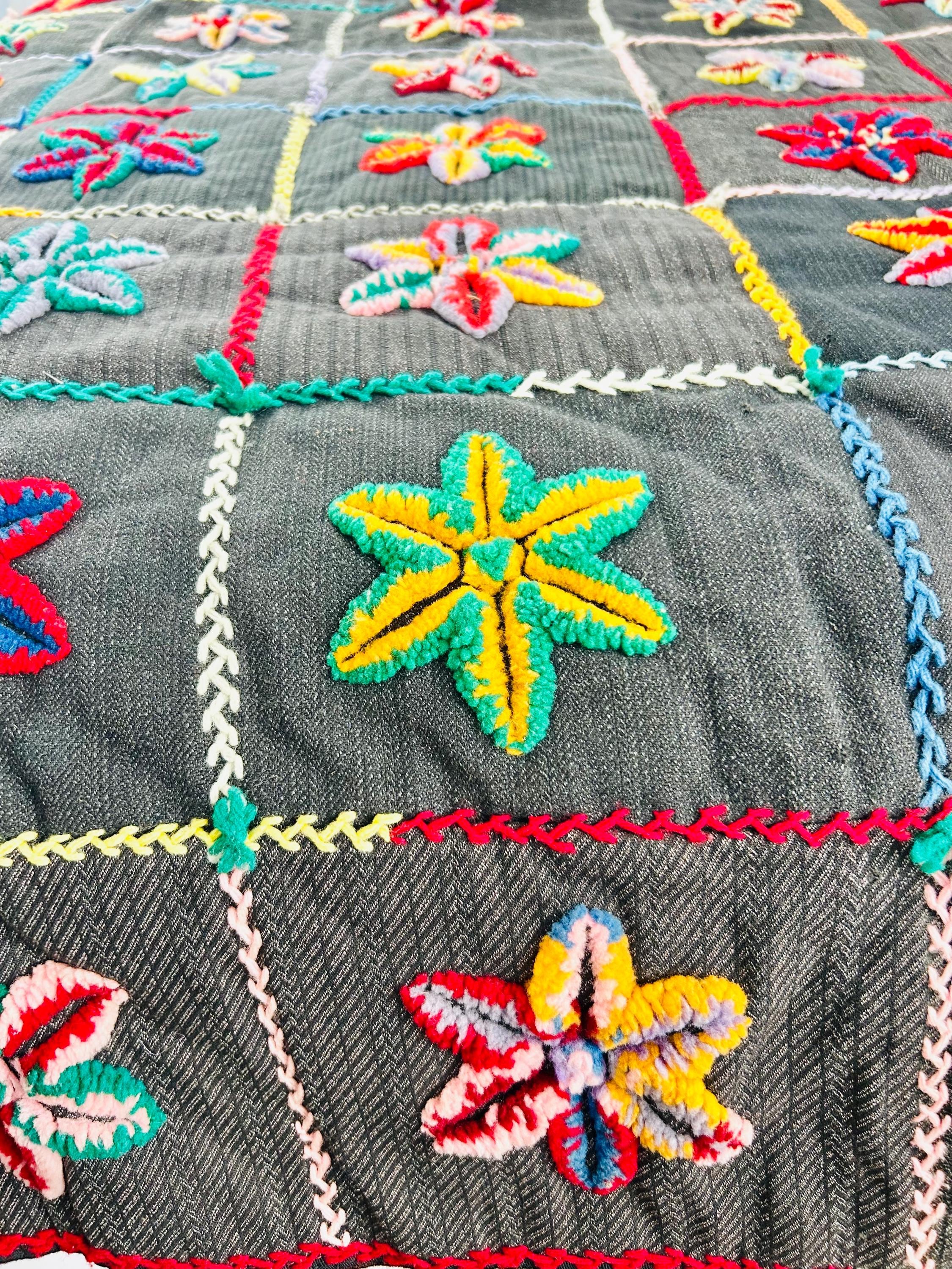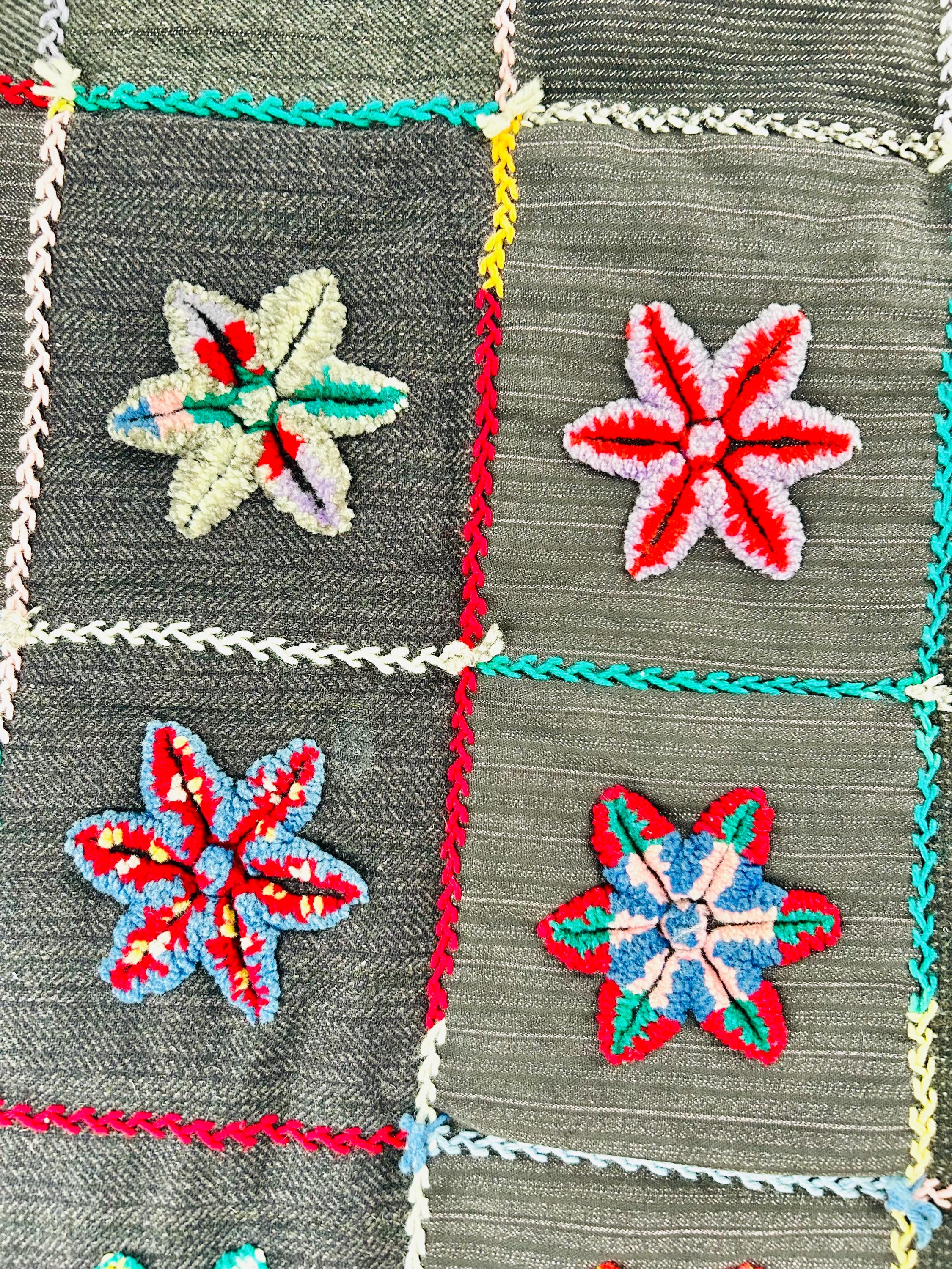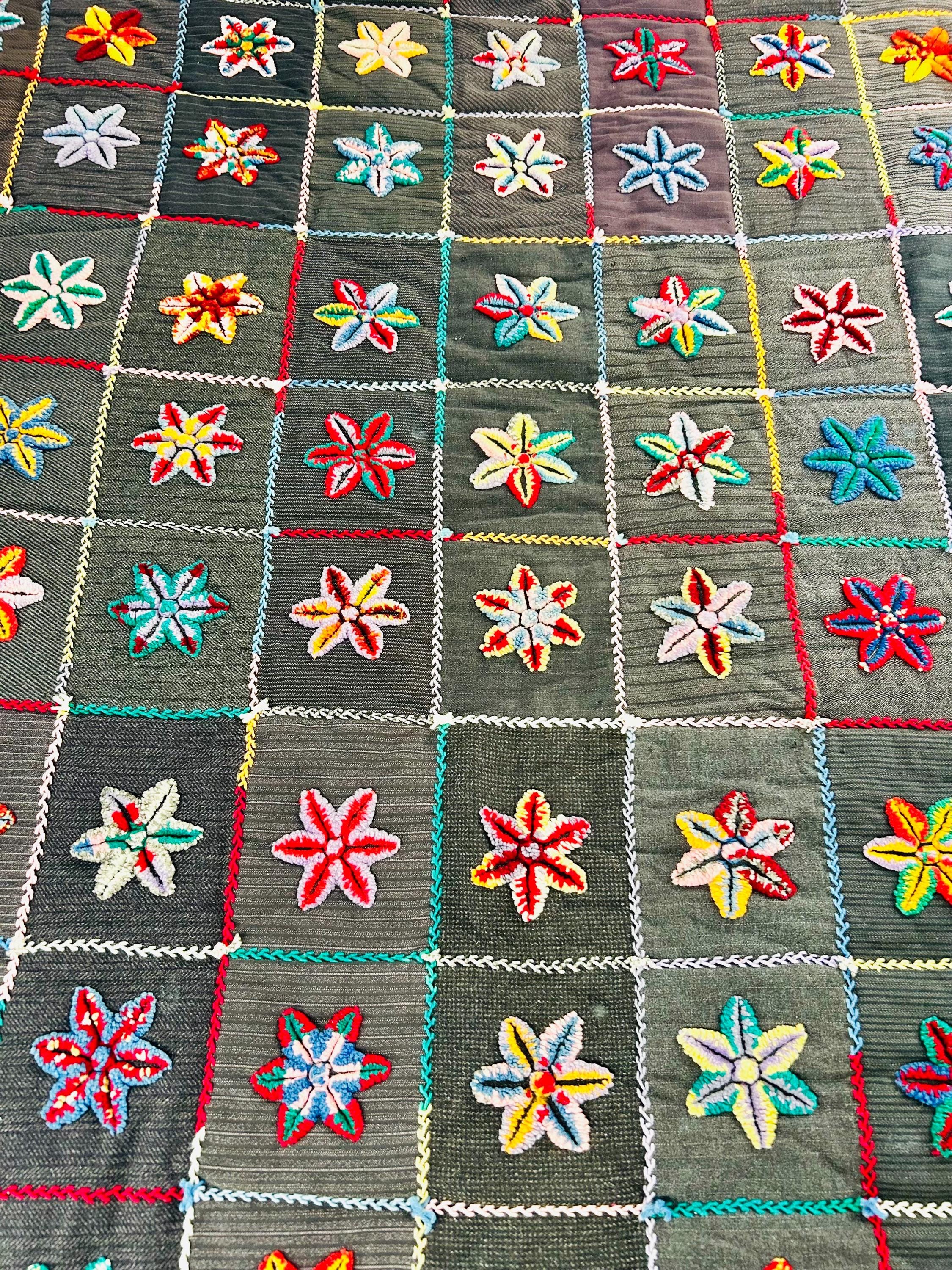 • The Stars: Each star is meticulously punched with variegated cotton and wool yarns, creating a beautiful "kaleidoscope" effect in every block. No two stars are identical. The blocks are joined with a vibrant, hand-stitched Herringbone embroidery. • The Foundation: The stars are set against a "make-do" background of heavy, mid-century wool suitings and twills—likely repurposed garments, a classic hallmark of American folk craft. • The Back & Batting: The back is brown flannel while the quilt has been bound on all four sides by herringbone embroidery. The batting is fluffy and thick.