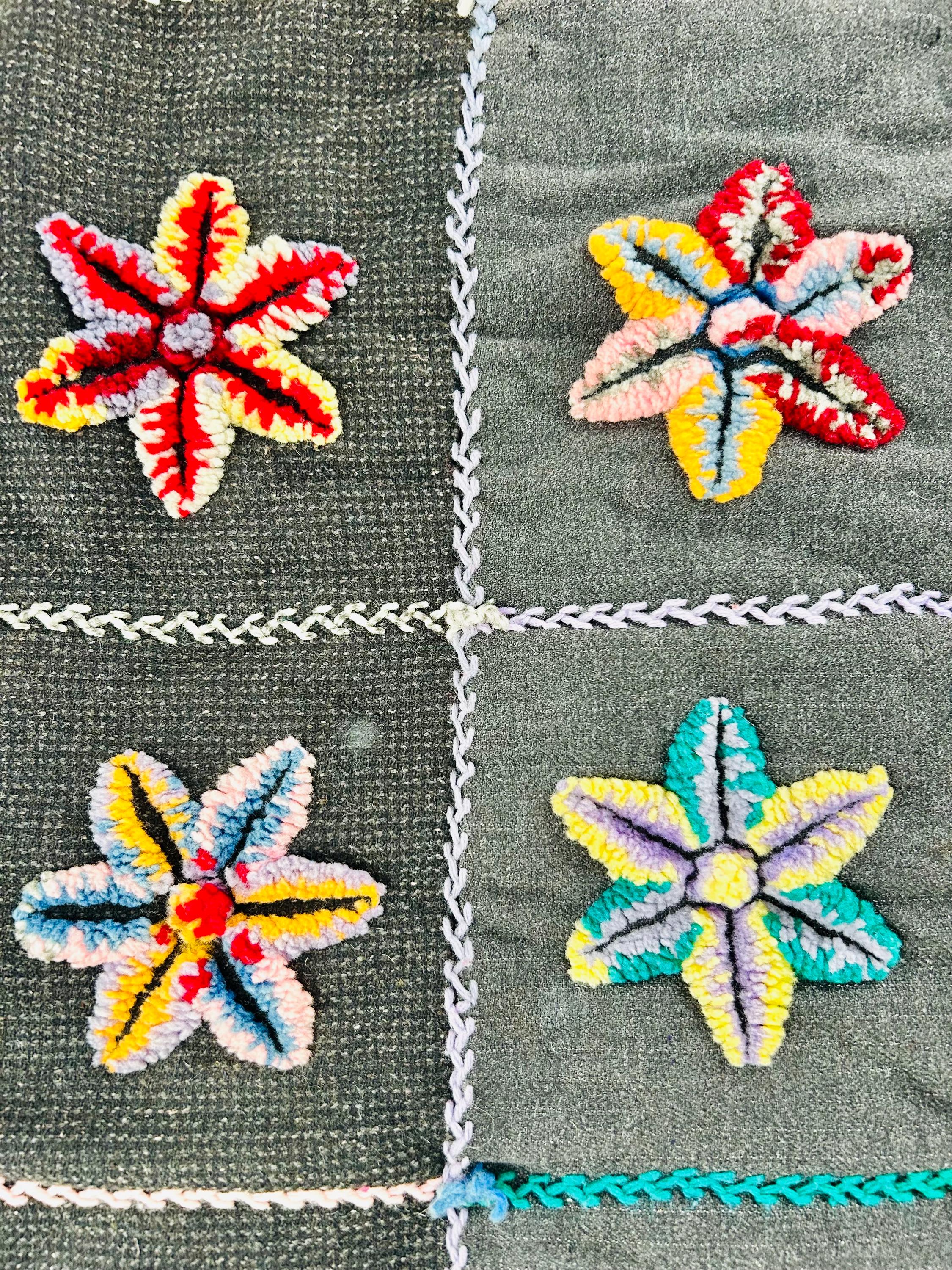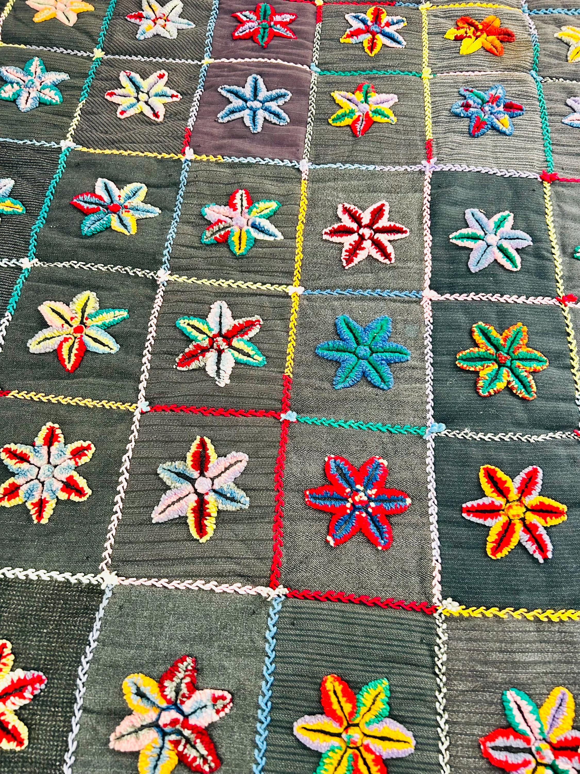 The quilt is in excellent vintage condition with no issues noted. The colors remain bold and the loop pile is lush.
