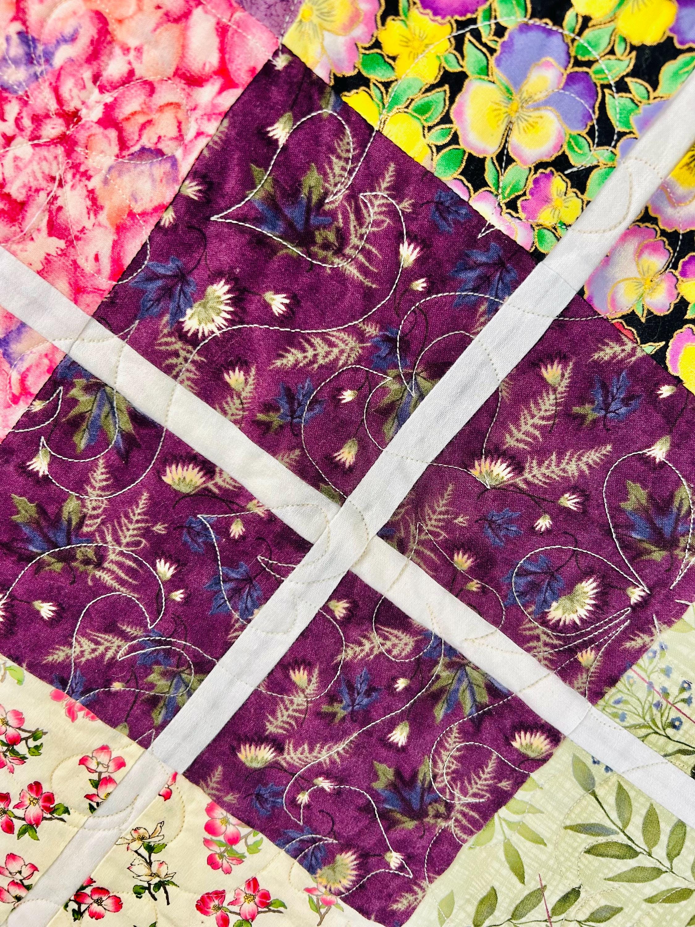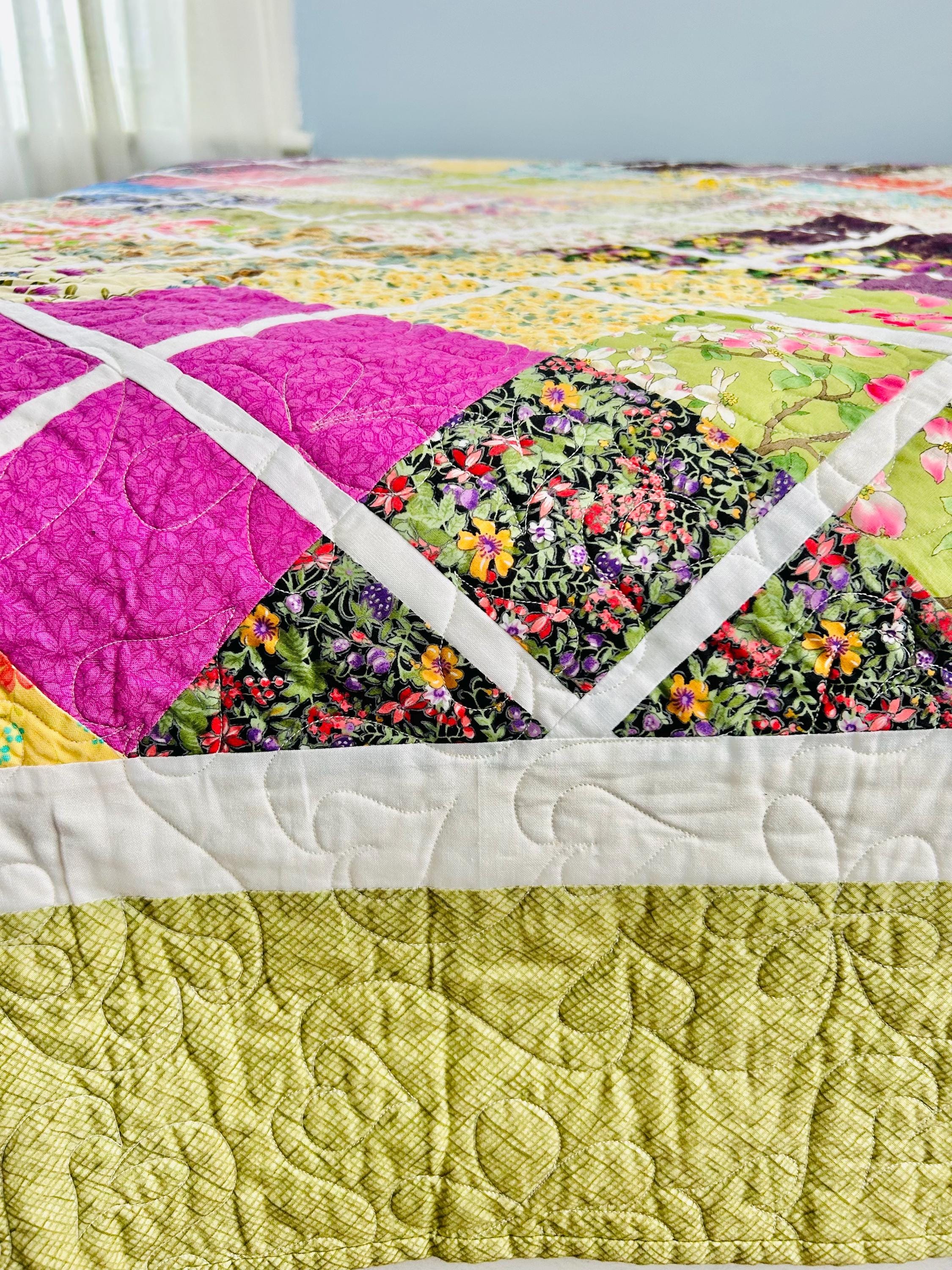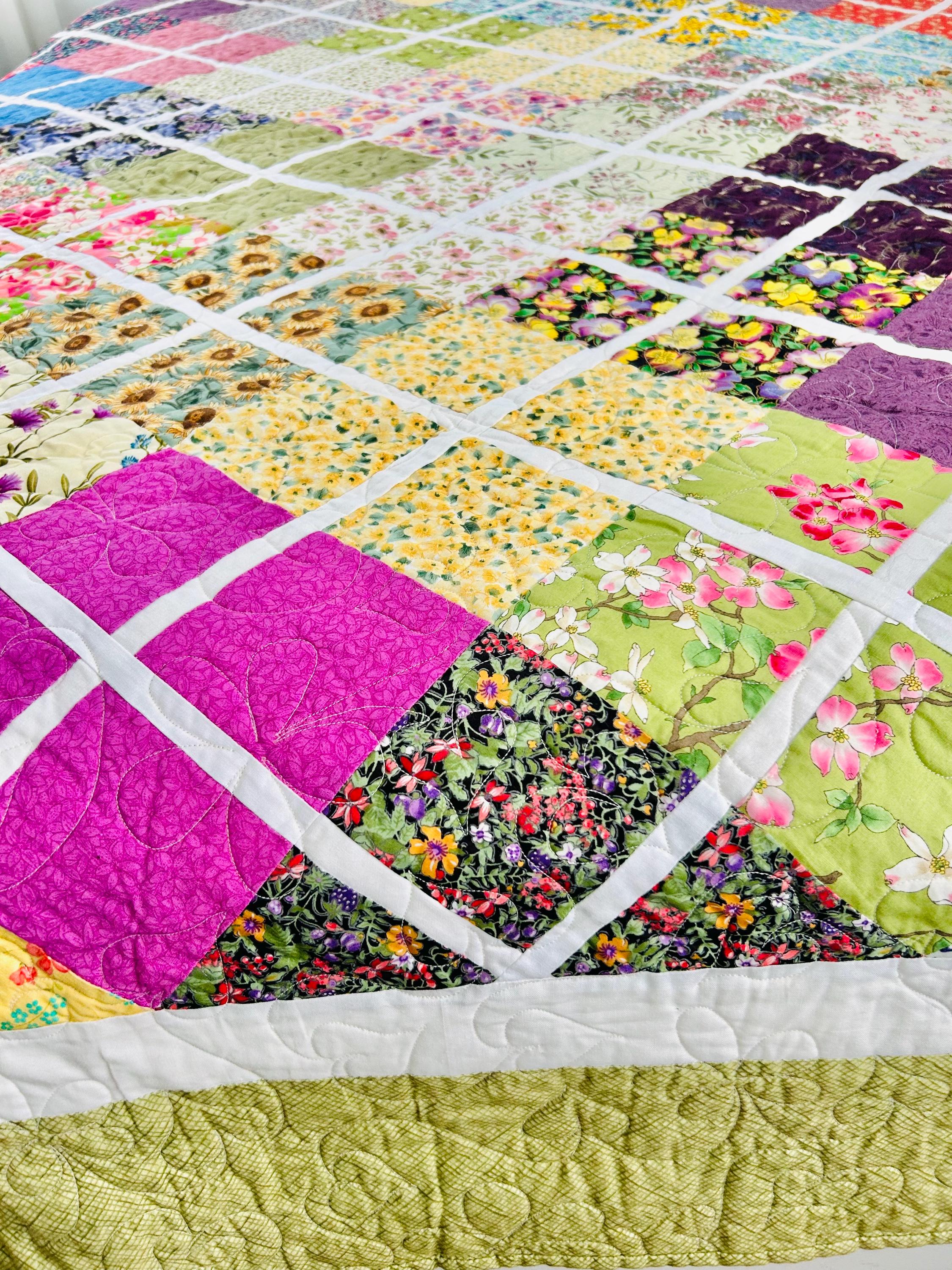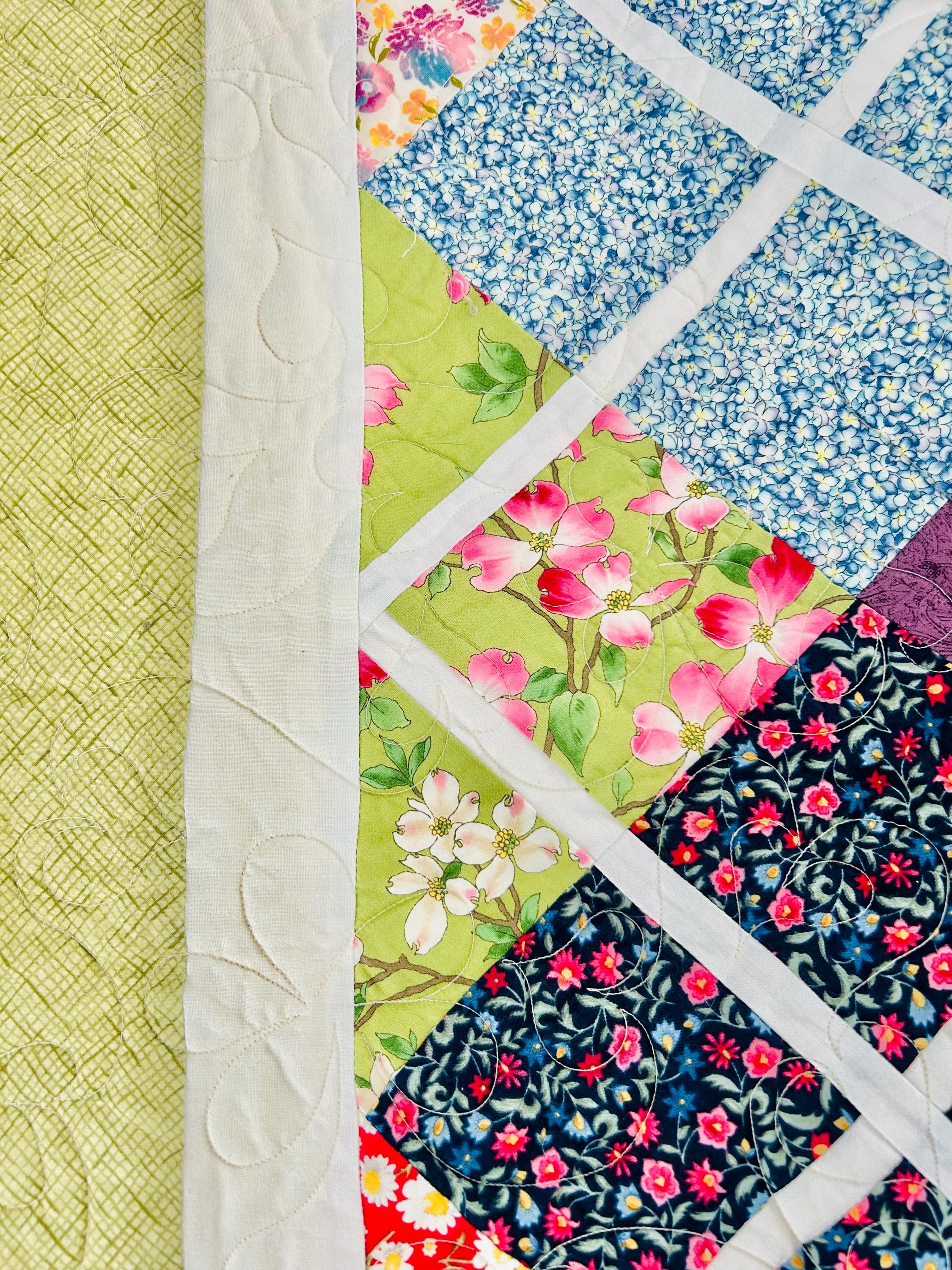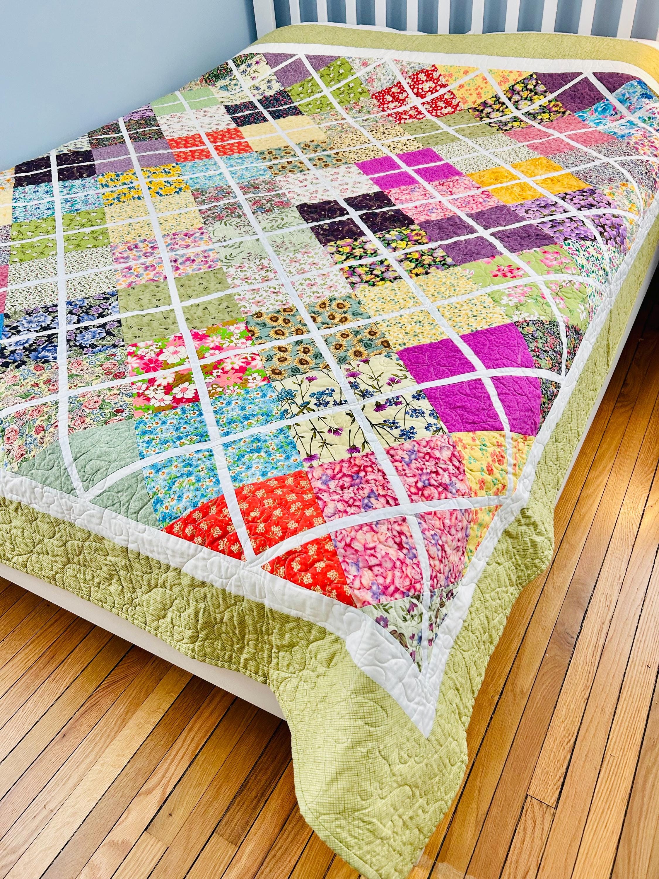 Details • Pattern: Sandcastle design with white sashing • Date: 2012 • Size: 82"x82" • Fabrics: High-quality 100% cotton prints • Colors: Multicolor florals with white sashing and green border • Batting: Lightweight batting • Construction: Machine pieced and long-arm quilted • Edge Finish: Green print matching border print • Condition: Excellent condition