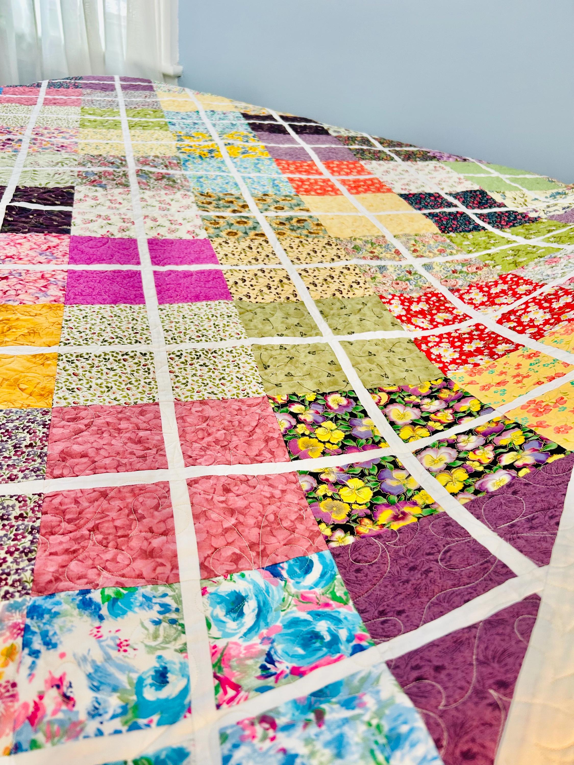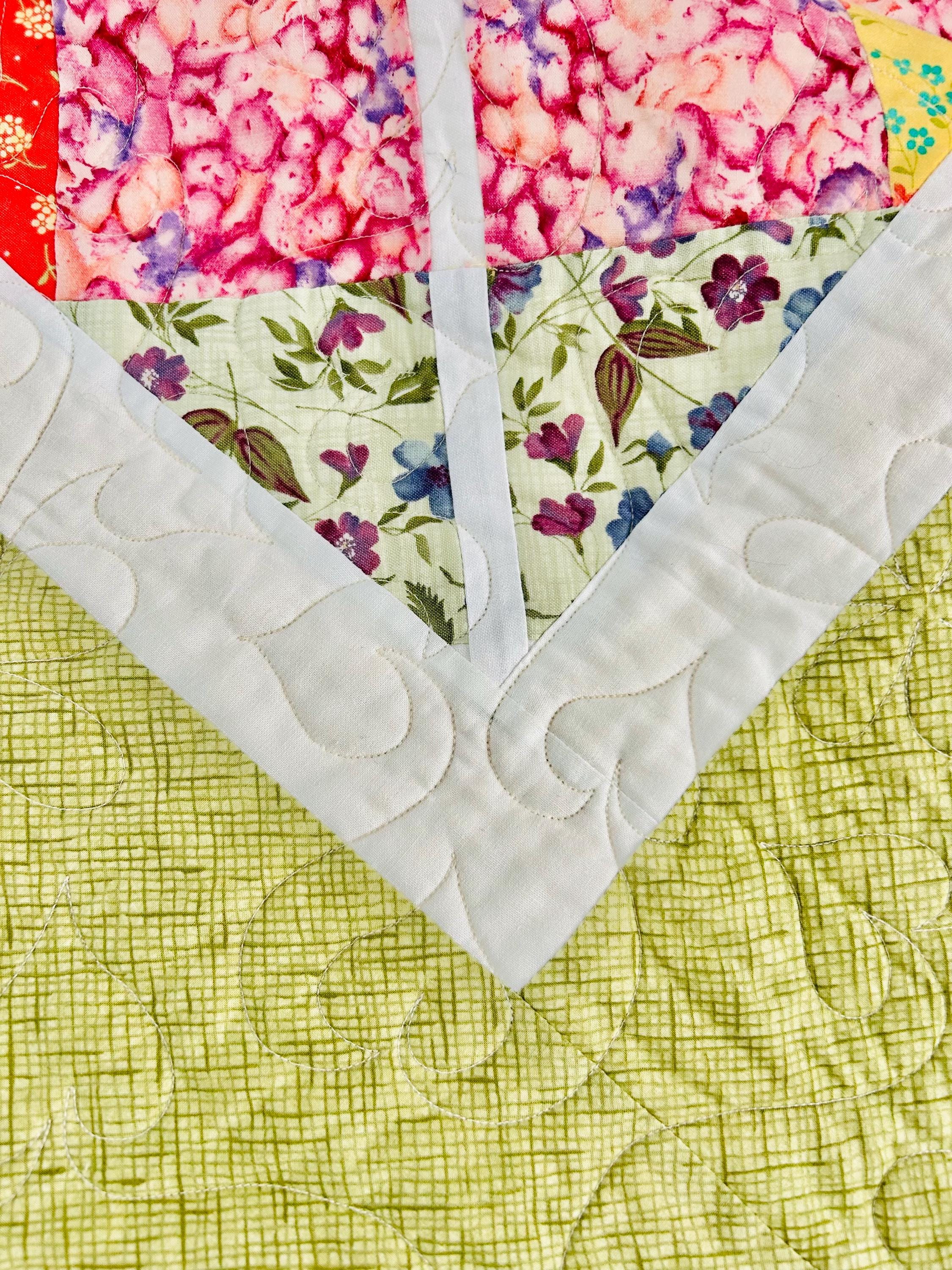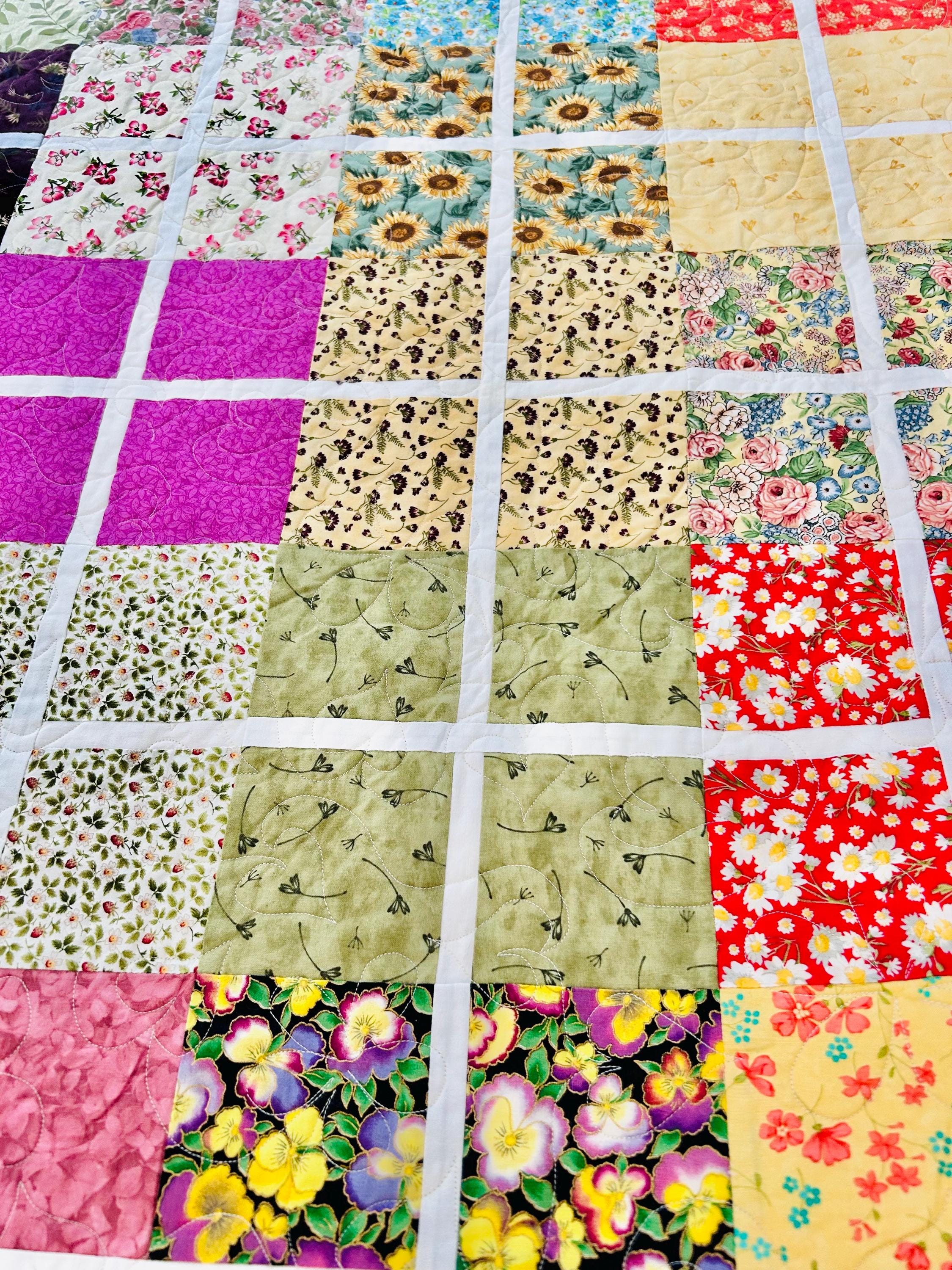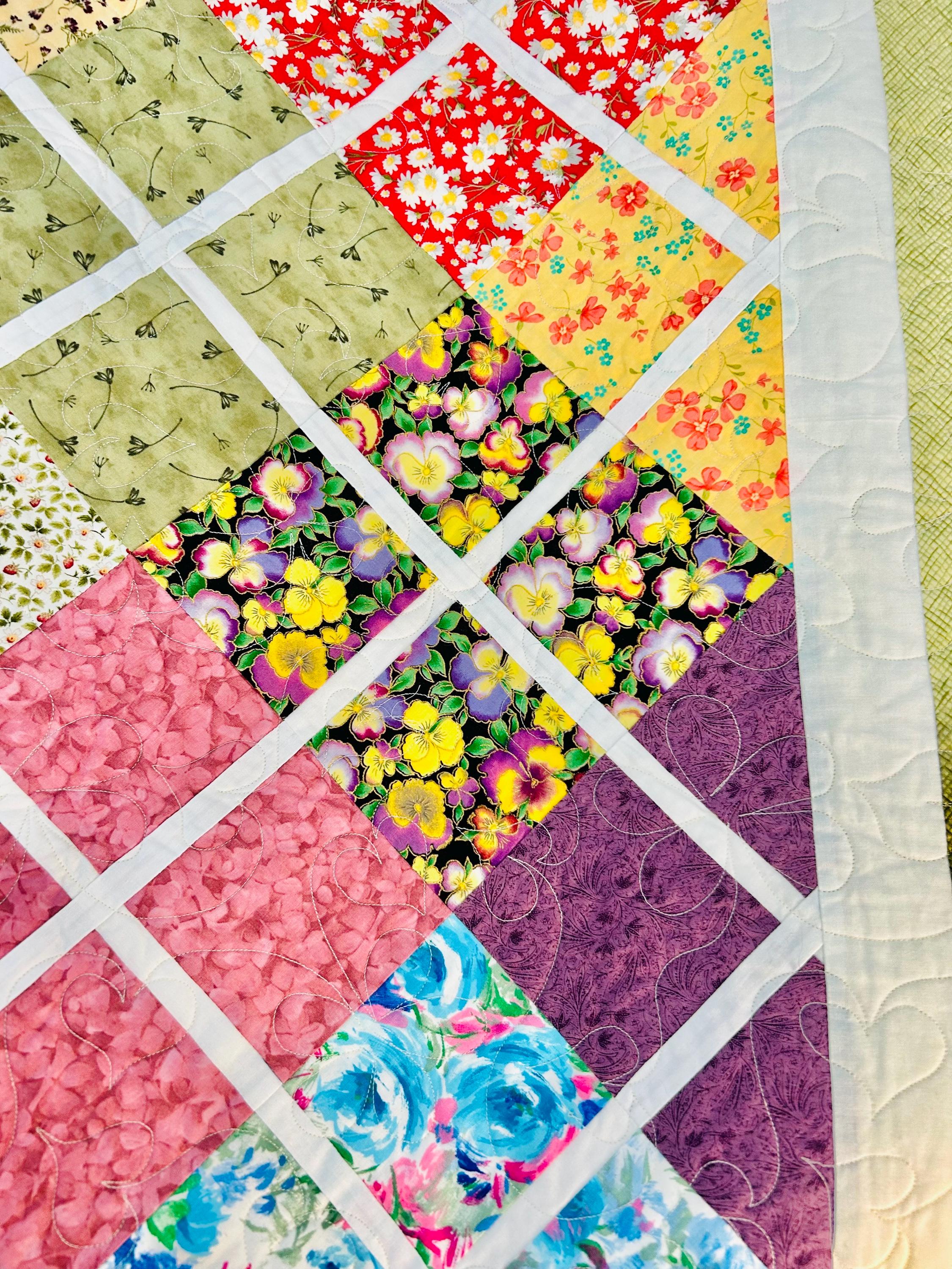 Details • Pattern: Sandcastle design with white sashing • Date: 2012 • Size: 82"x82" • Fabrics: High-quality 100% cotton prints • Colors: Multicolor florals with white sashing and green border • Batting: Lightweight batting • Construction: Machine pieced and long-arm quilted • Edge Finish: Green print matching border print • Condition: Excellent condition