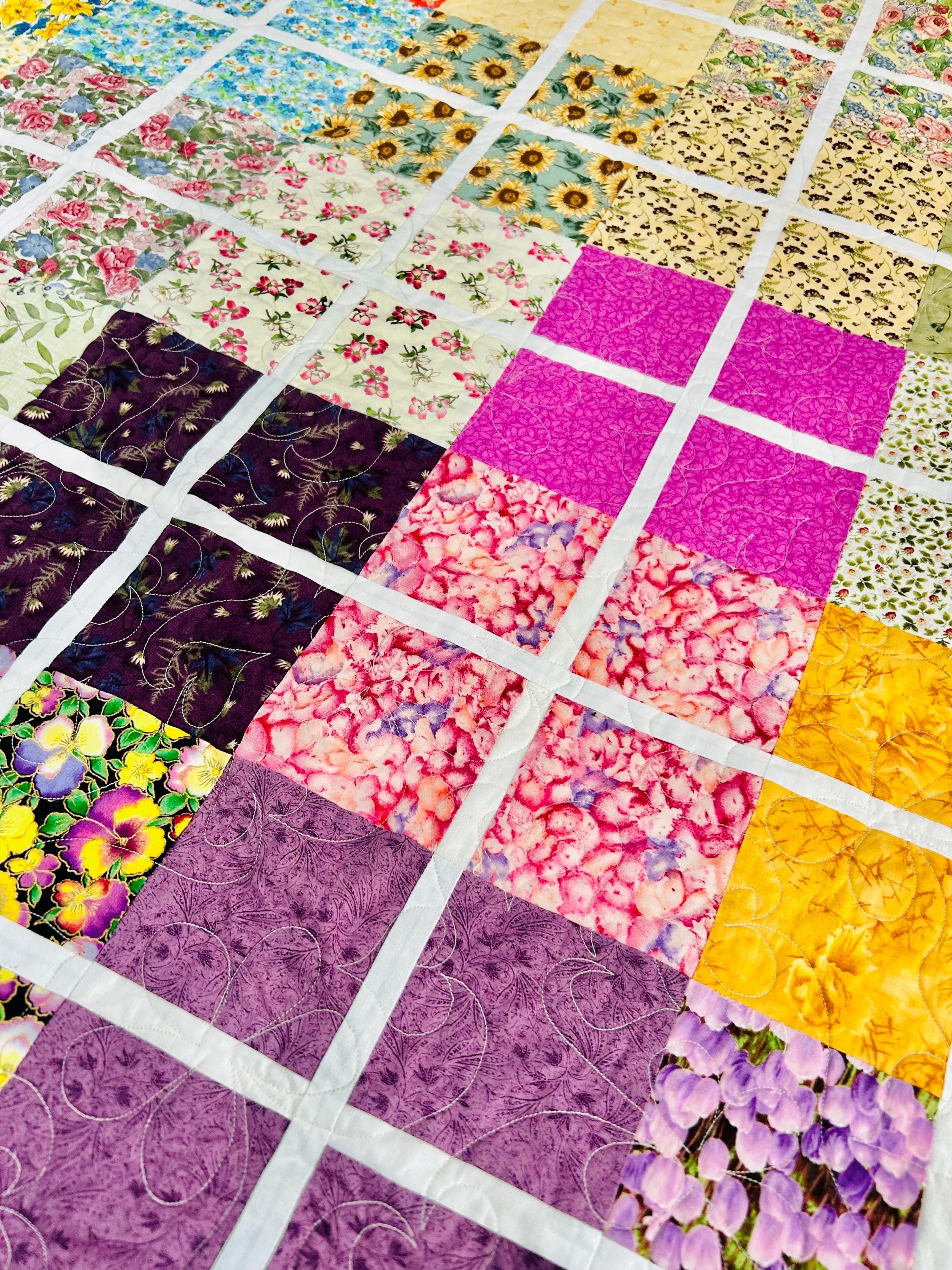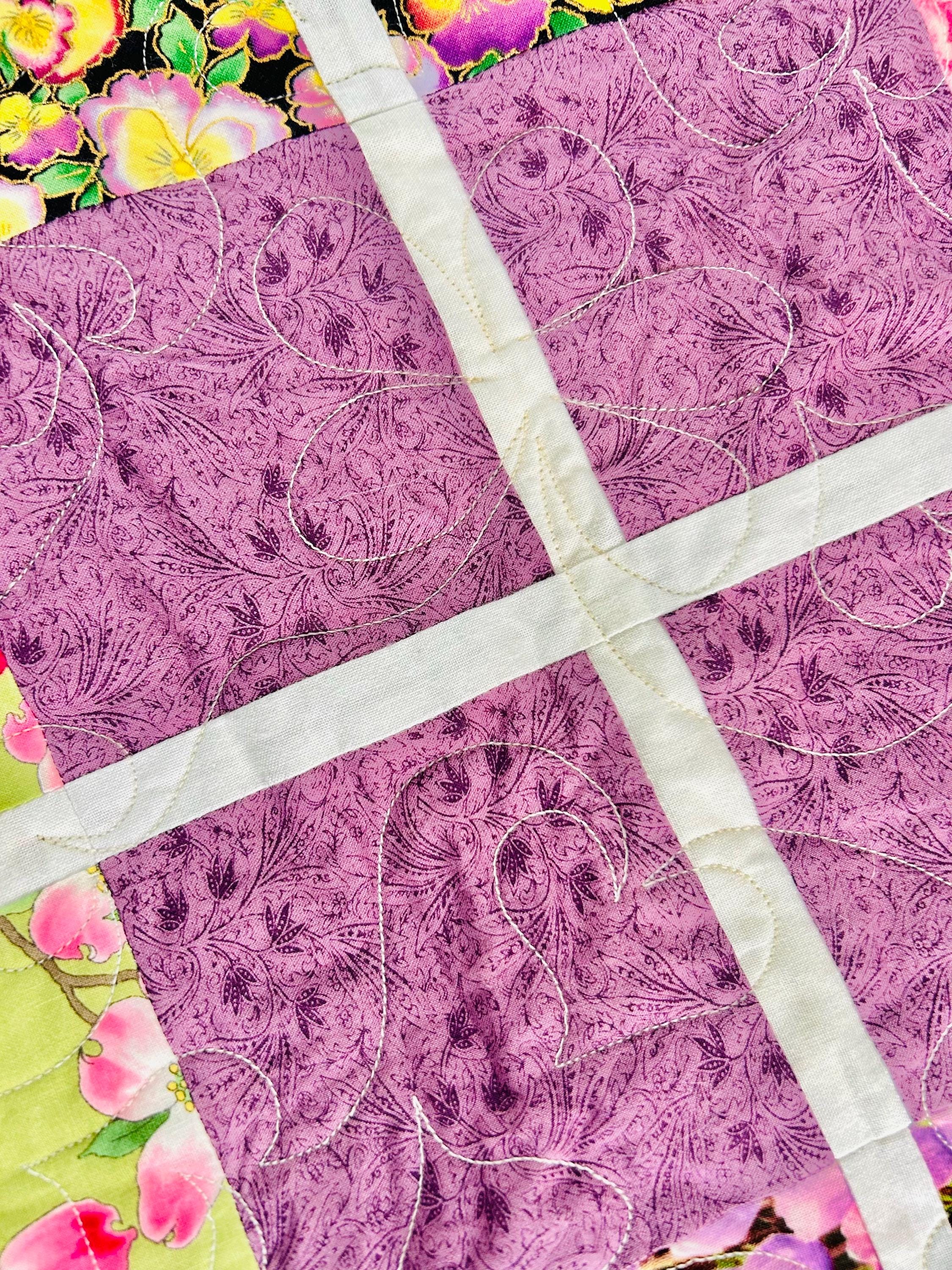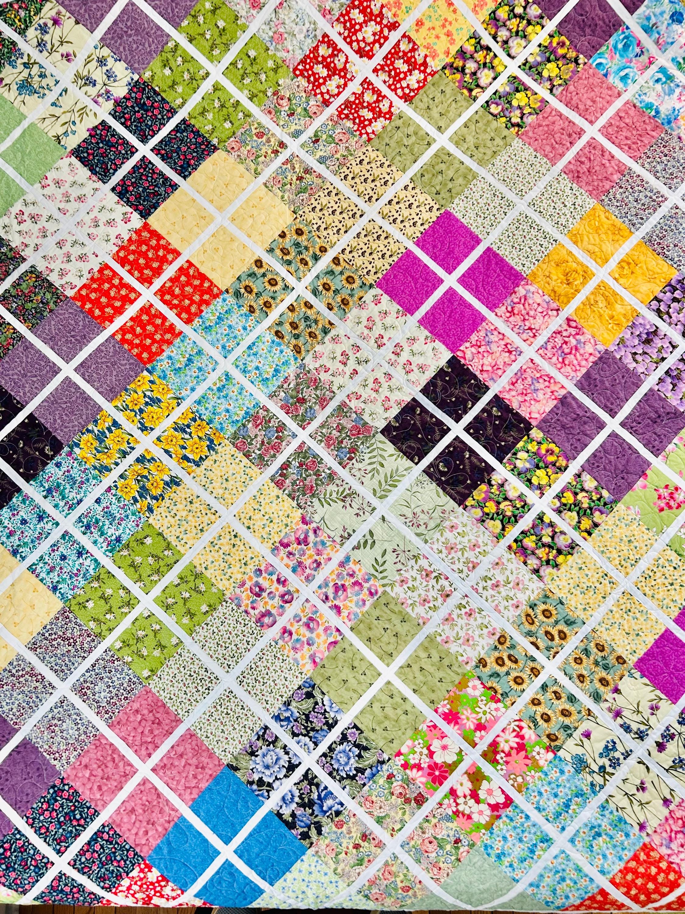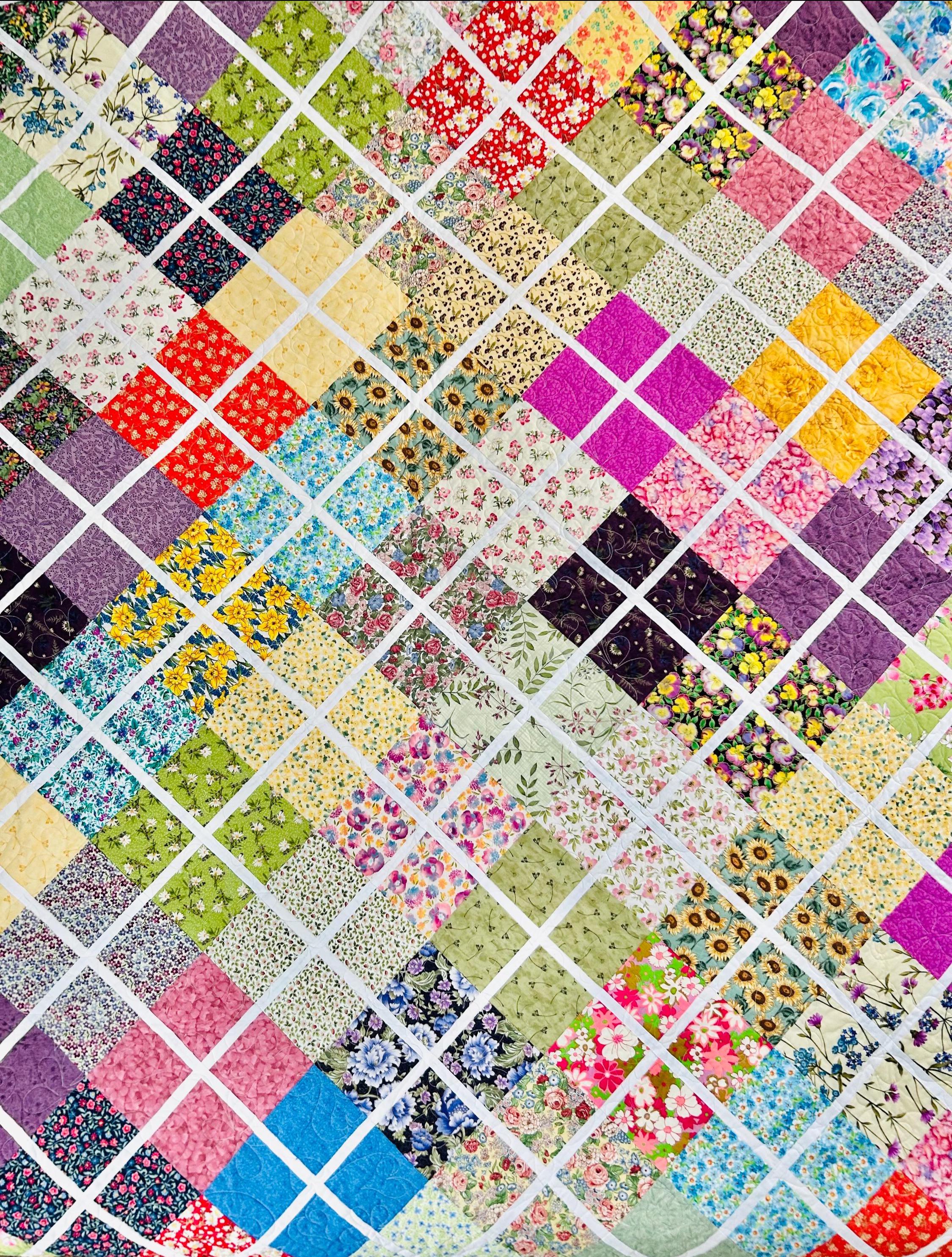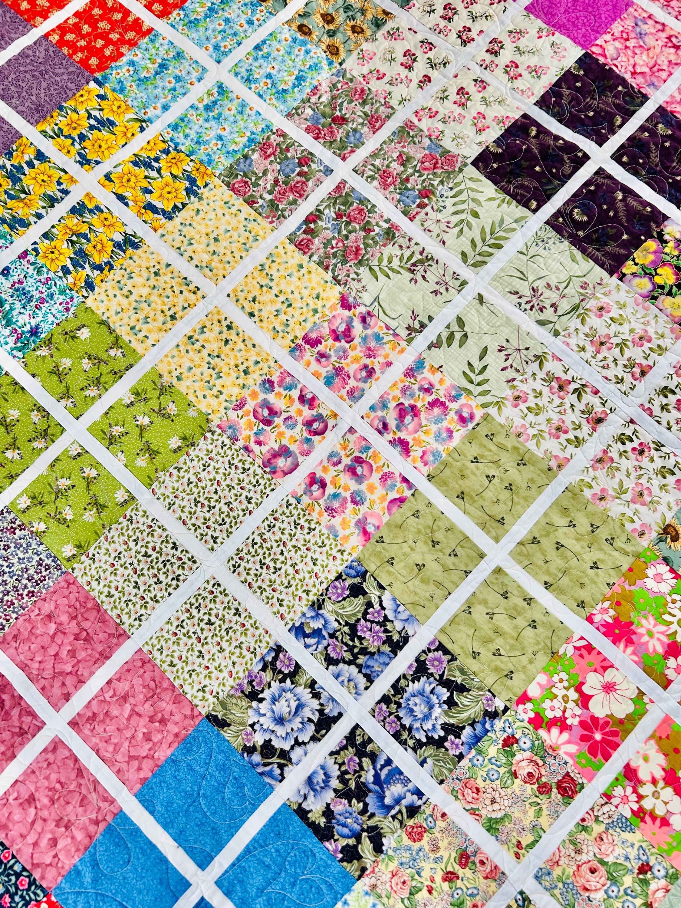 Details • Pattern: Sandcastle design with white sashing • Date: 2012 • Size: 82"x82" • Fabrics: High-quality 100% cotton prints • Colors: Multicolor florals with white sashing and green border • Batting: Lightweight batting • Construction: Machine pieced and long-arm quilted • Edge Finish: Green print matching border print • Condition: Excellent condition