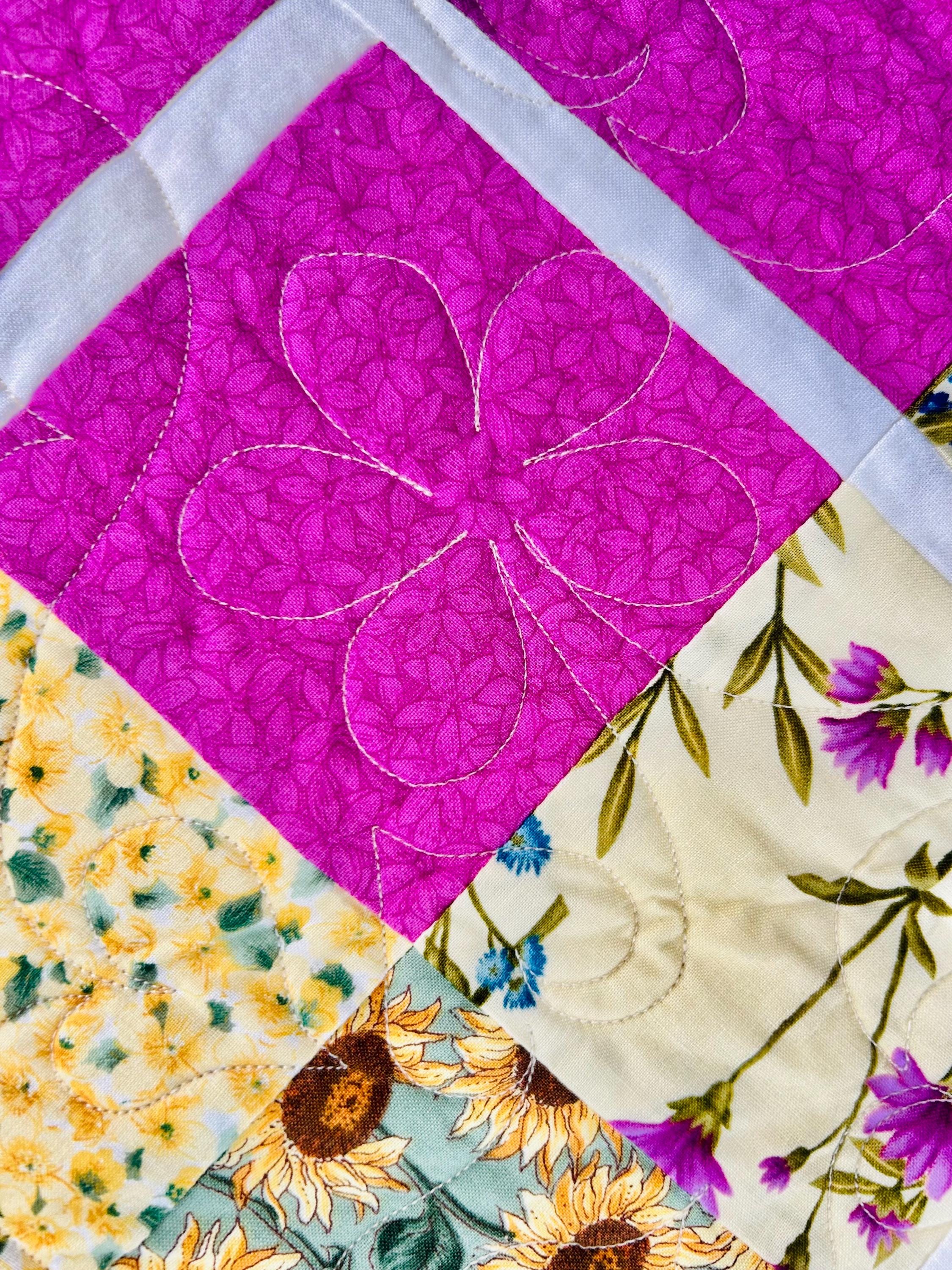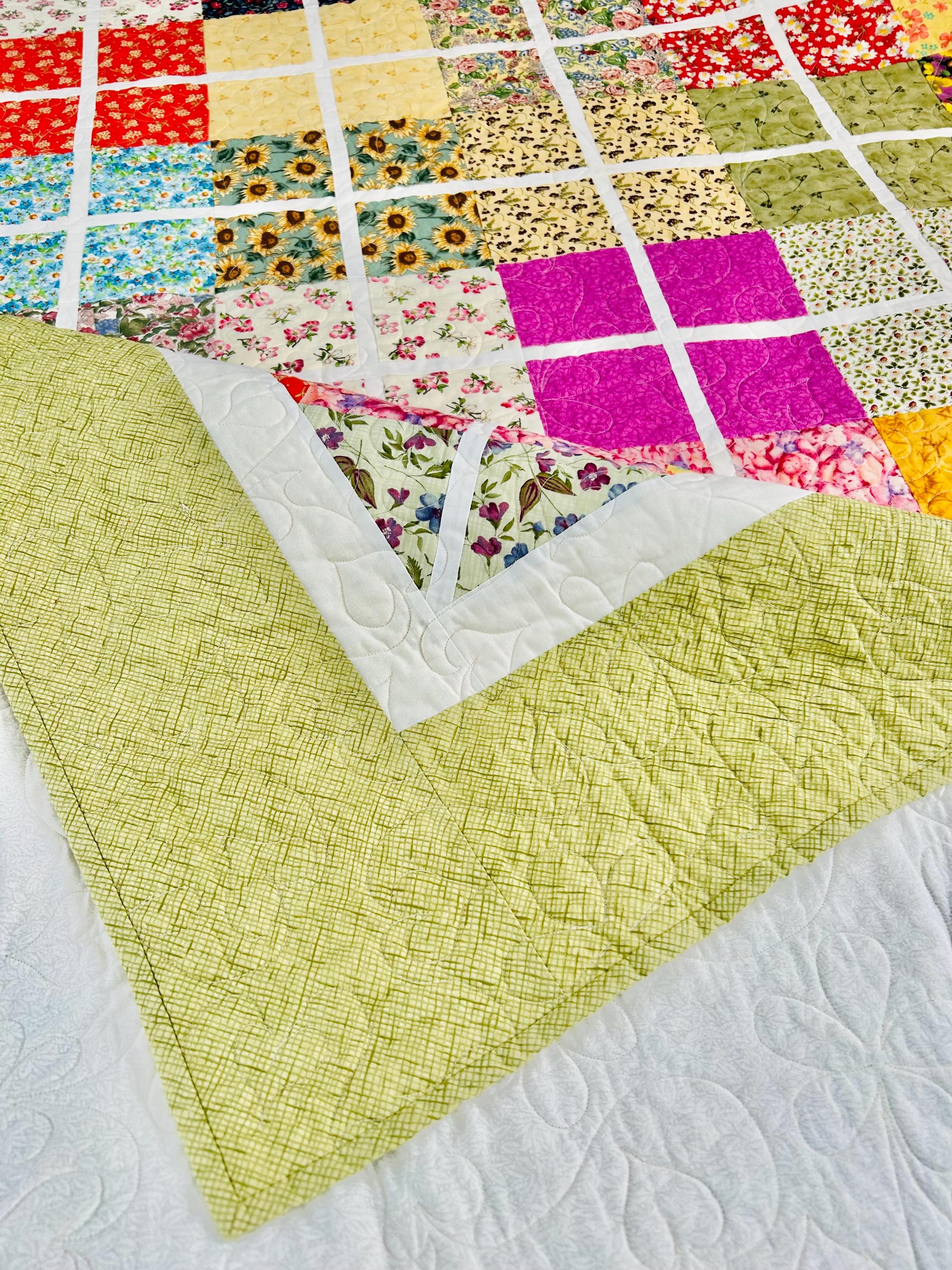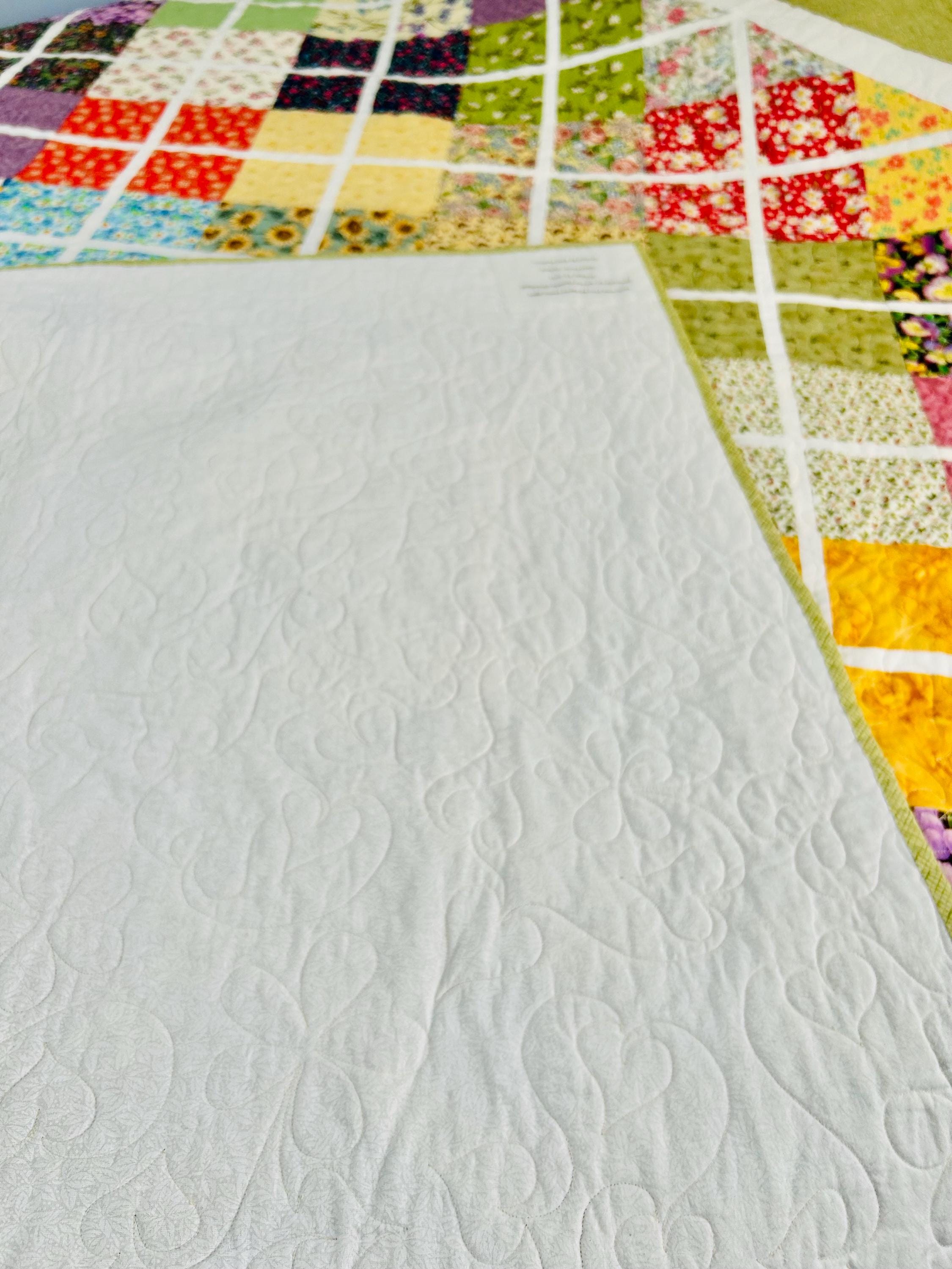 The back is a white and tan print while the binding is a green geometric print (matching the four-sided border) that has been machine-stitched to the front and hand-stitched to the back. The batting is lightweight.