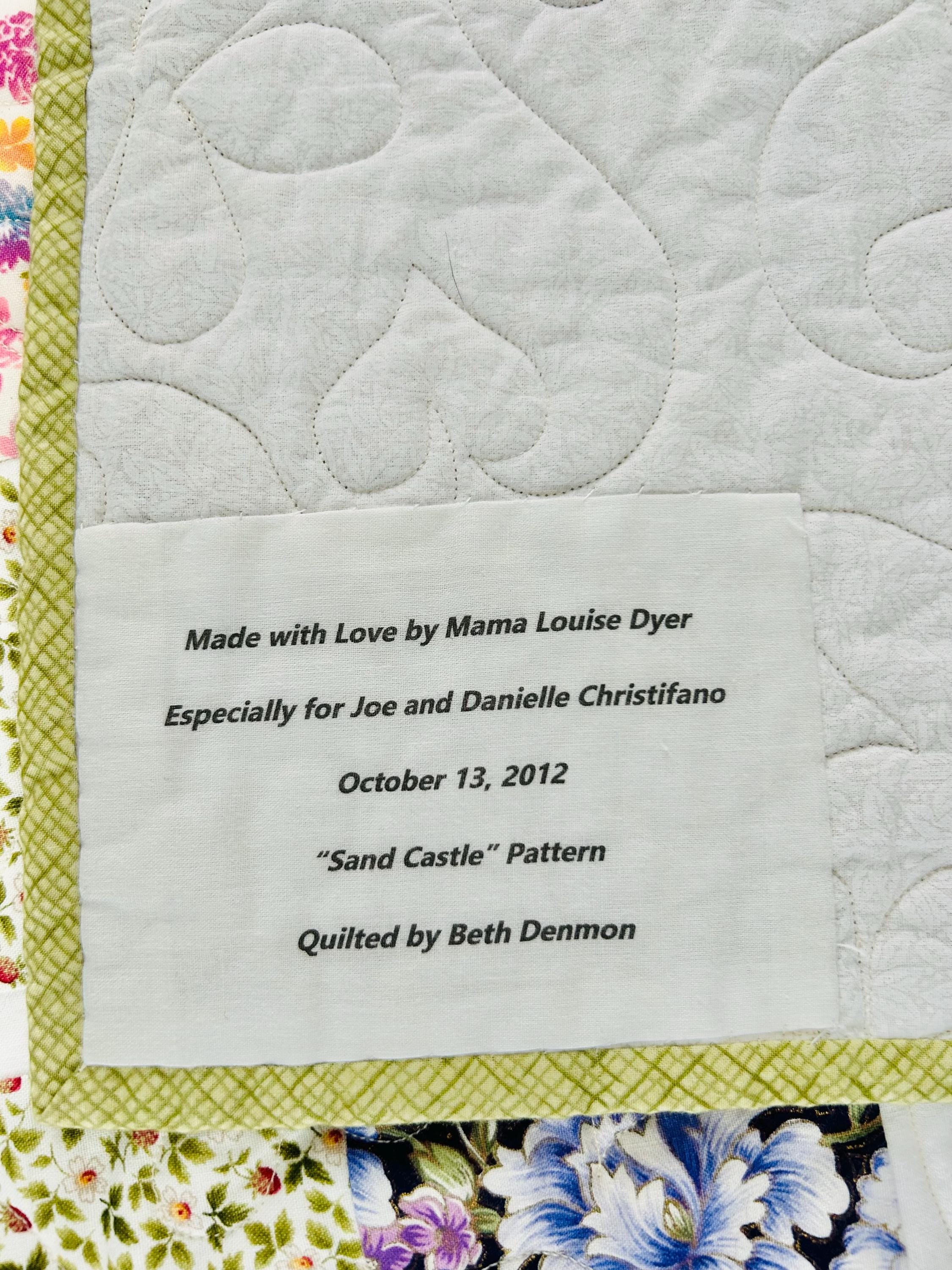 This beautiful Sandcastle design quilt is a vibrant and inviting piece, made in 2012 using high-quality cotton fabrics. The pattern creates a wonderful lattice effect, with crisp white sashing framing each colorful square and giving the quilt a light, airy architectural feel—very much like the ordered symmetry of a classic Sandcastle layout. The longarm quilting is in flowers, hearts, waves and curlicues.