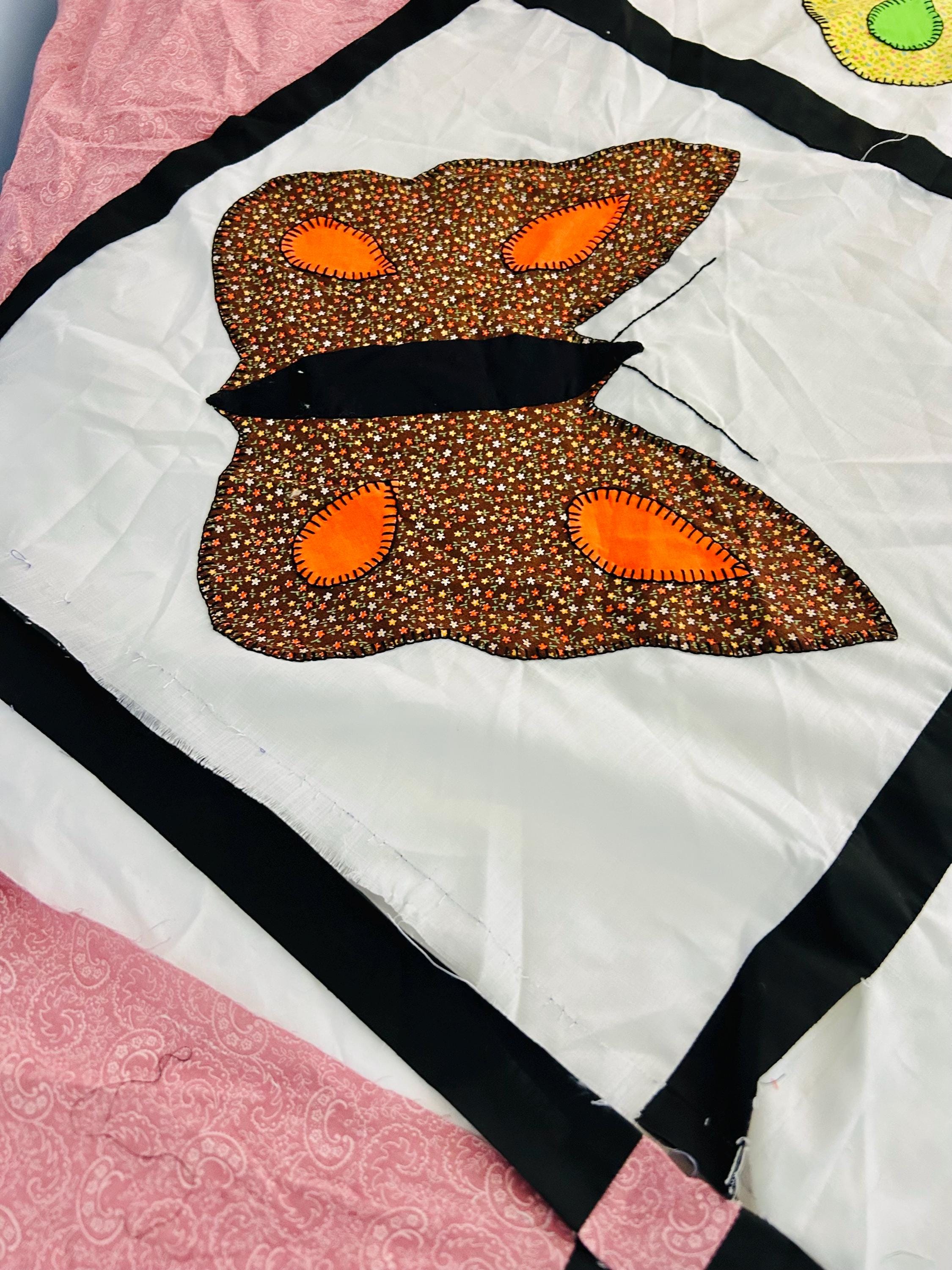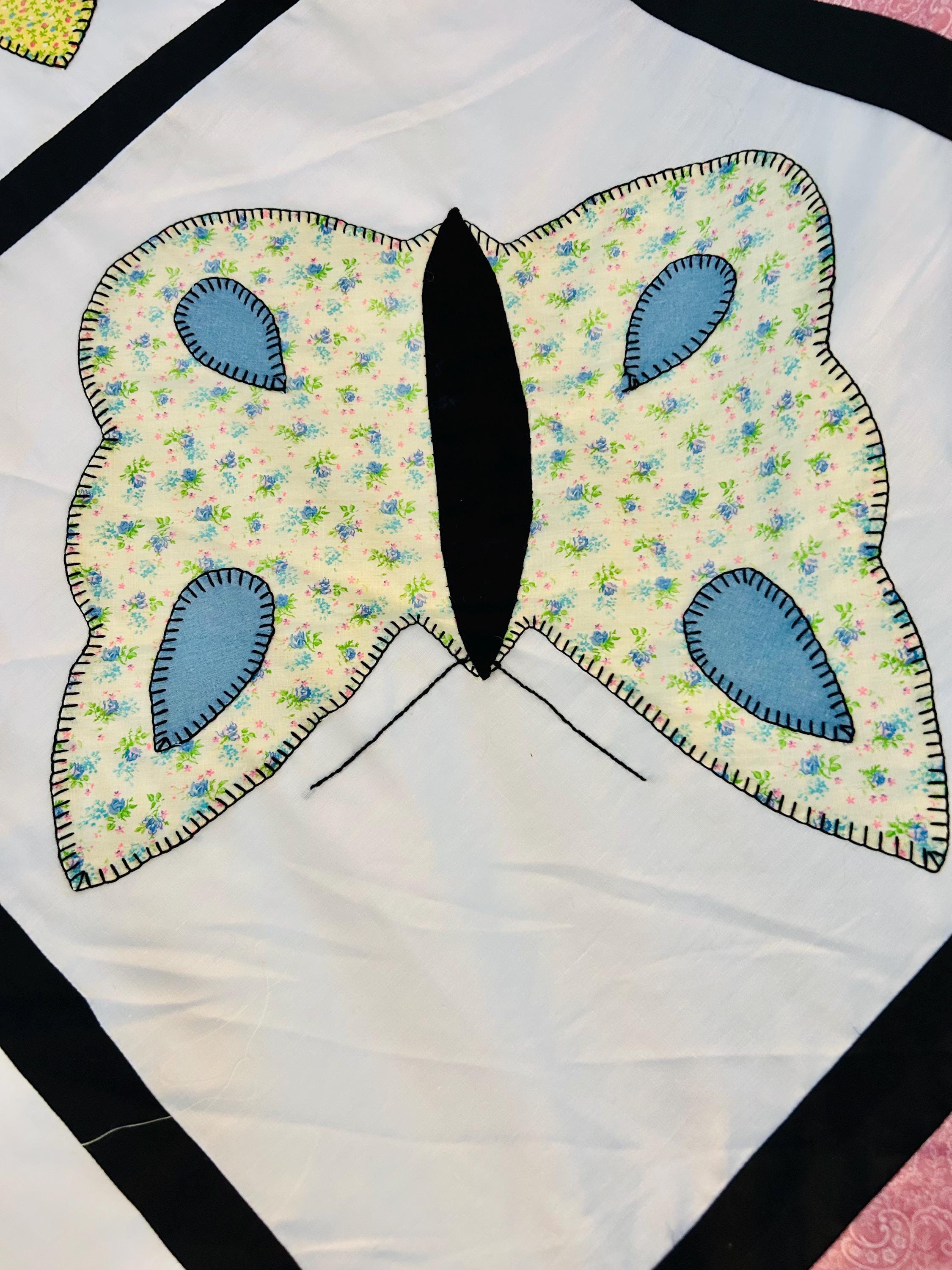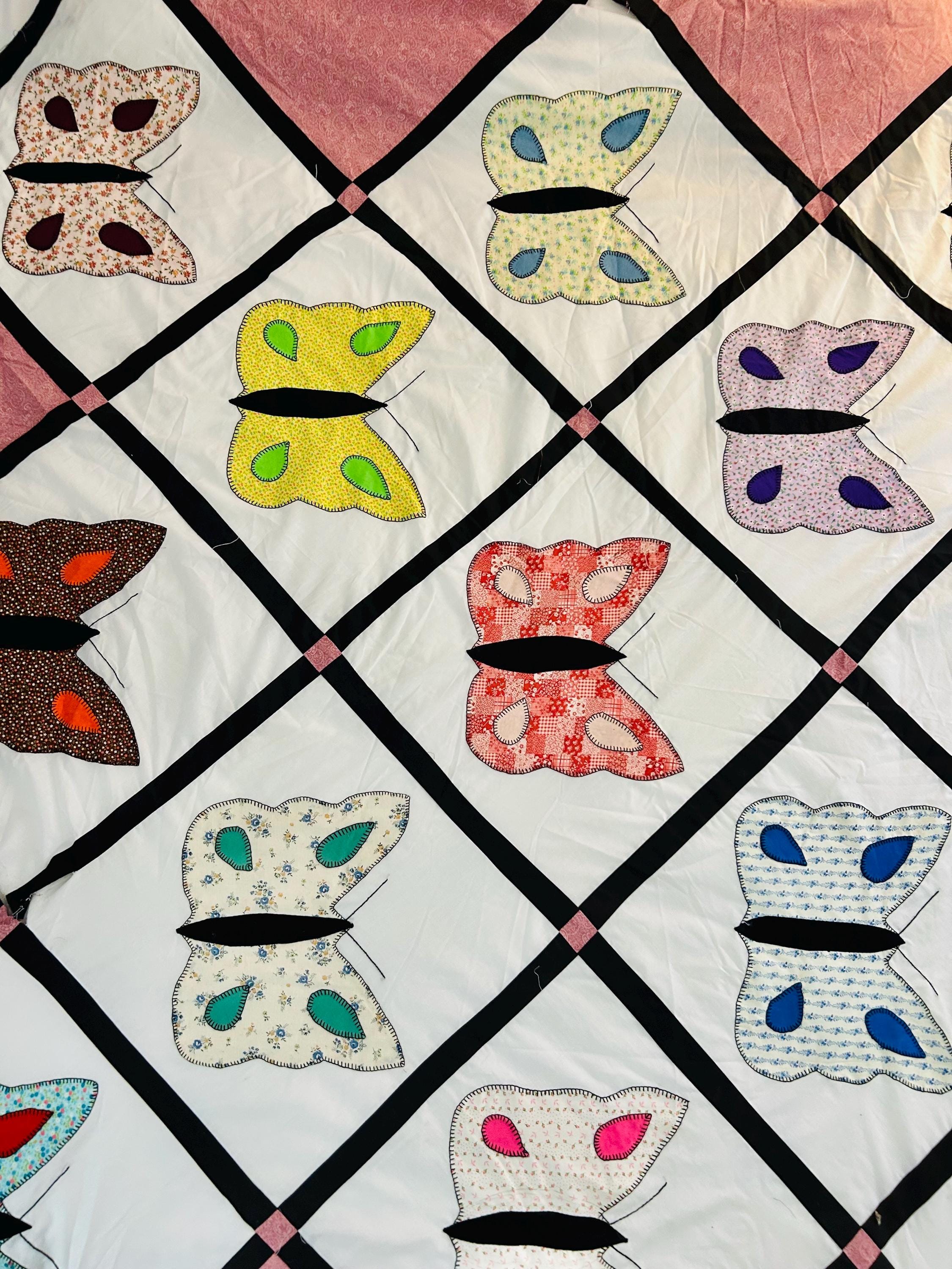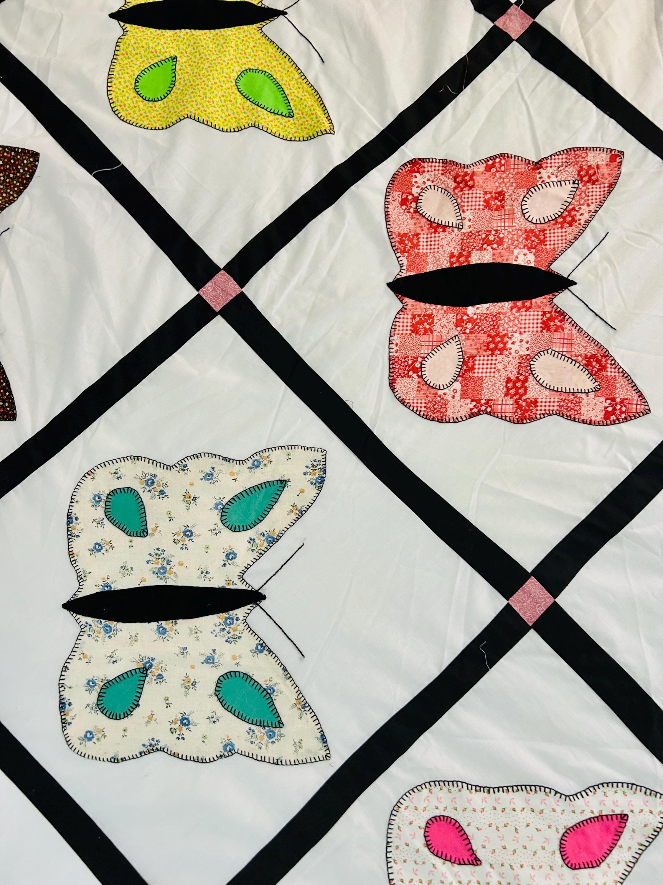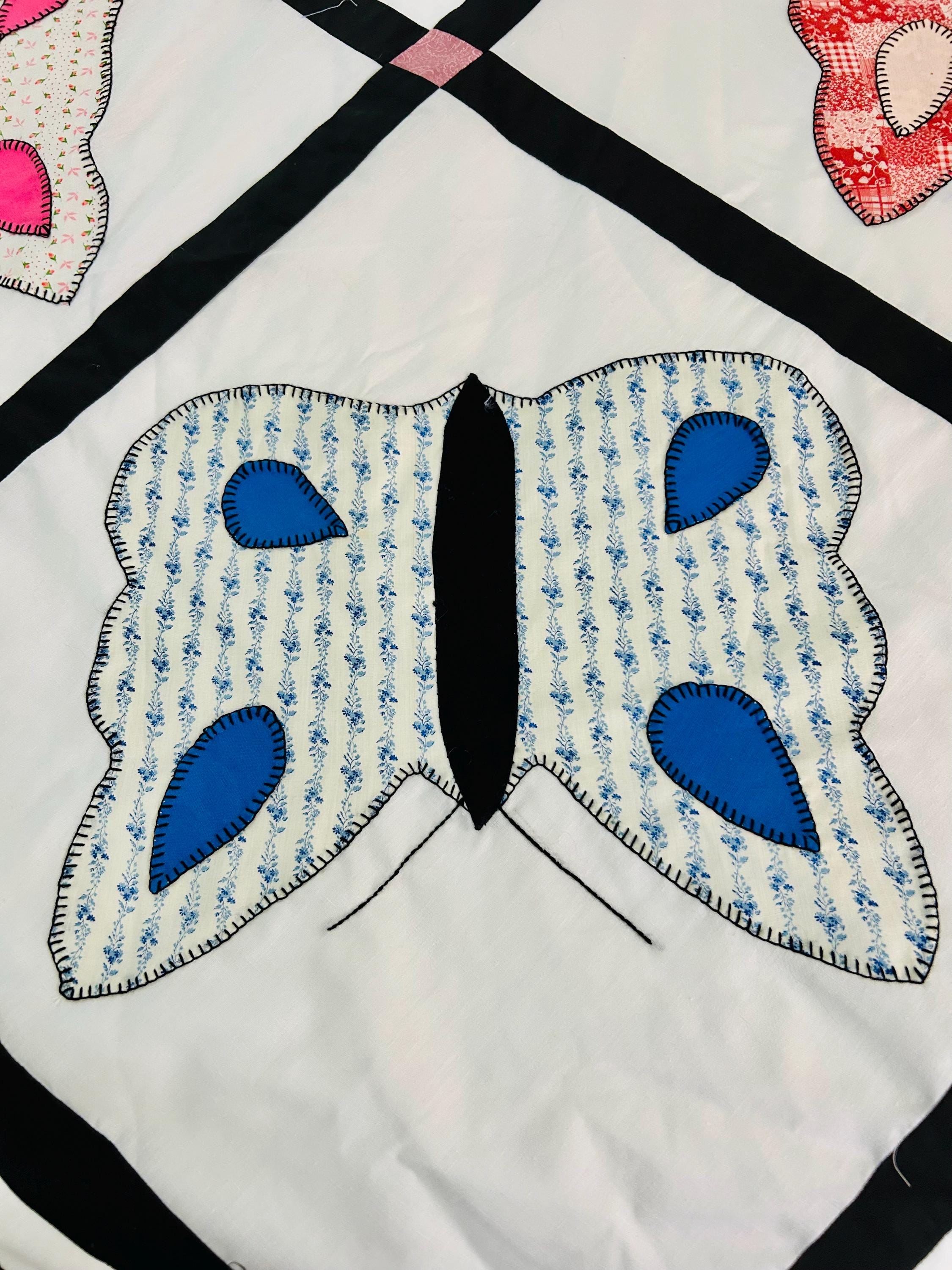 Details: • Size: 76” x 78” • Era: Late 1960s–1970s • Construction: Hand-appliquéd butterflies with blanket stitch embroidery • Materials: Cotton and cotton blend fabrics • Layout: Black lattice sashing with pink cornerstones • Condition: Unfinished quilt top; no batting or backing attached