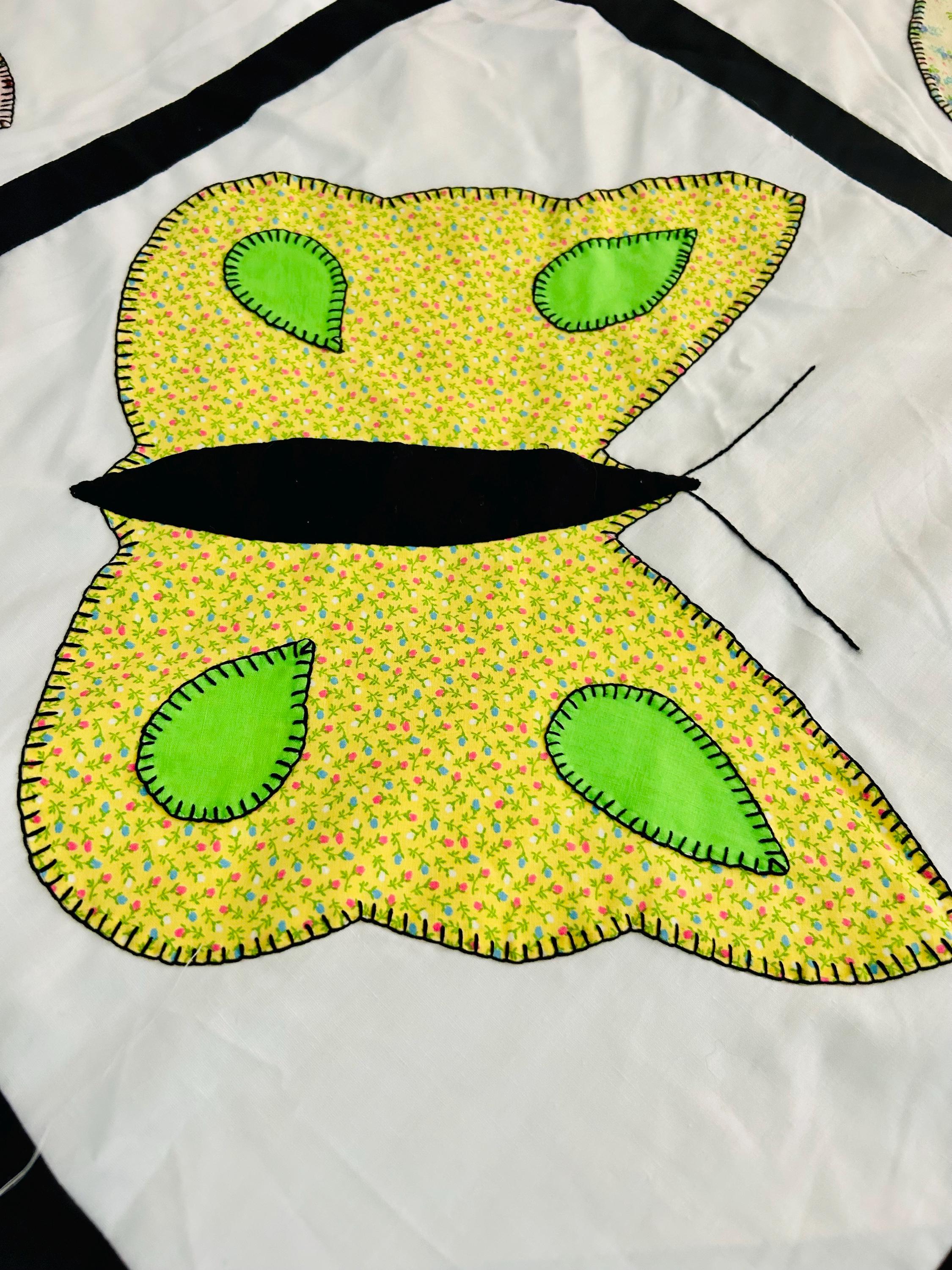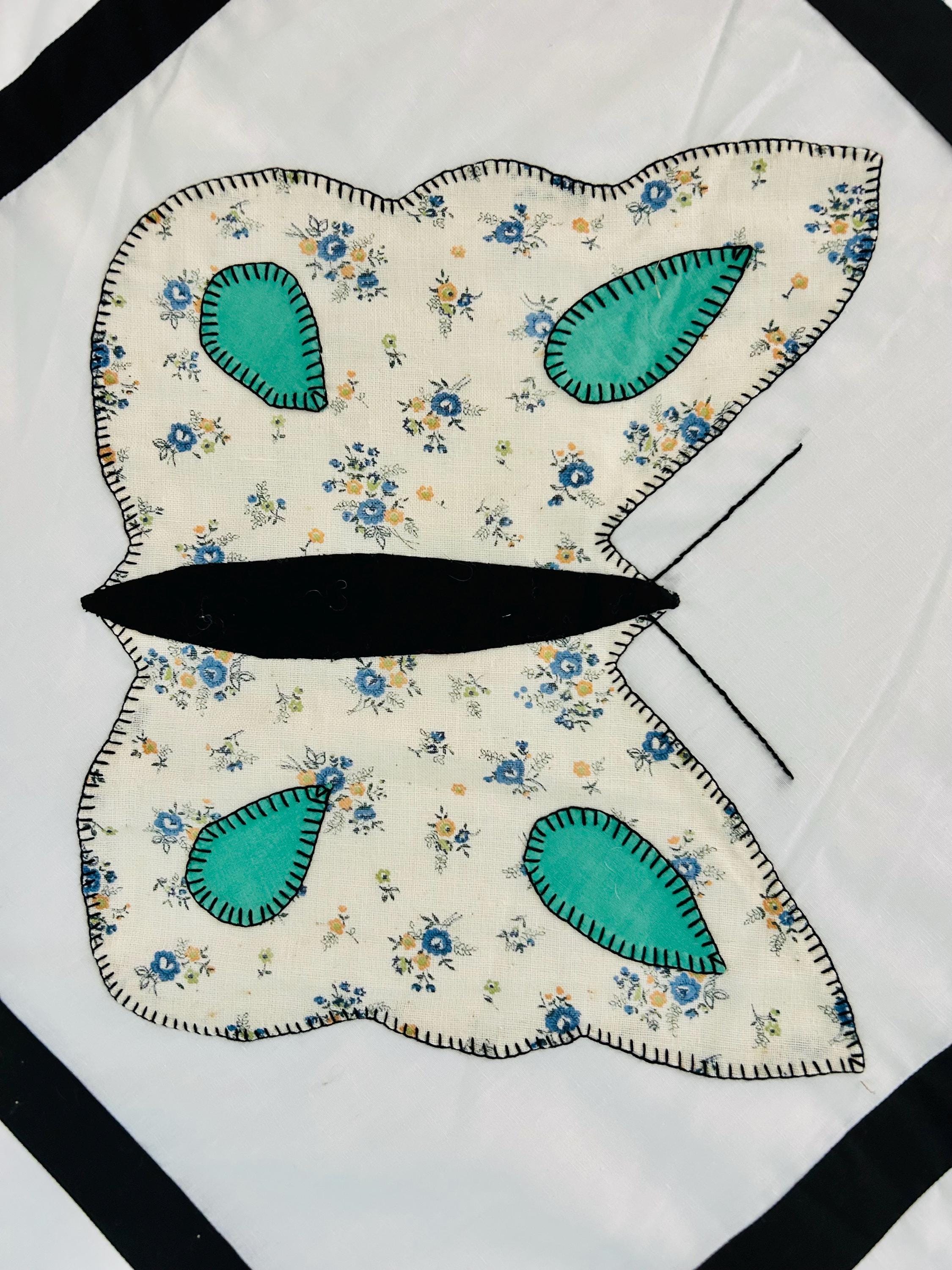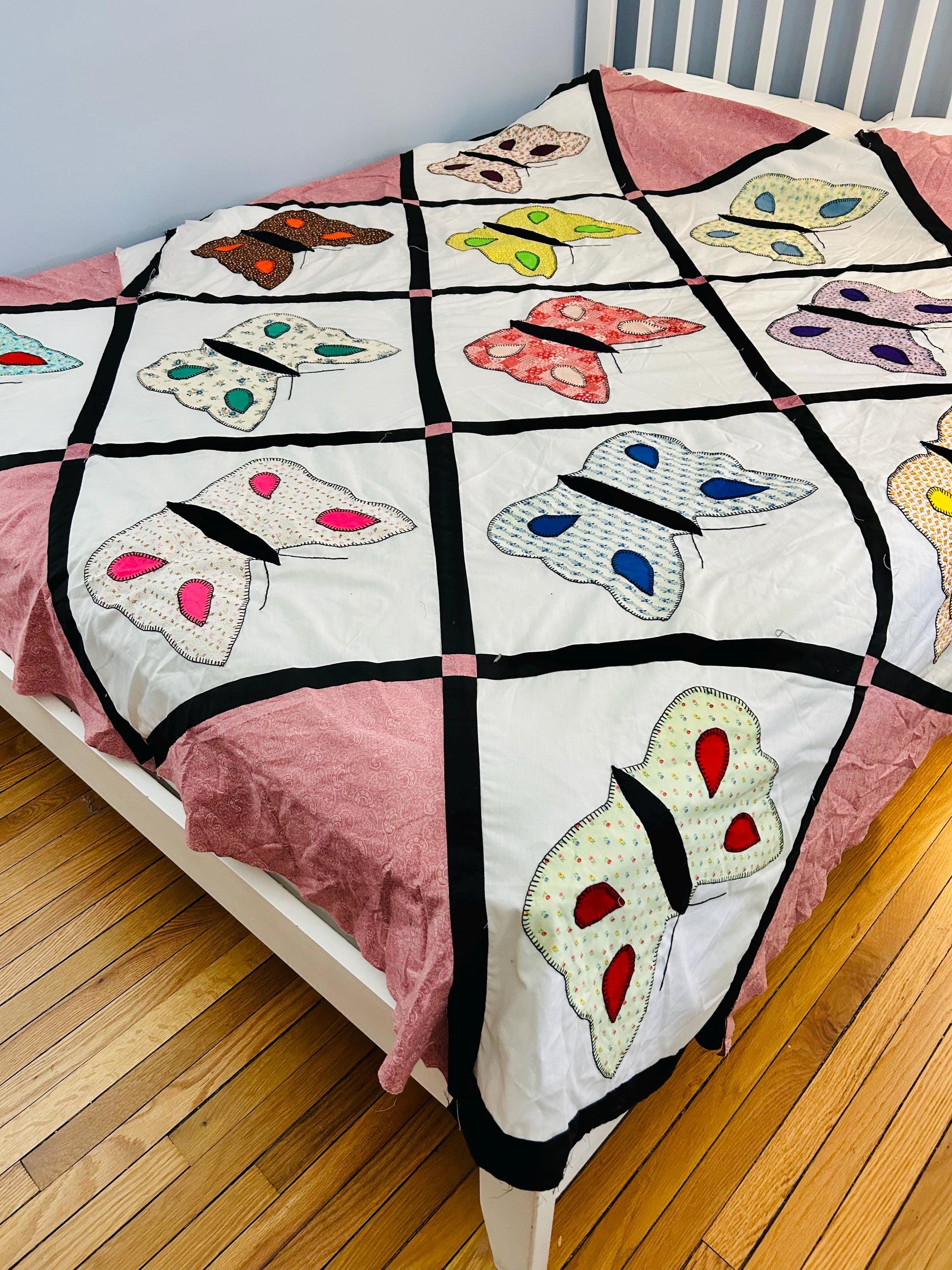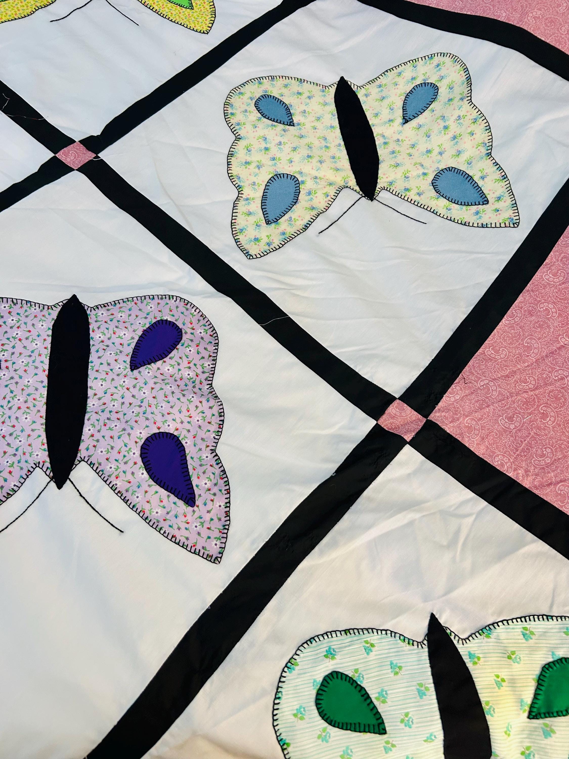 Details: • Size: 76” x 78” • Era: Late 1960s–1970s • Construction: Hand-appliquéd butterflies with blanket stitch embroidery • Materials: Cotton and cotton blend fabrics • Layout: Black lattice sashing with pink cornerstones • Condition: Unfinished quilt top; no batting or backing attached