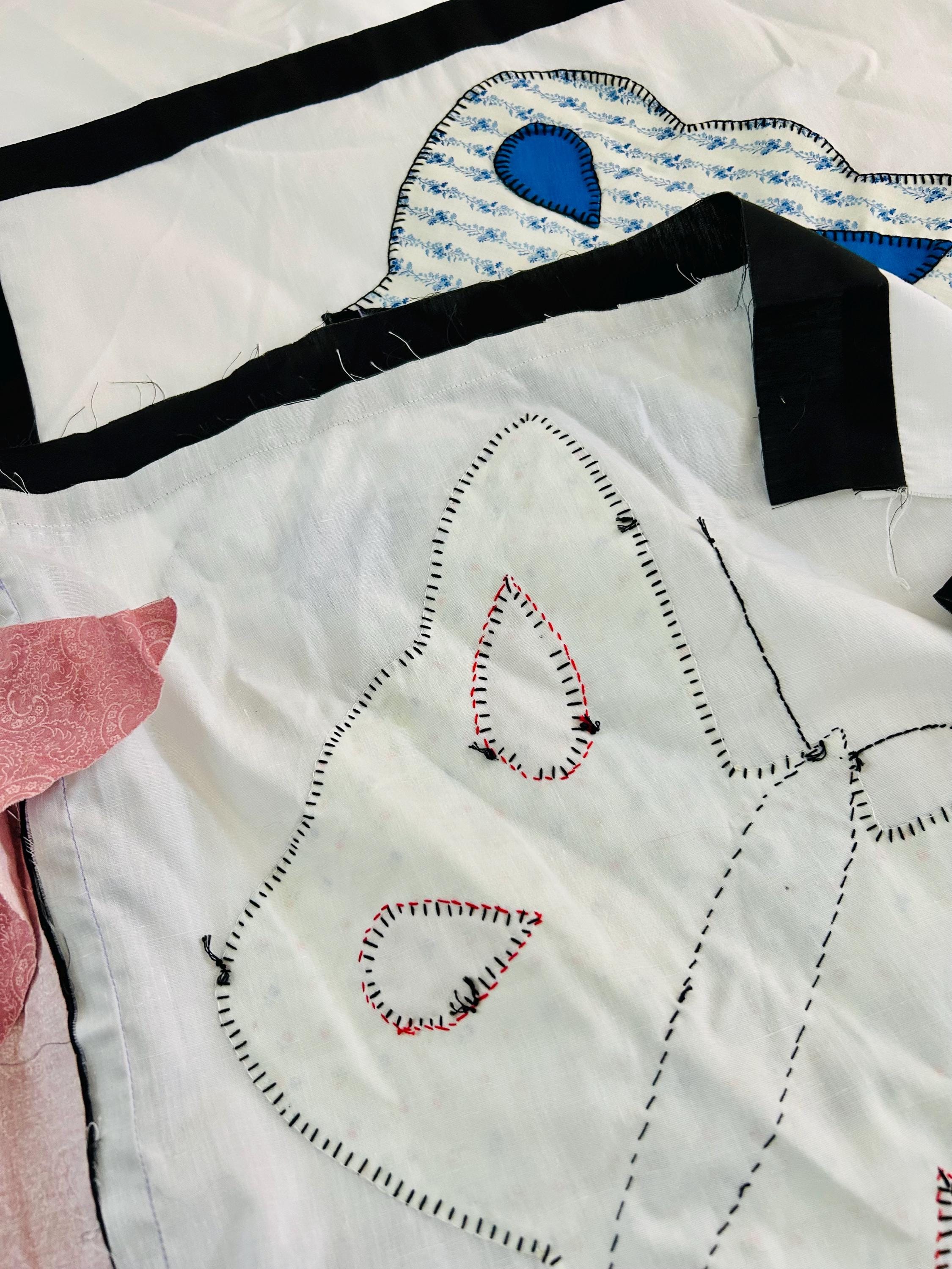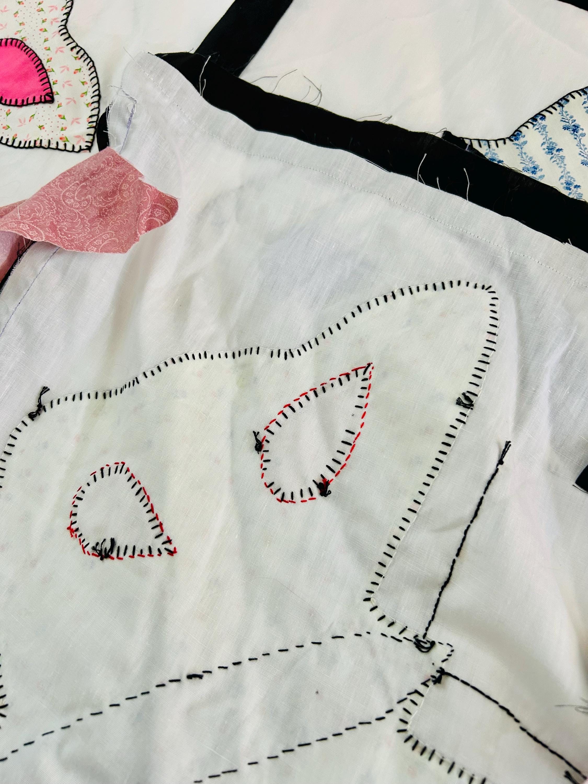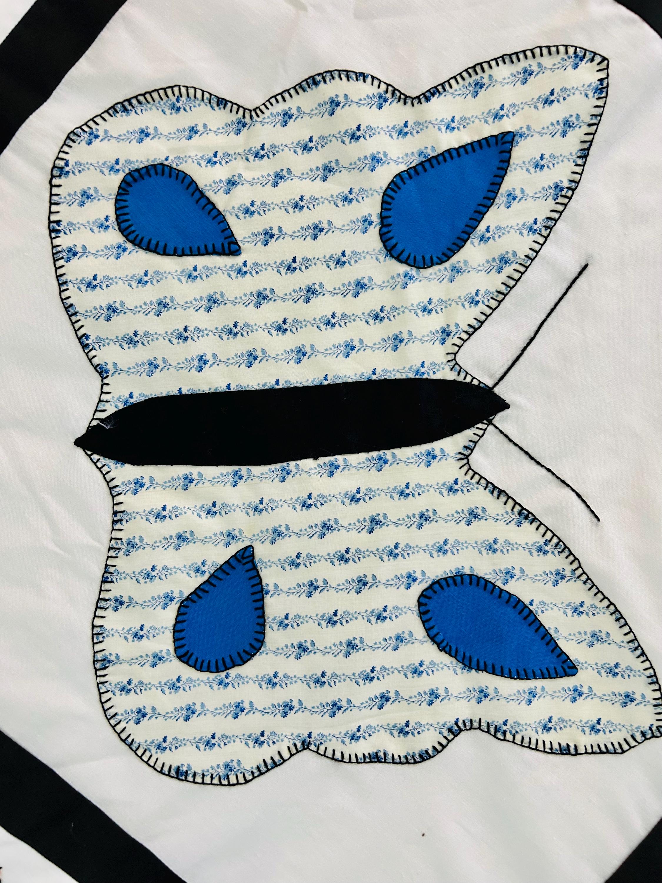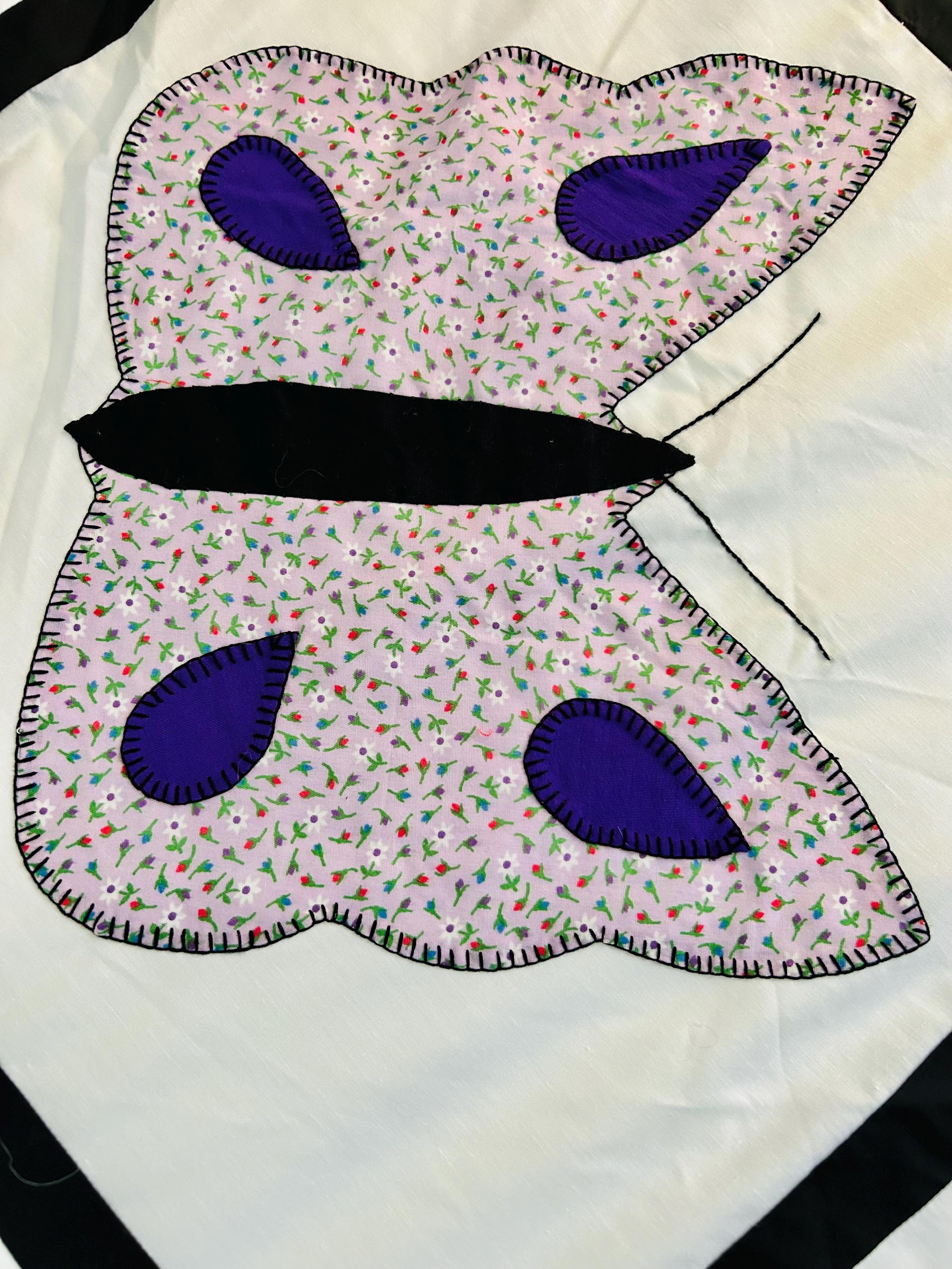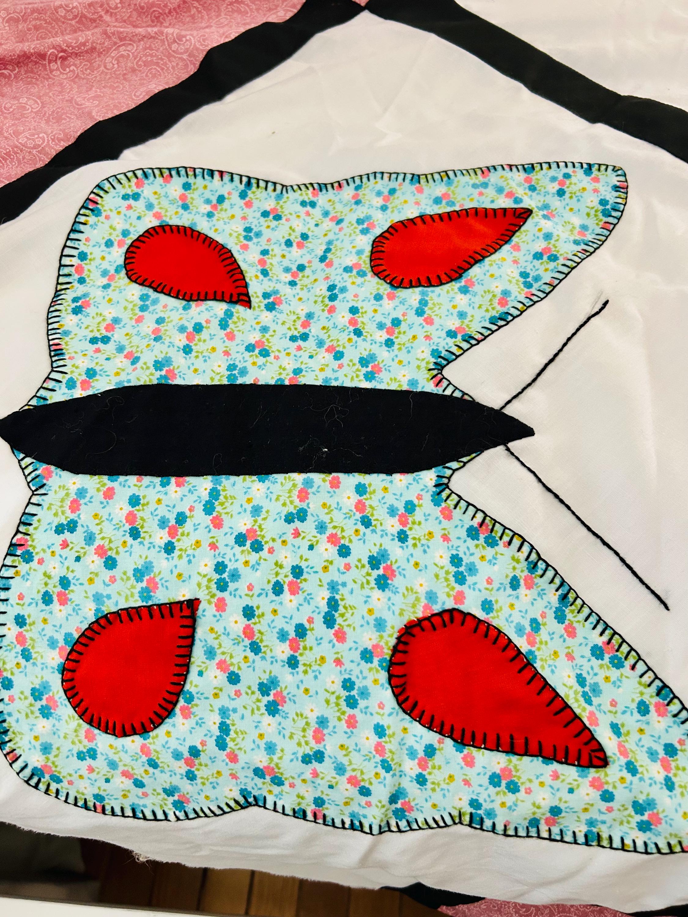 Details: • Size: 76” x 78” • Era: Late 1960s–1970s • Construction: Hand-appliquéd butterflies with blanket stitch embroidery • Materials: Cotton and cotton blend fabrics • Layout: Black lattice sashing with pink cornerstones • Condition: Unfinished quilt top; no batting or backing attached