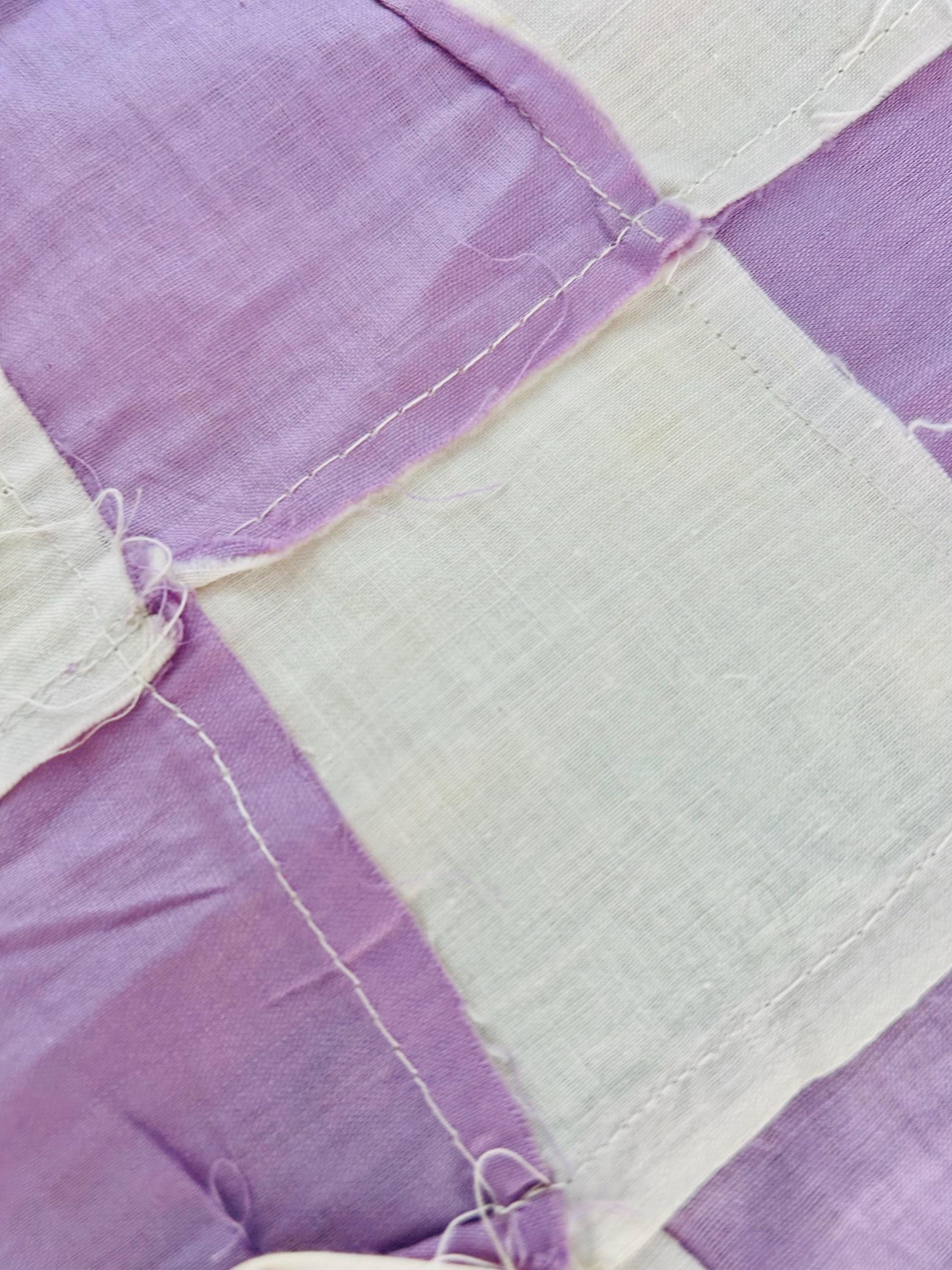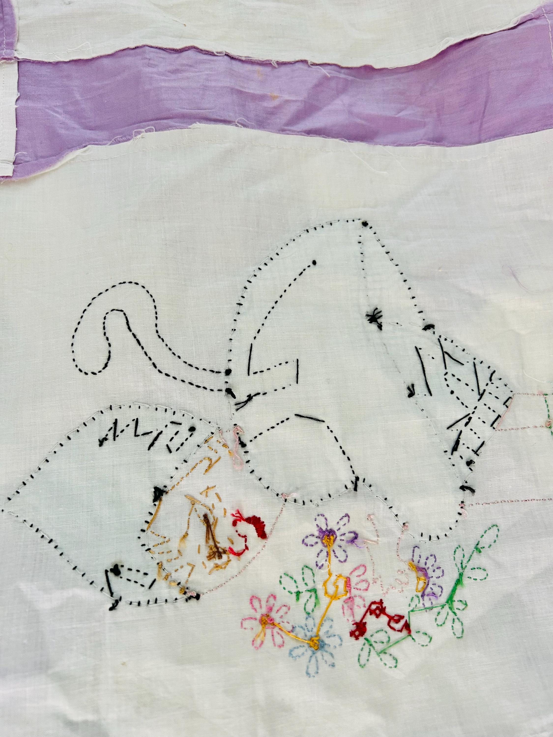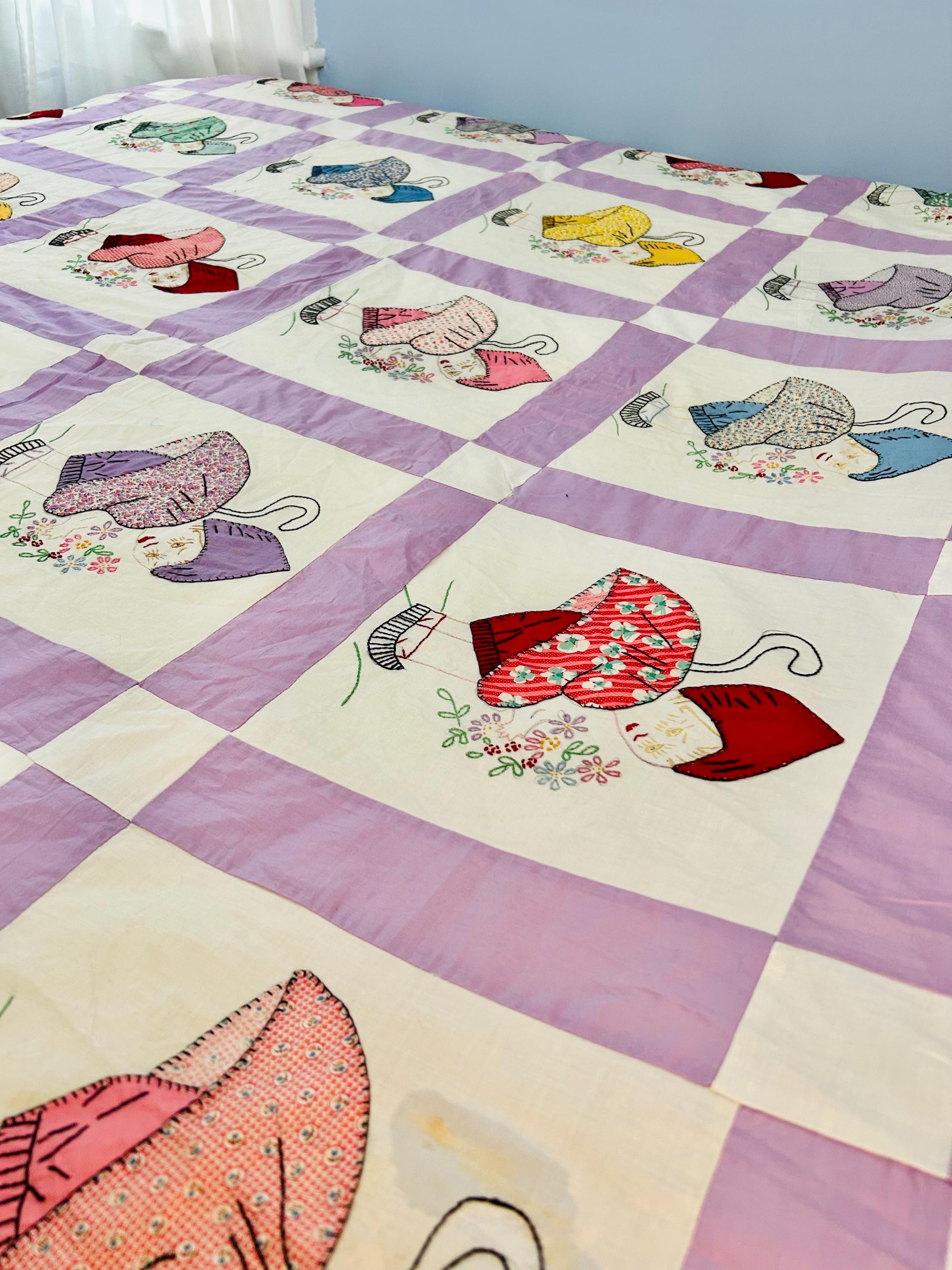 Details • Size: 75” x 88” • Construction: Hand appliqué with embroidered details • Cotton fabrics • Lavender and white checkerboard sashing • Blocks set in a grid layout