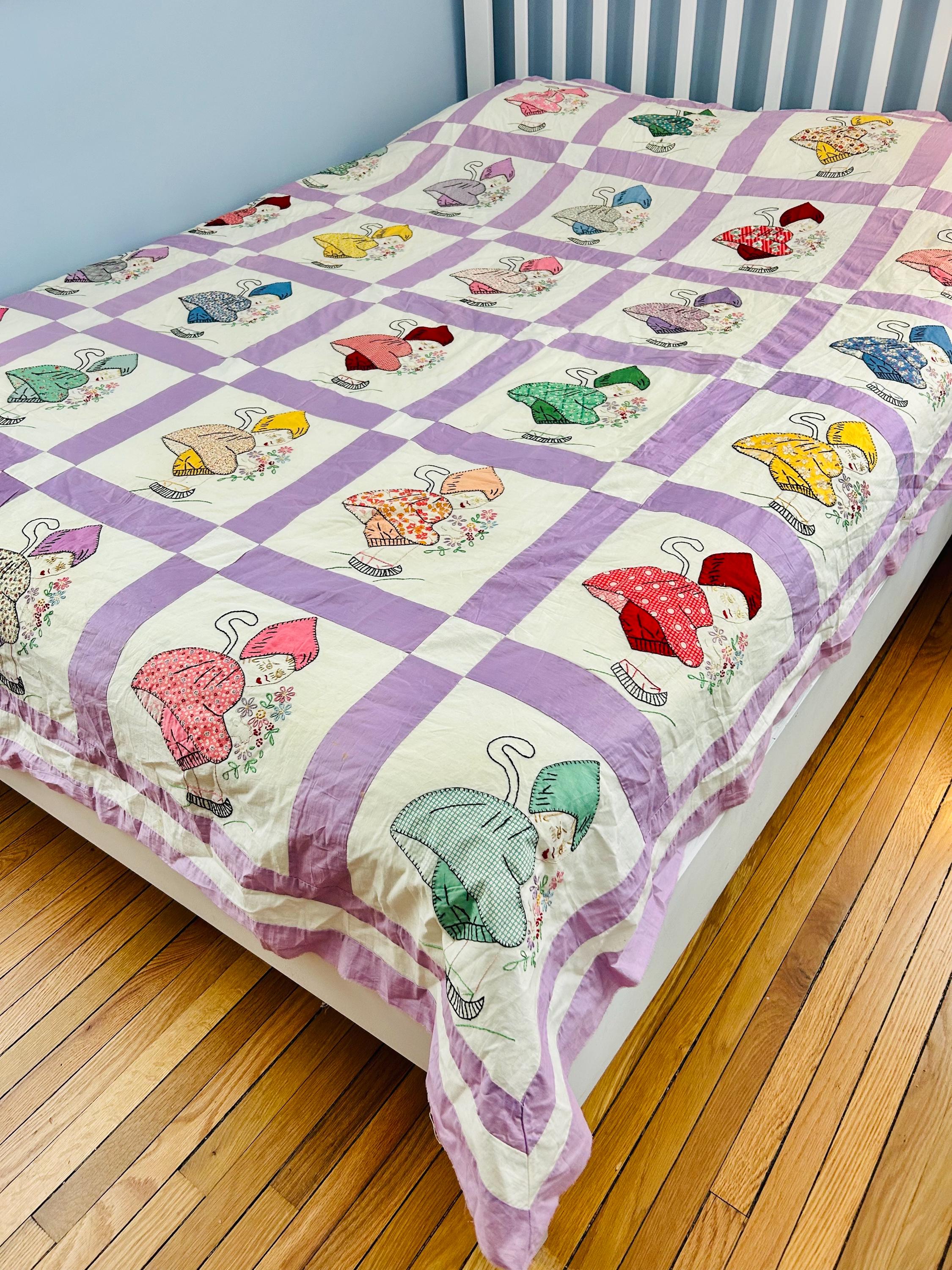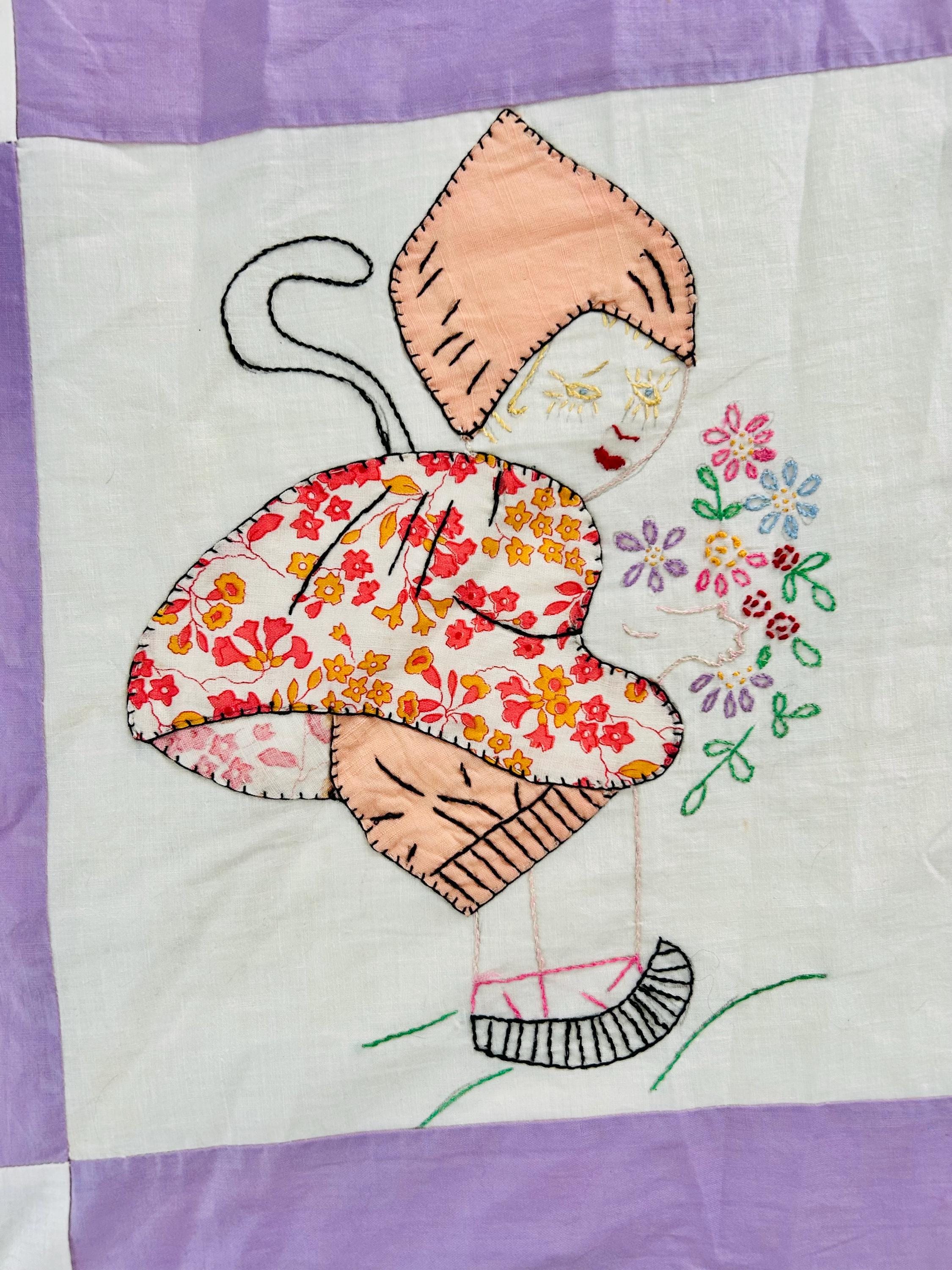 This is a rarely found and very delightful Depression-era quilt top that features a Dutch Doll (Dutch Girl) motif — a popular 1930s nursery design inspired by European folk costume imagery. During the 1930s, American quilt pattern companies embraced storybook and European folk themes and Dutch-themed designs became especially fashionable, though this particular design is difficult to find in either finished quilts or quilt tops.