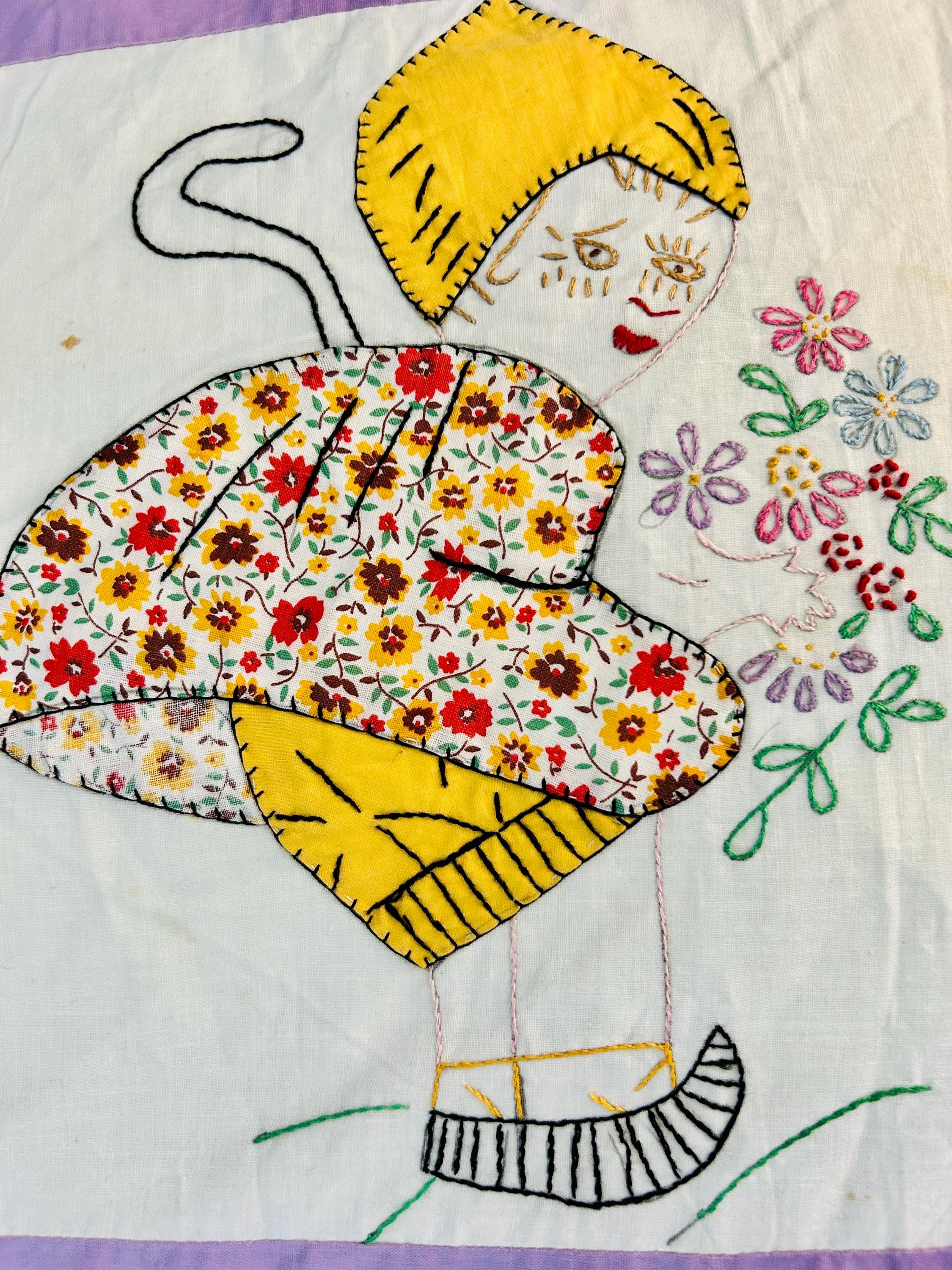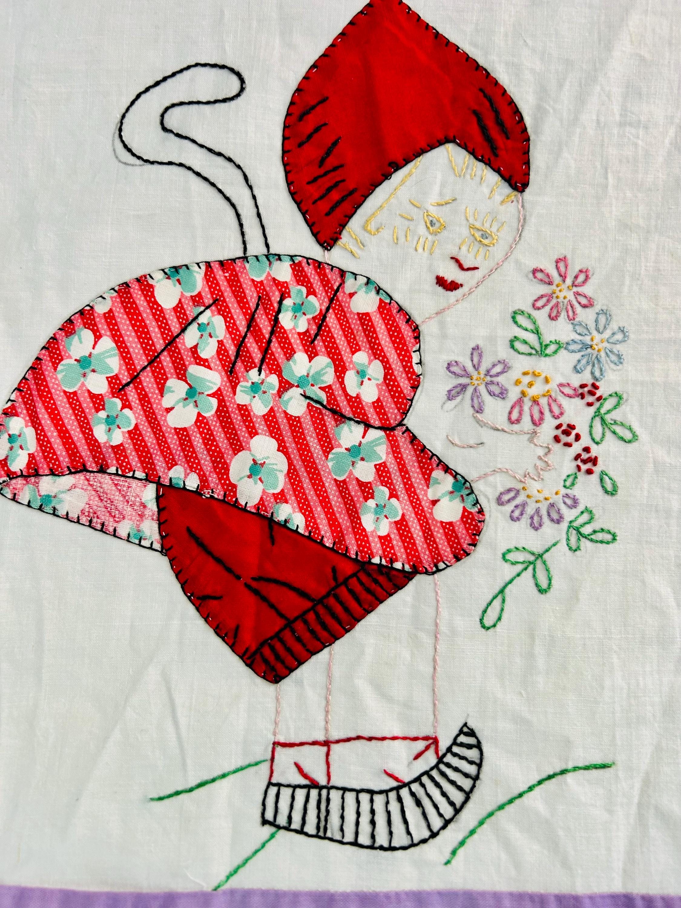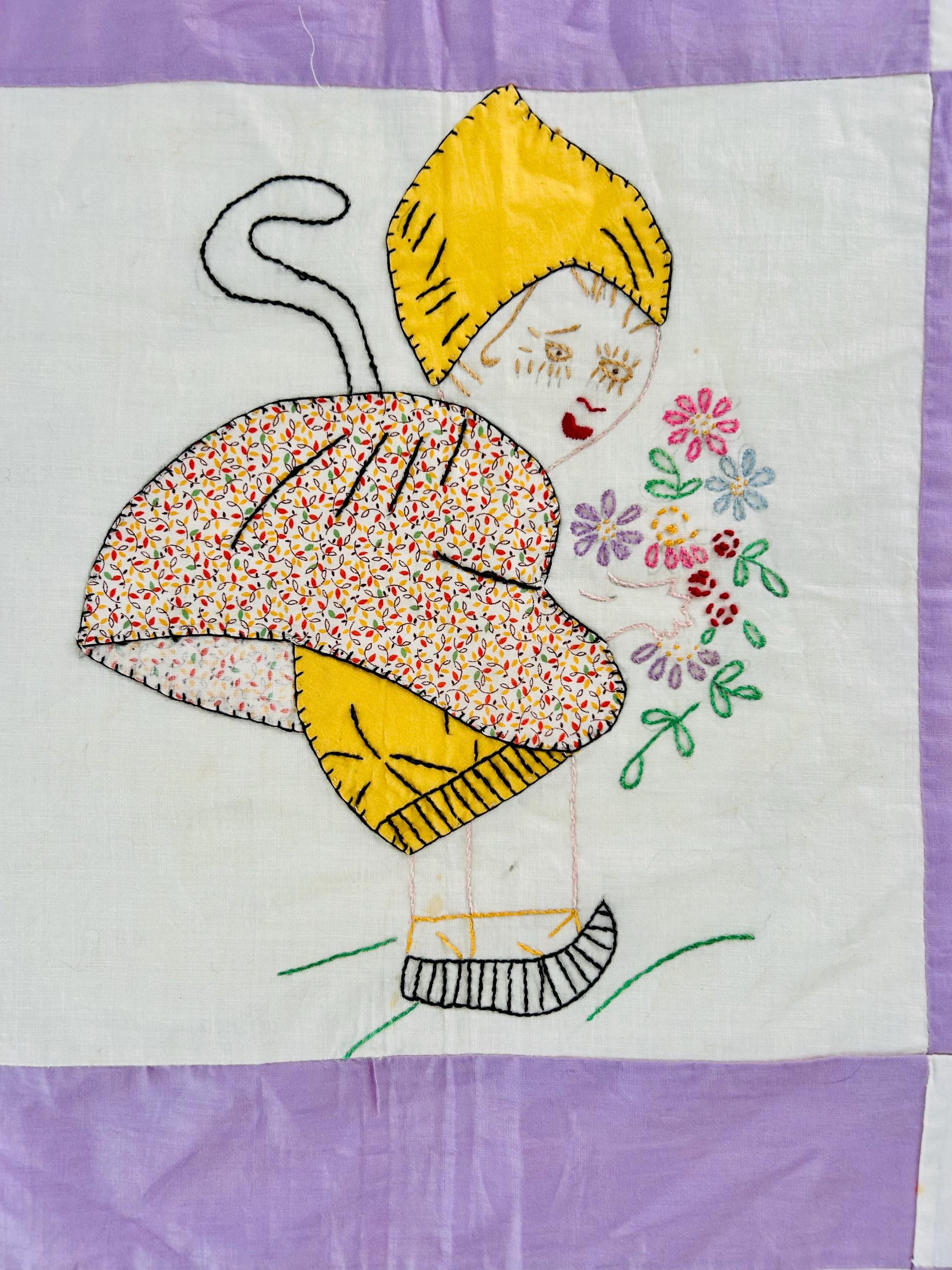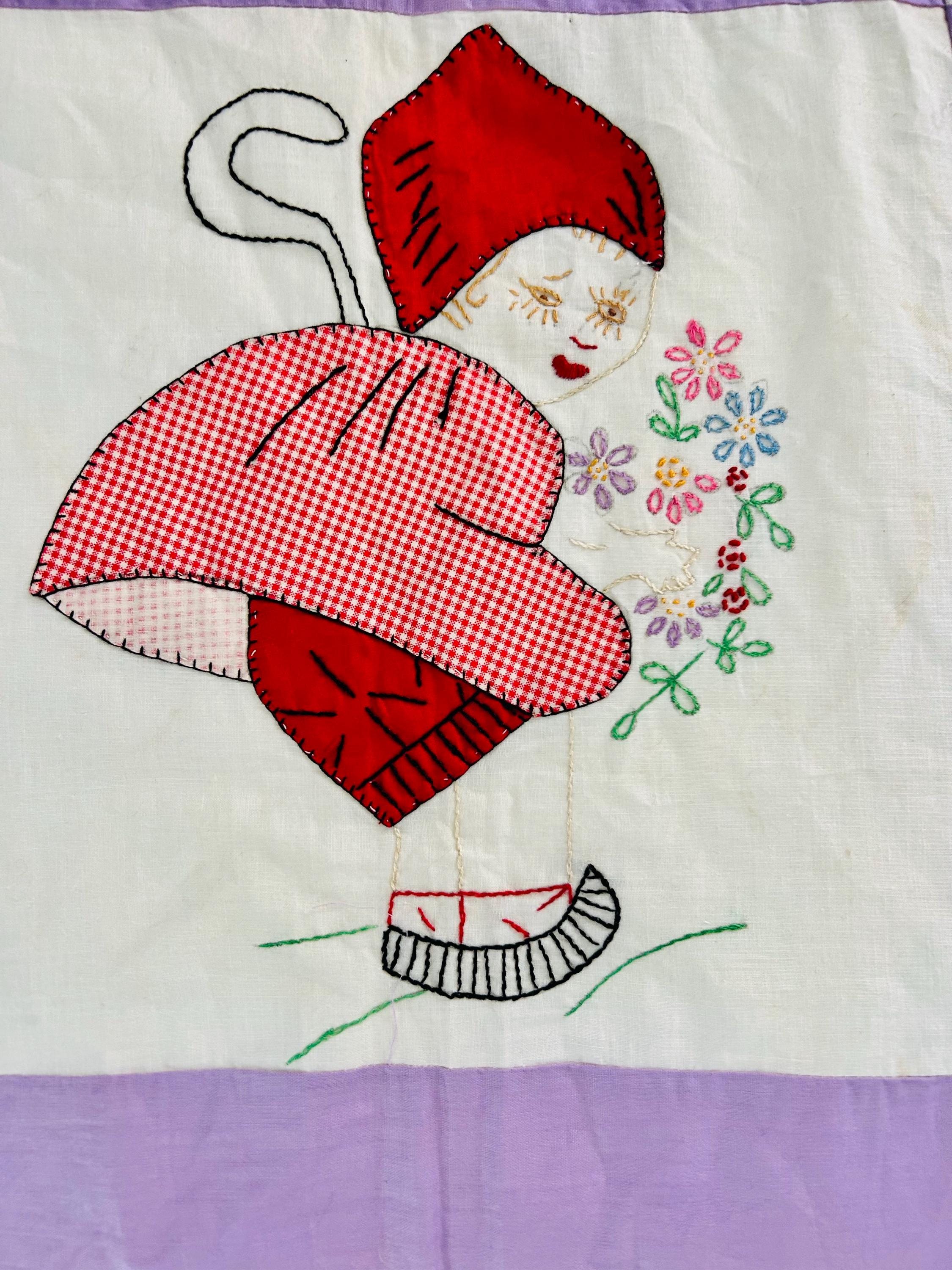 Each block in this quilt top depicts: • A profile Dutch girl holding a bouquet of flowers • A long trailing braid • A stylized pointed Dutch cap • Embroidered facial features • Distinctive striped wooden shoes (klompen-style clogs) • Blanket stitch appliqué outlining the dress