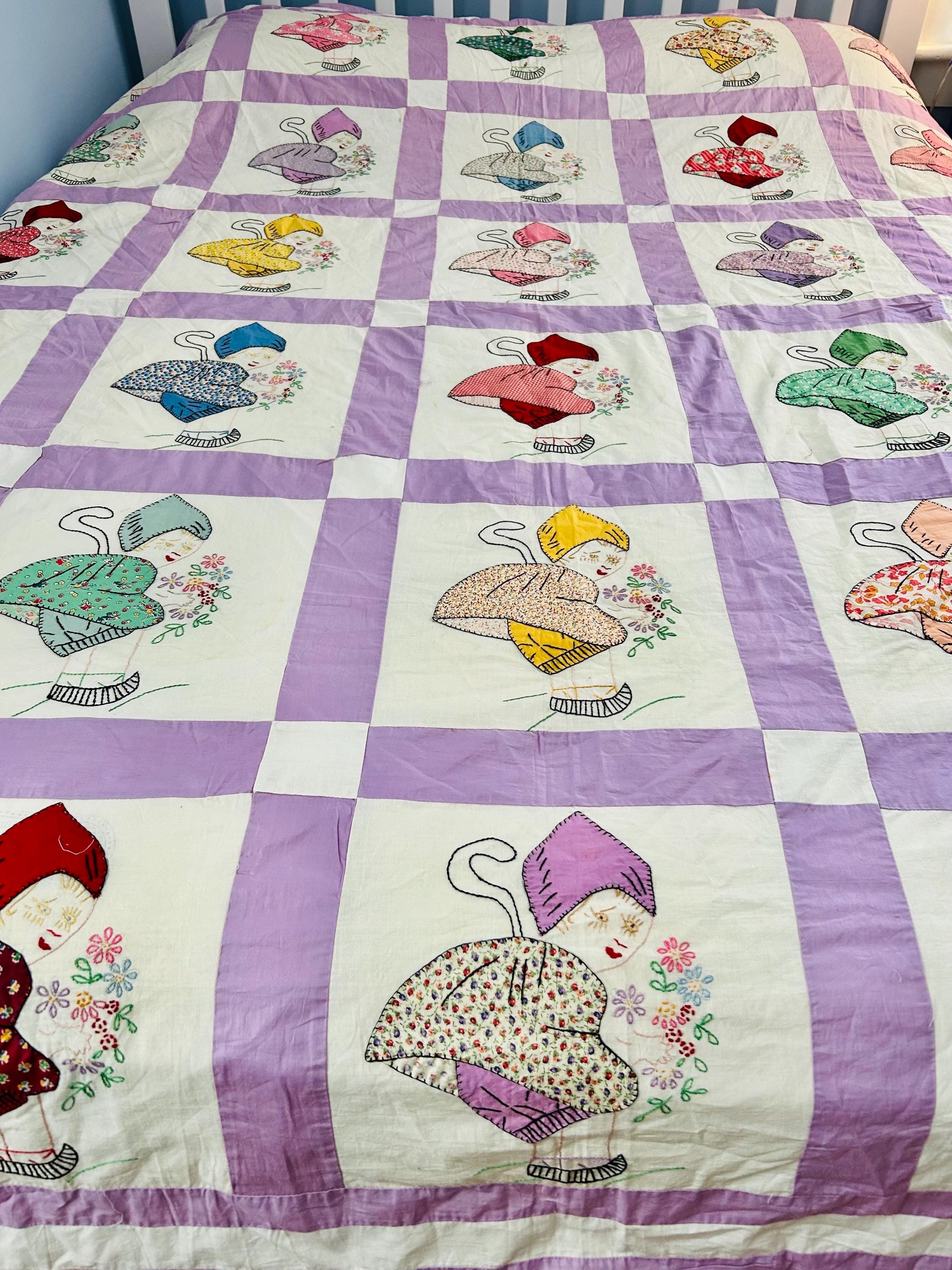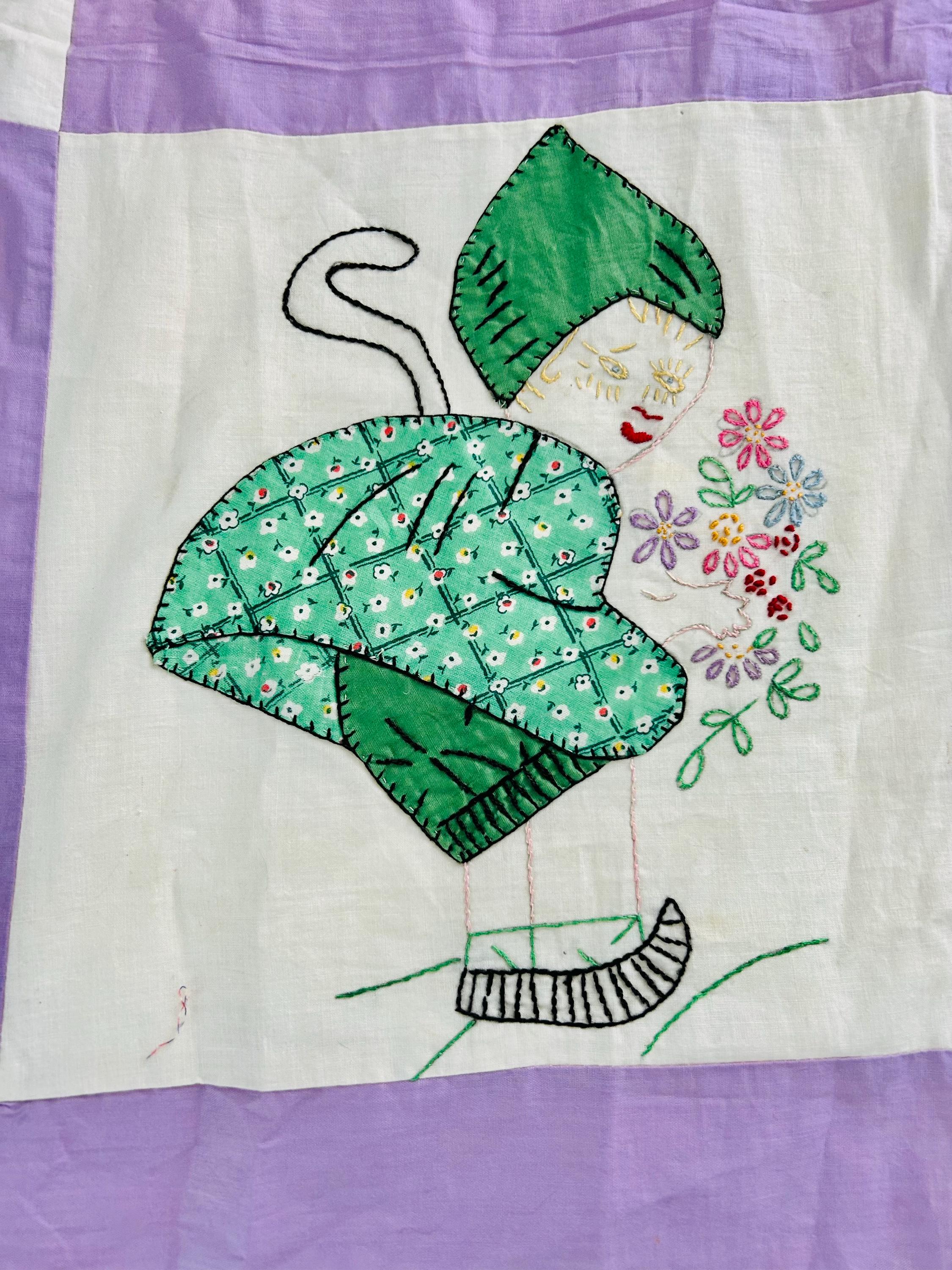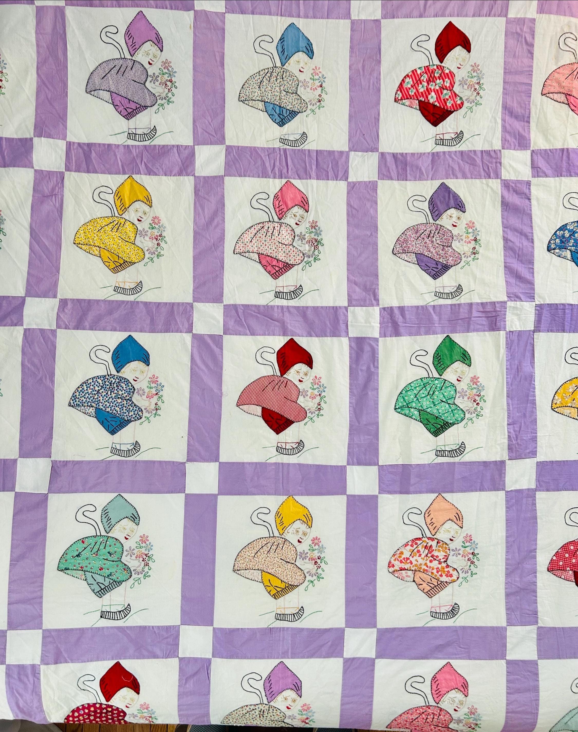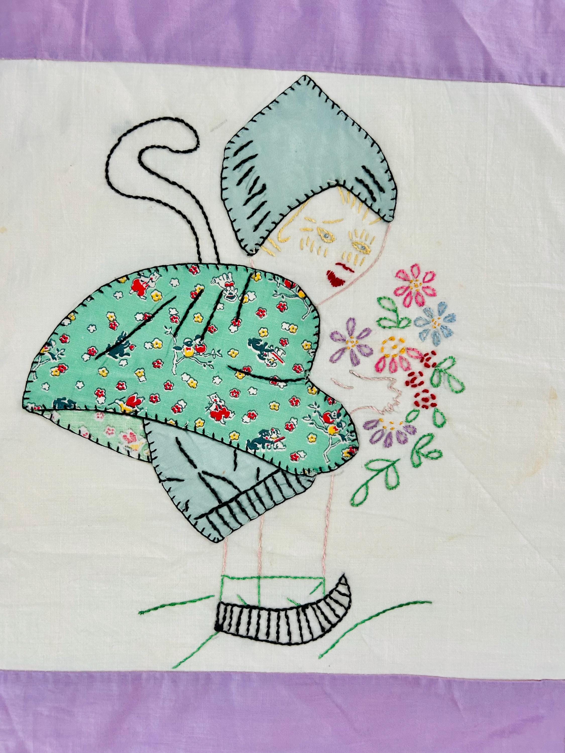 Each block in this quilt top depicts: • A profile Dutch girl holding a bouquet of flowers • A long trailing braid • A stylized pointed Dutch cap • Embroidered facial features • Distinctive striped wooden shoes (klompen-style clogs) • Blanket stitch appliqué outlining the dress