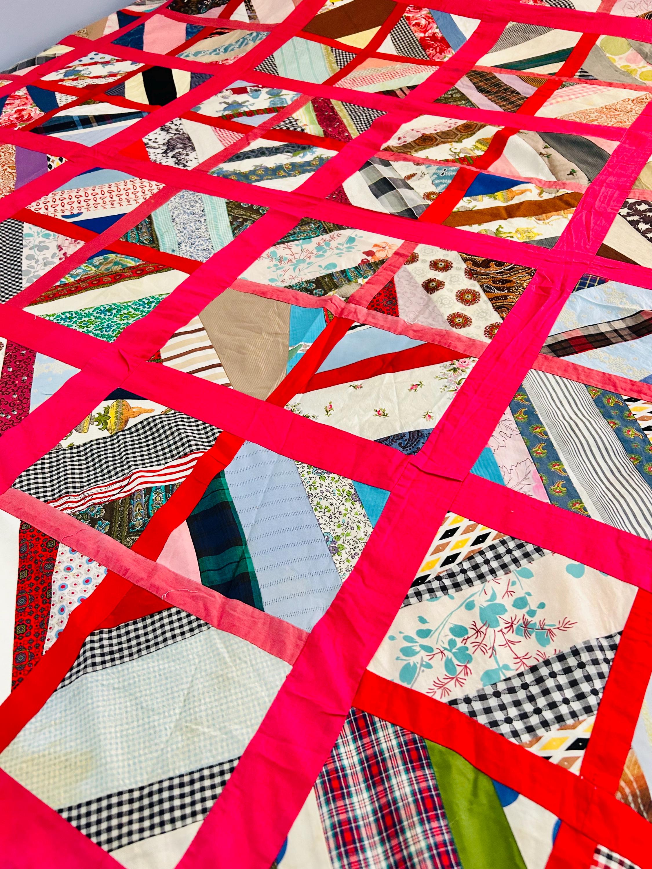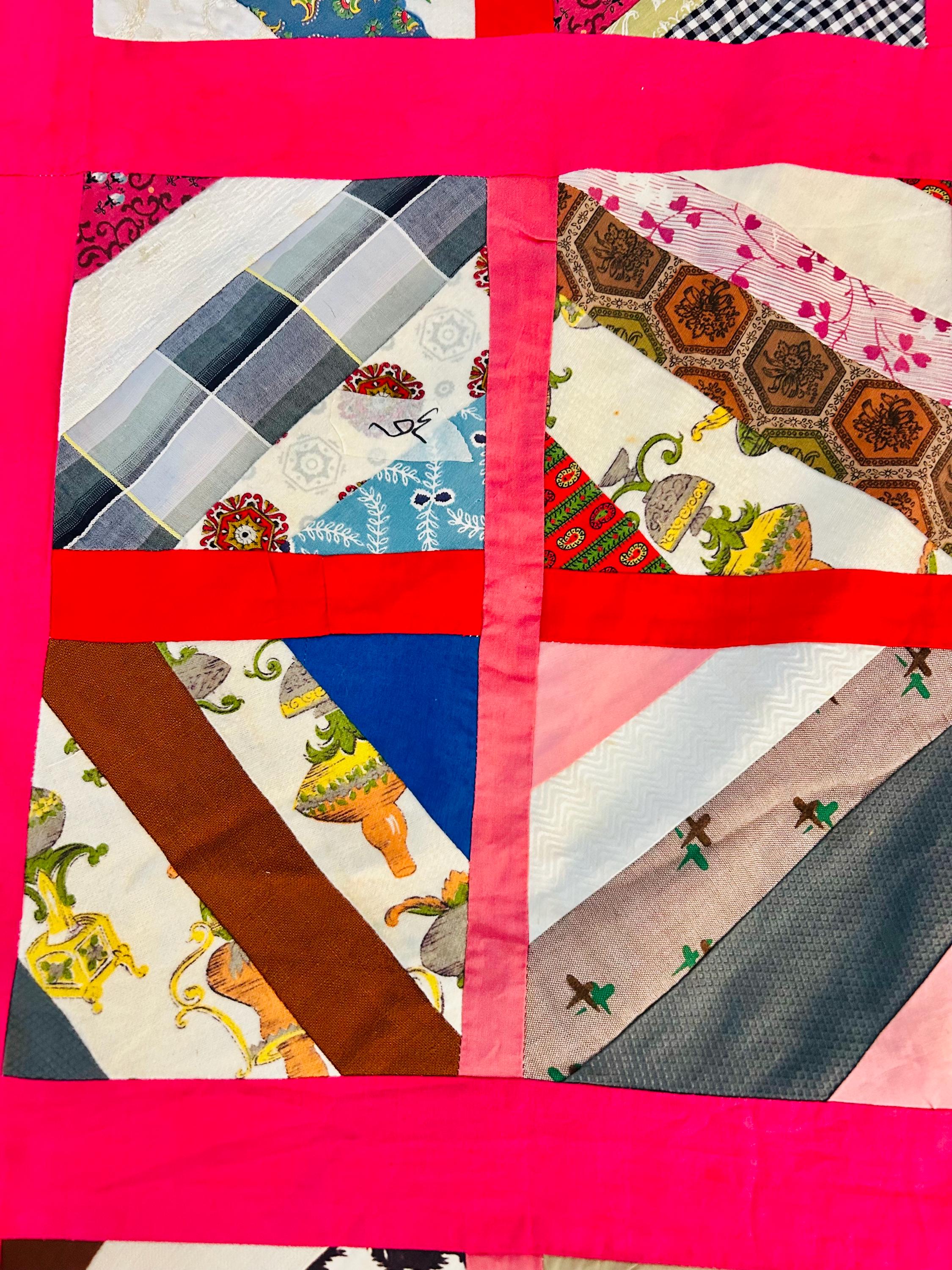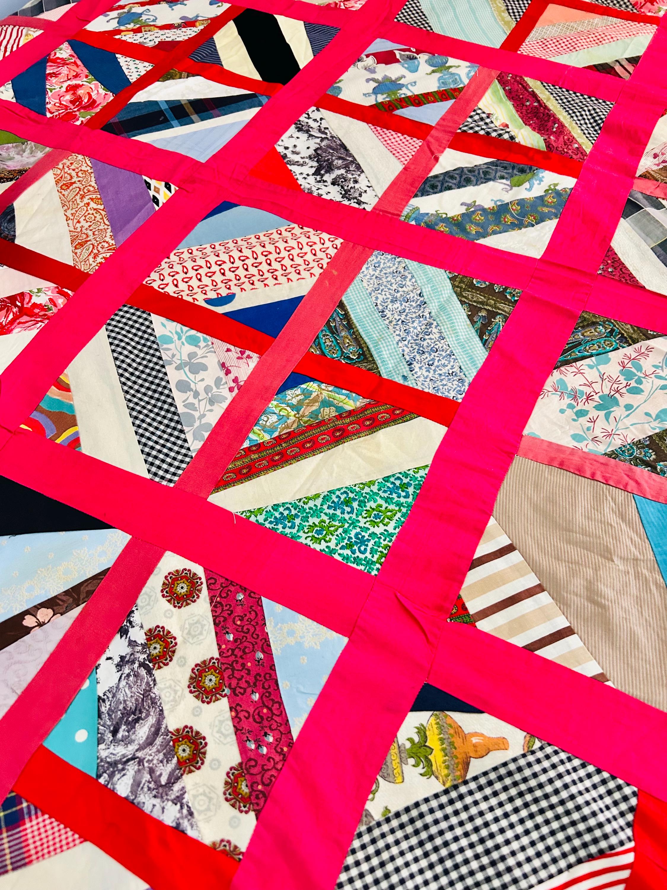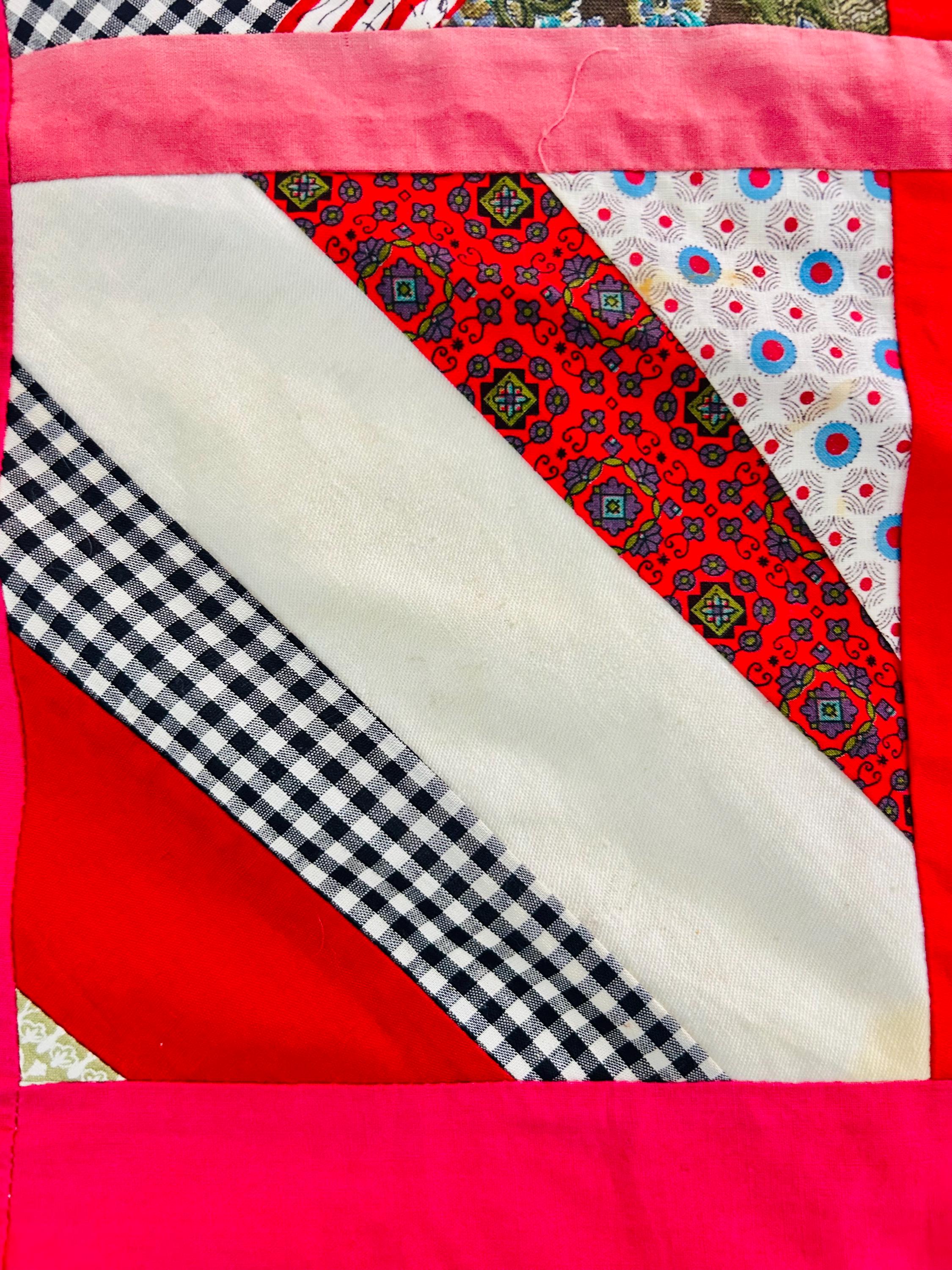 Details: Age: Circa late 1960s–1970s Size: 64"x86" Construction • Machine pieced • String/chevron block layout • Bright hot pink sashing • 1960s fabrics