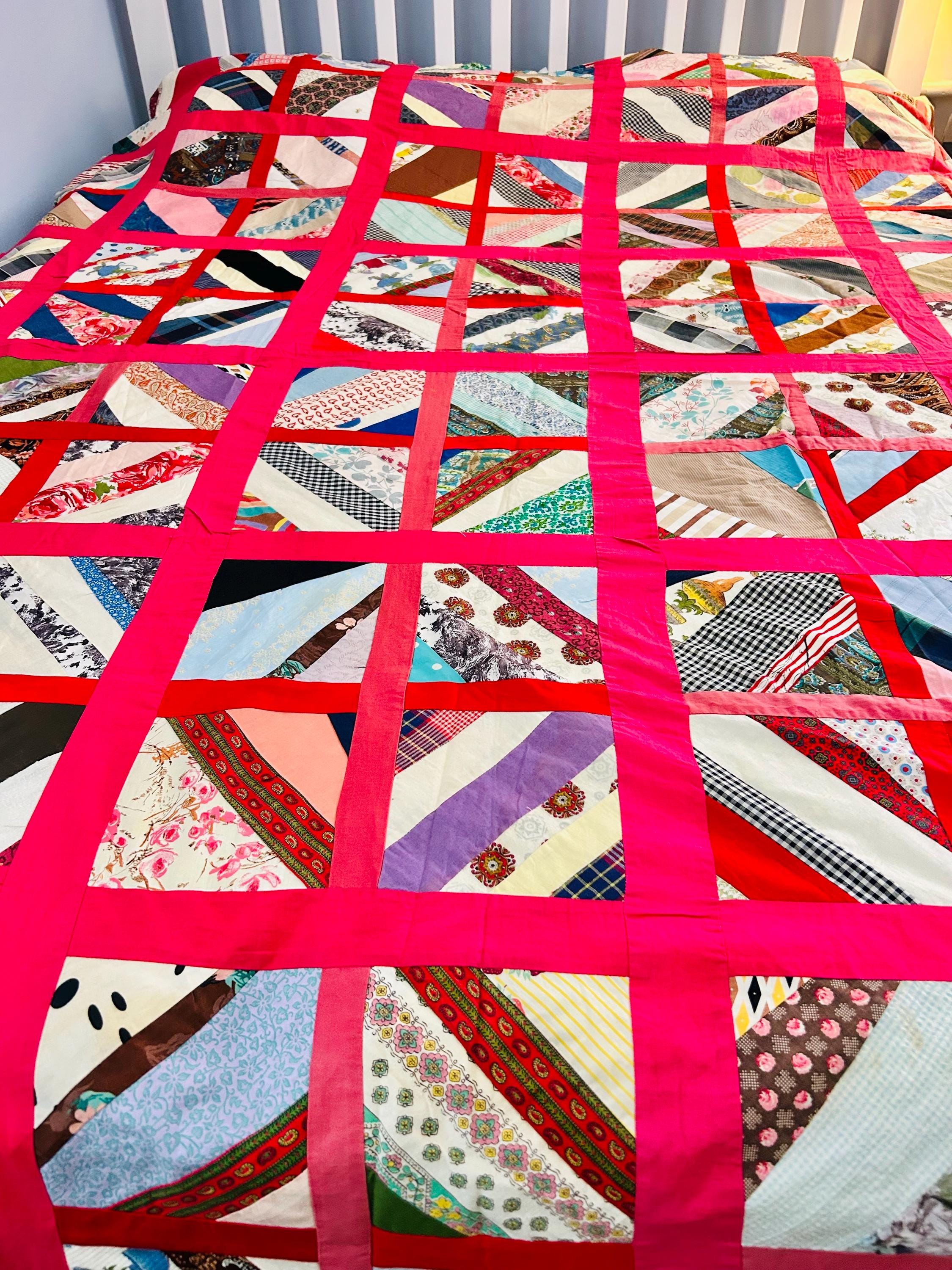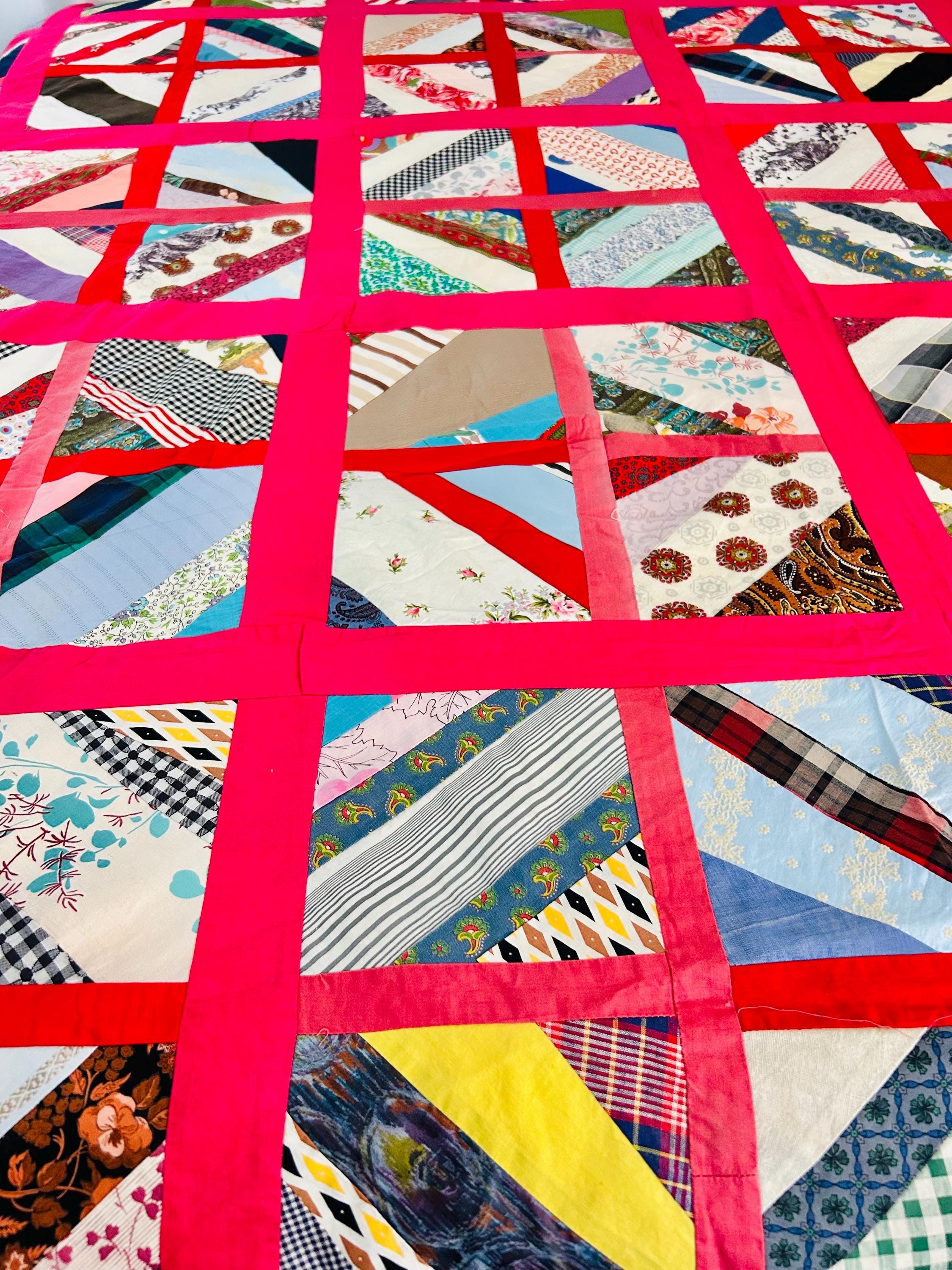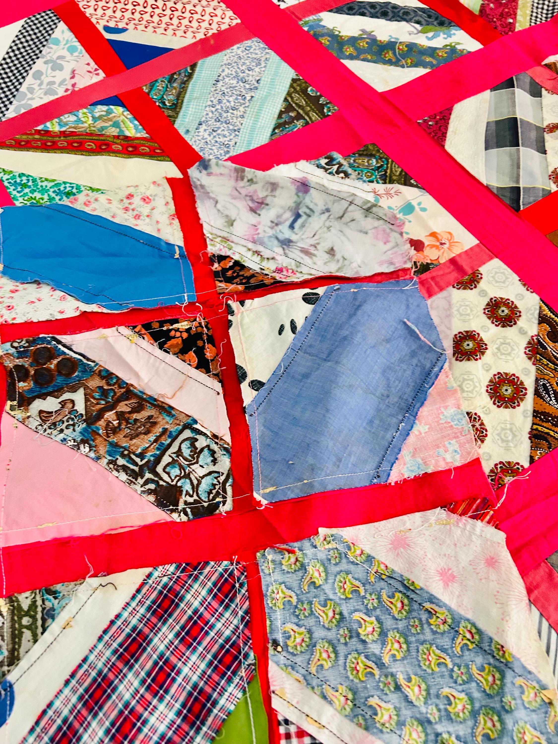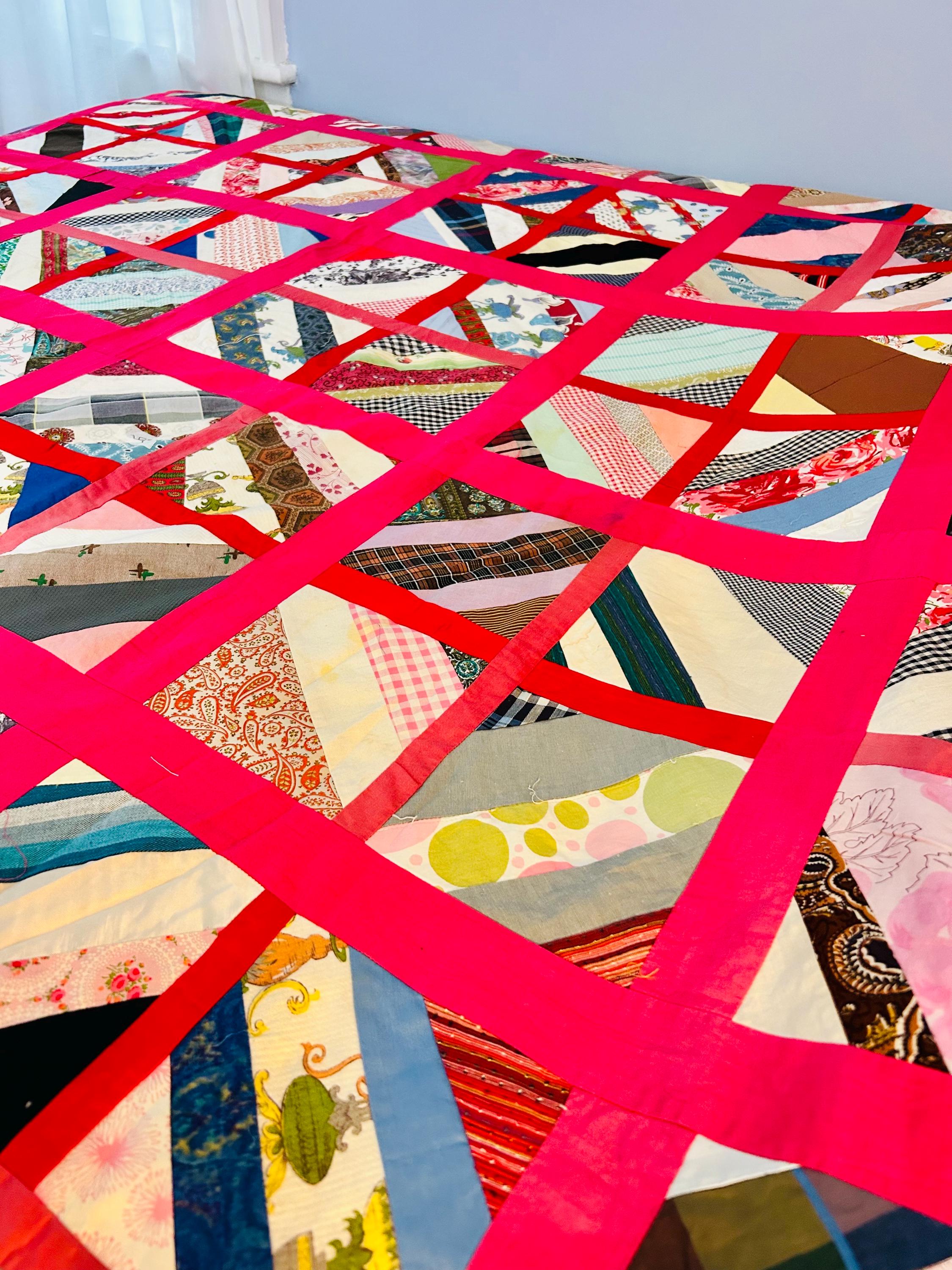 Details: Age: Circa late 1960s–1970s Size: 64"x86" Construction • Machine pieced • String/chevron block layout • Bright hot pink sashing • 1960s fabrics