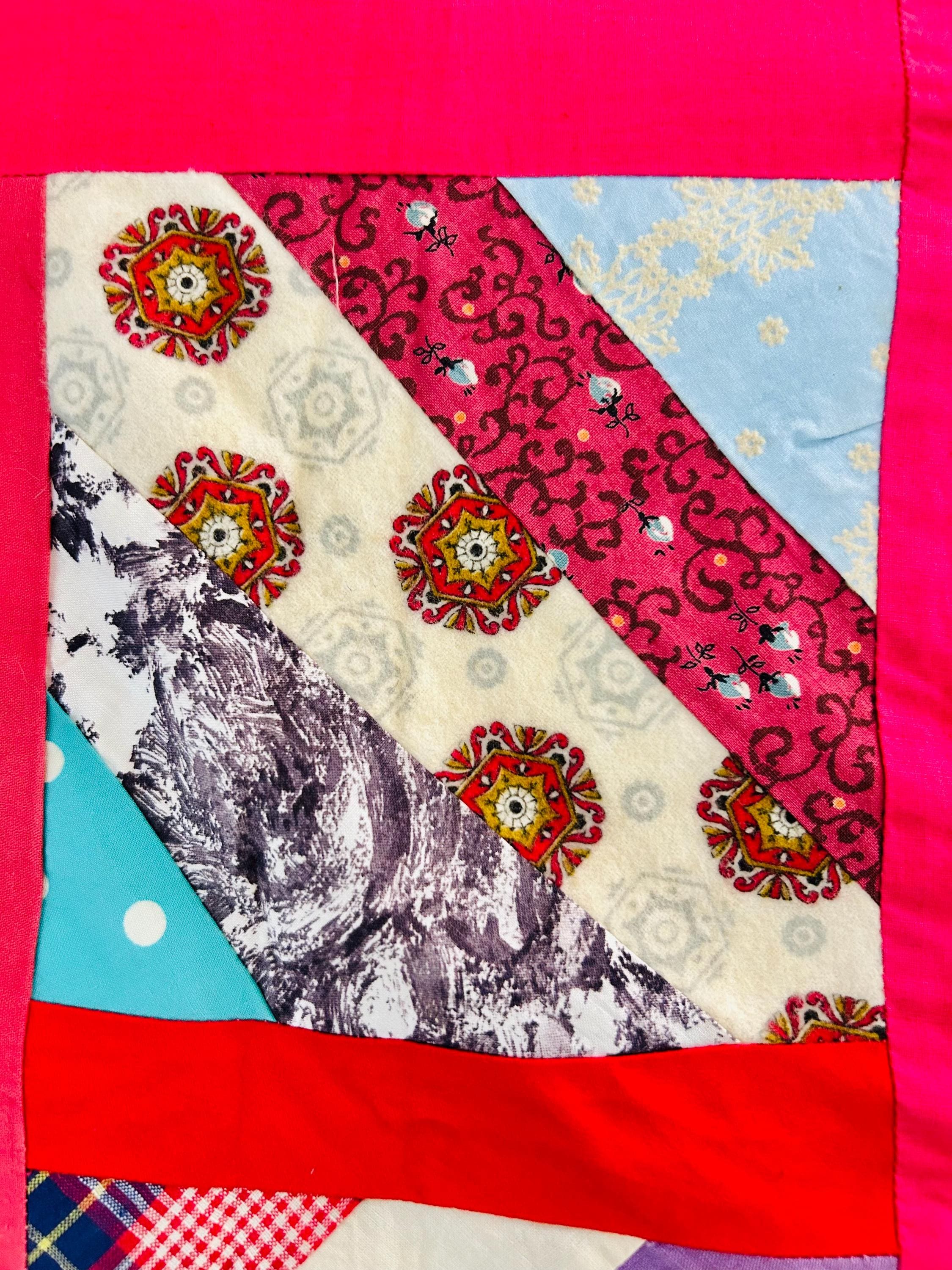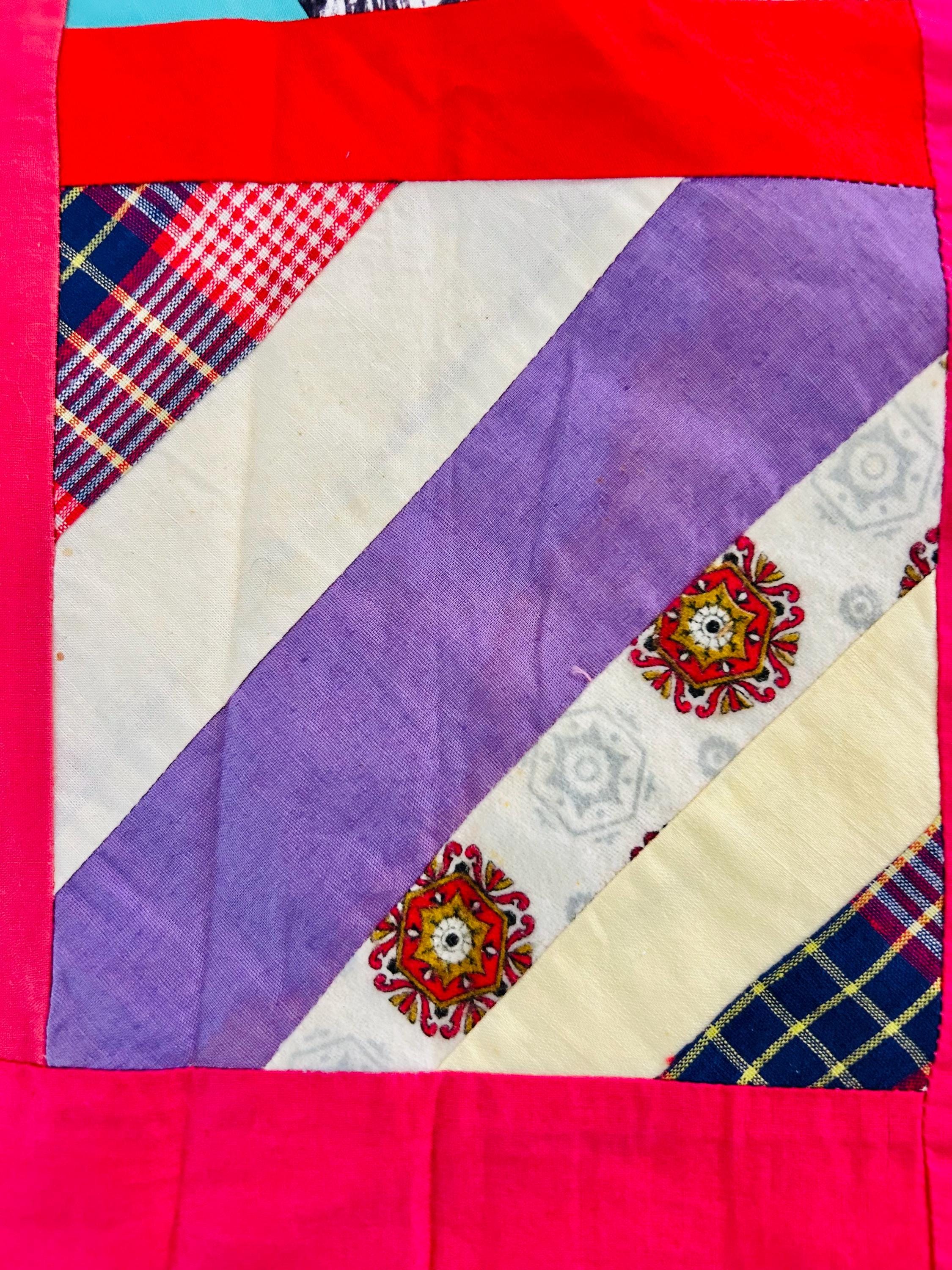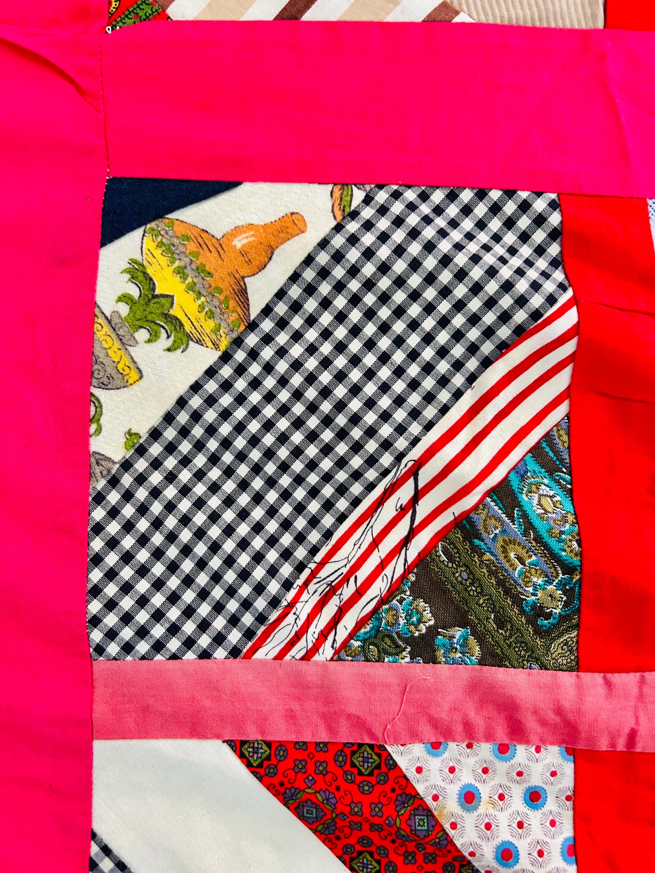This vibrant vintage Chevron / String Quilt Top includes an eclectic mix of 1960s fabrics with bold hot pink sashing framing each block. Fabrics include a lively patchwork of florals, plaids, novelty prints, and graphic designs.