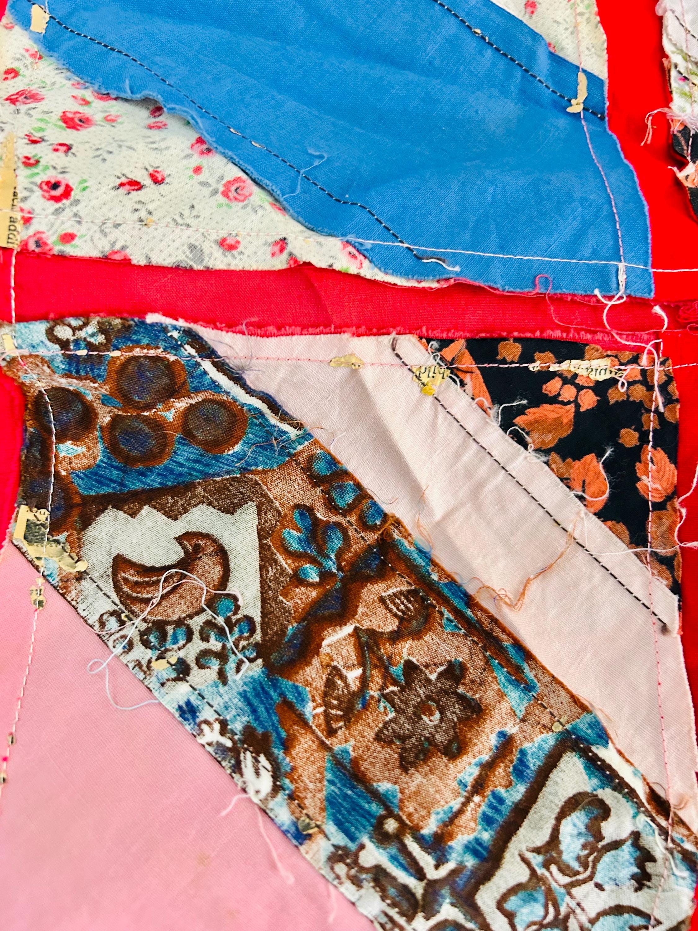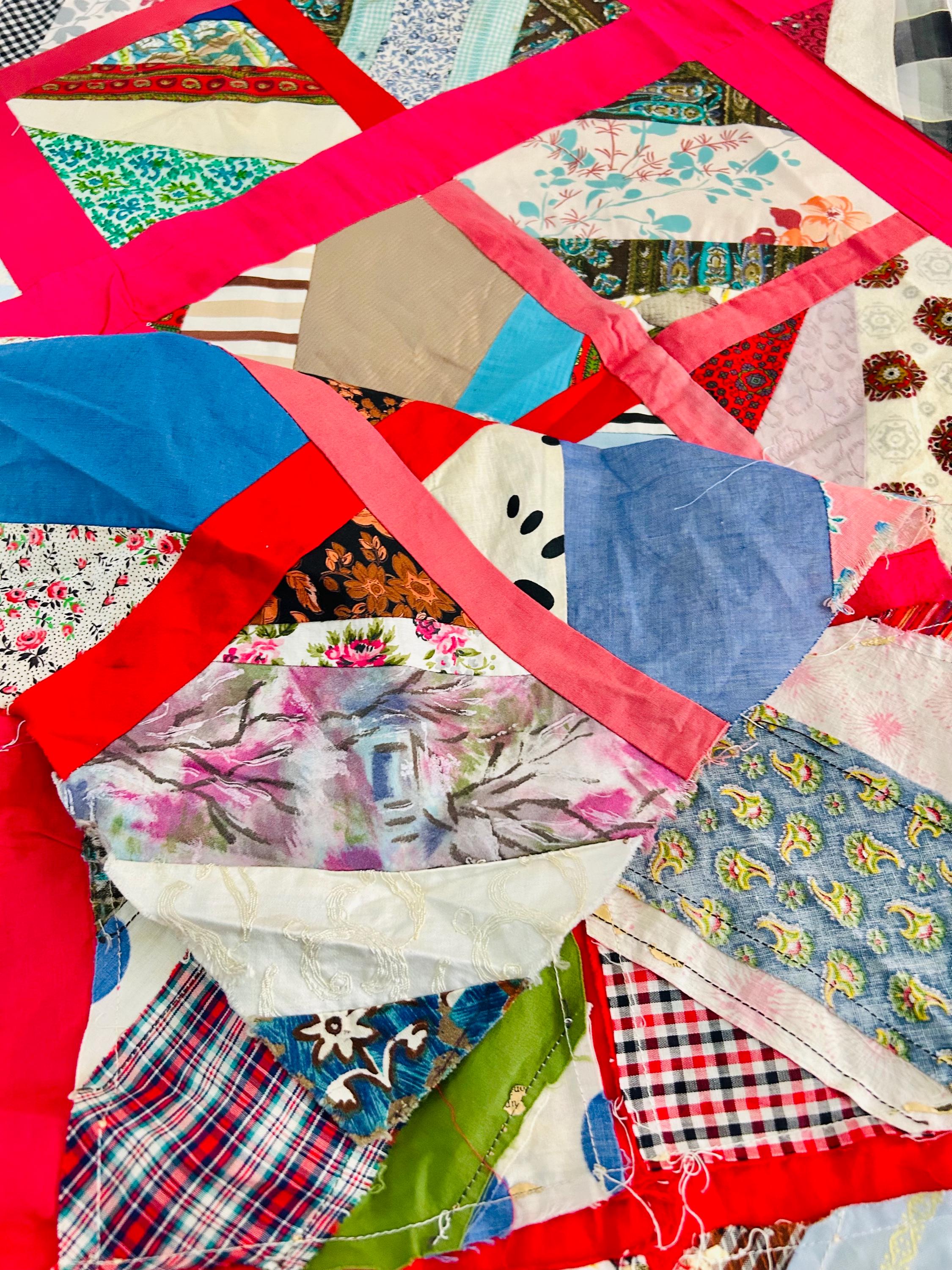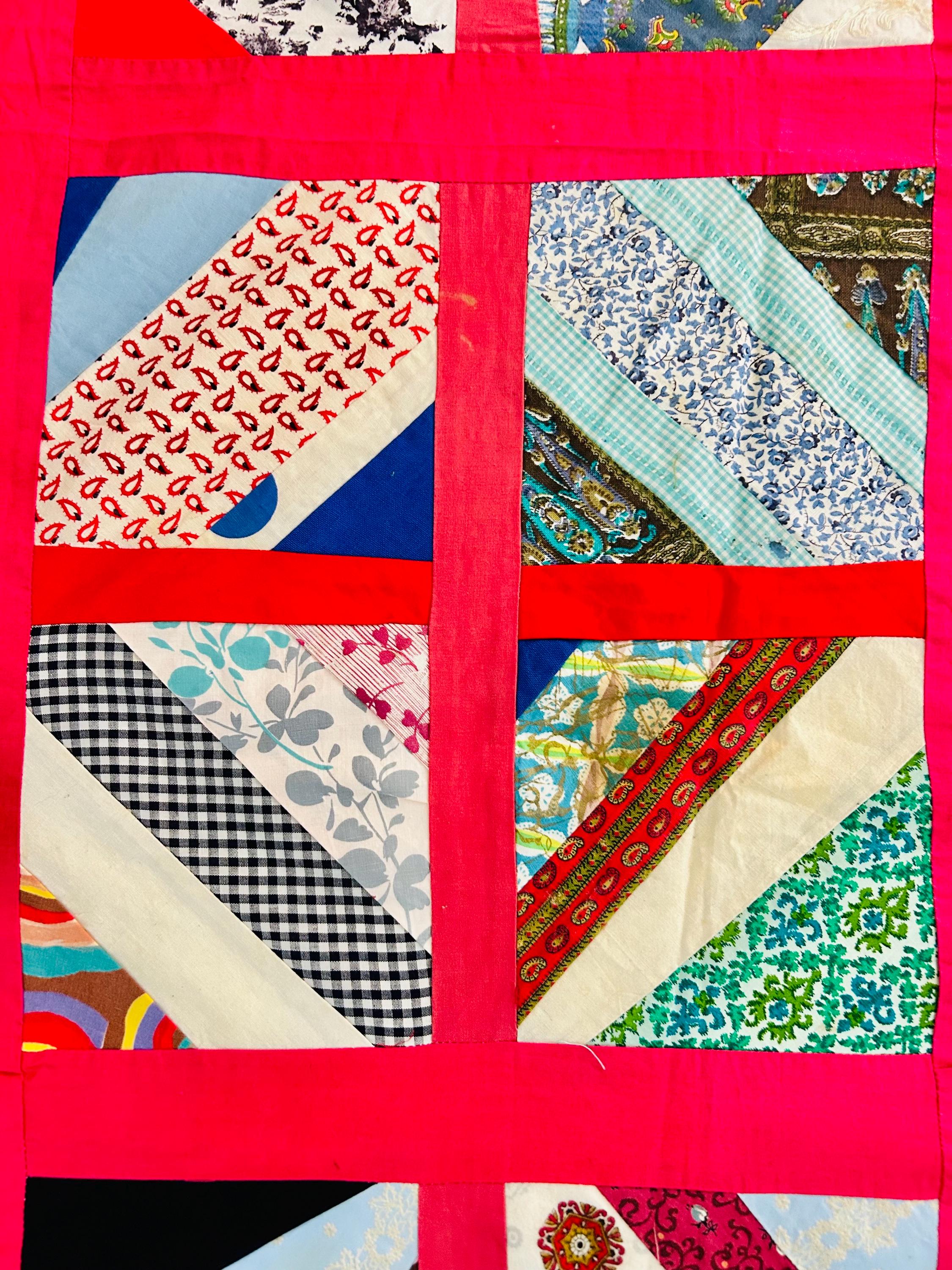 This vibrant vintage Chevron / String Quilt Top includes an eclectic mix of 1960s fabrics with bold hot pink sashing framing each block. Fabrics include a lively patchwork of florals, plaids, novelty prints, and graphic designs.