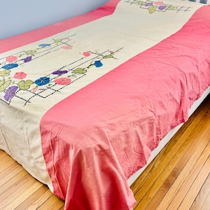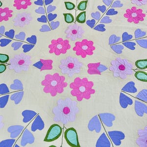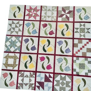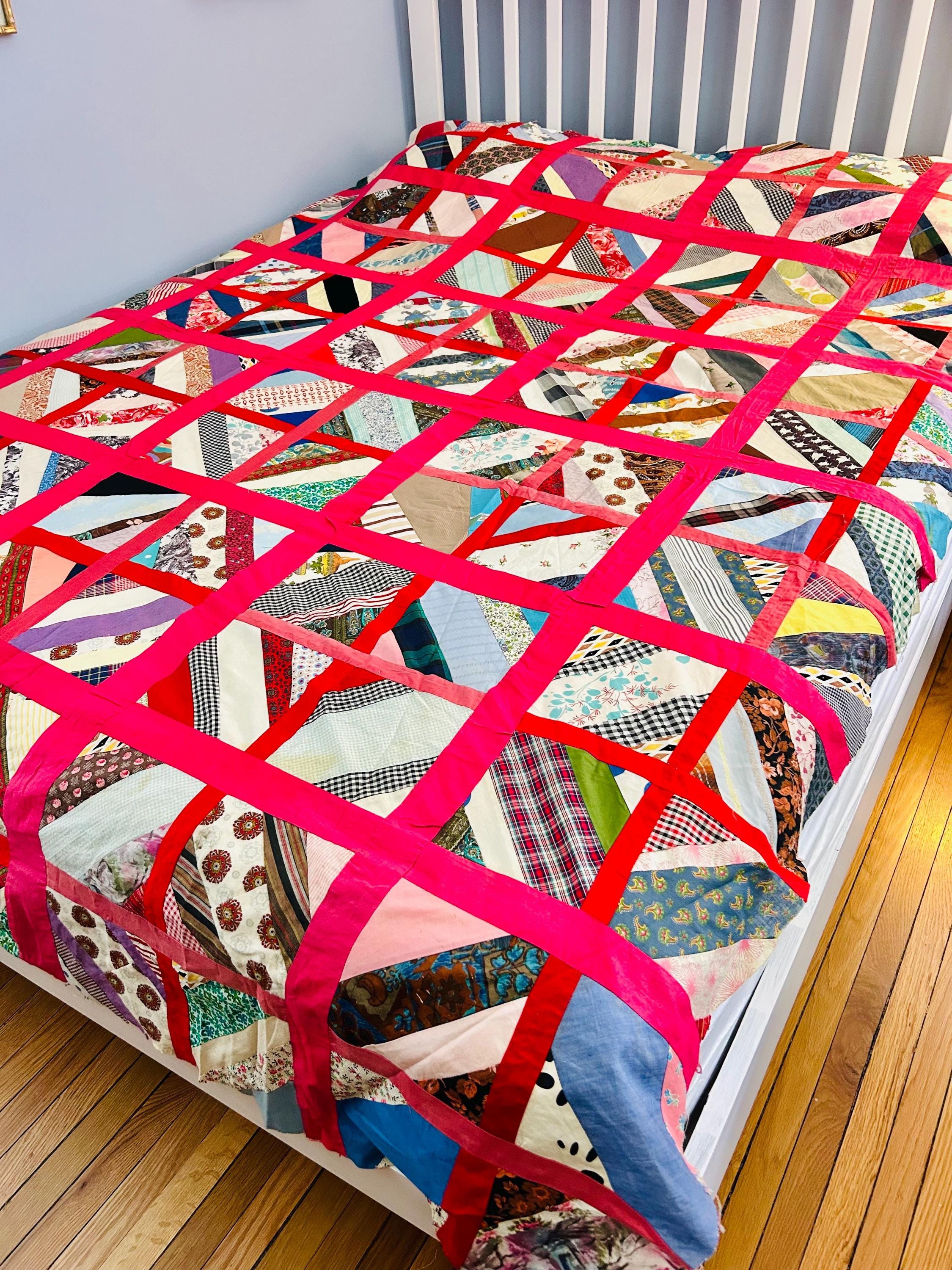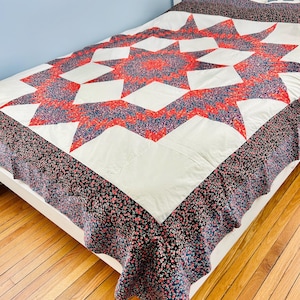 The quilt top comes from a smoke-free, pet-free home and is pictured on a queen-size bed.
