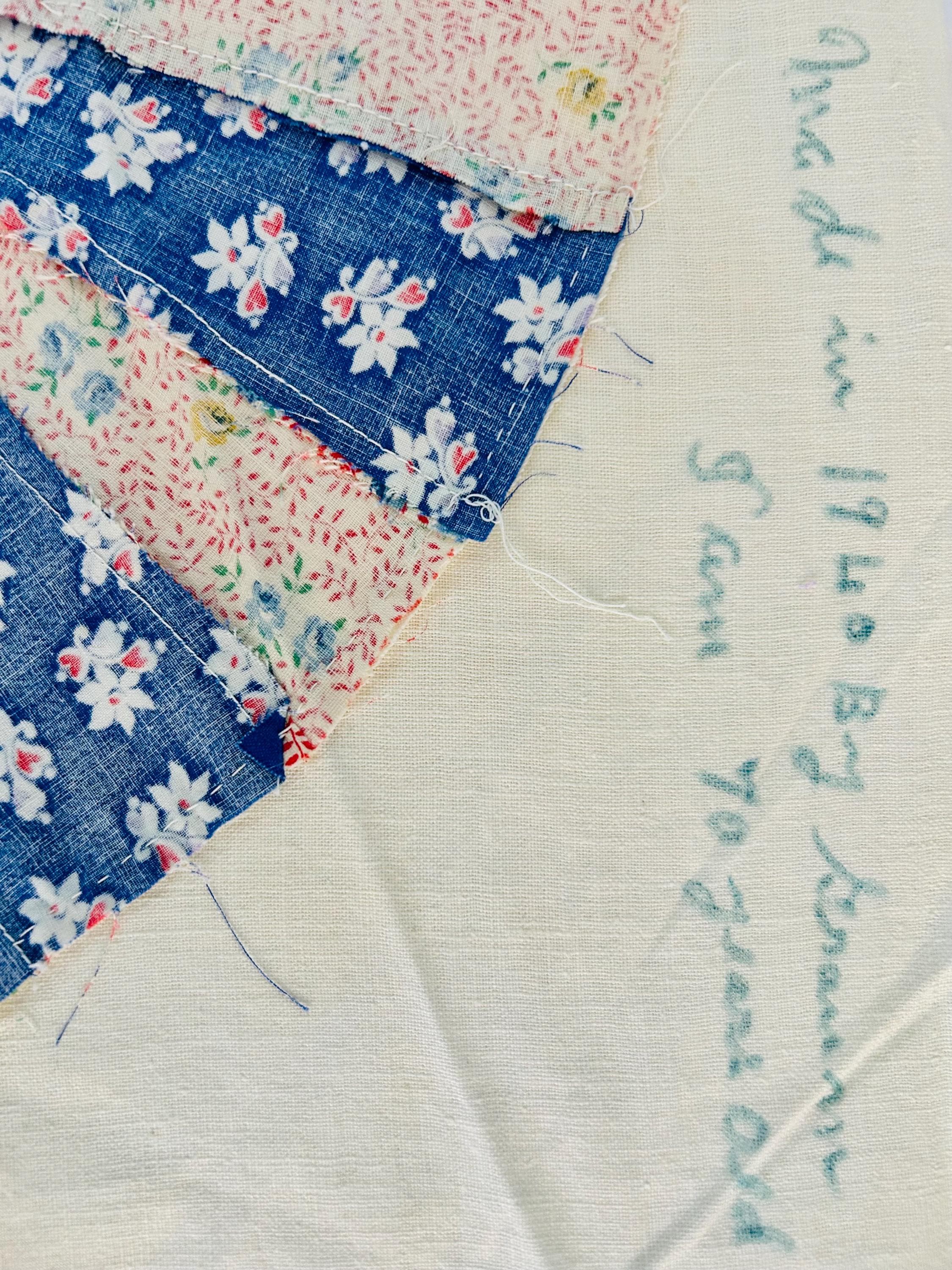 Details: • Hand-pieced • Dated 1940 and signed "Grandma" at a time the maker was 70 years old • Quilt top only (unquilted) • Cotton fabrics • 78” x 90”
