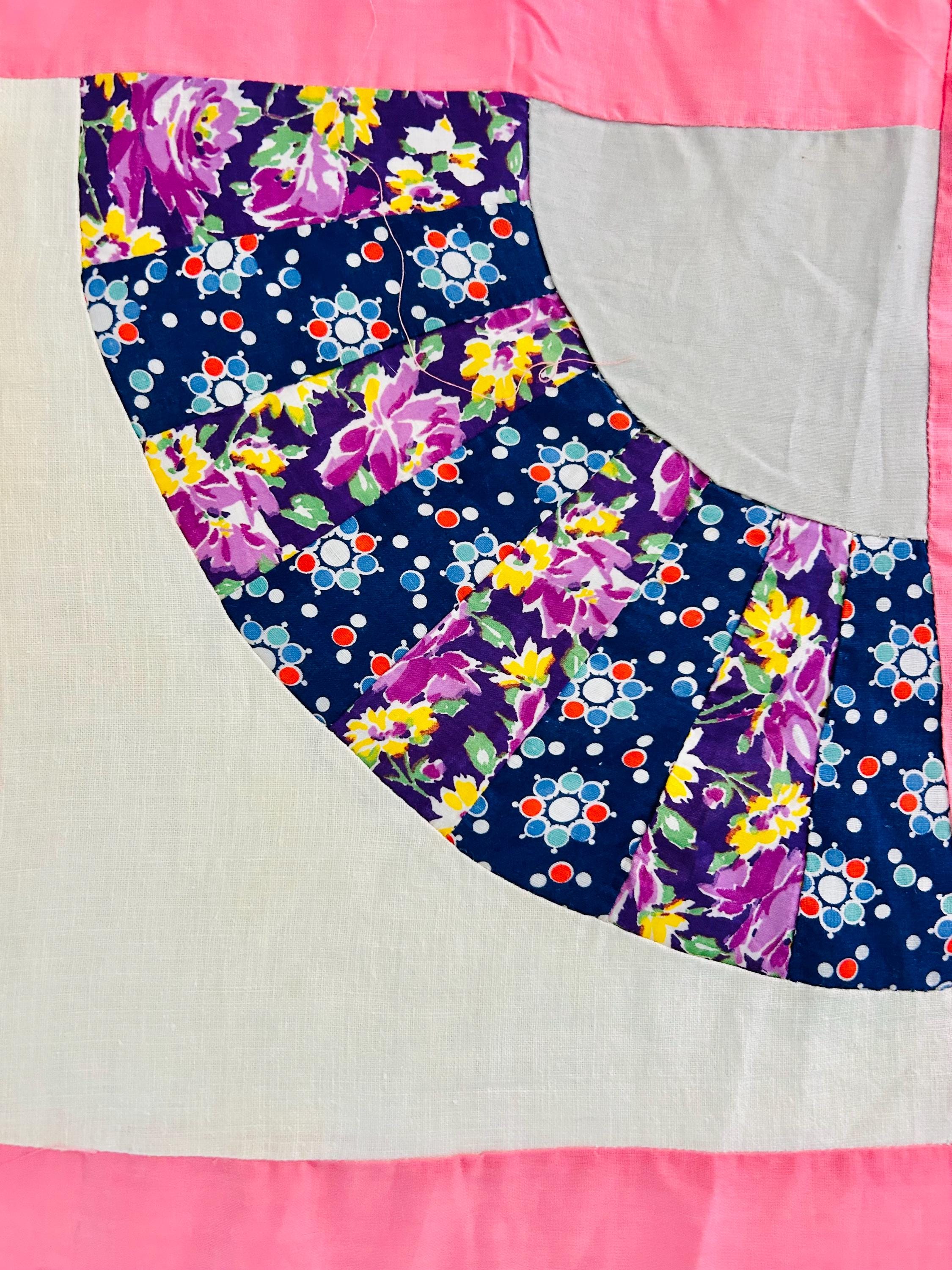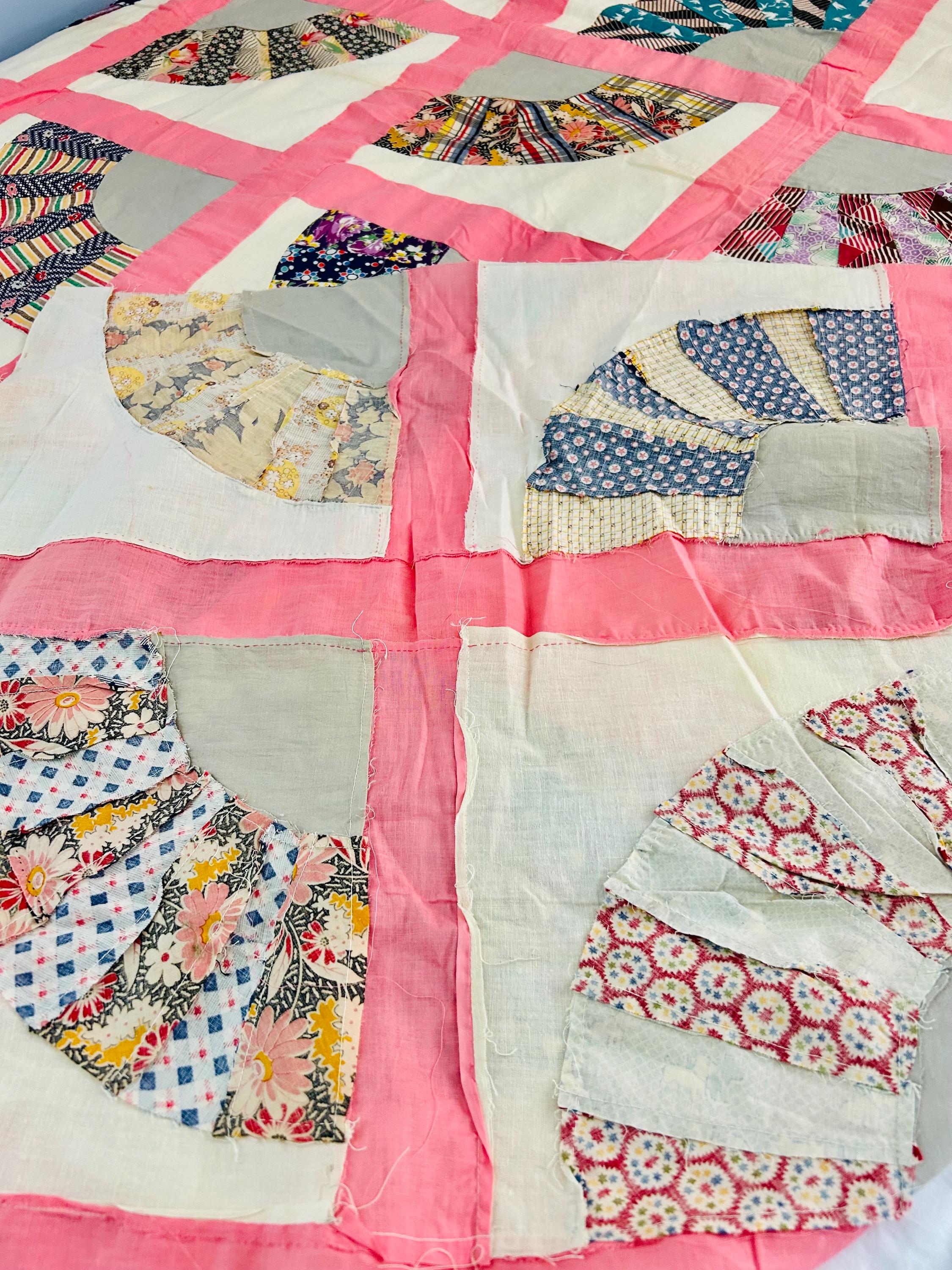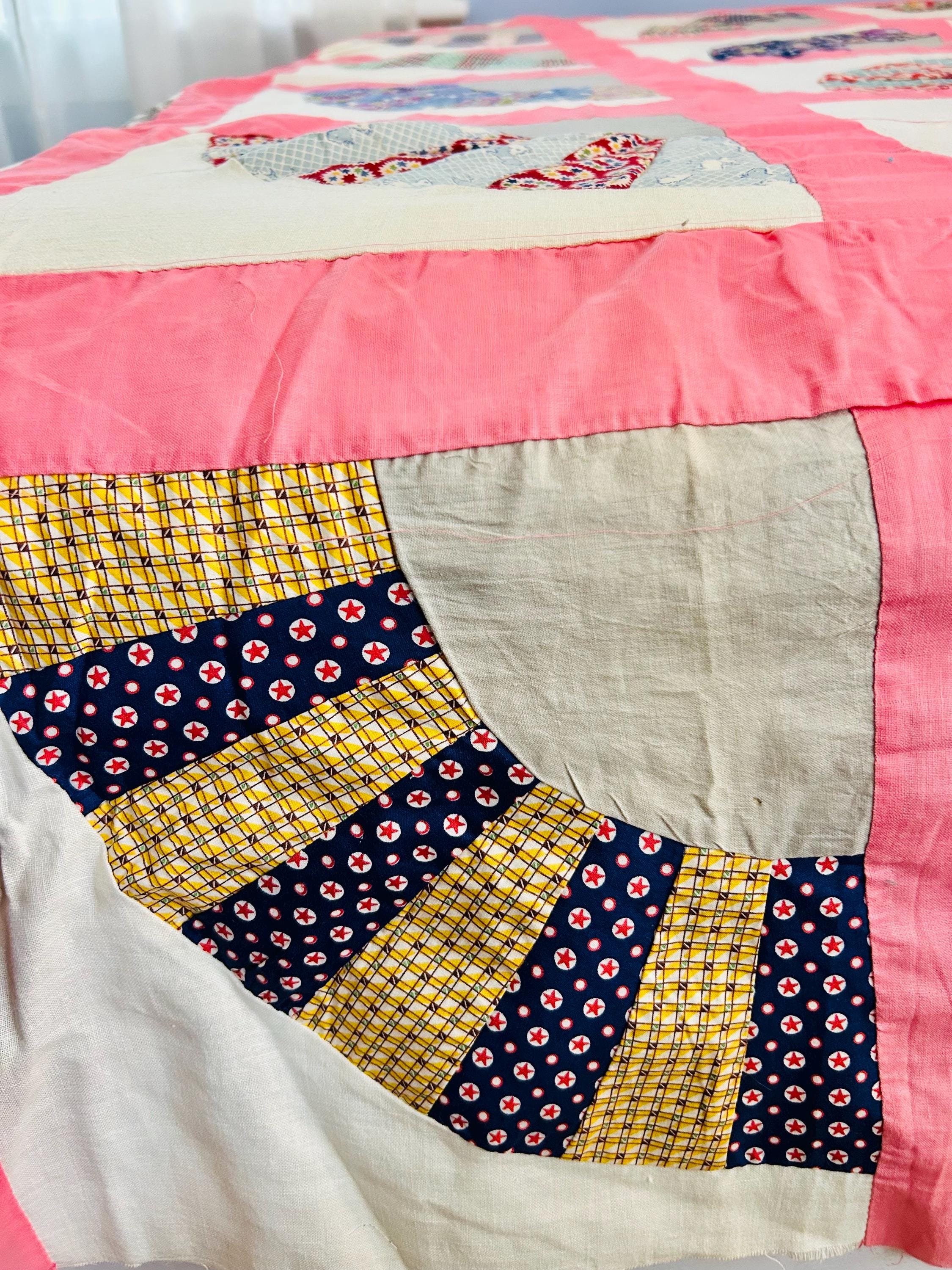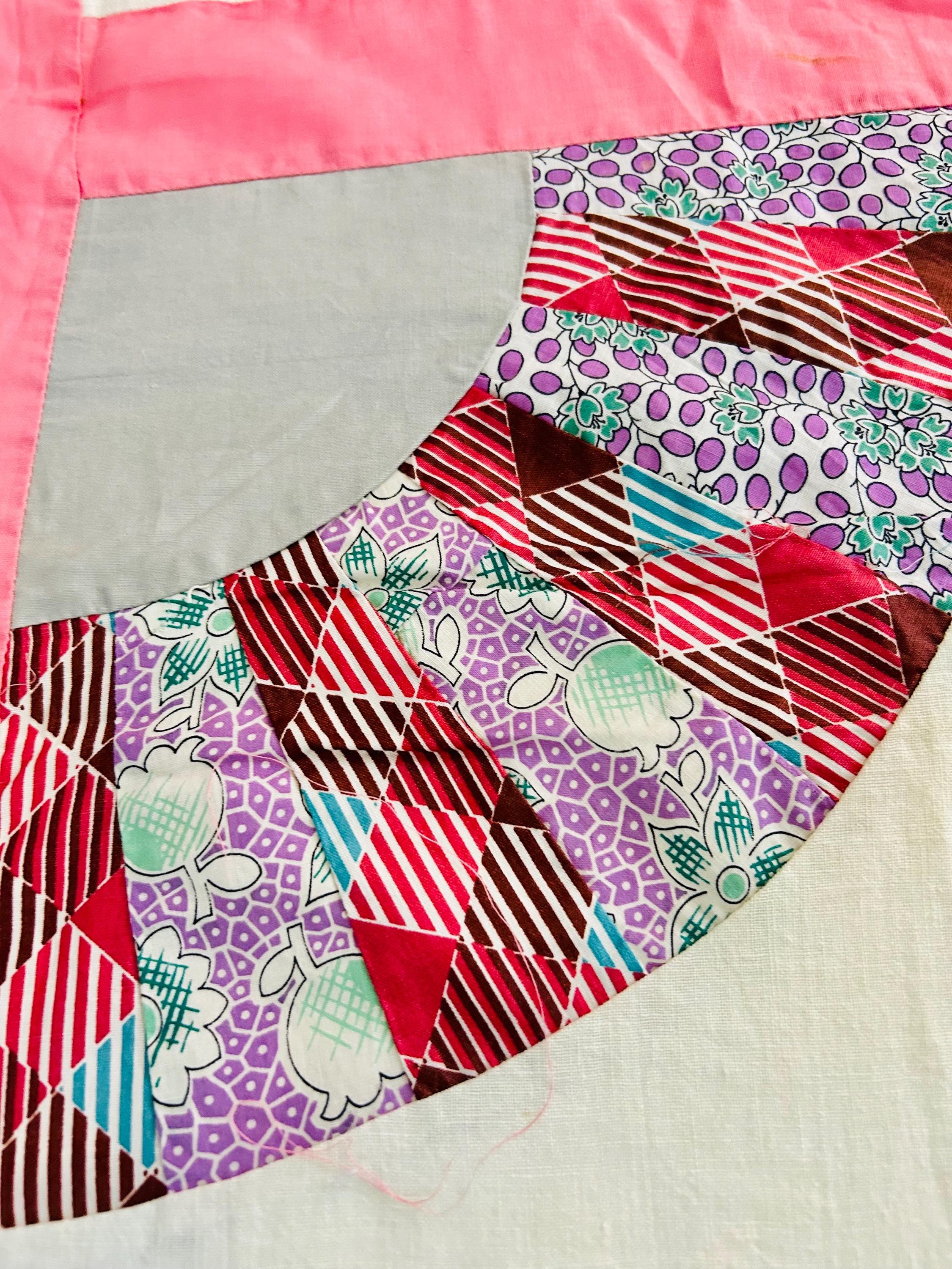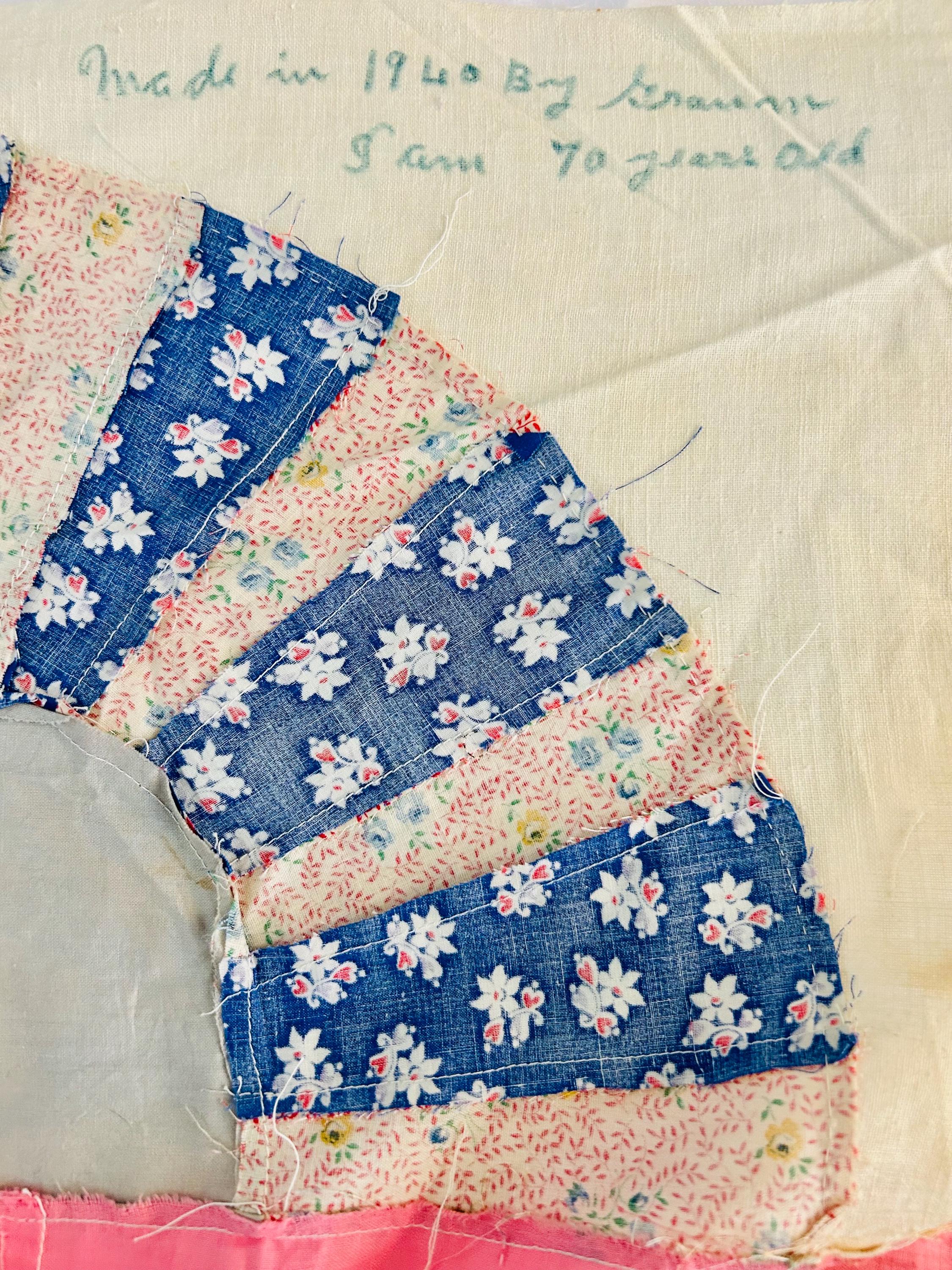 This wonderful vintage scrappy Grandmother's Fan Quilt Top is signed “Grandma” and dated 1940, a time when the maker was 70 years old. The design features classic Fan blocks, each composed of scrappy pieced wedges in lively 1930s–1940s feedsack cotton prints with vibrant pink sashing. The fabrics include: • Feedsack florals • Geometric conversation prints • Polka dots • Plaids • Cheerful Depression-era color palette • Star prints • Stripes and novelty prints