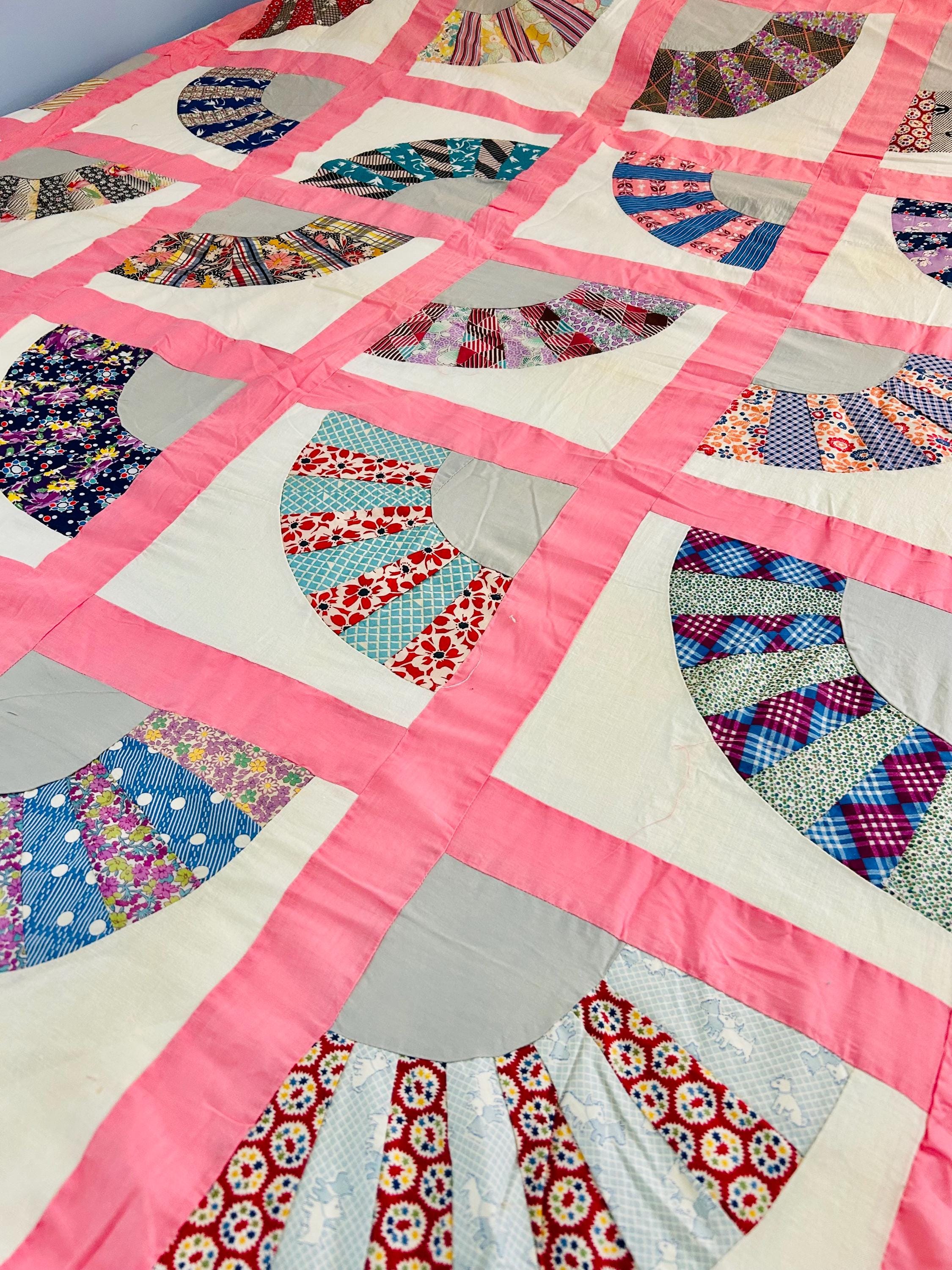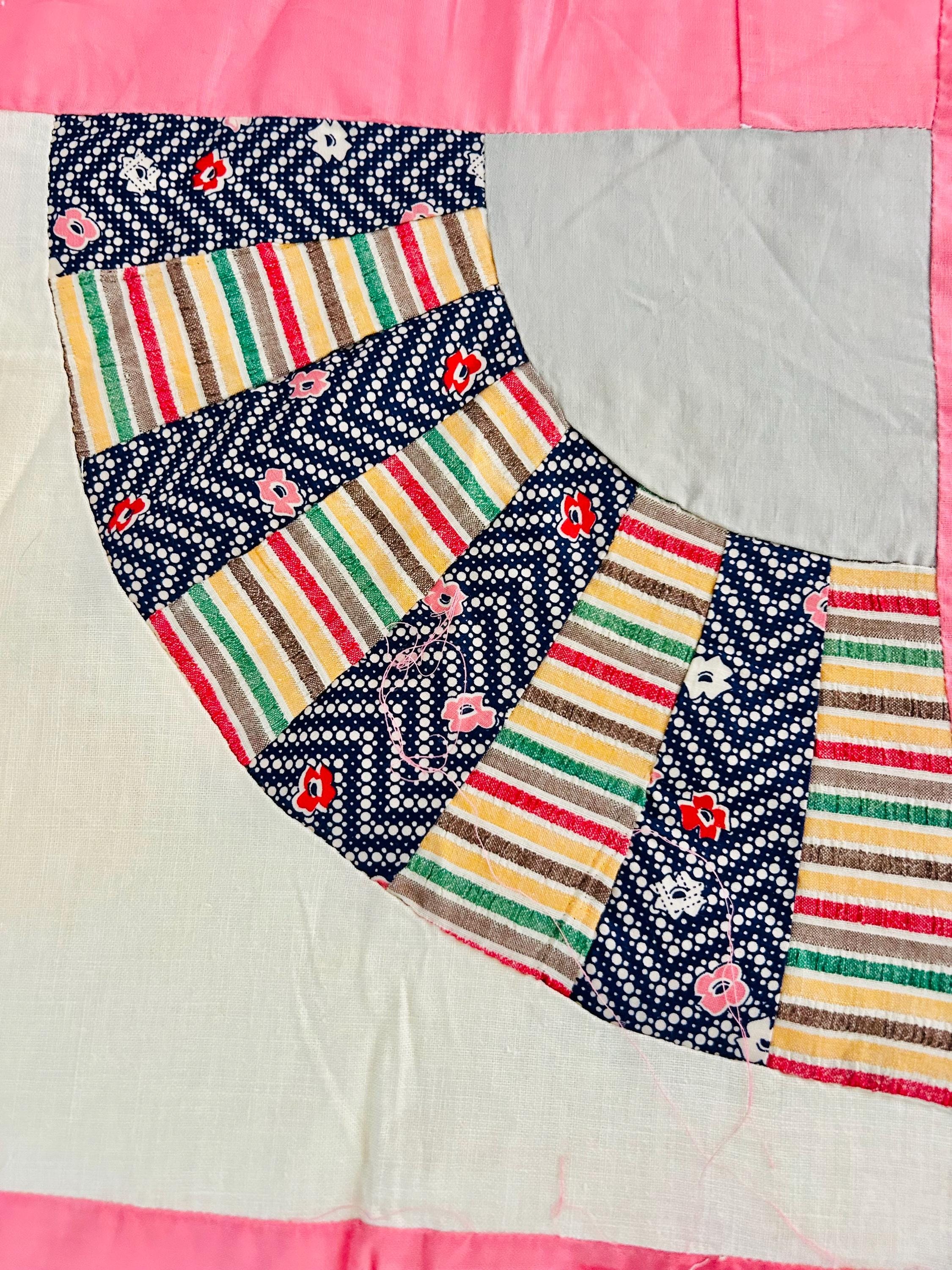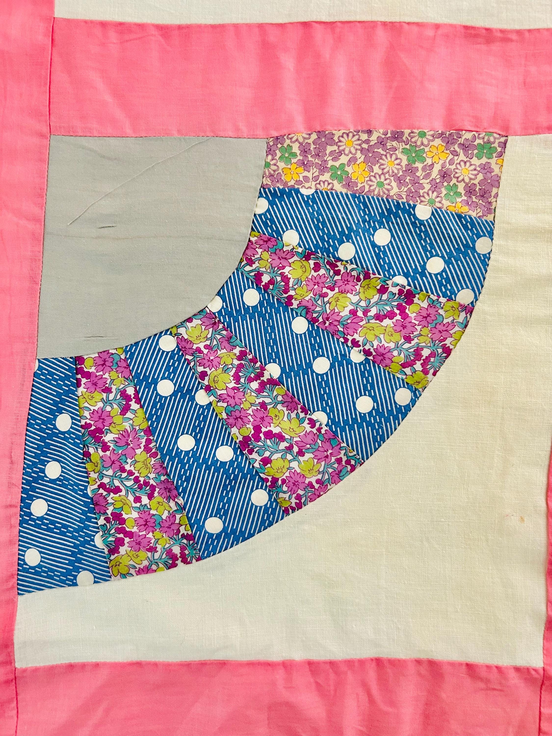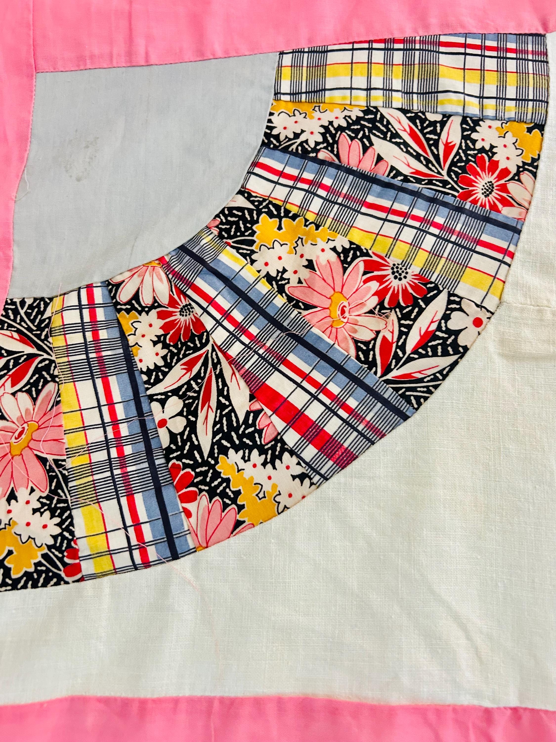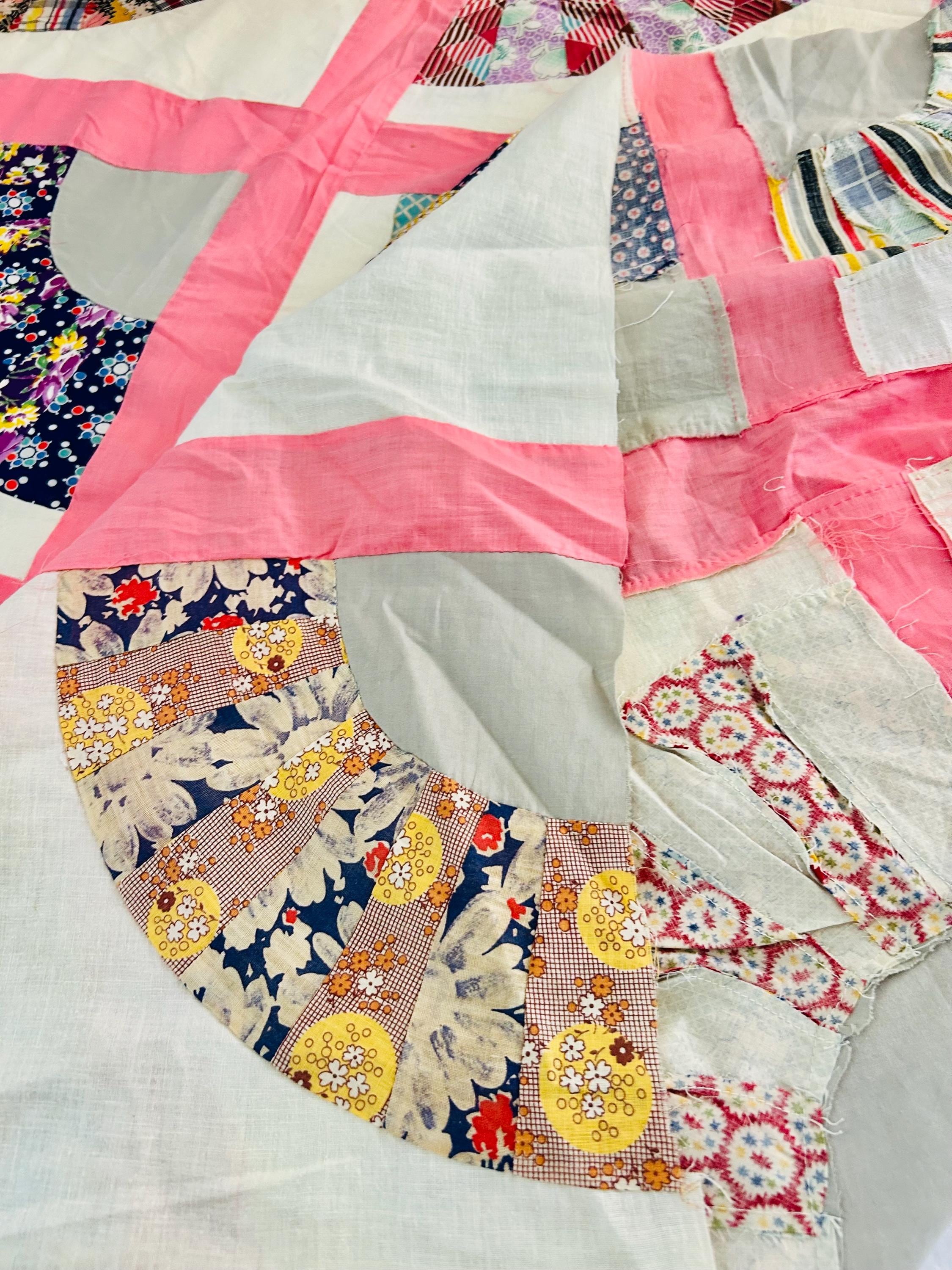This wonderful vintage scrappy Grandmother's Fan Quilt Top is signed “Grandma” and dated 1940, a time when the maker was 70 years old. The design features classic Fan blocks, each composed of scrappy pieced wedges in lively 1930s–1940s feedsack cotton prints with vibrant pink sashing. The fabrics include: • Feedsack florals • Geometric conversation prints • Polka dots • Plaids • Cheerful Depression-era color palette • Star prints • Stripes and novelty prints