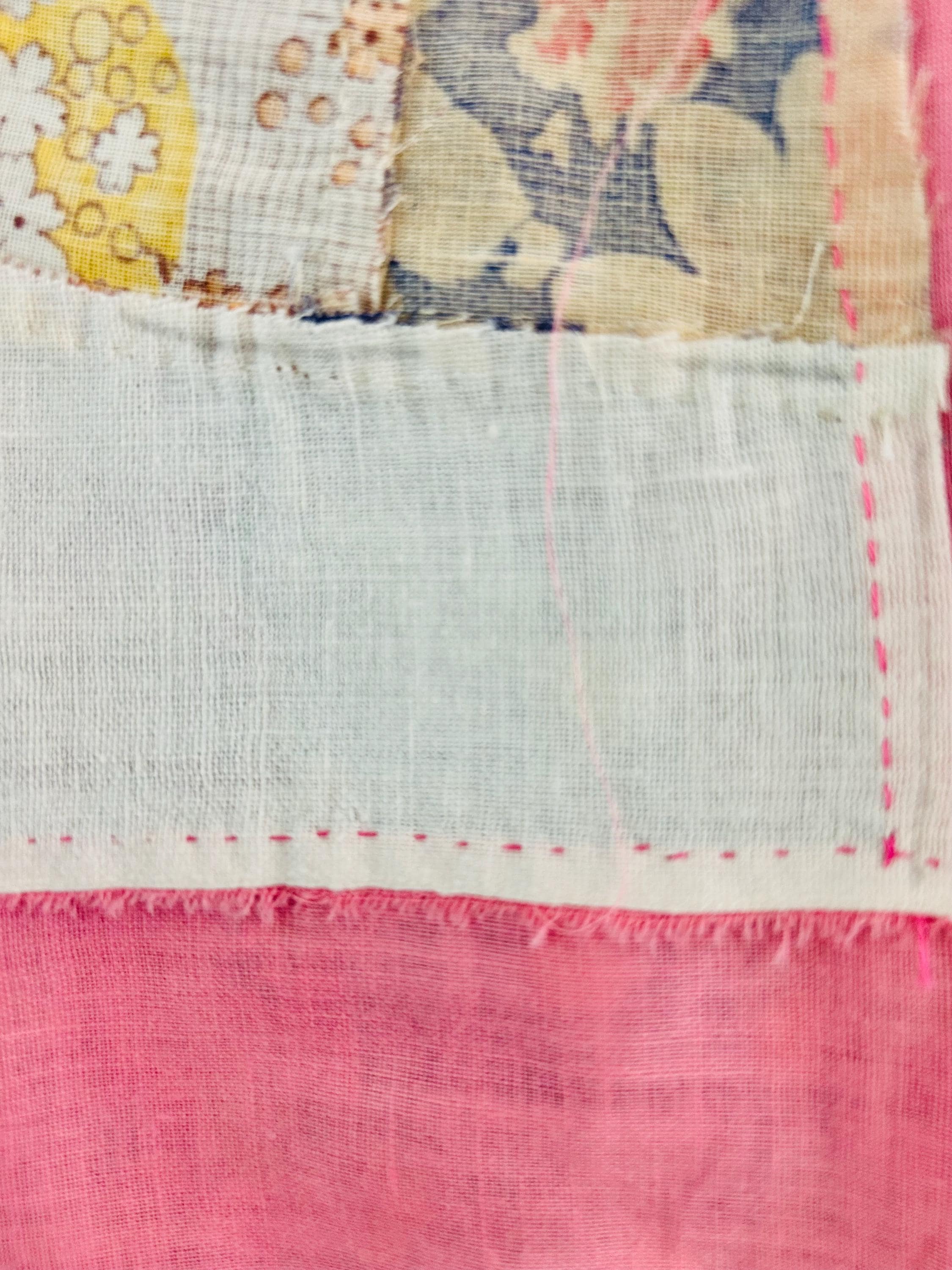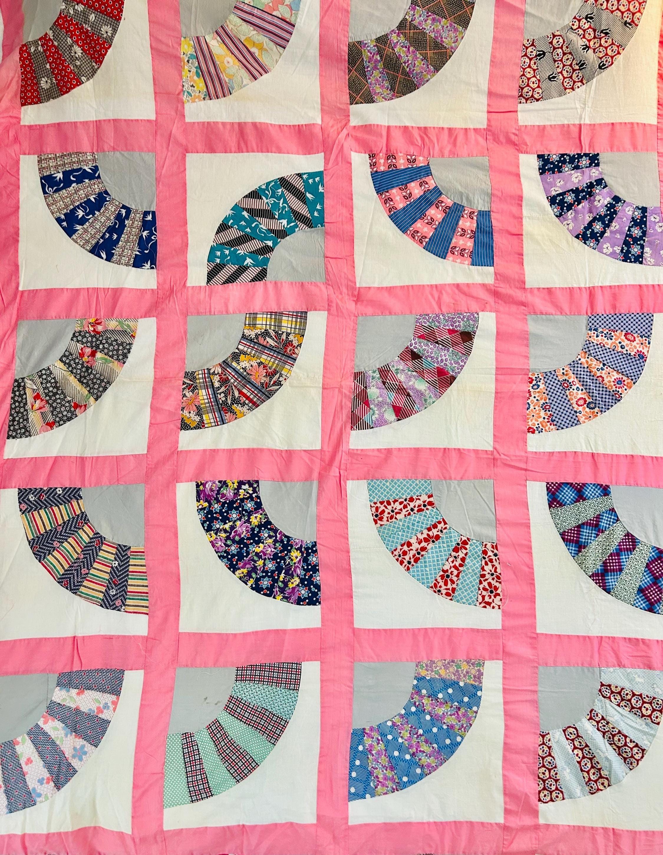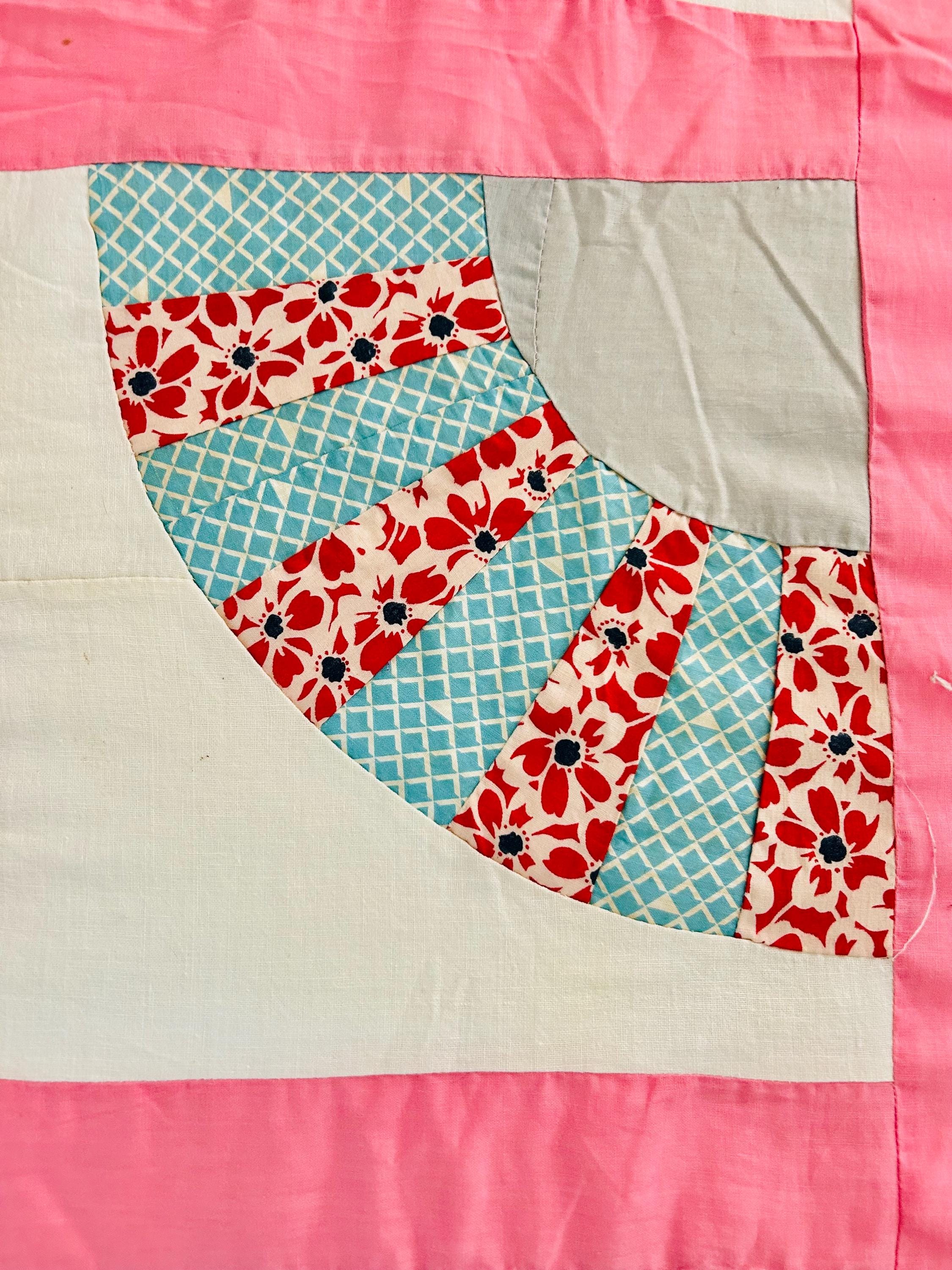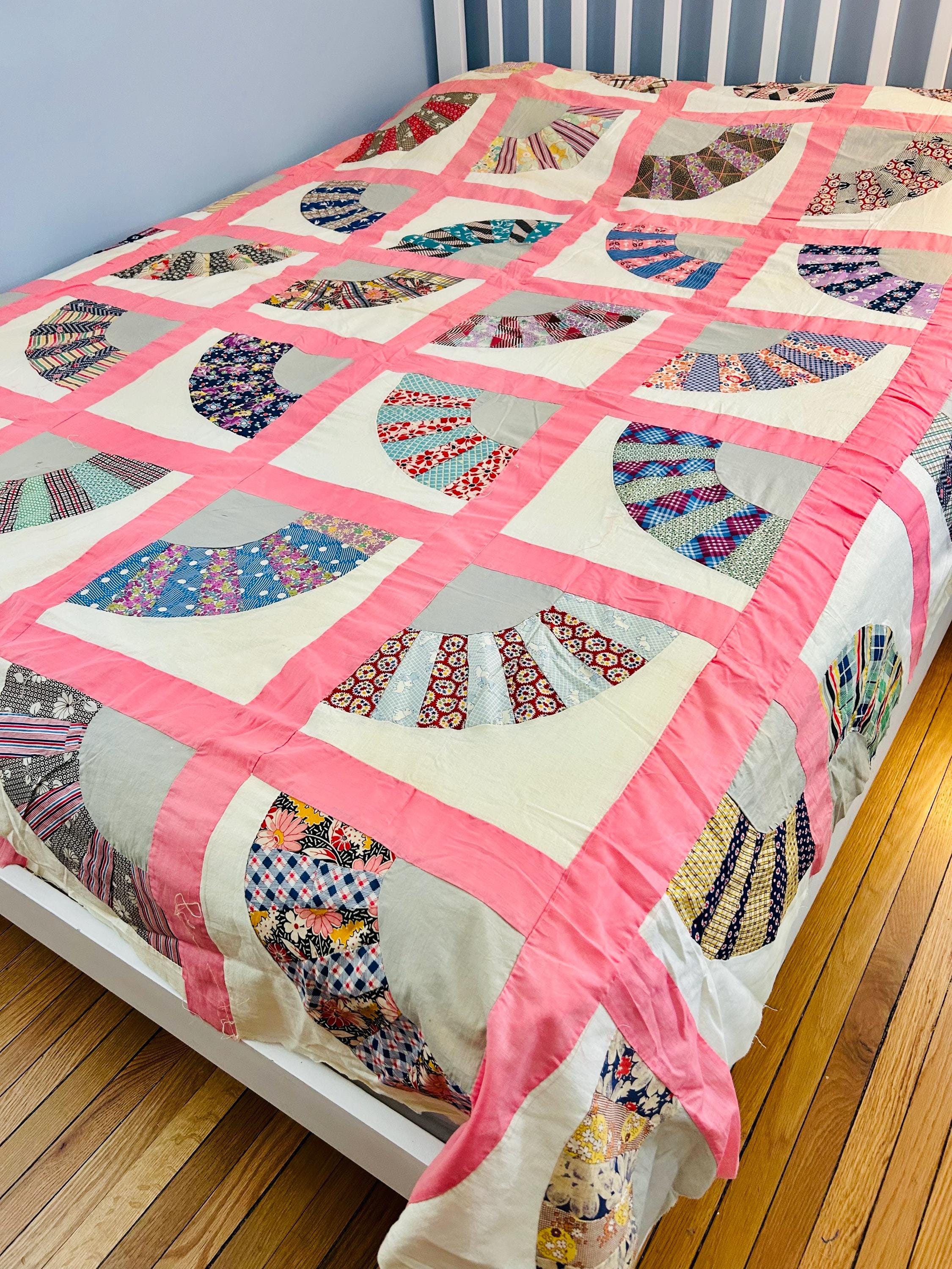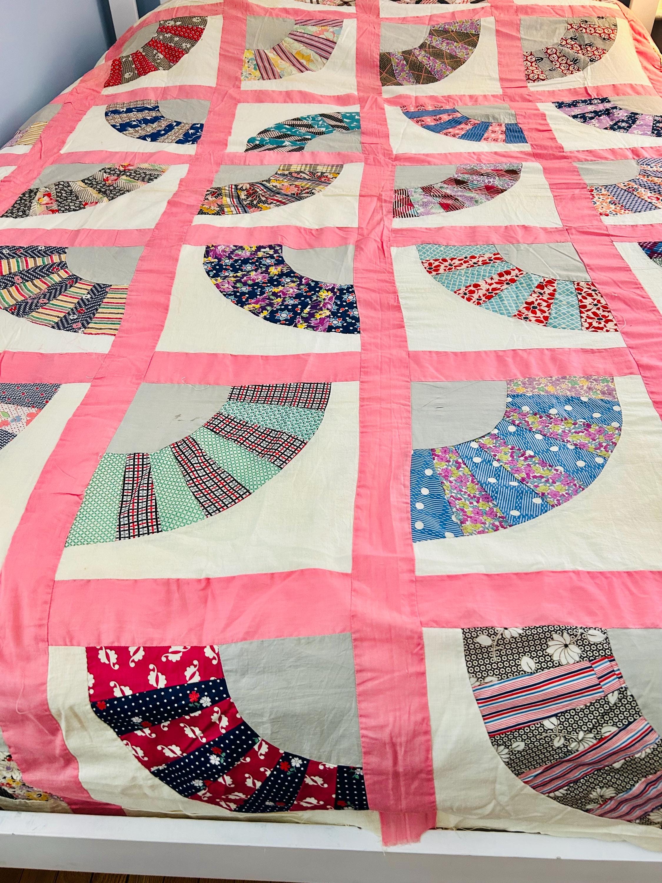 This wonderful vintage scrappy Grandmother's Fan Quilt Top is signed “Grandma” and dated 1940, a time when the maker was 70 years old. The design features classic Fan blocks, each composed of scrappy pieced wedges in lively 1930s–1940s feedsack cotton prints with vibrant pink sashing. The fabrics include: • Feedsack florals • Geometric conversation prints • Polka dots • Plaids • Cheerful Depression-era color palette • Star prints • Stripes and novelty prints