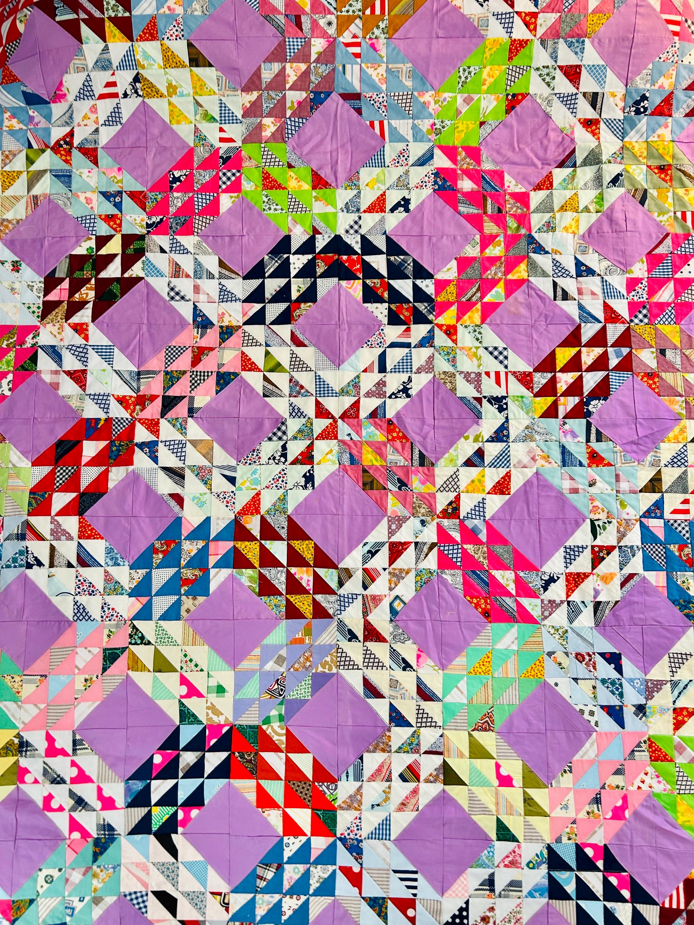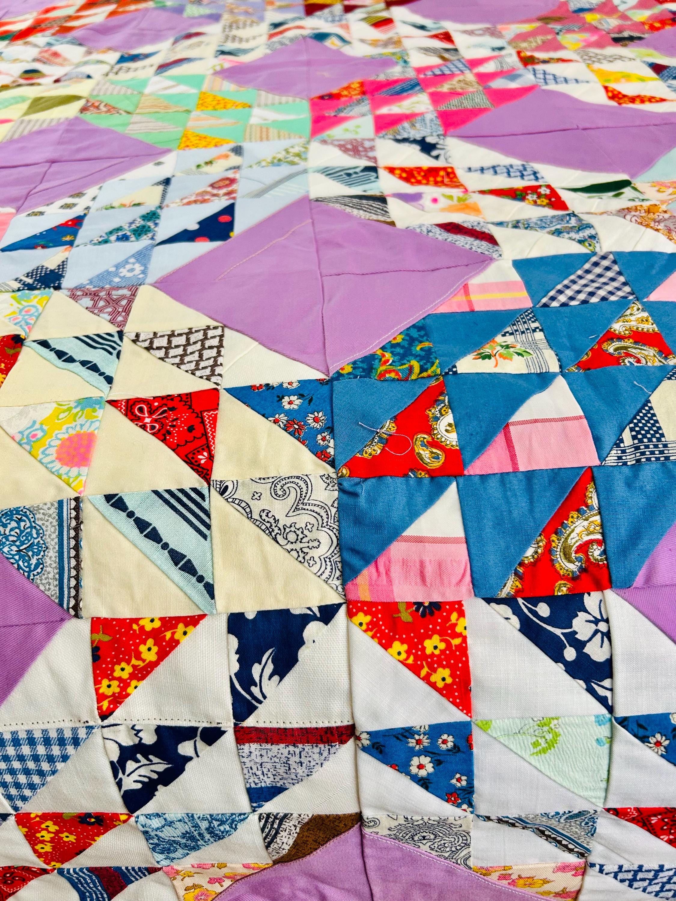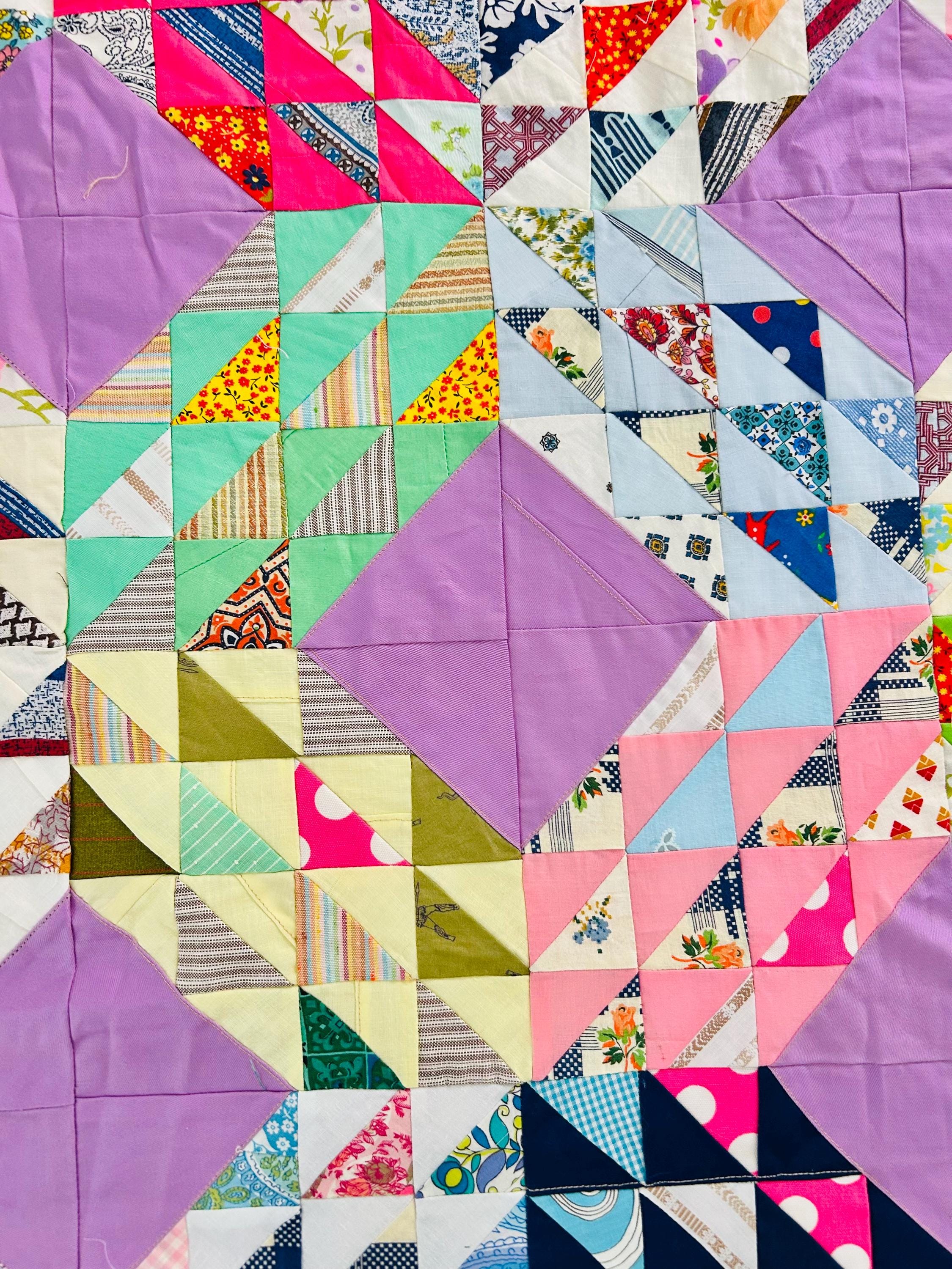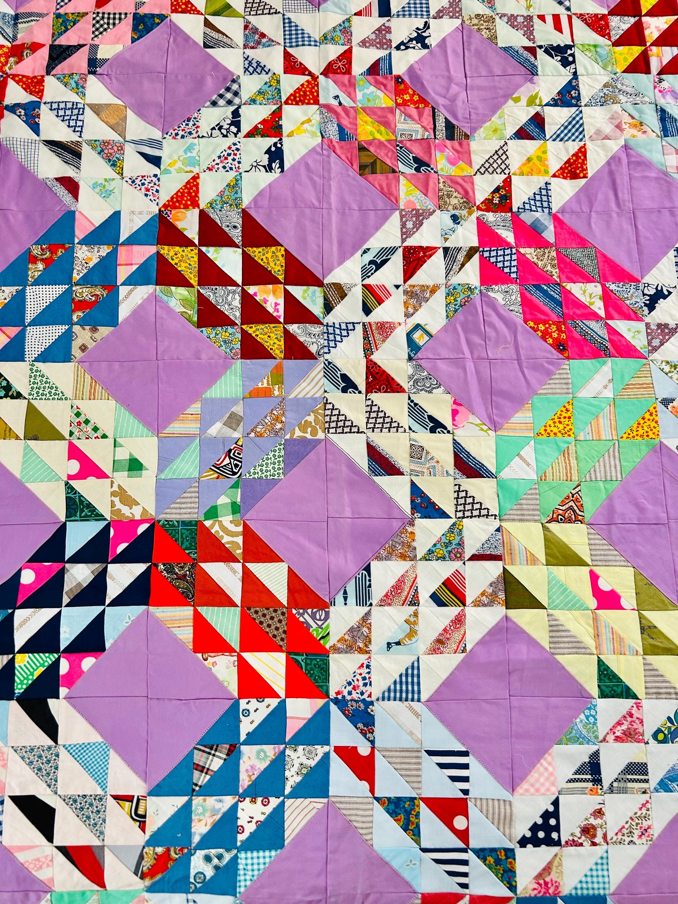 This vibrant vintage Ocean Waves quilt top measures 68” x 92” and dates to approximately the 1940s. It is a beautifully executed scrap quilt top made of Depression and WWII-era cotton prints. The classic Ocean Waves pattern features hundreds of tiny half-square triangles arranged in dynamic, rolling blocks, set with lavender solid diamonds that create striking movement across the surface. The fabric selection includes: