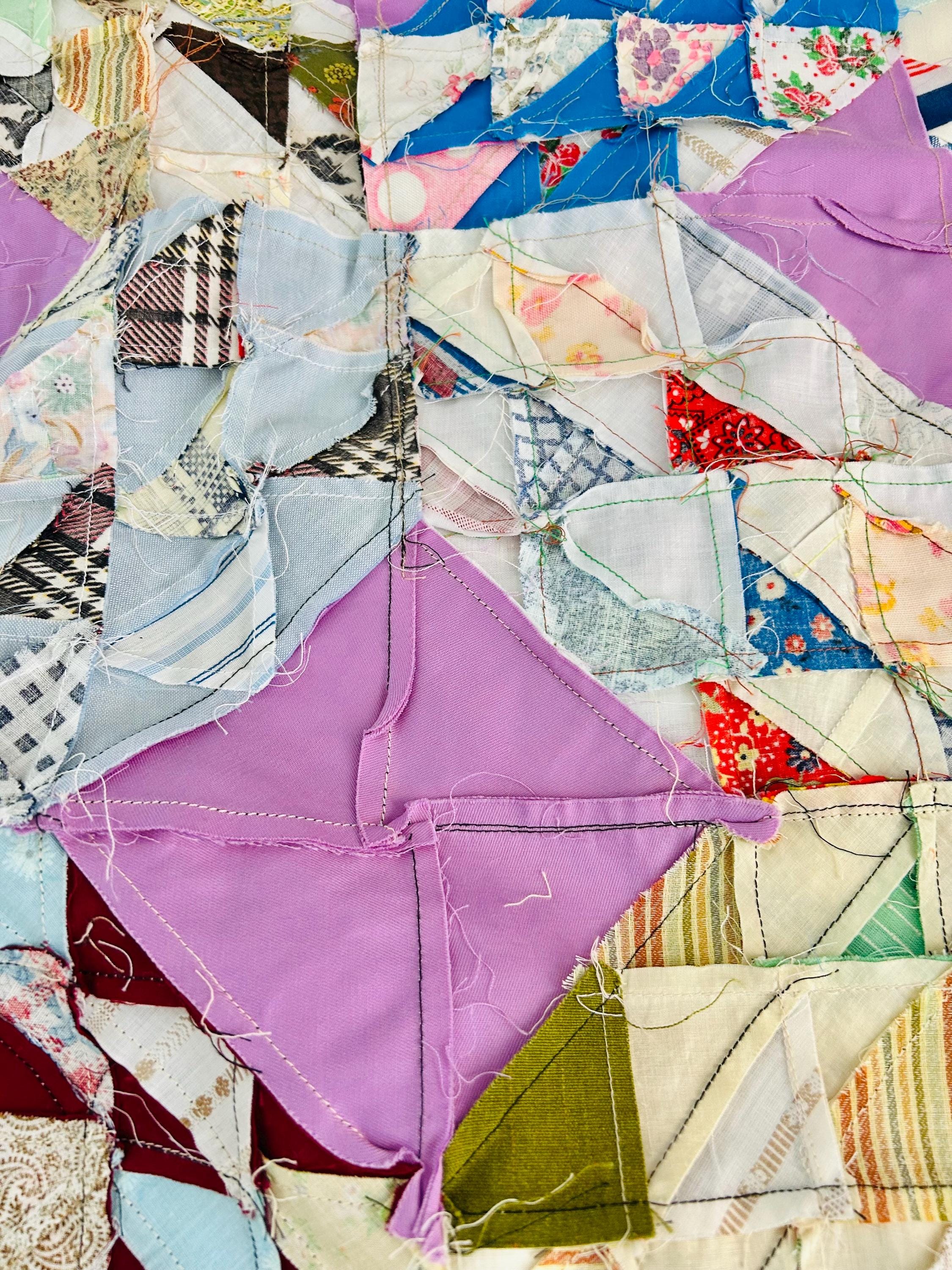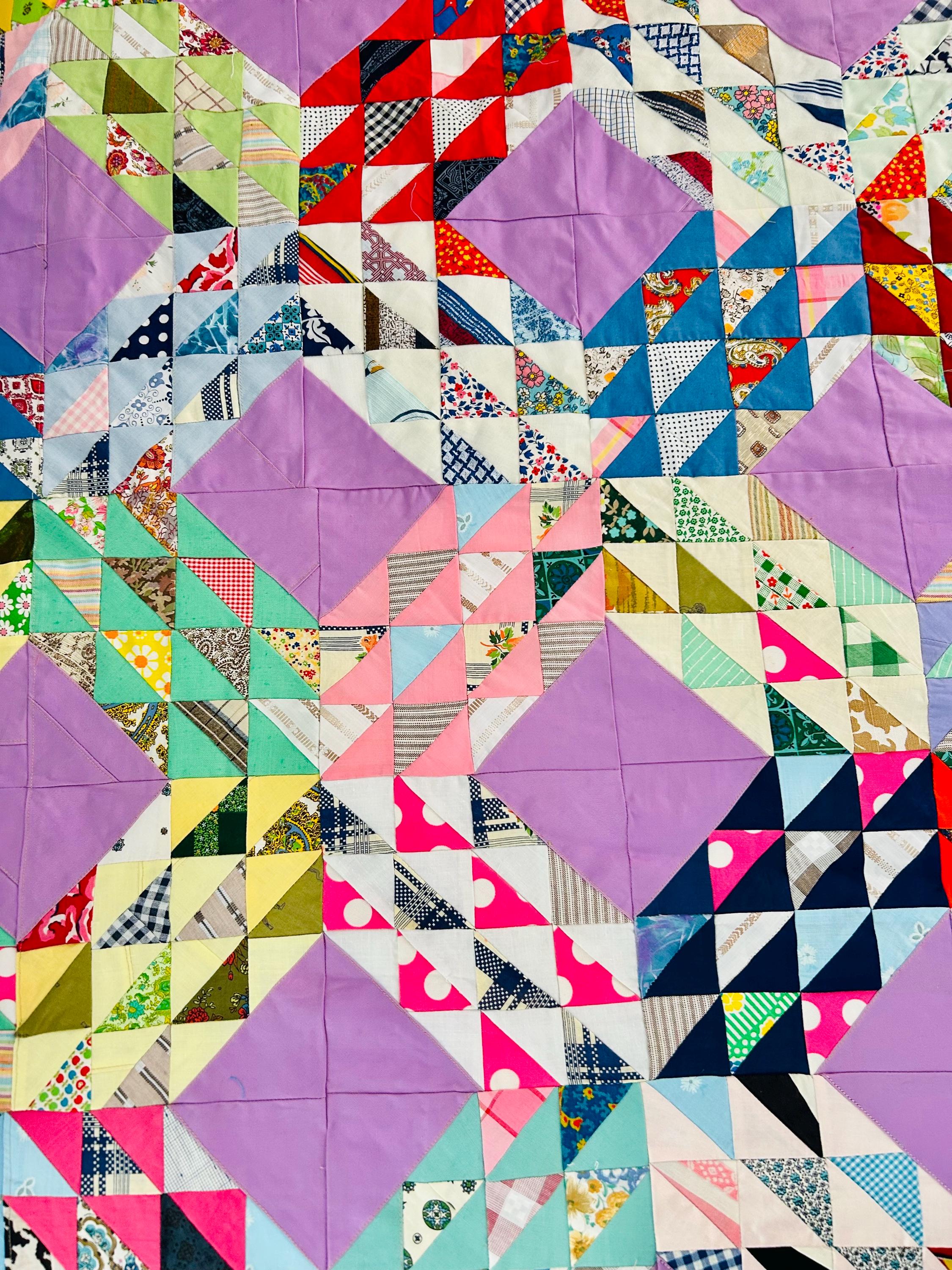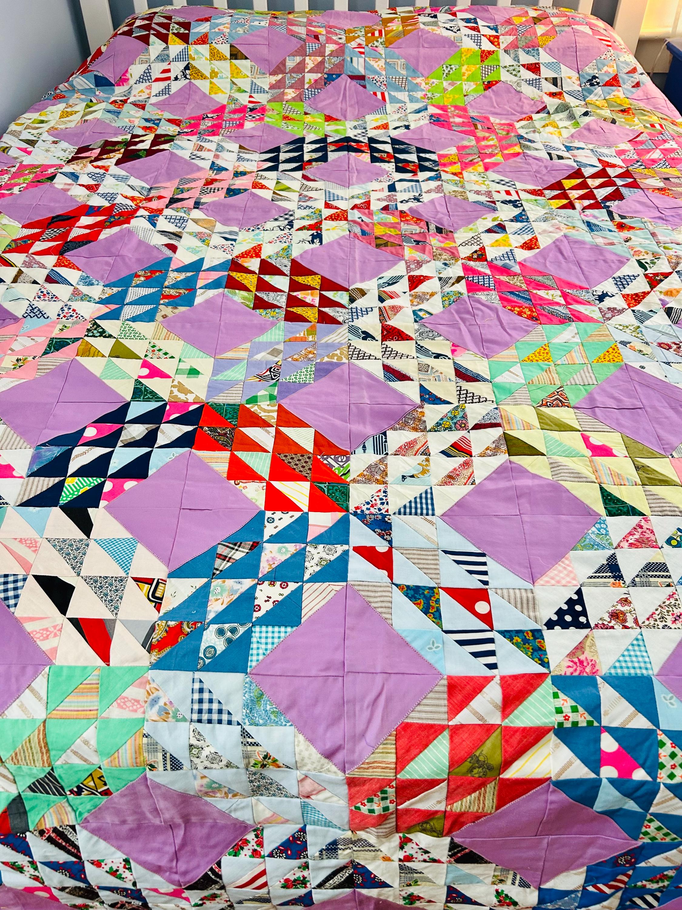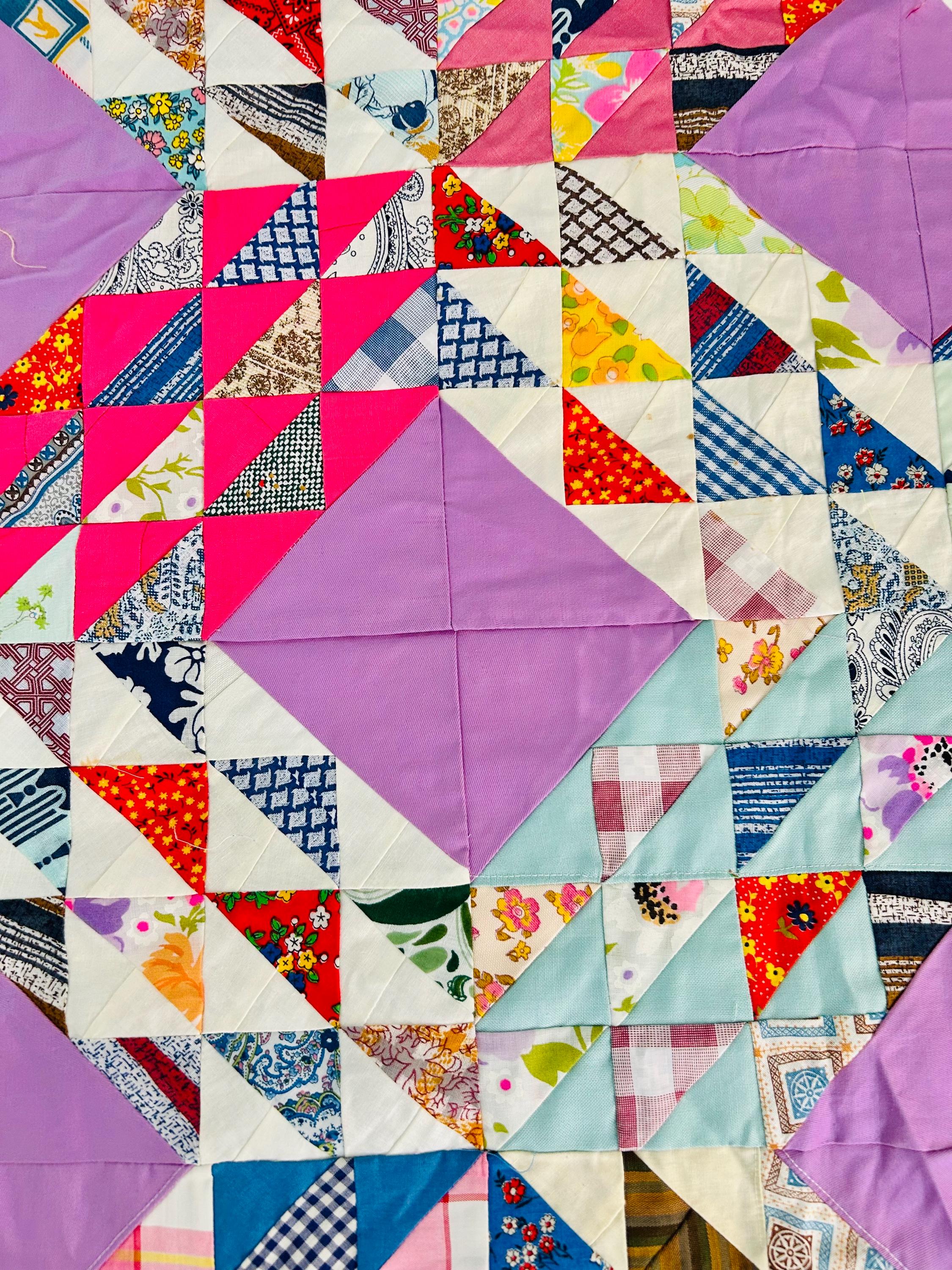 This vibrant vintage Ocean Waves quilt top measures 68” x 92” and dates to approximately the 1940s. It is a beautifully executed scrap quilt top made of Depression and WWII-era cotton prints. The classic Ocean Waves pattern features hundreds of tiny half-square triangles arranged in dynamic, rolling blocks, set with lavender solid diamonds that create striking movement across the surface. The fabric selection includes: