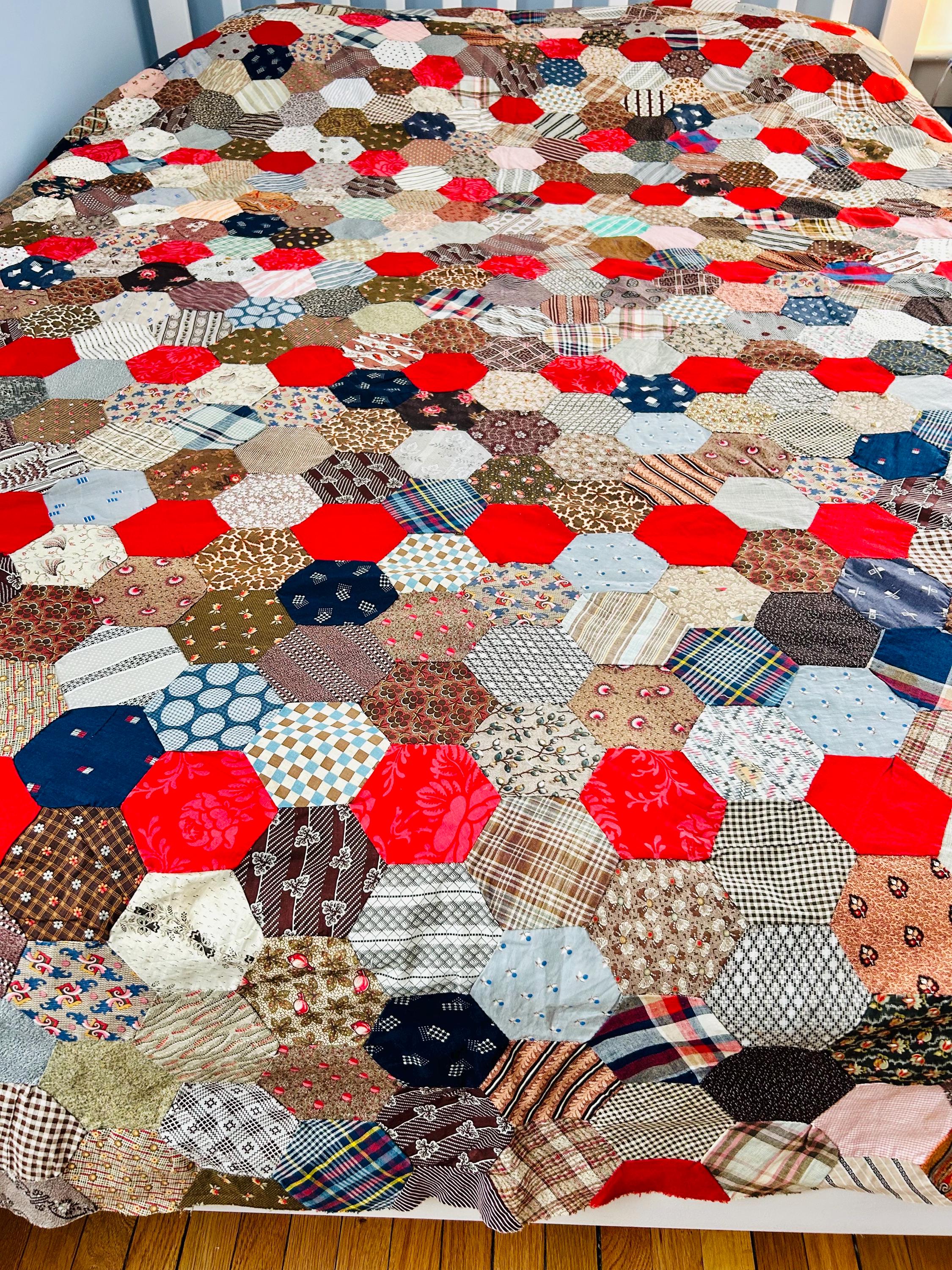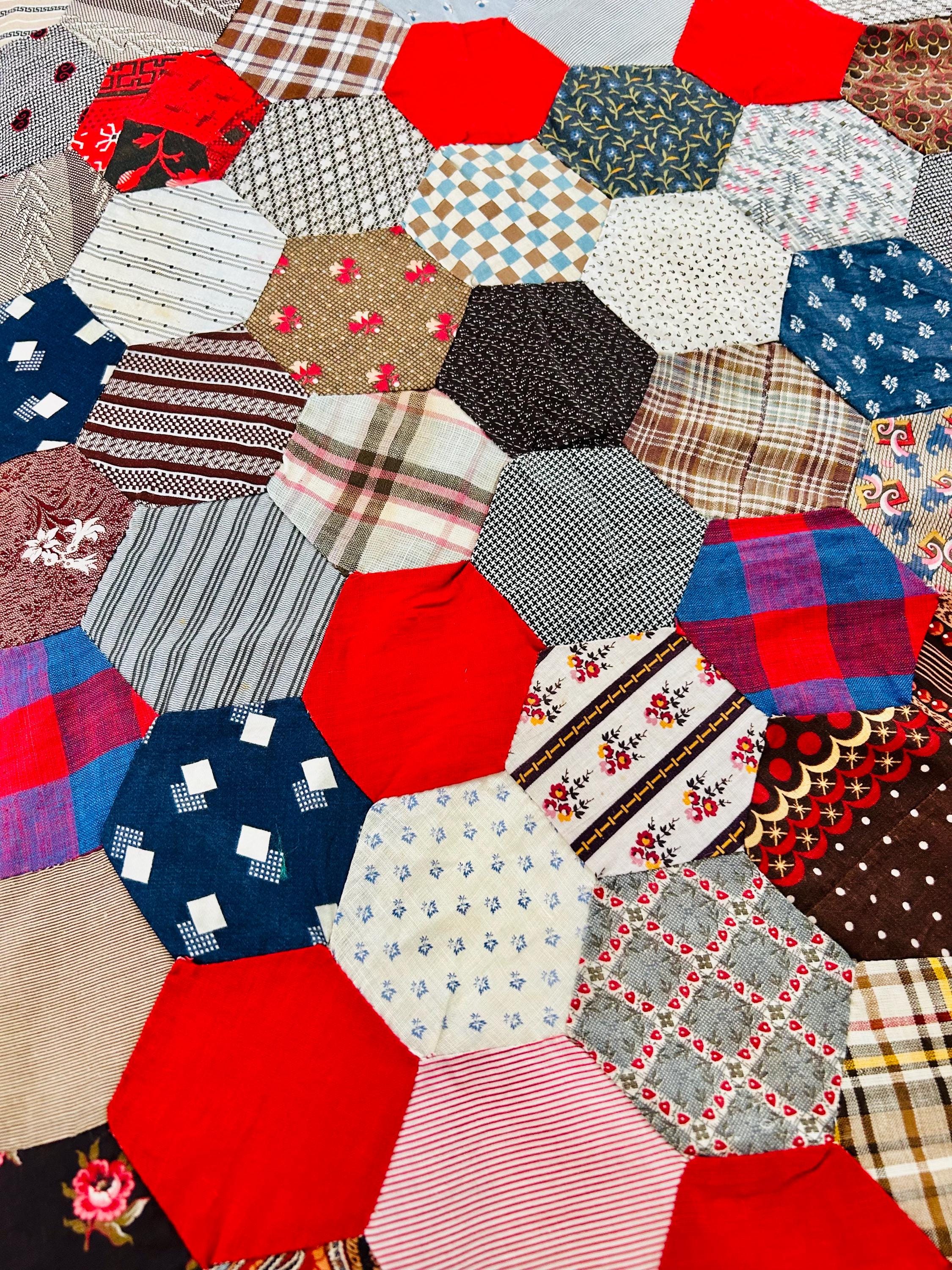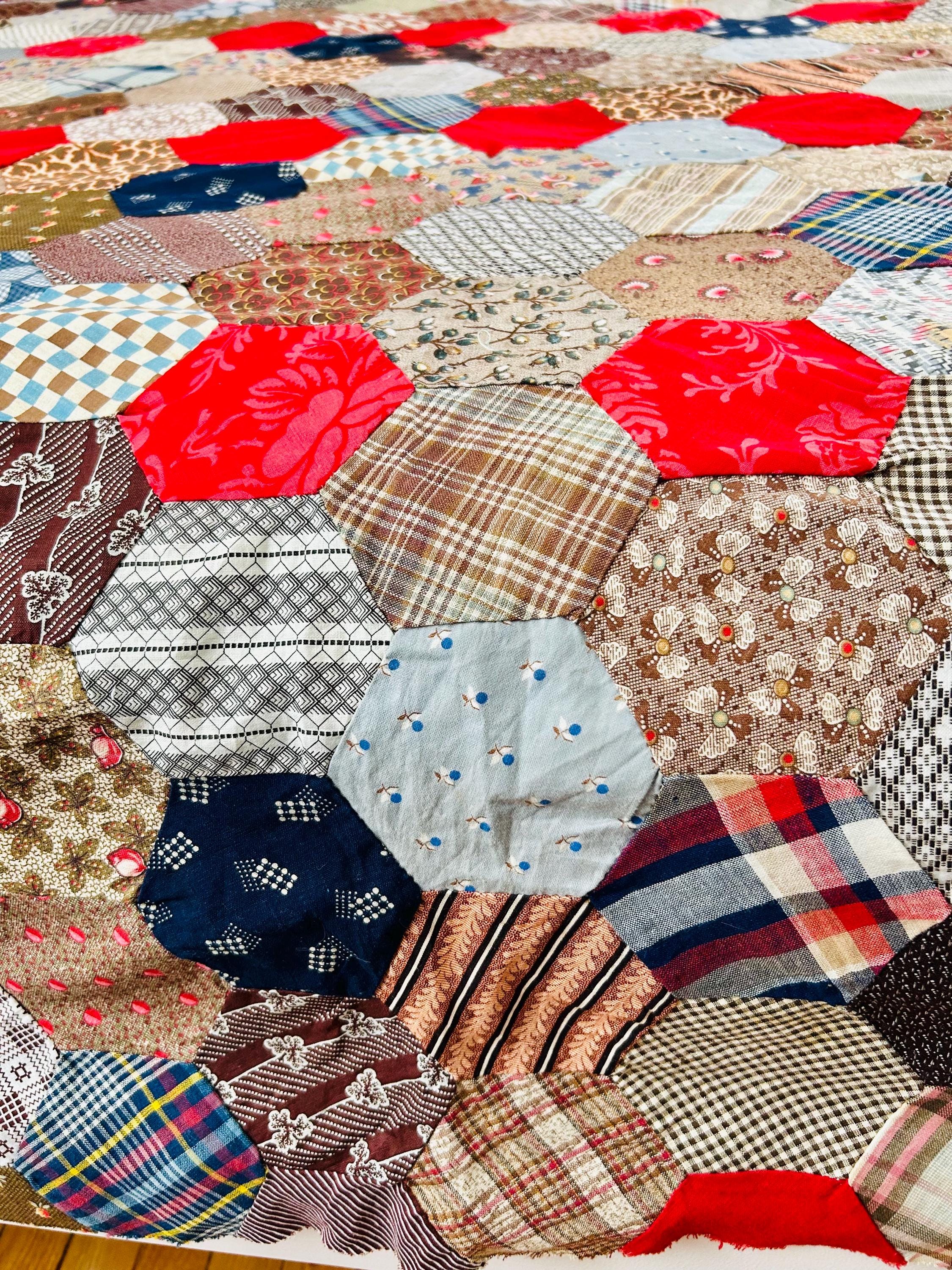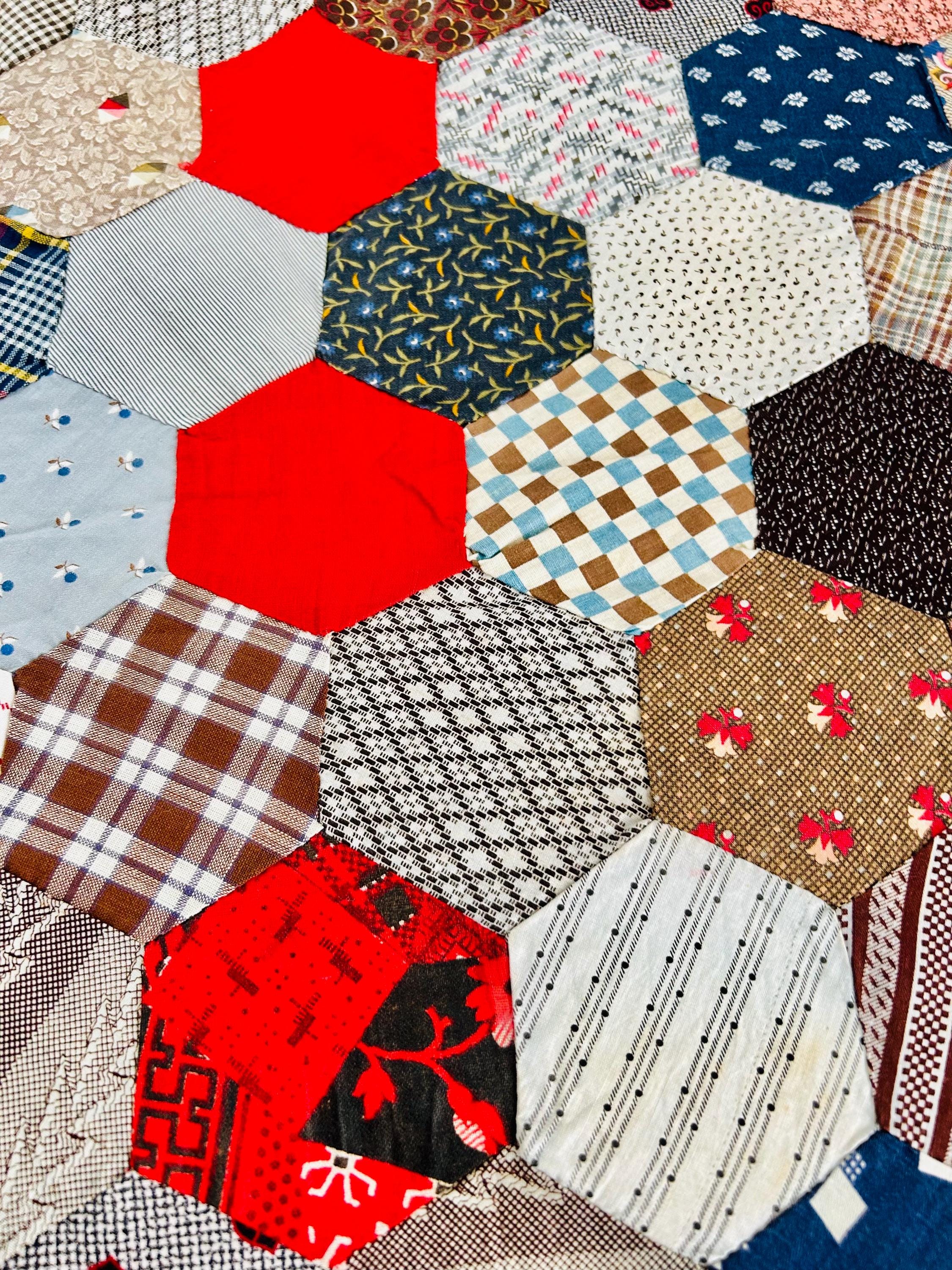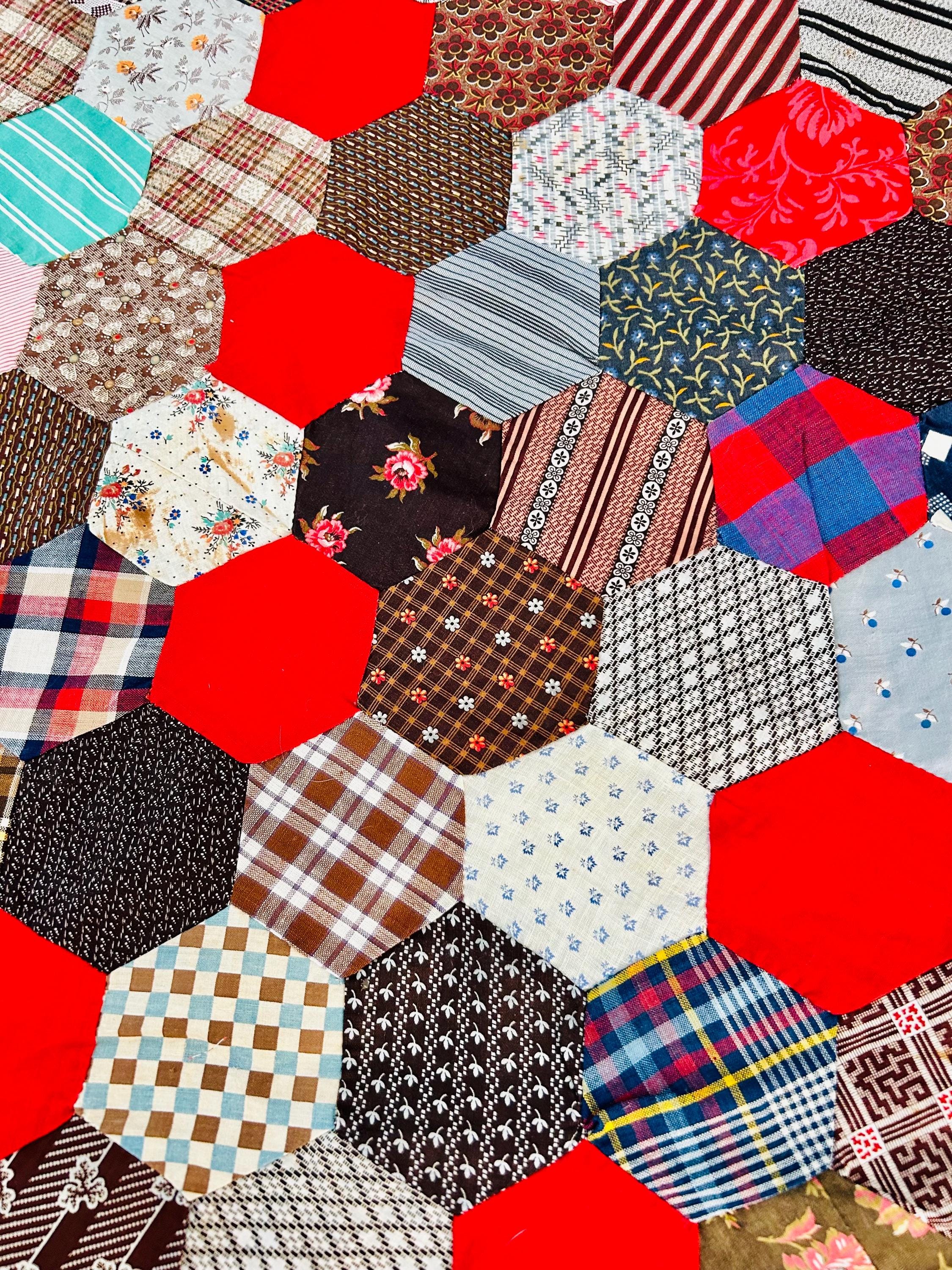 This is an exceptional antique Honeycomb Quilt Top, hand pieced using the English Paper Piecing (EPP) method and likely begun in the late 19th century and finished by several generations of quilters. The fabrics include late 1800s black-and-white and navy shirtings typical of the era's dress fabrics, deep indigoes, browns, and mourning/half-mourning prints, and small-scale geometrics. On the other hand, several brighter red solids and later prints appear to have been added in the early 20th century, suggesting this was a generational family project — a quilt top built slowly over decades from saved dress scraps.