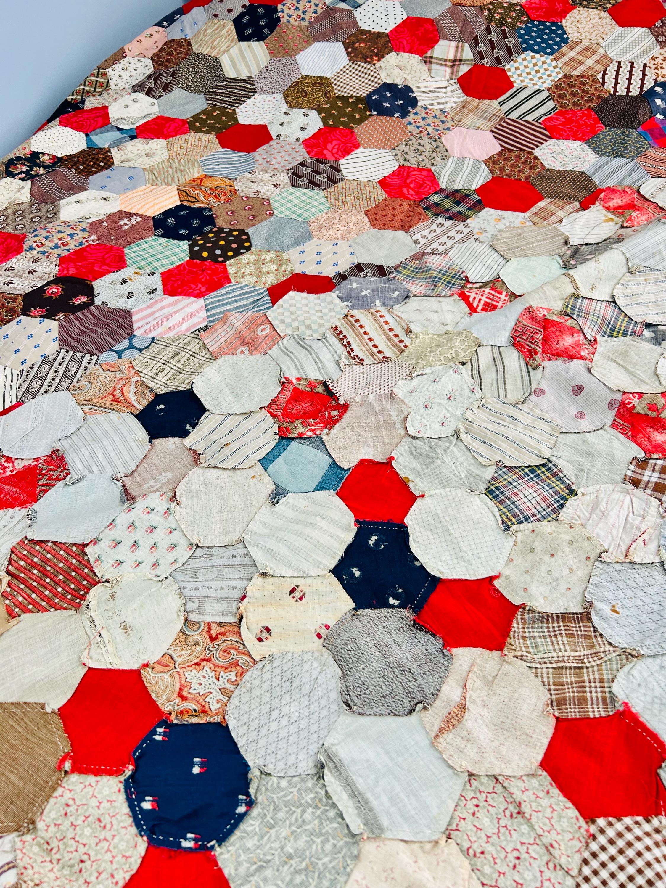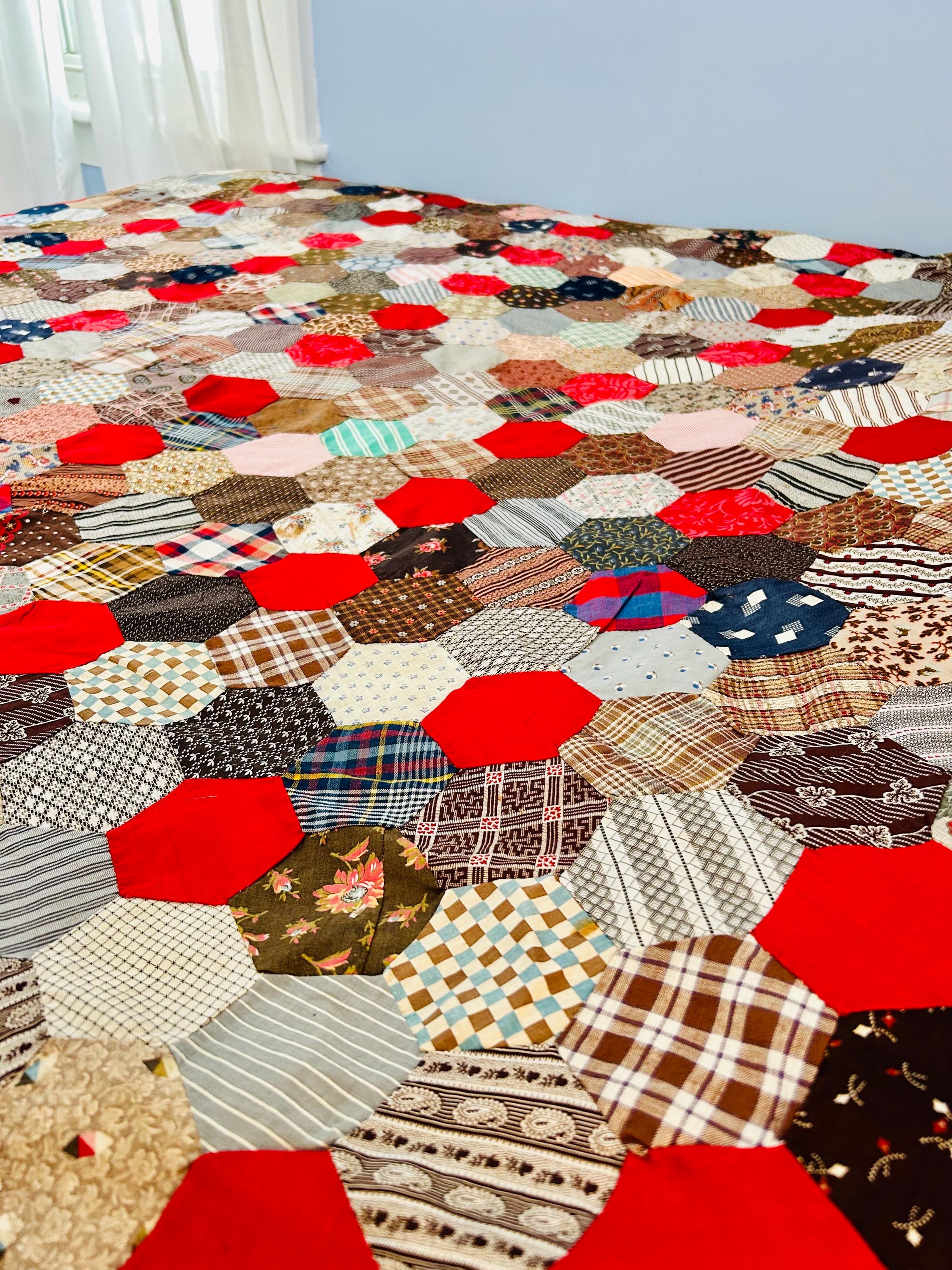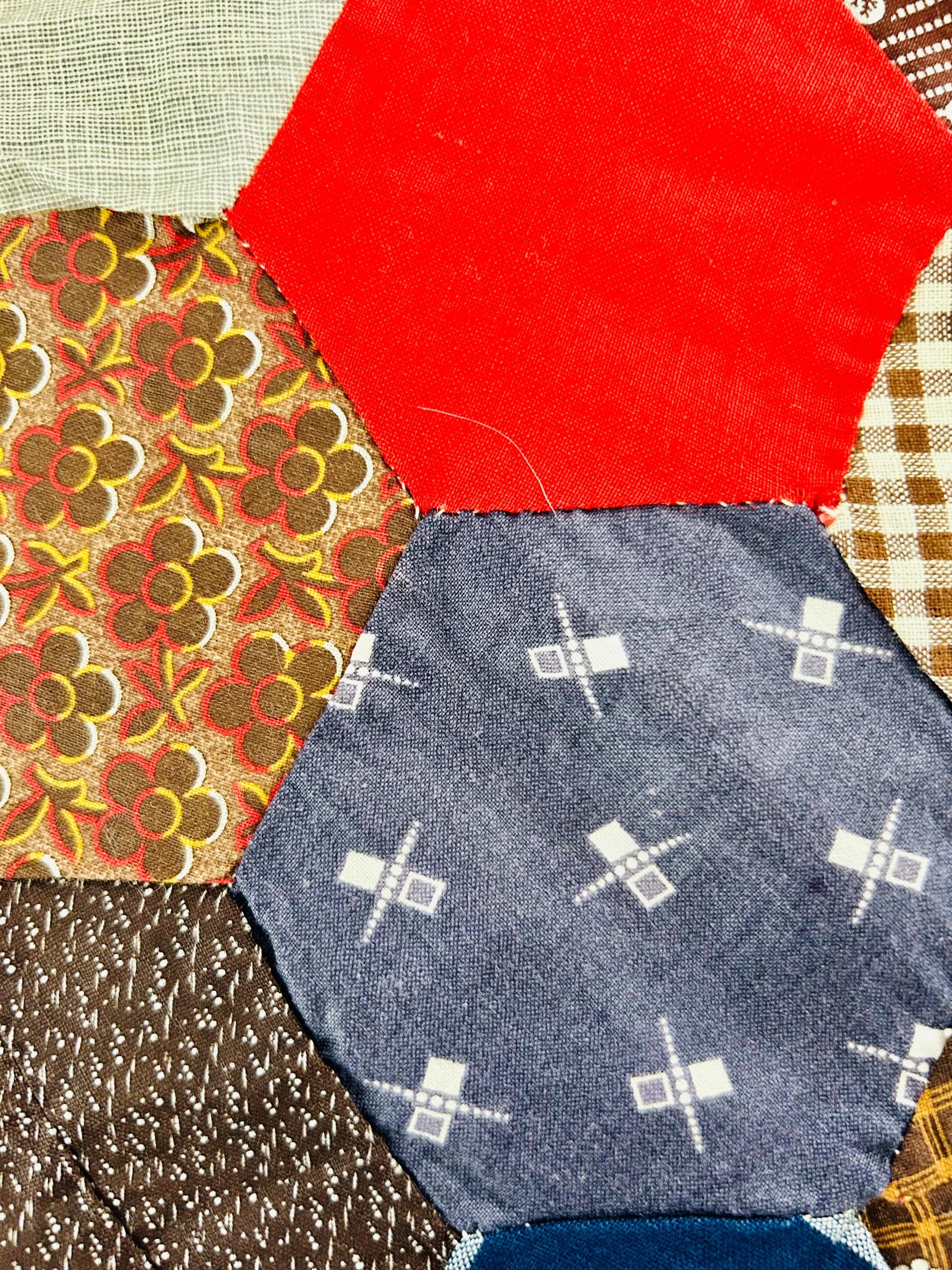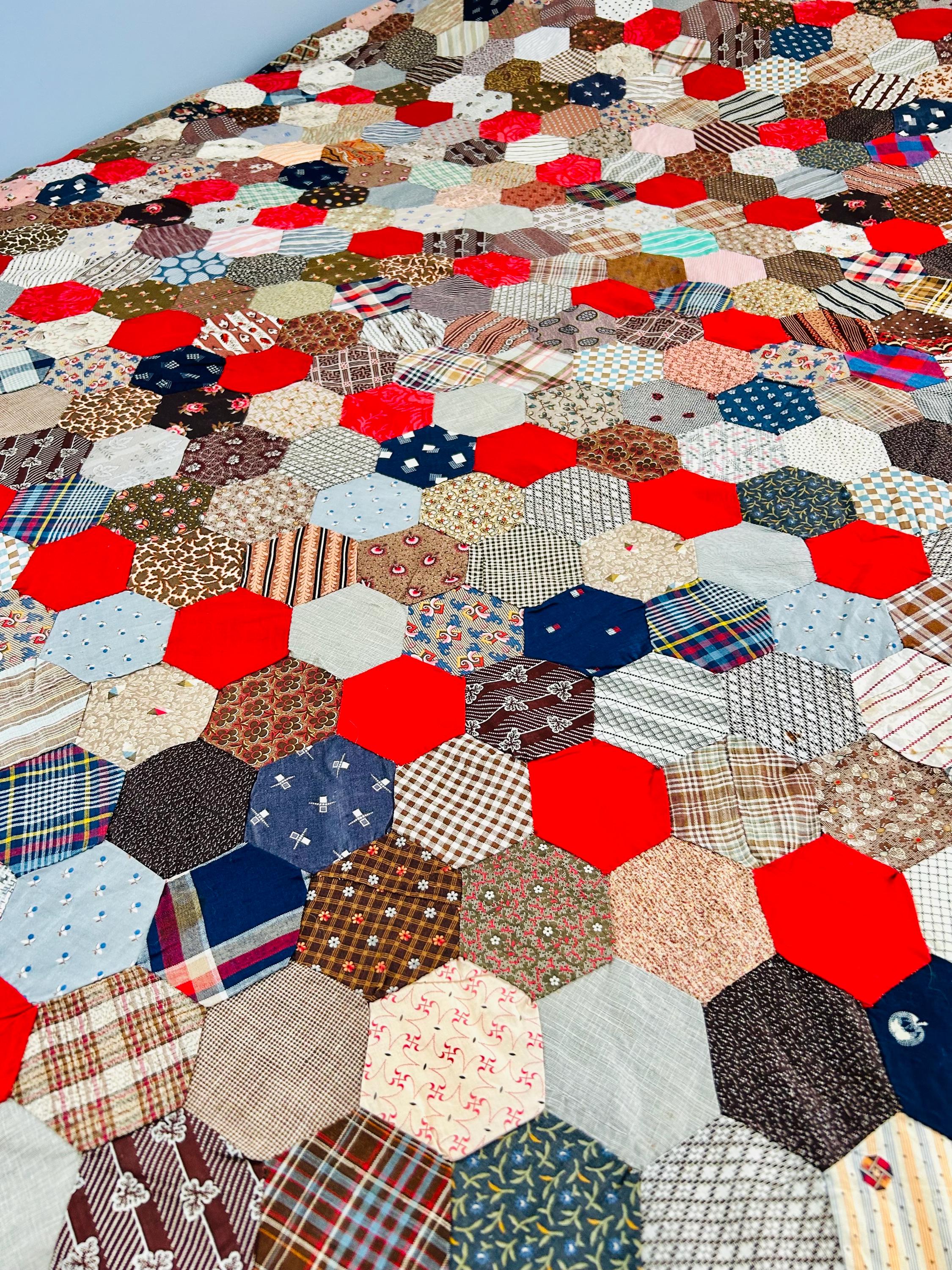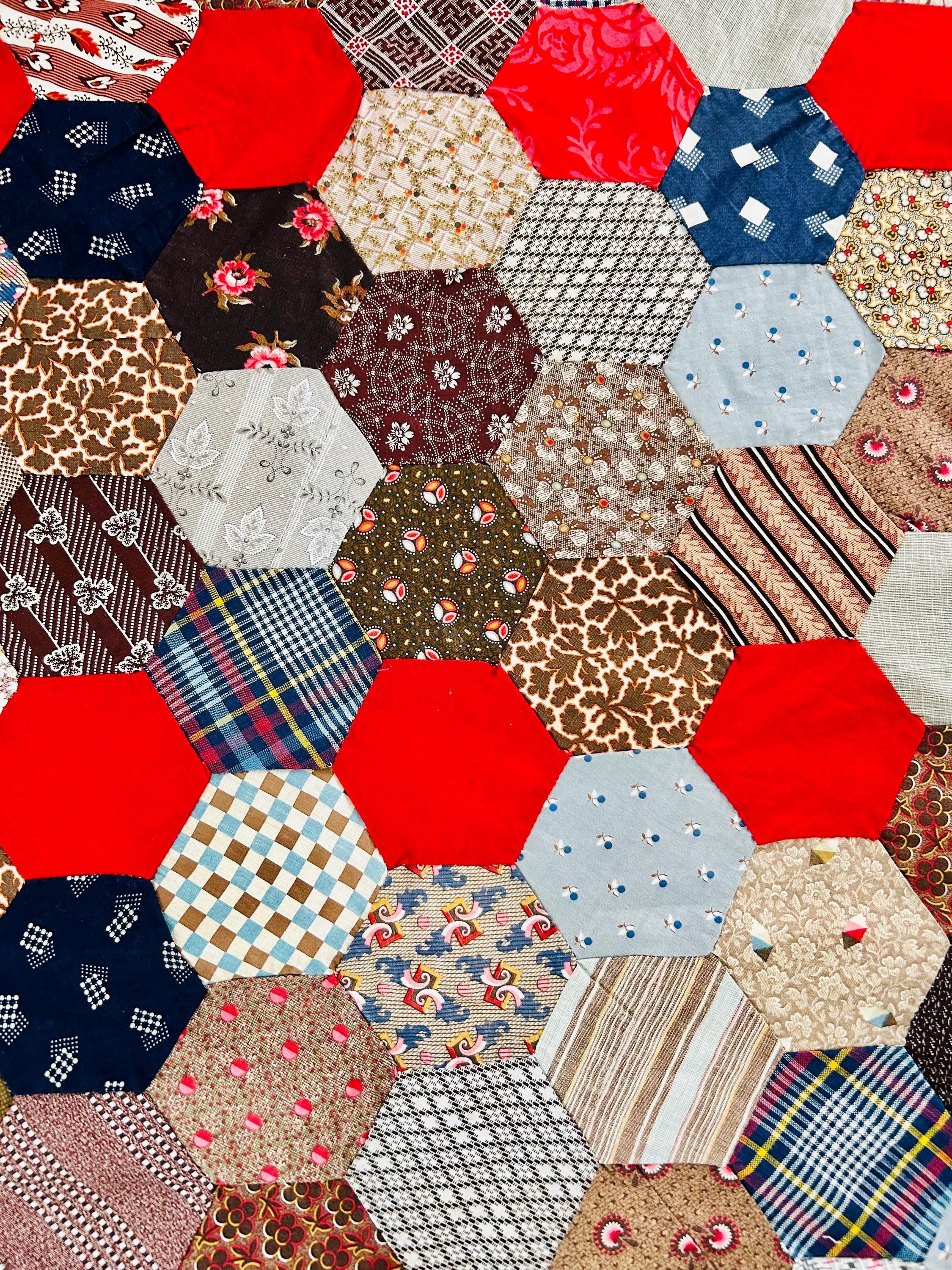 This is an exceptional antique Honeycomb Quilt Top, hand pieced using the English Paper Piecing (EPP) method and likely begun in the late 19th century and finished by several generations of quilters. The fabrics include late 1800s black-and-white and navy shirtings typical of the era's dress fabrics, deep indigoes, browns, and mourning/half-mourning prints, and small-scale geometrics. On the other hand, several brighter red solids and later prints appear to have been added in the early 20th century, suggesting this was a generational family project — a quilt top built slowly over decades from saved dress scraps.