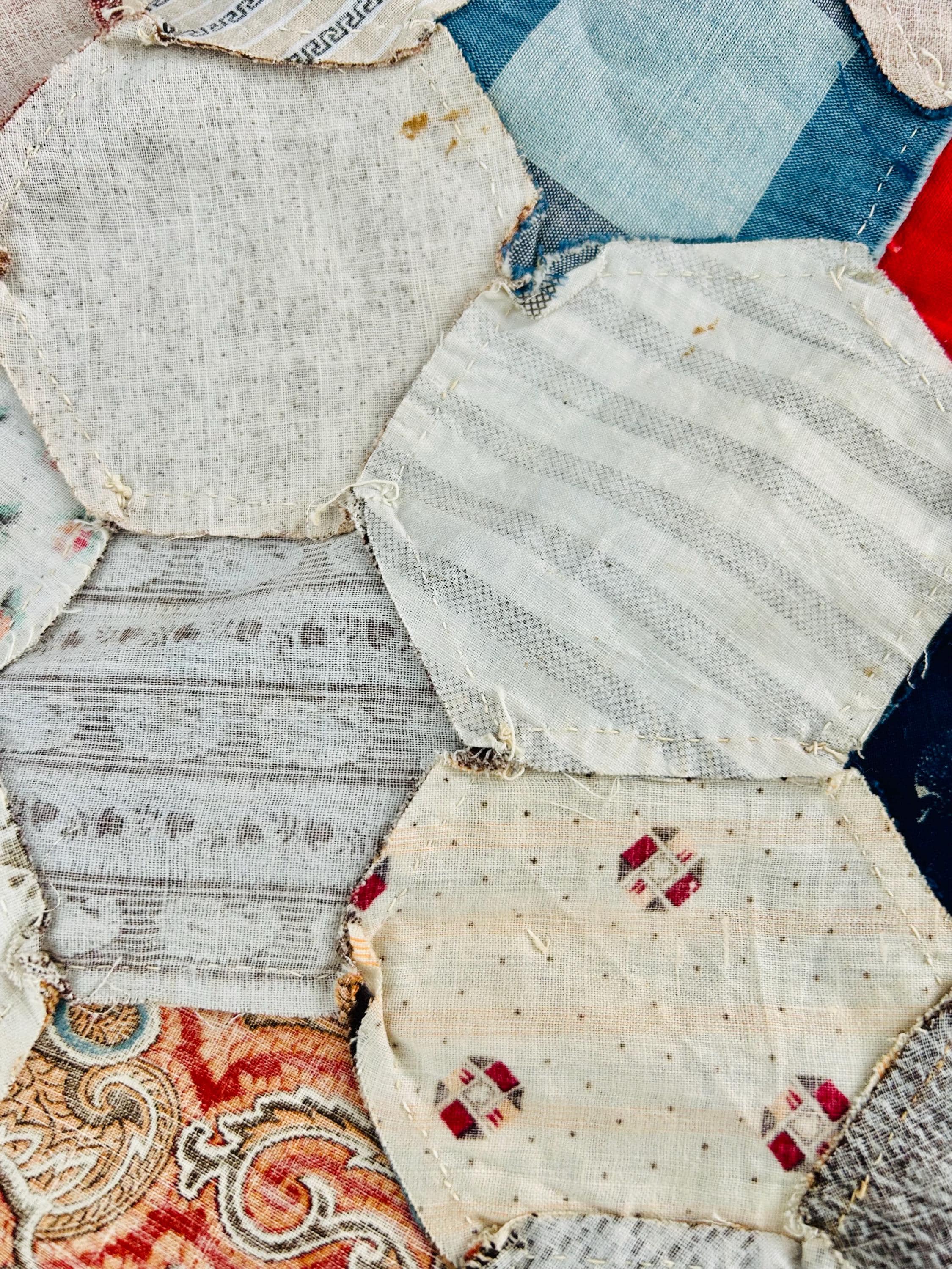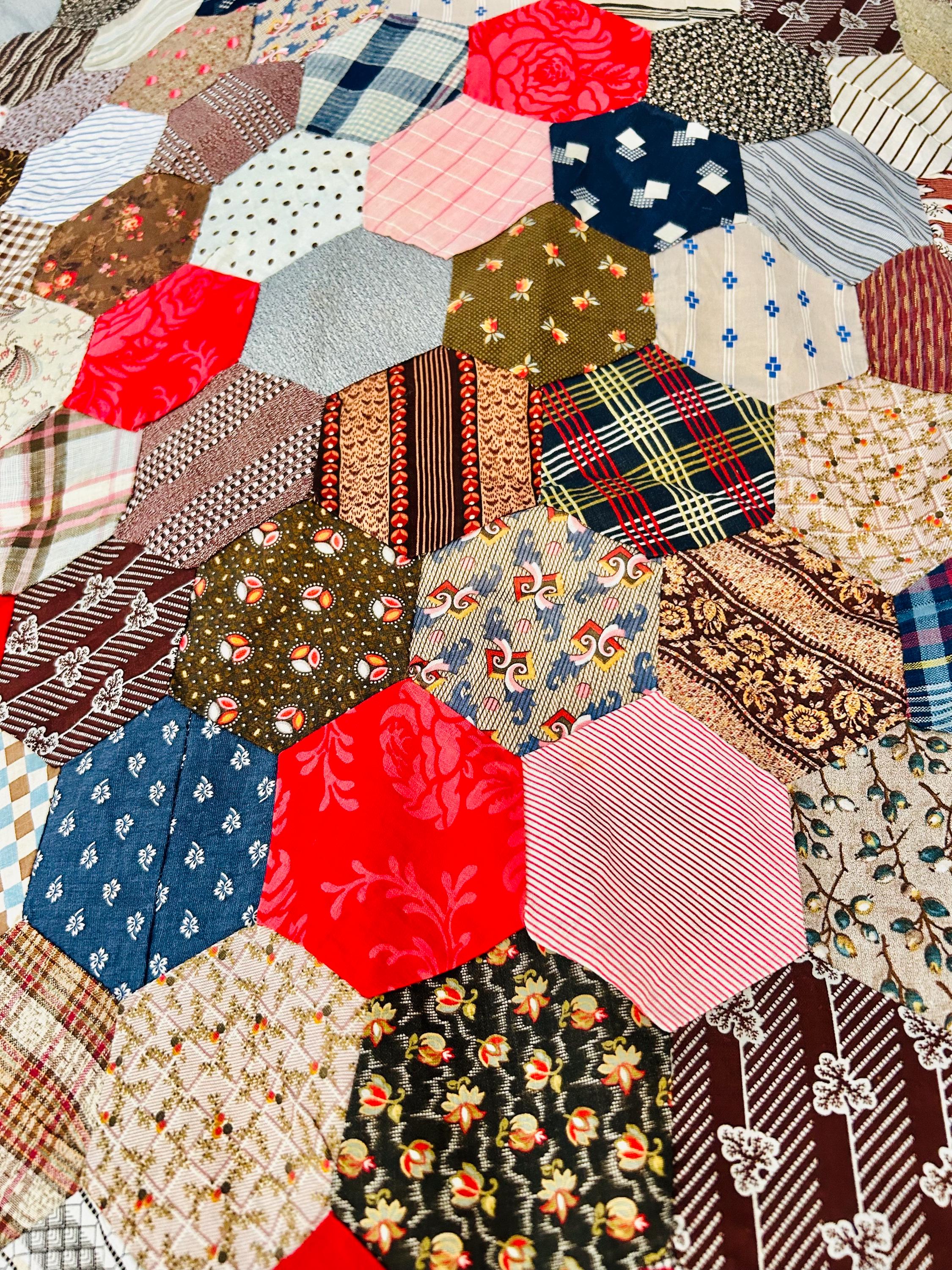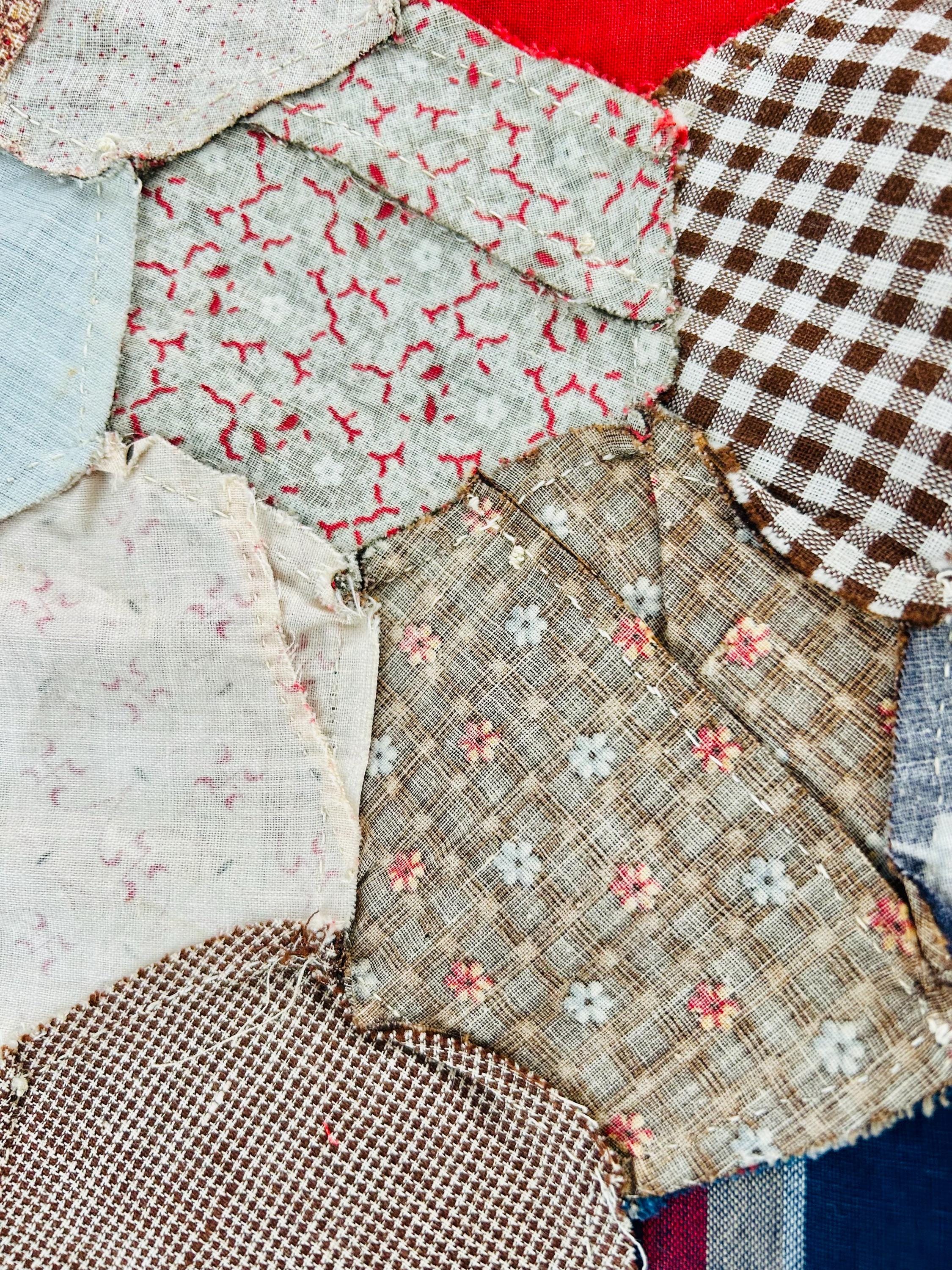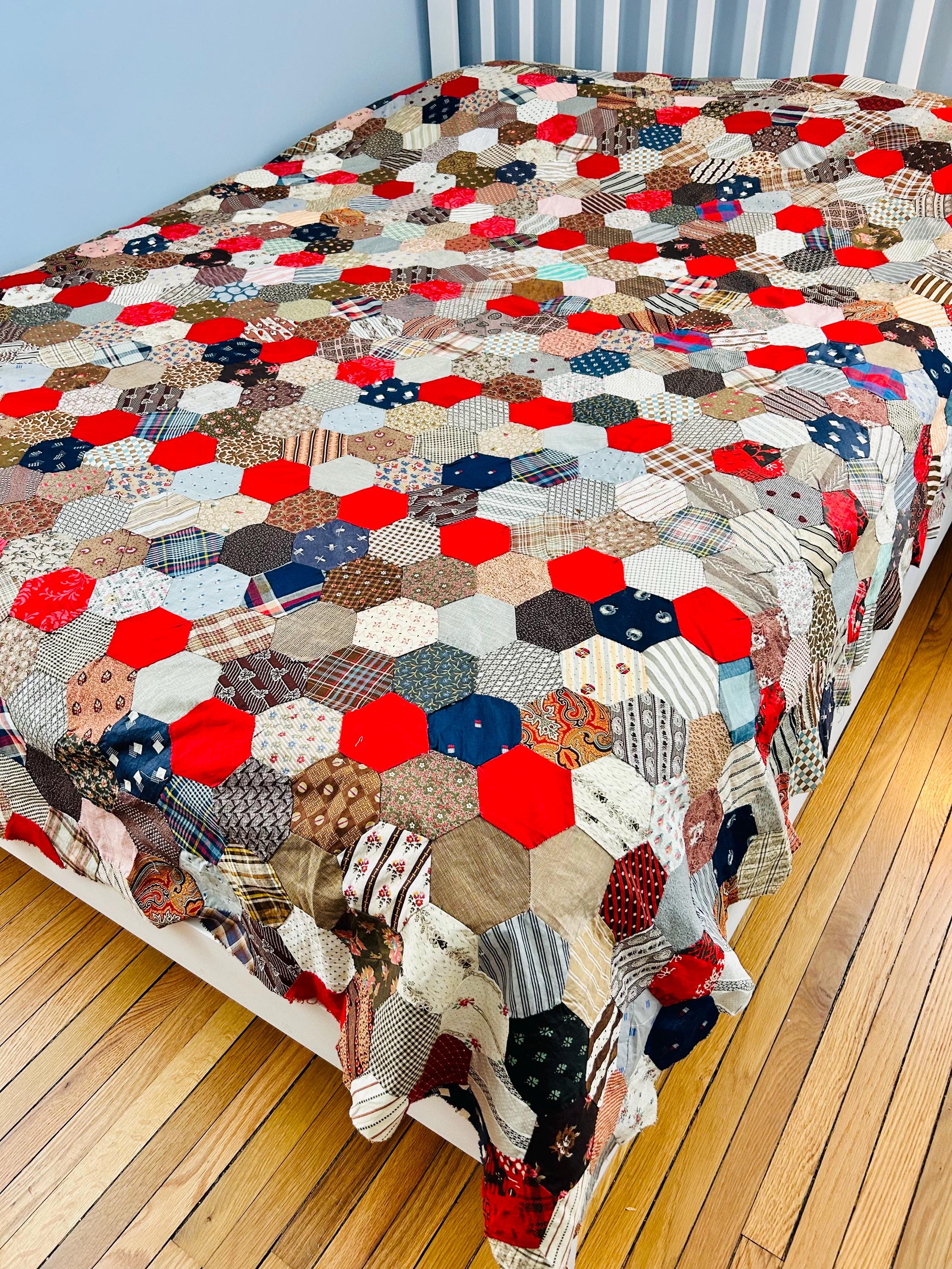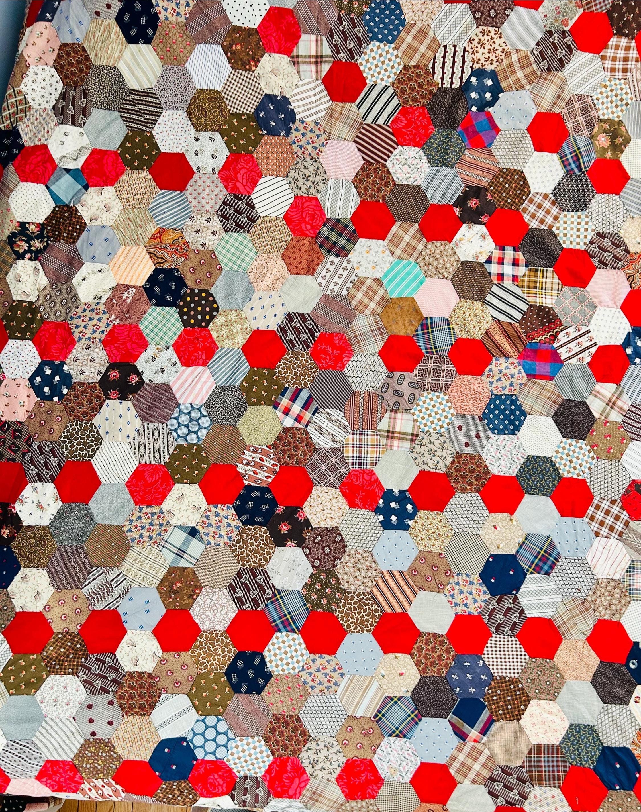 This is an exceptional antique Honeycomb Quilt Top, hand pieced using the English Paper Piecing (EPP) method and likely begun in the late 19th century and finished by several generations of quilters. The fabrics include late 1800s black-and-white and navy shirtings typical of the era's dress fabrics, deep indigoes, browns, and mourning/half-mourning prints, and small-scale geometrics. On the other hand, several brighter red solids and later prints appear to have been added in the early 20th century, suggesting this was a generational family project — a quilt top built slowly over decades from saved dress scraps.