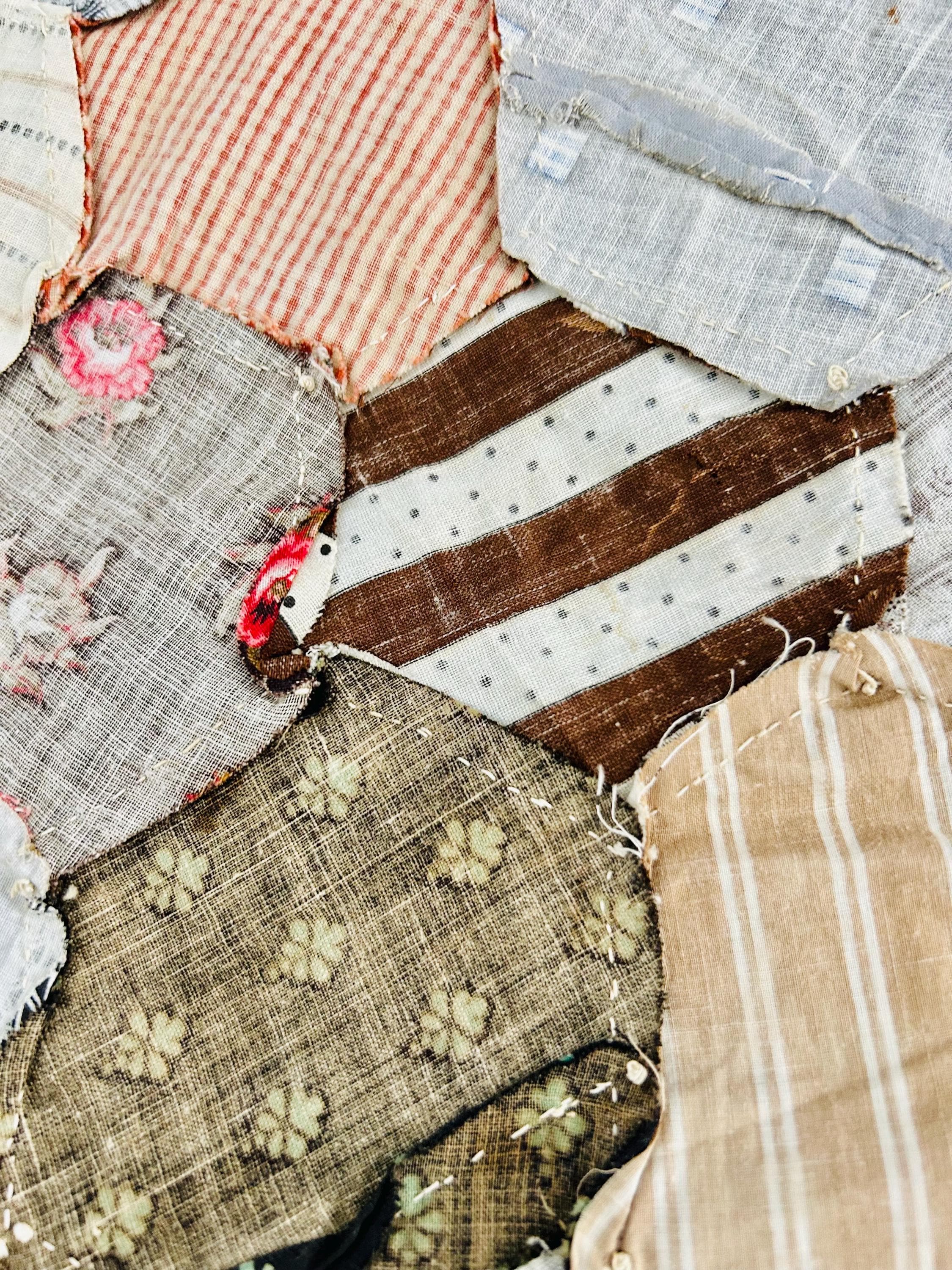 Details • Pattern: Overall Hexagon (Grandmother’s Flower Garden format) • Date: Started circa 1880–1900; later additions early 20th century • Size: 80” x 90” • Construction: Hand pieced, English Paper Pieced • Quilting: Not quilted – quilt top only • Materials: Antique cotton dress scraps