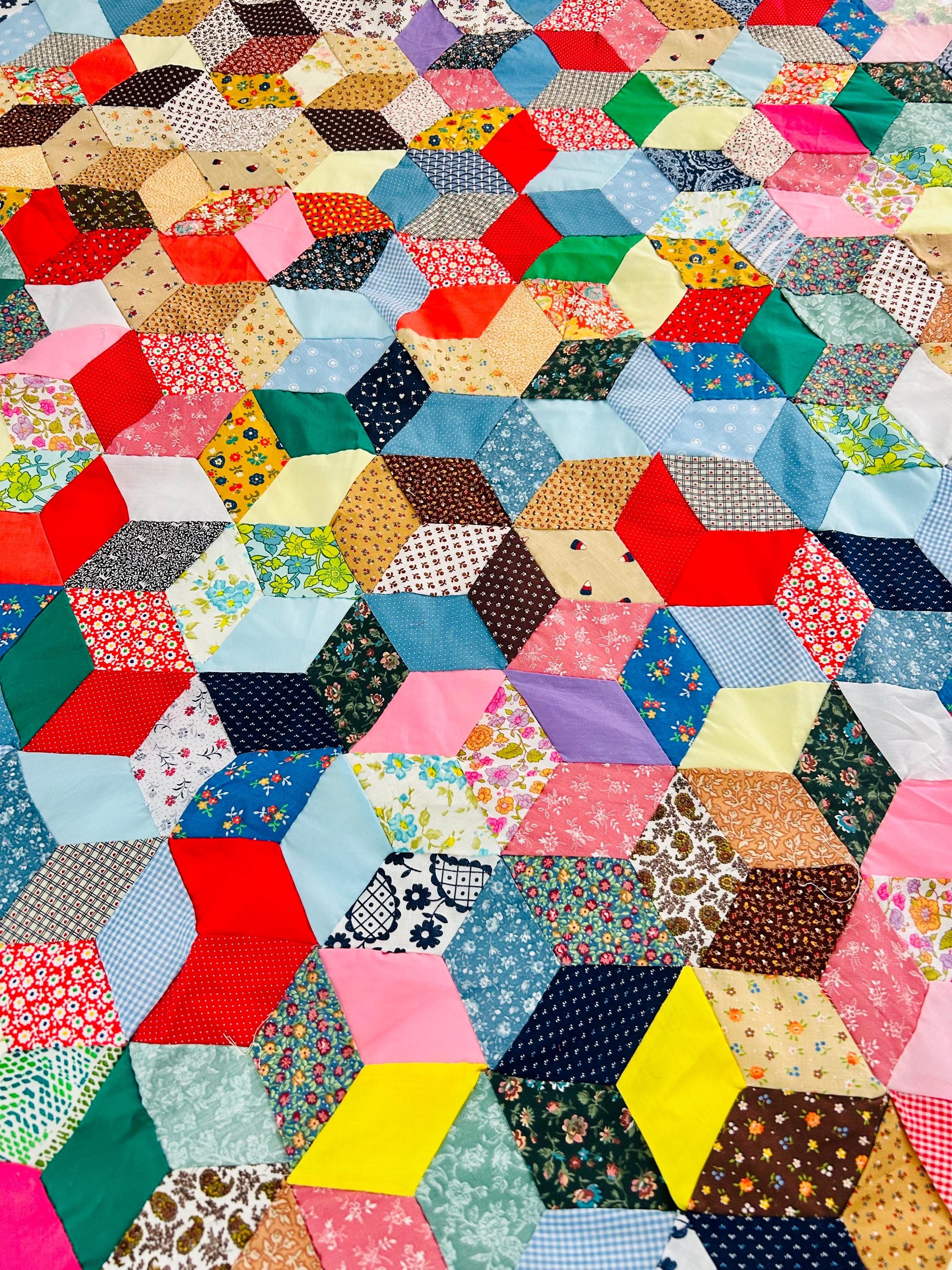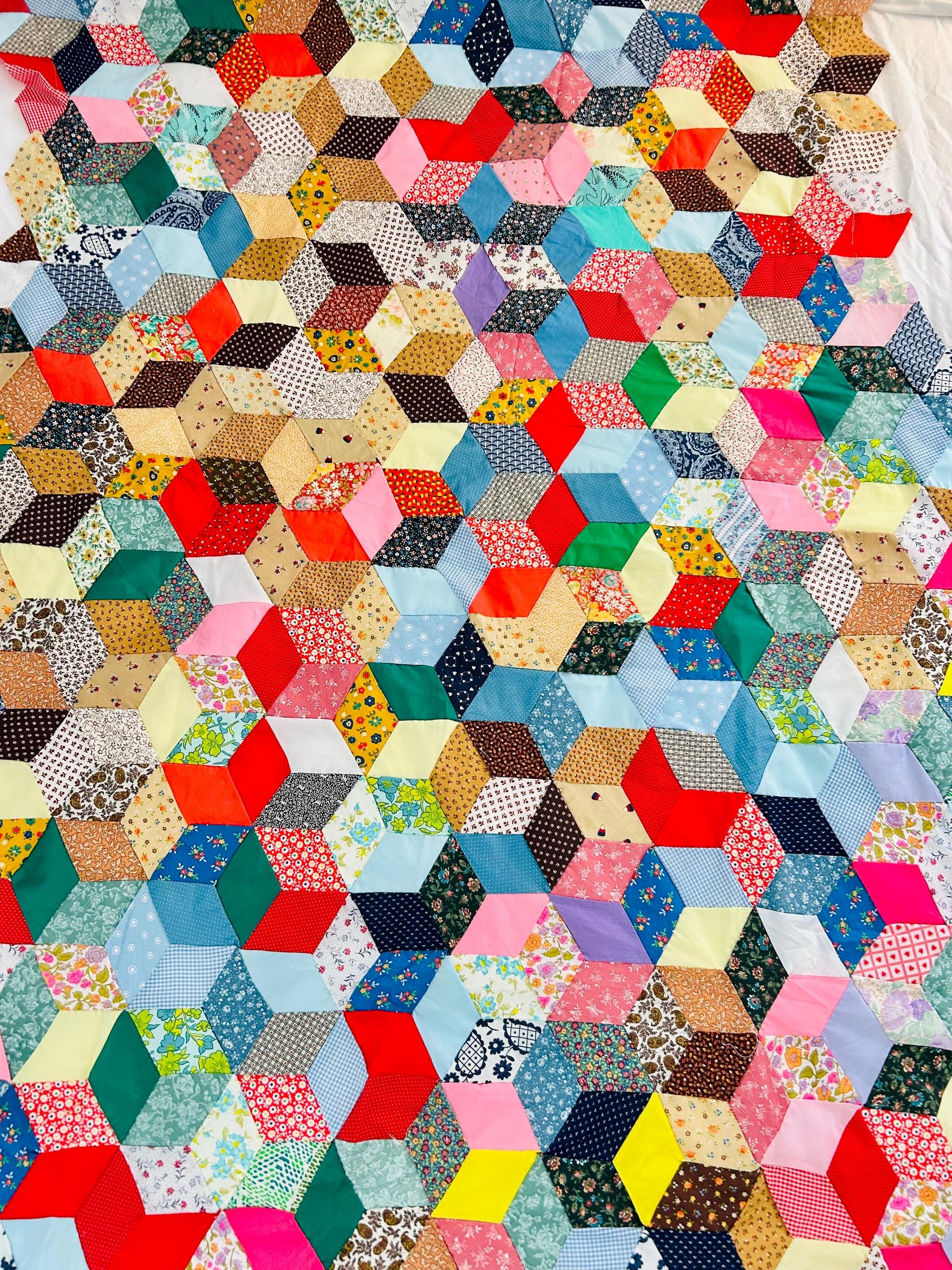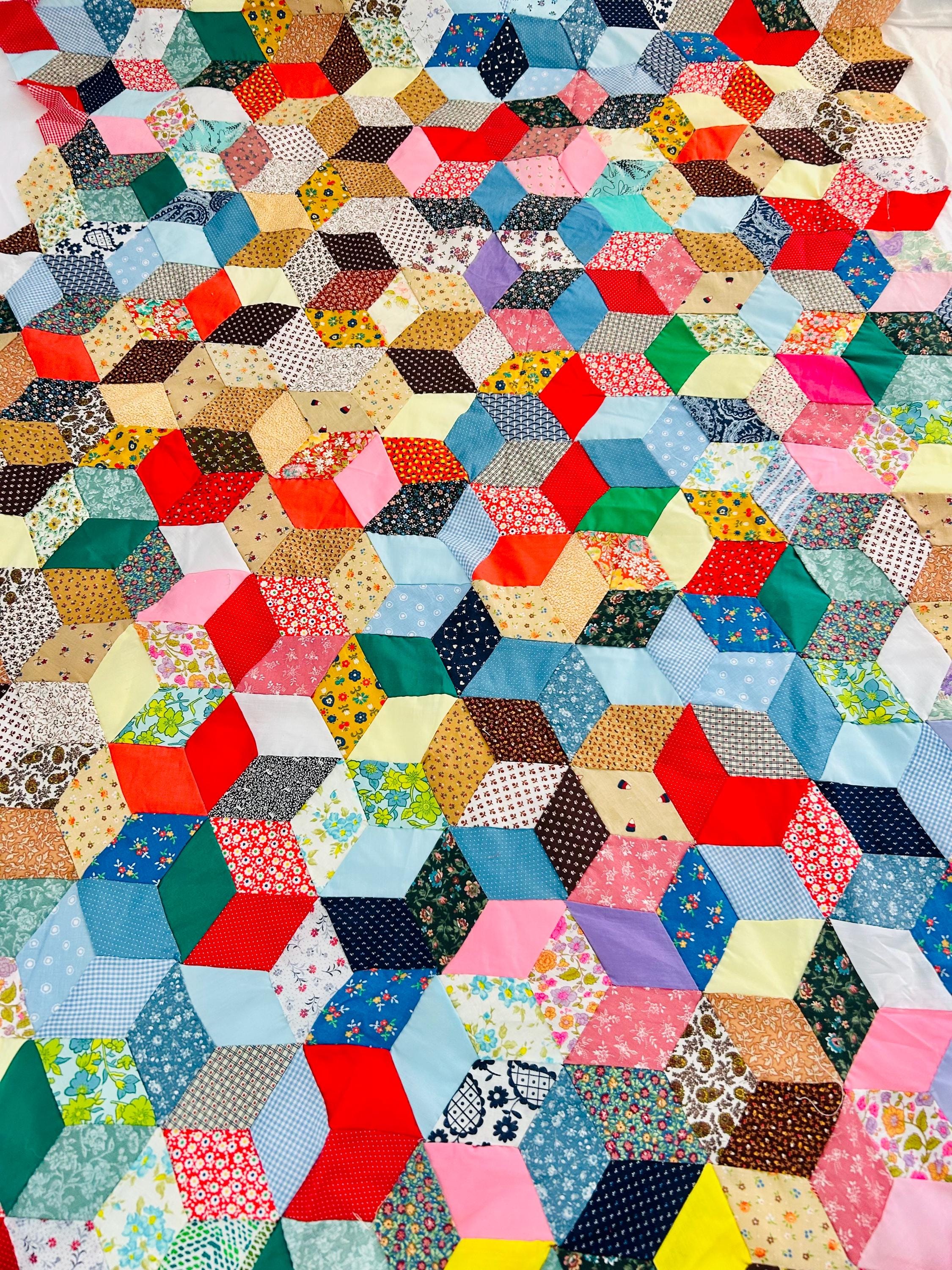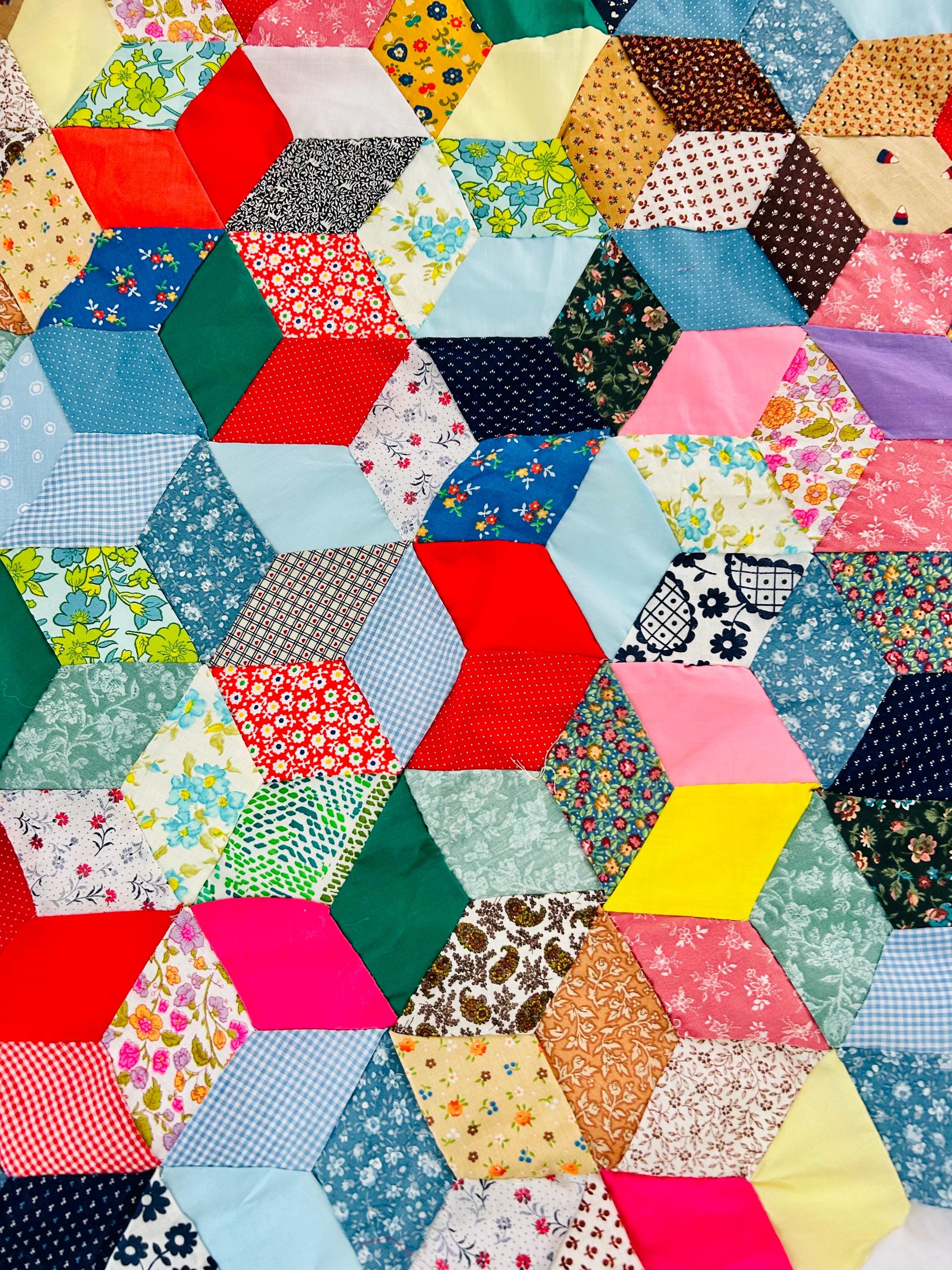 Details • Pattern: Tumbling Blocks (3-D Cube illusion) • Date: Circa 1940s–early 1950s • Size: 48” x 62” • Construction: Hand pieced • Materials: Cotton prints, many feedsack fabrics
