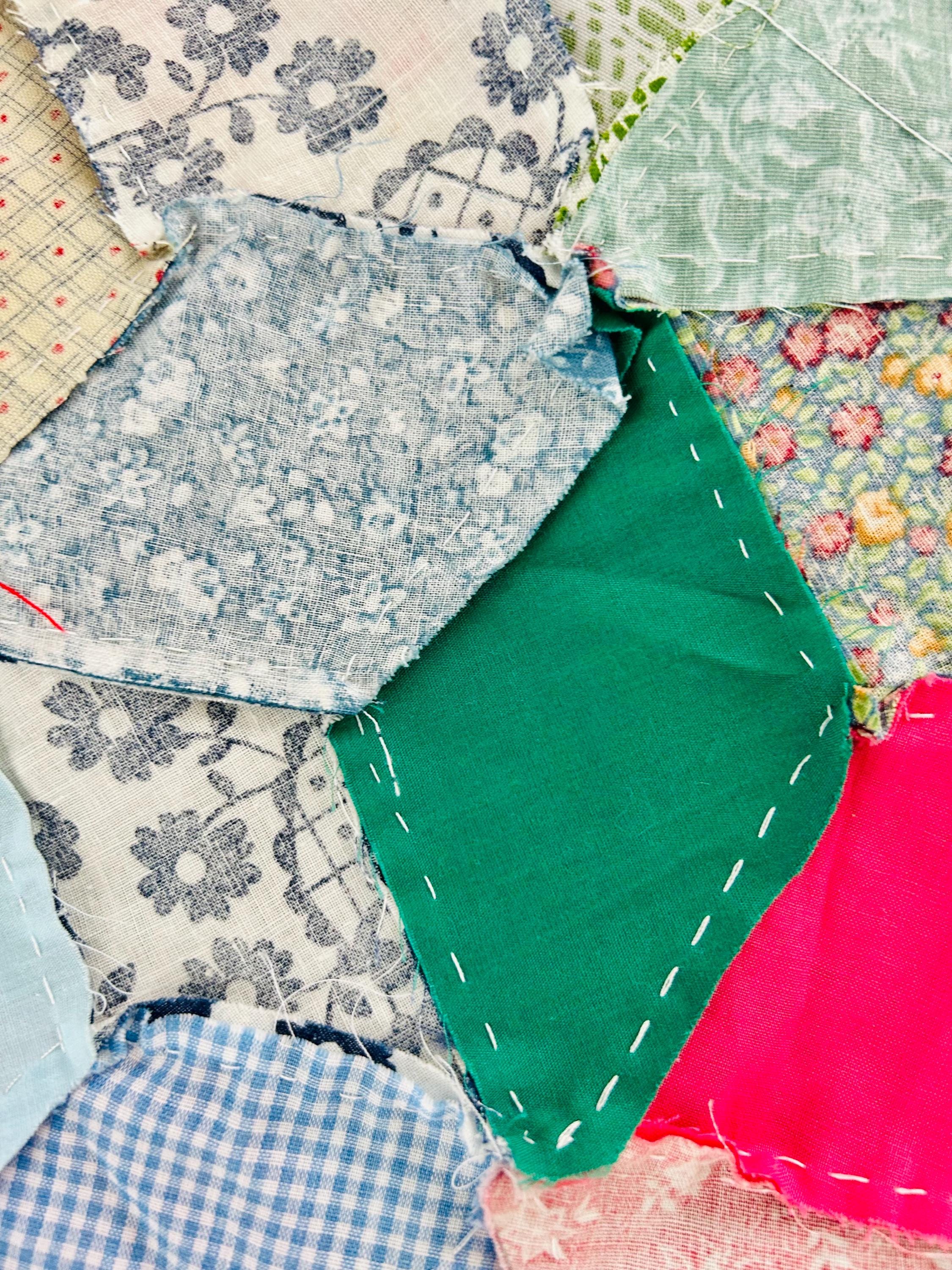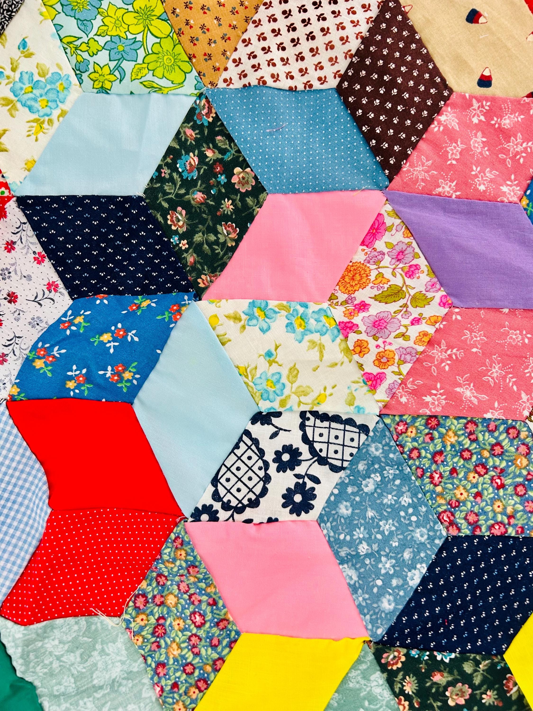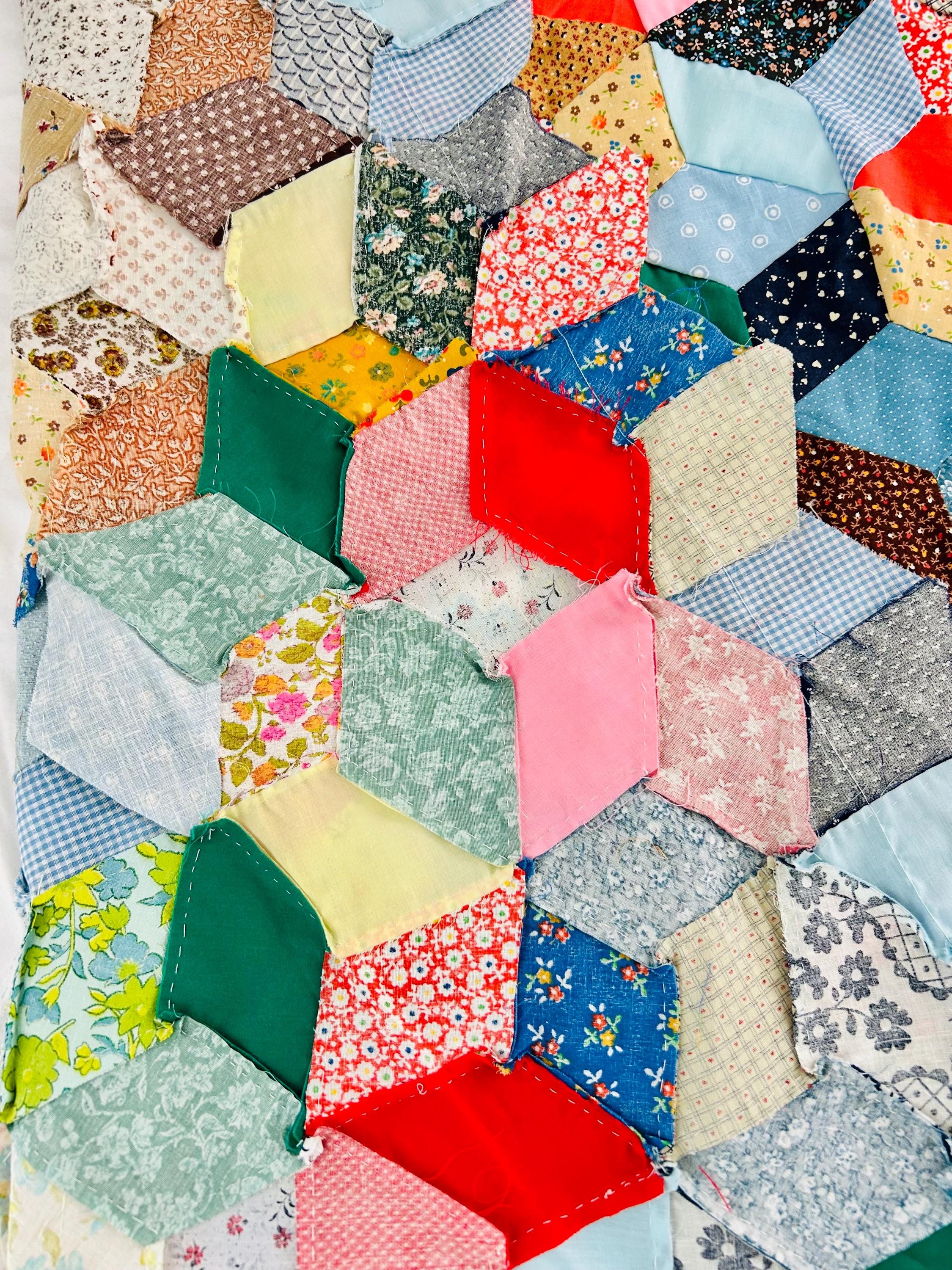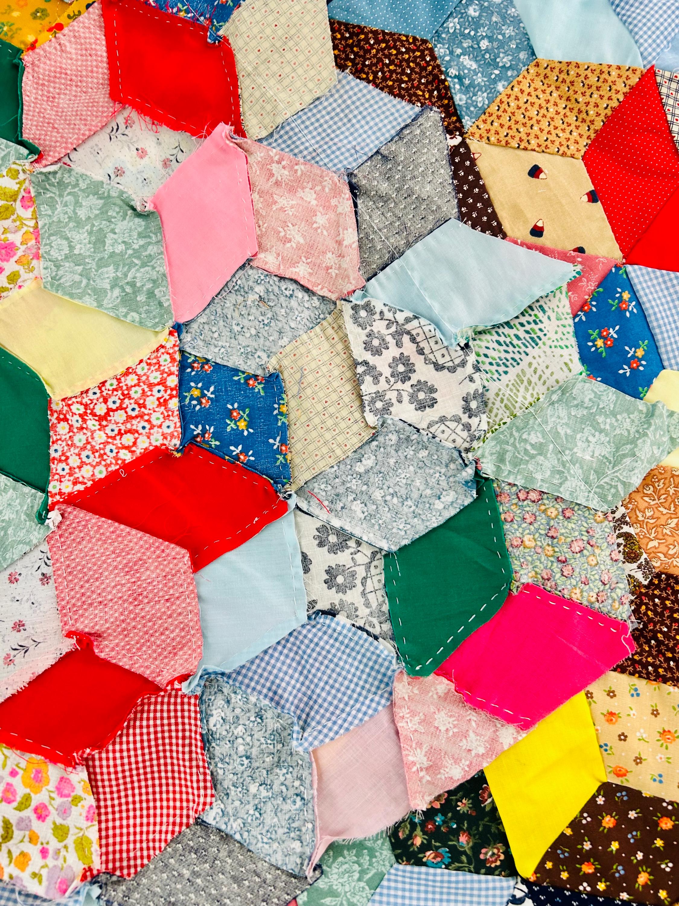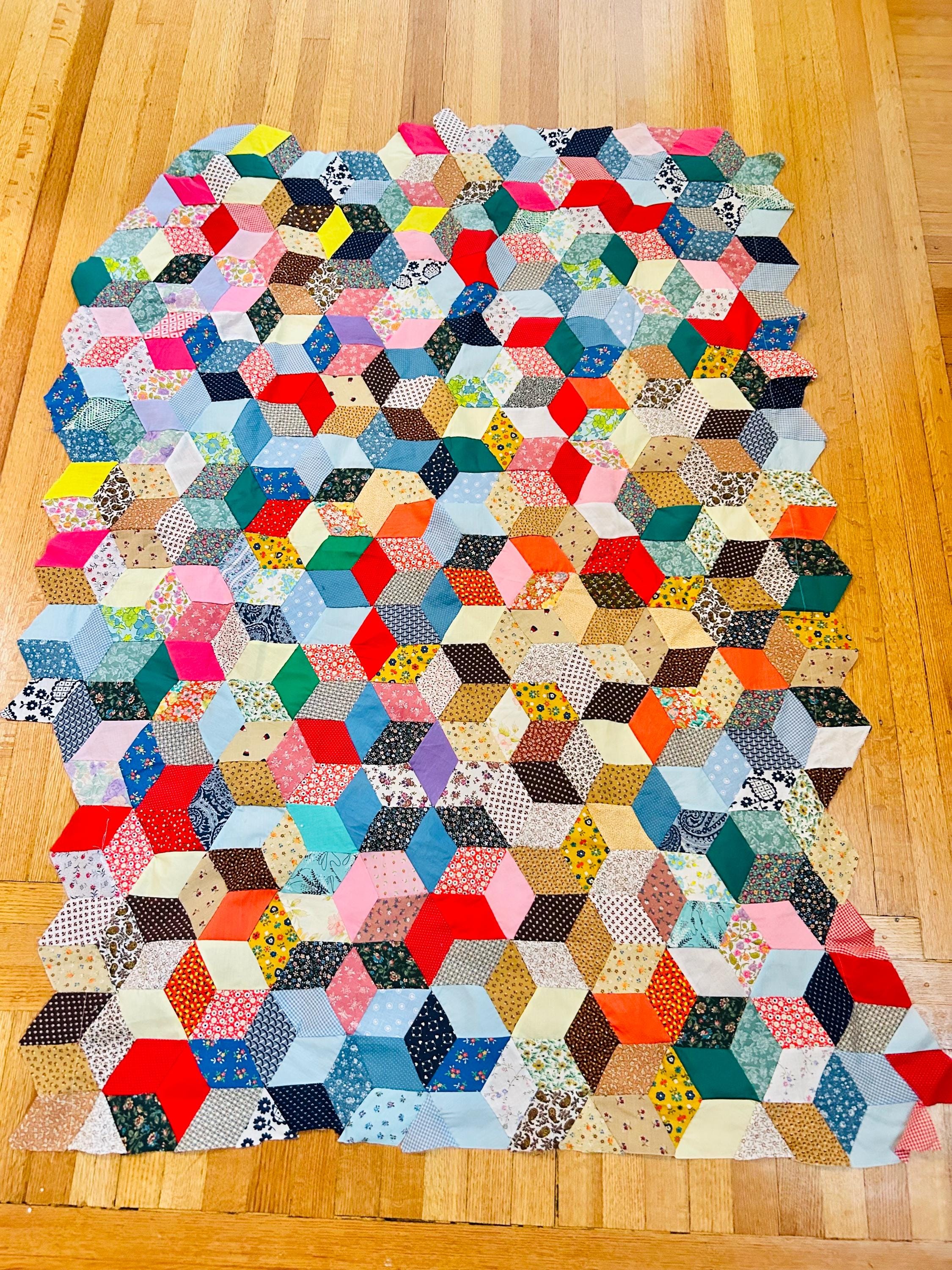 Details • Pattern: Tumbling Blocks (3-D Cube illusion) • Date: Circa 1940s–early 1950s • Size: 48” x 62” • Construction: Hand pieced • Materials: Cotton prints, many feedsack fabrics
