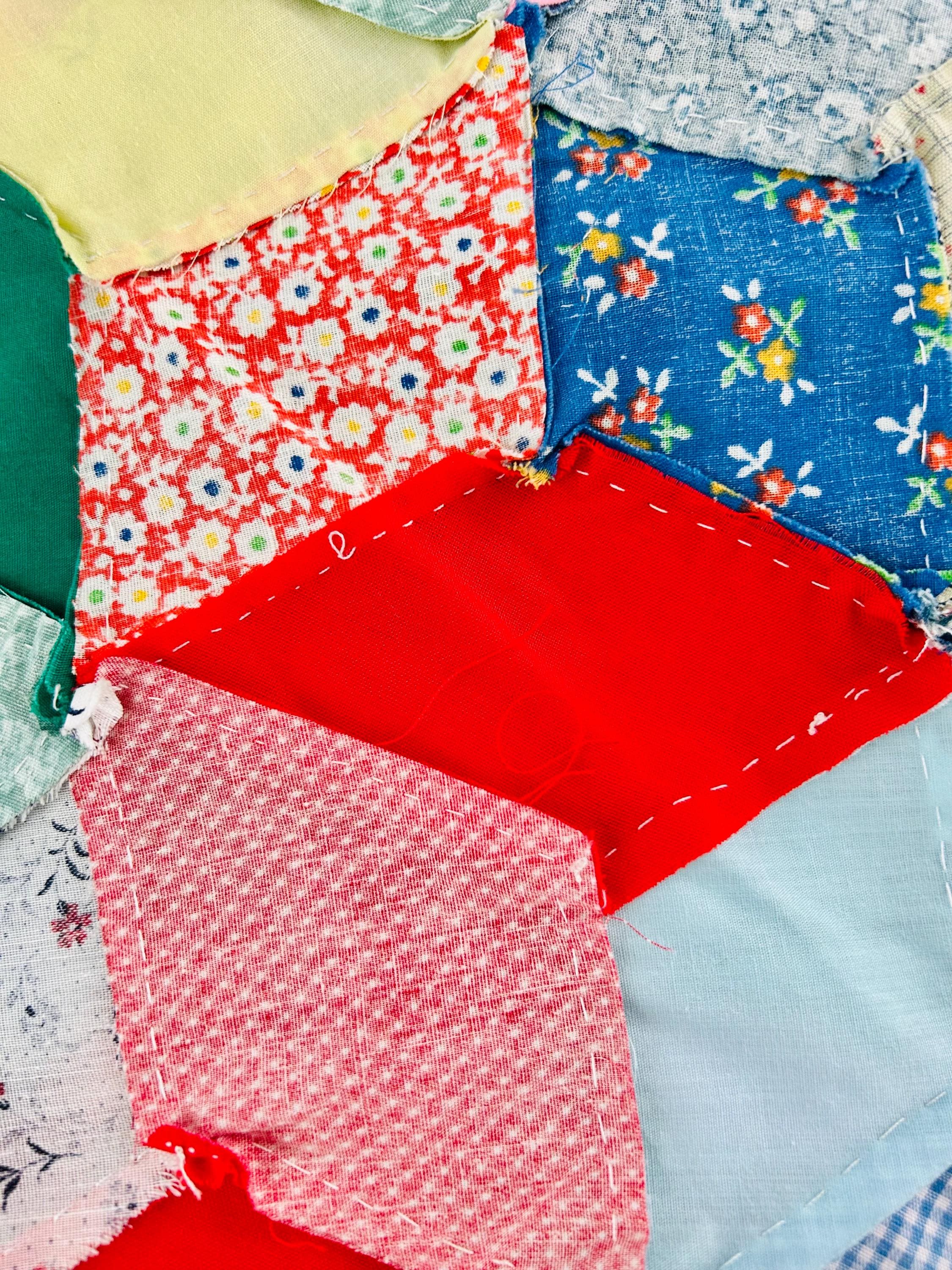 This cheerful mid-century Tumbling Blocks quilt top is from the 1940s–early 1950s and has been hand pieced from a beautiful variety of period cotton prints, including feed sack florals, tiny geometric shirtings, ditsy prints, and bright solid accents. There is a lively mix of cadet blues, cherry reds, butter yellows, pinks, and soft aquas, all used to create the striking 3-D cube illusion that is the tumbling blocks pattern.