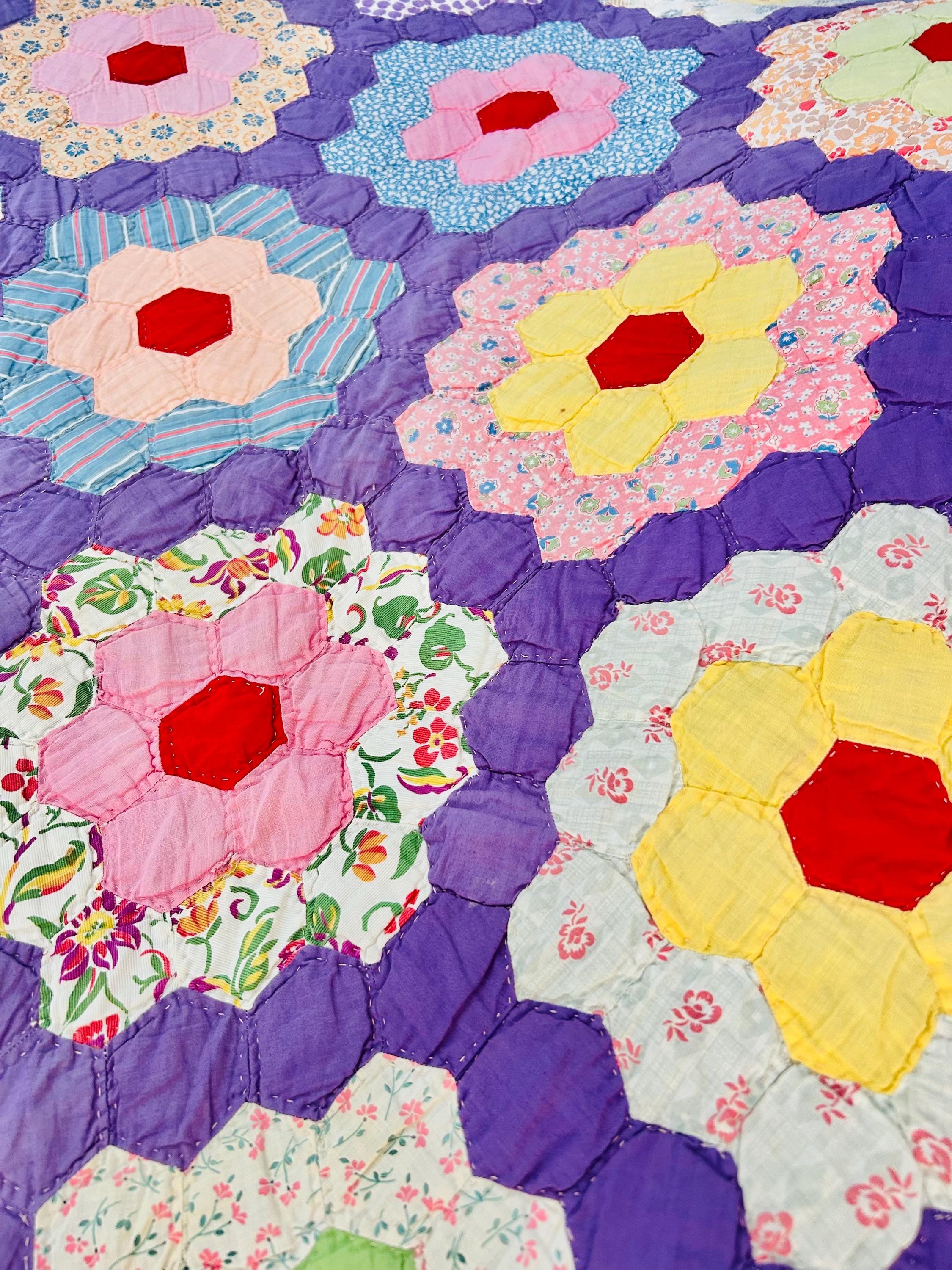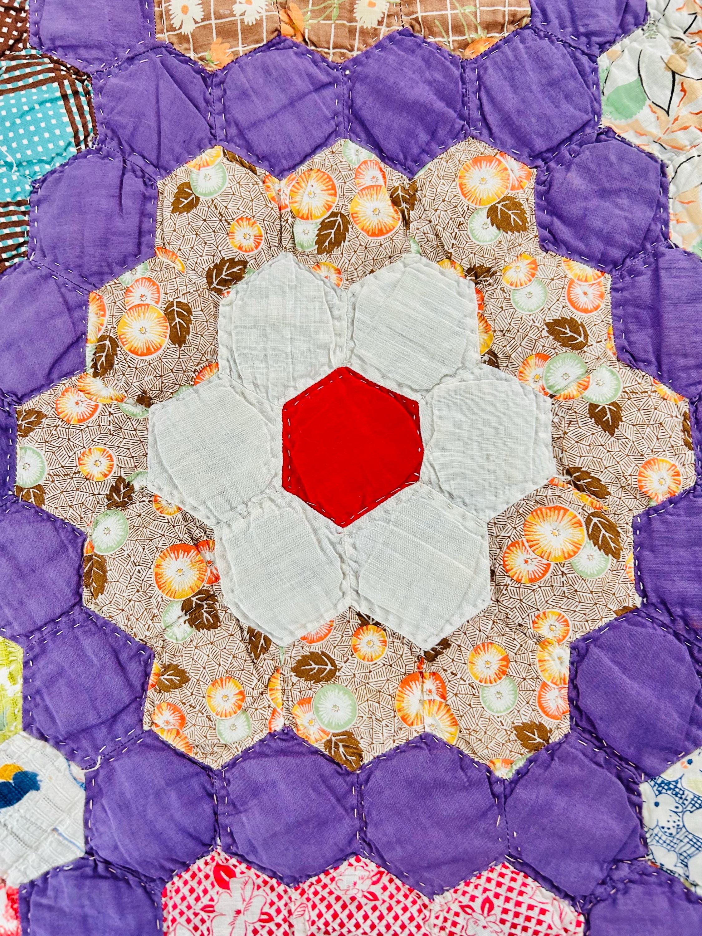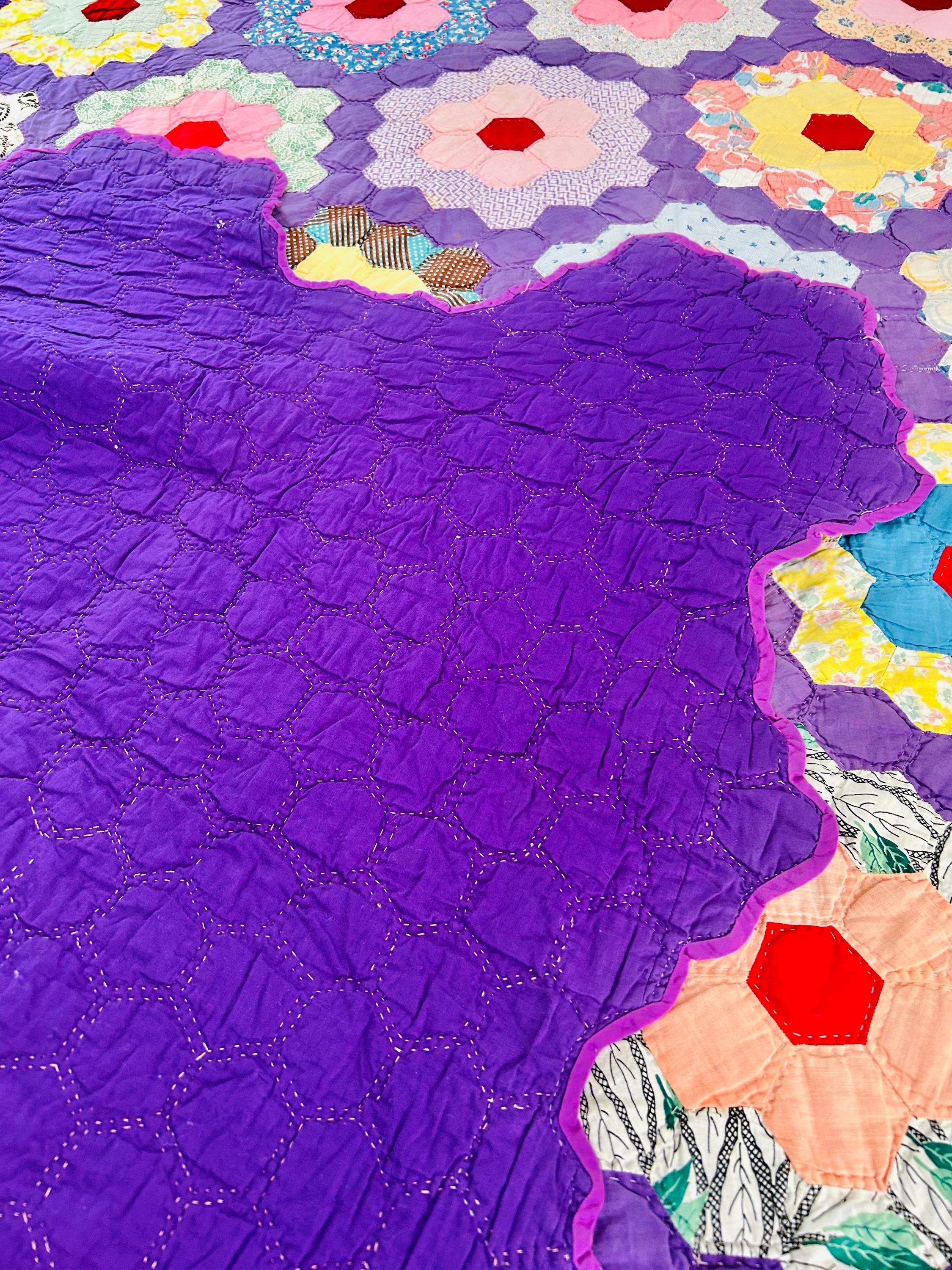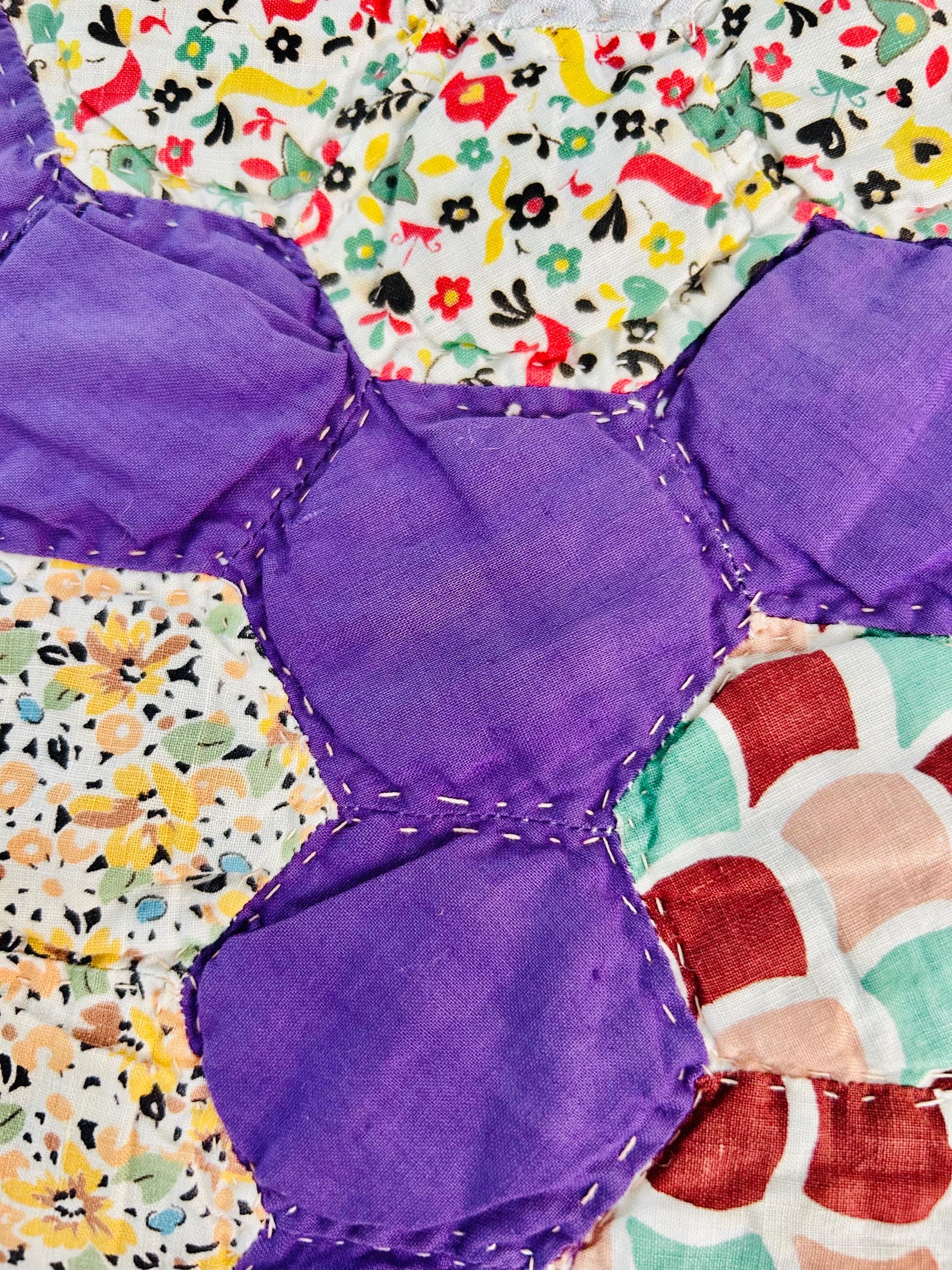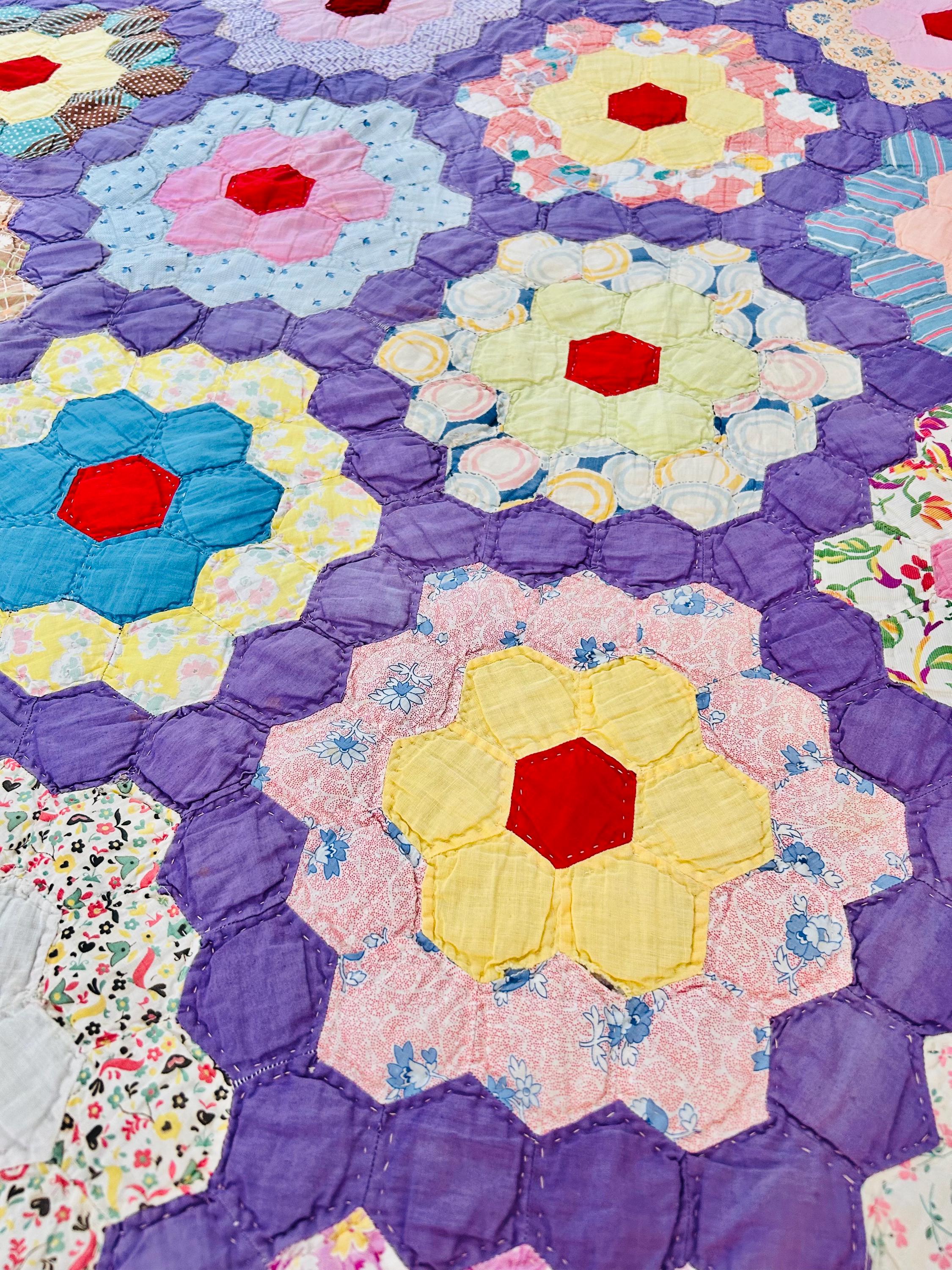 This beautiful vintage Grandmother’s Flower Garden quilt was hand pieced and hand quilted during the late Depression era, circa 1930s-1940s. The cheerful palette and small-scale 1930s prints make this a classic example of an authentic Depression-era hexagon quilt. The gardens feature vibrant red hexagon centers surrounded by soft florals, ginghams, shirtings, and conversation prints, all set against a striking solid purple path. The hand-quilting is in outlines of the hundreds of hexagons.