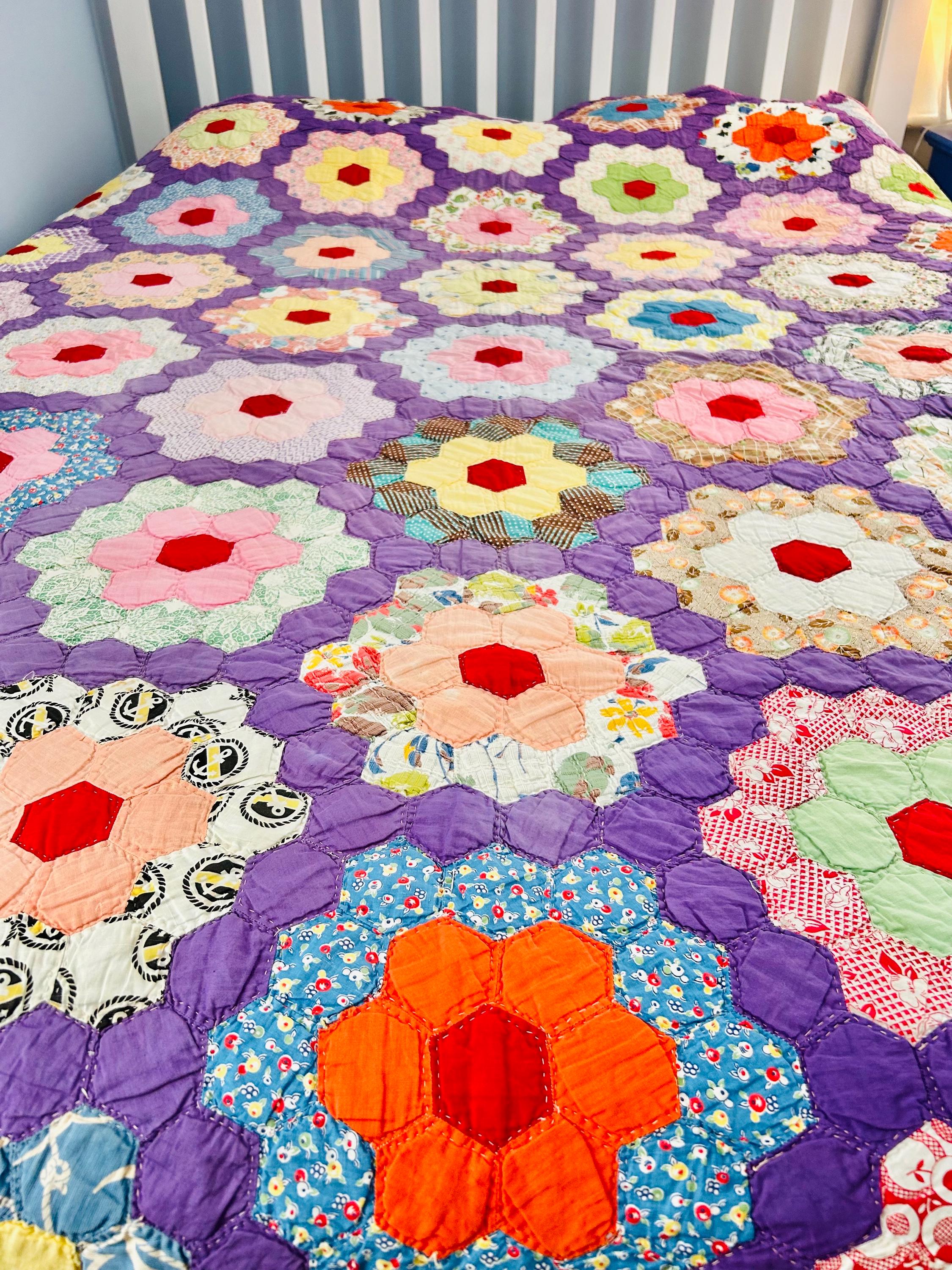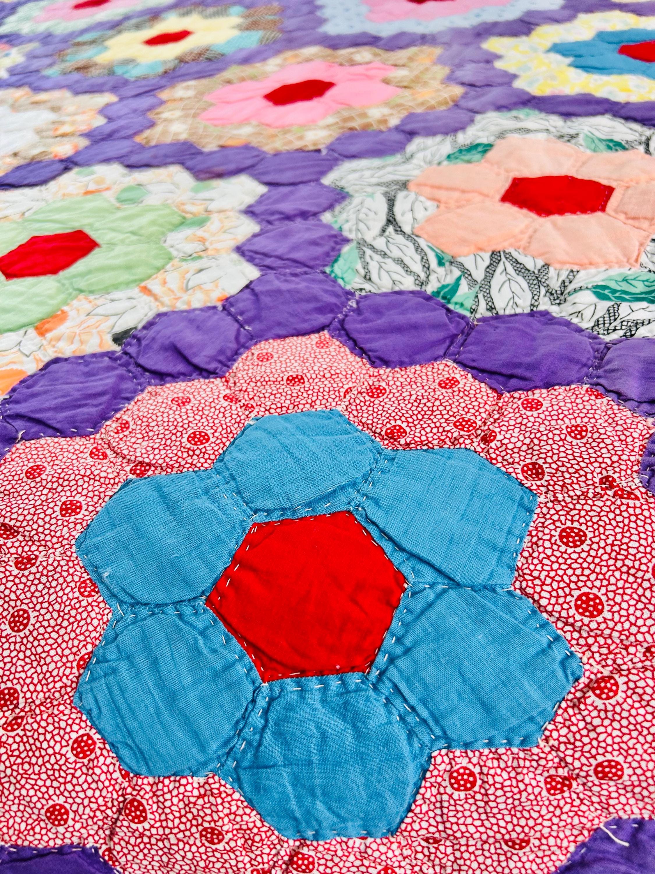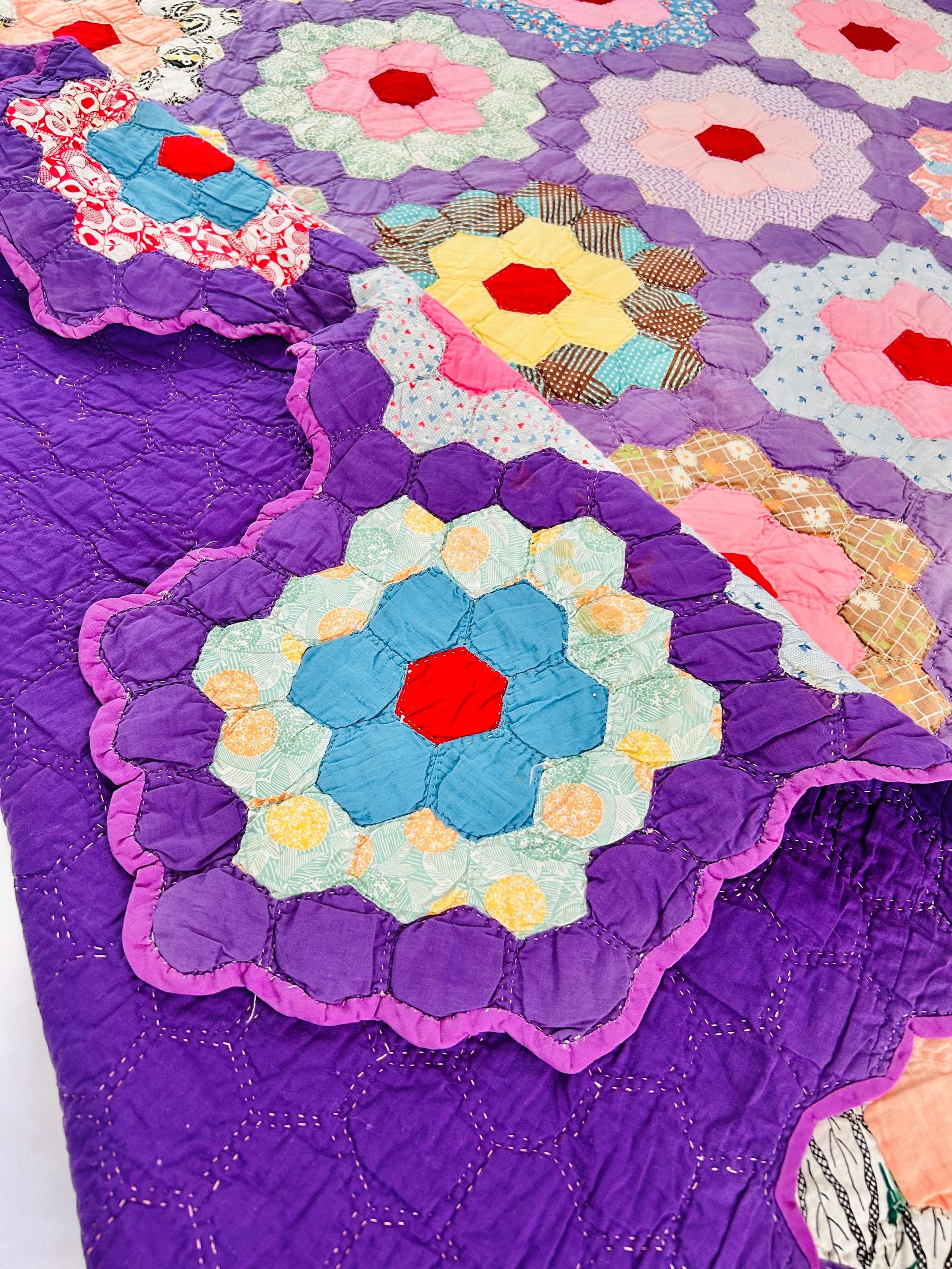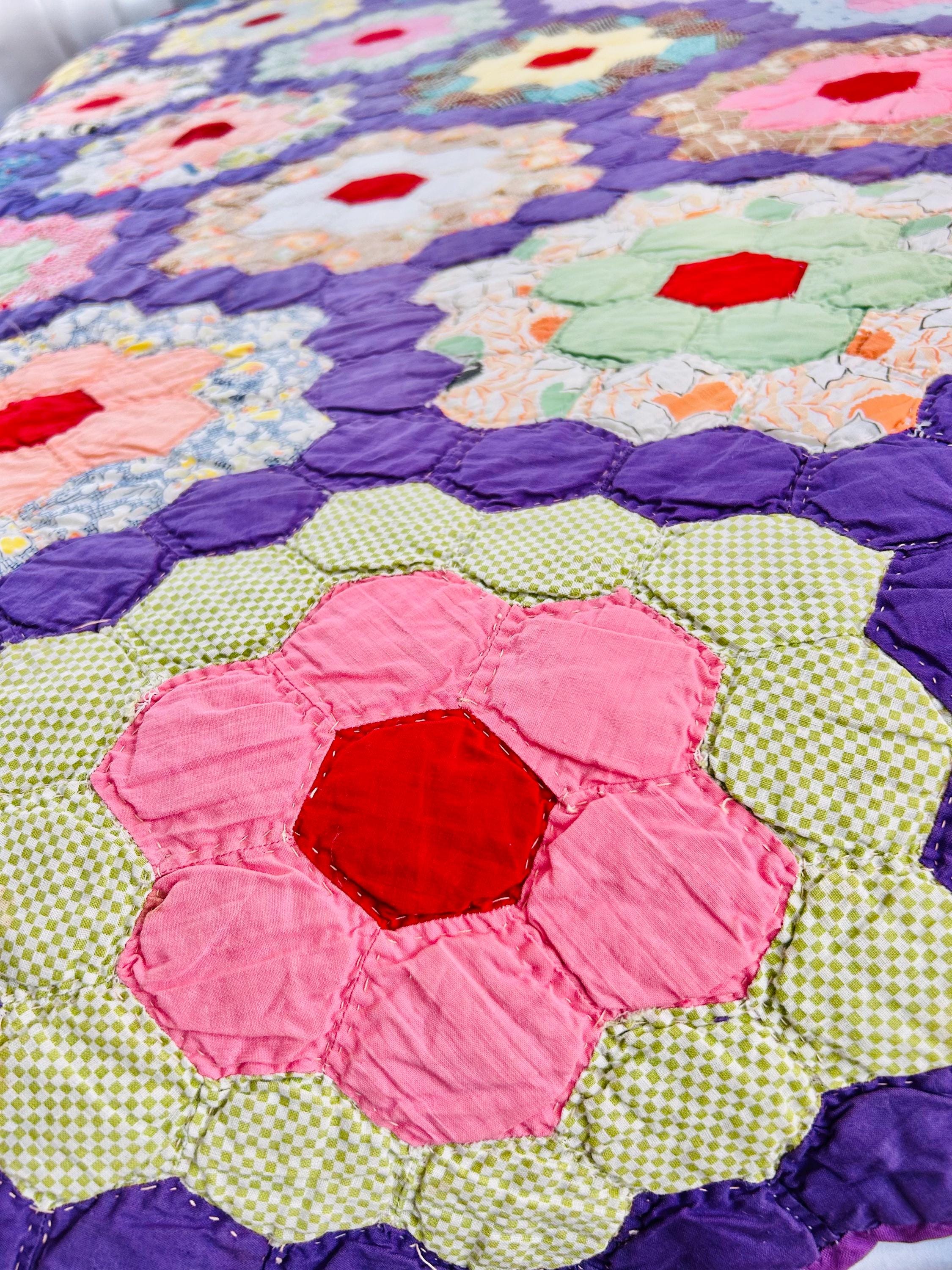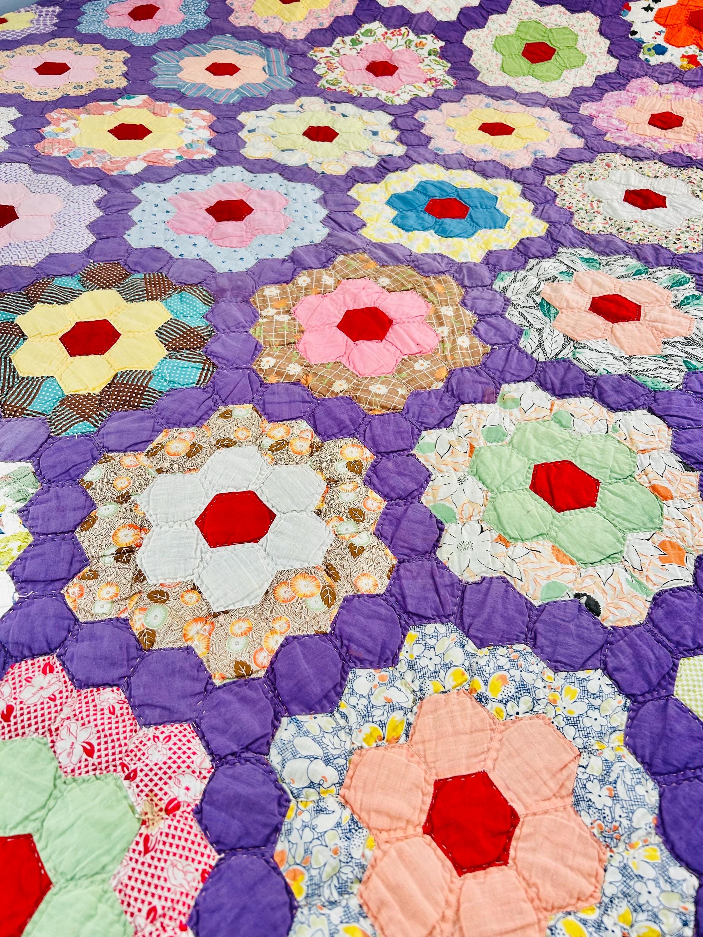 This beautiful vintage Grandmother’s Flower Garden quilt was hand pieced and hand quilted during the late Depression era, circa 1930s-1940s. The cheerful palette and small-scale 1930s prints make this a classic example of an authentic Depression-era hexagon quilt. The gardens feature vibrant red hexagon centers surrounded by soft florals, ginghams, shirtings, and conversation prints, all set against a striking solid purple path. The hand-quilting is in outlines of the hundreds of hexagons.