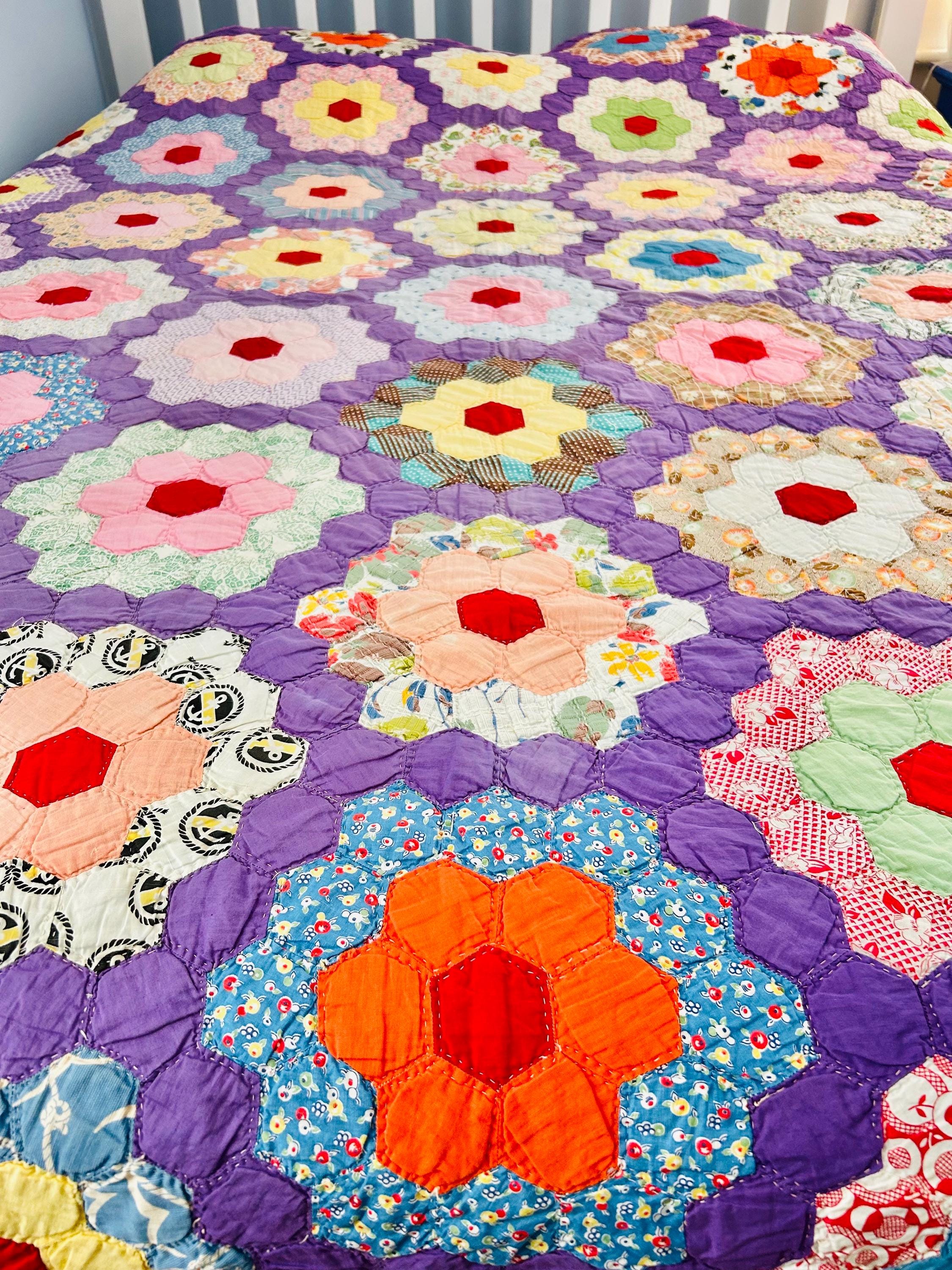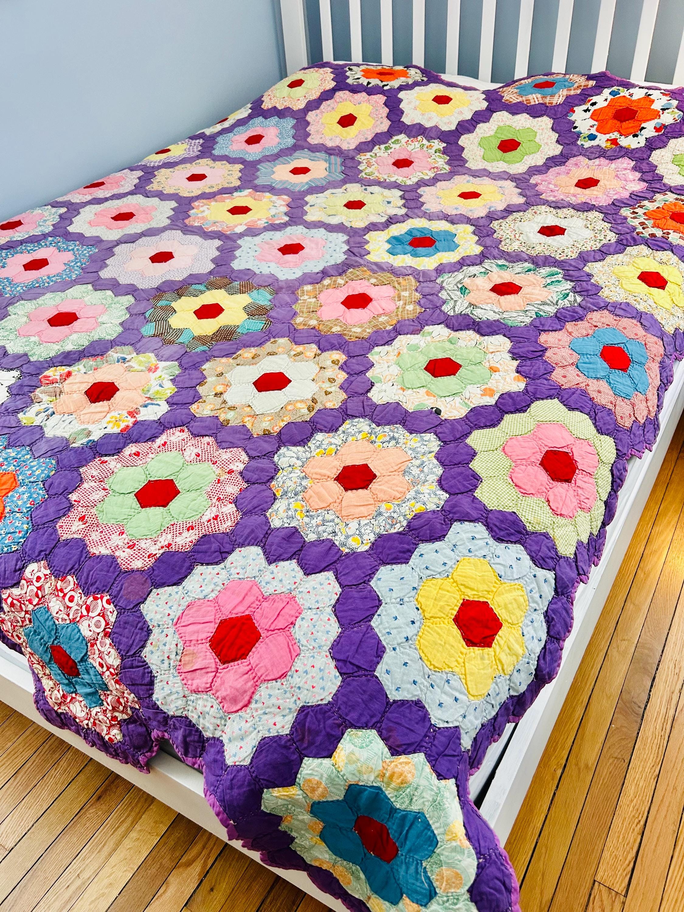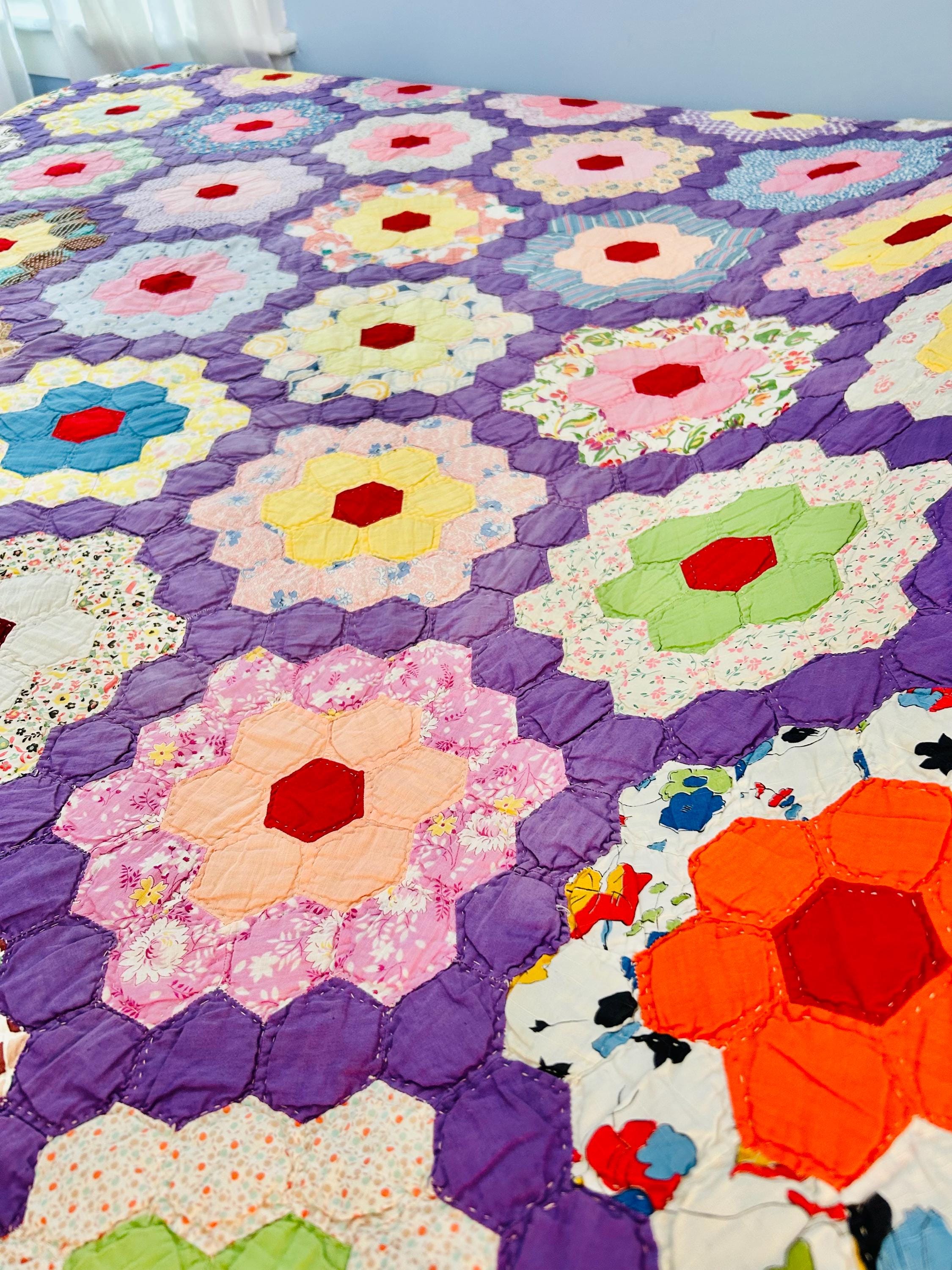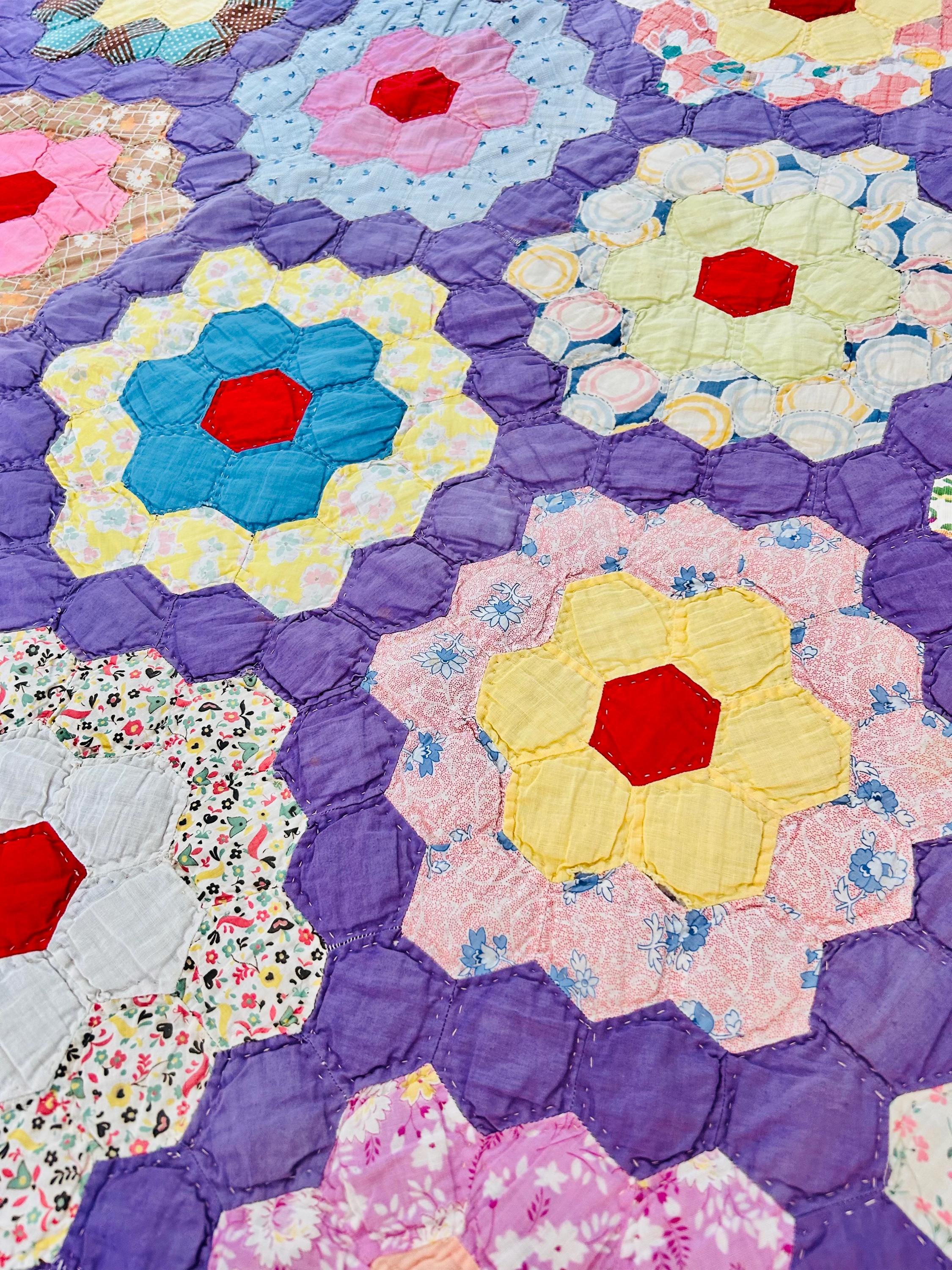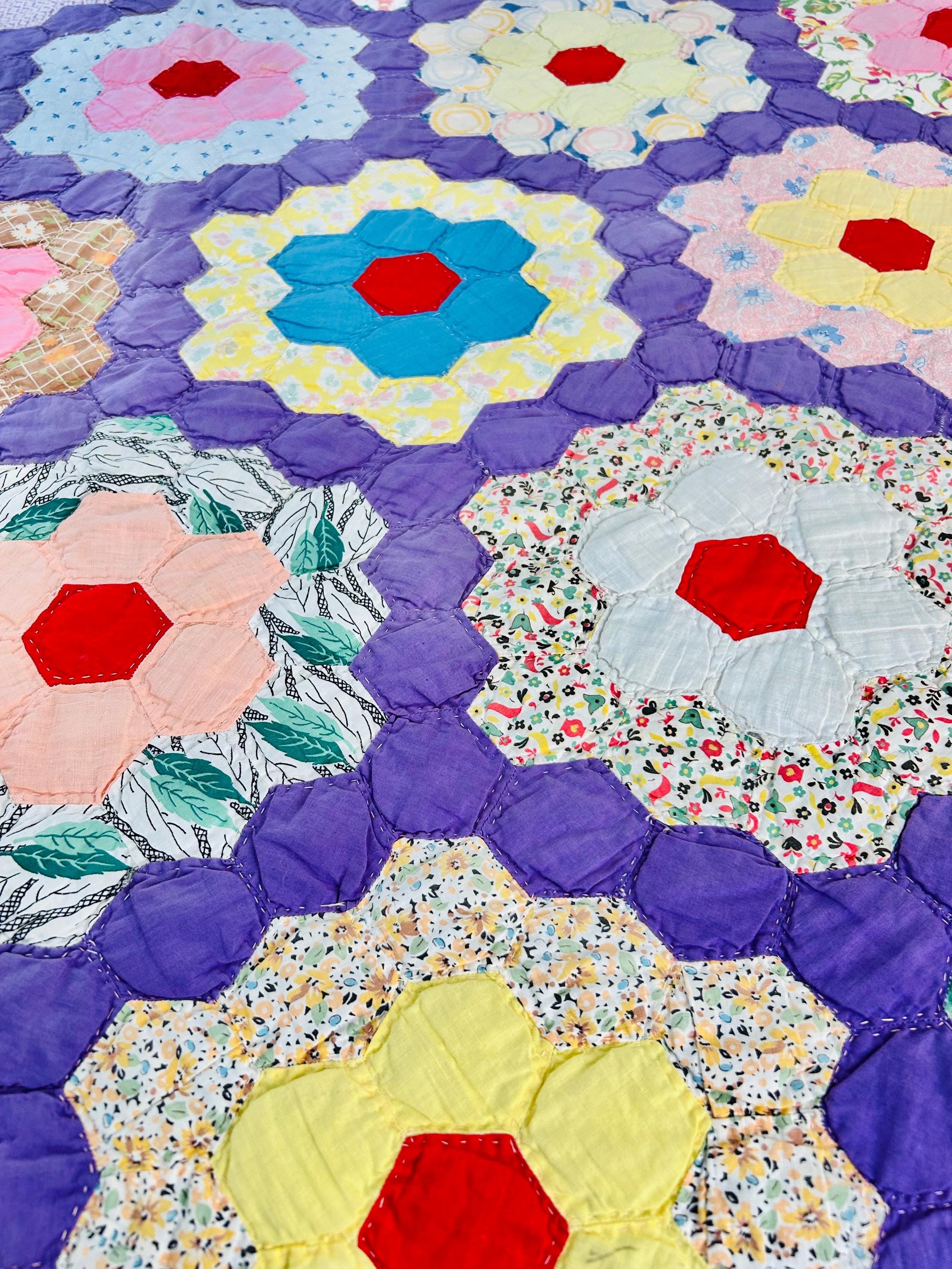This beautiful vintage Grandmother’s Flower Garden quilt was hand pieced and hand quilted during the late Depression era, circa 1930s-1940s. The cheerful palette and small-scale 1930s prints make this a classic example of an authentic Depression-era hexagon quilt. The gardens feature vibrant red hexagon centers surrounded by soft florals, ginghams, shirtings, and conversation prints, all set against a striking solid purple path. The hand-quilting is in outlines of the hundreds of hexagons.