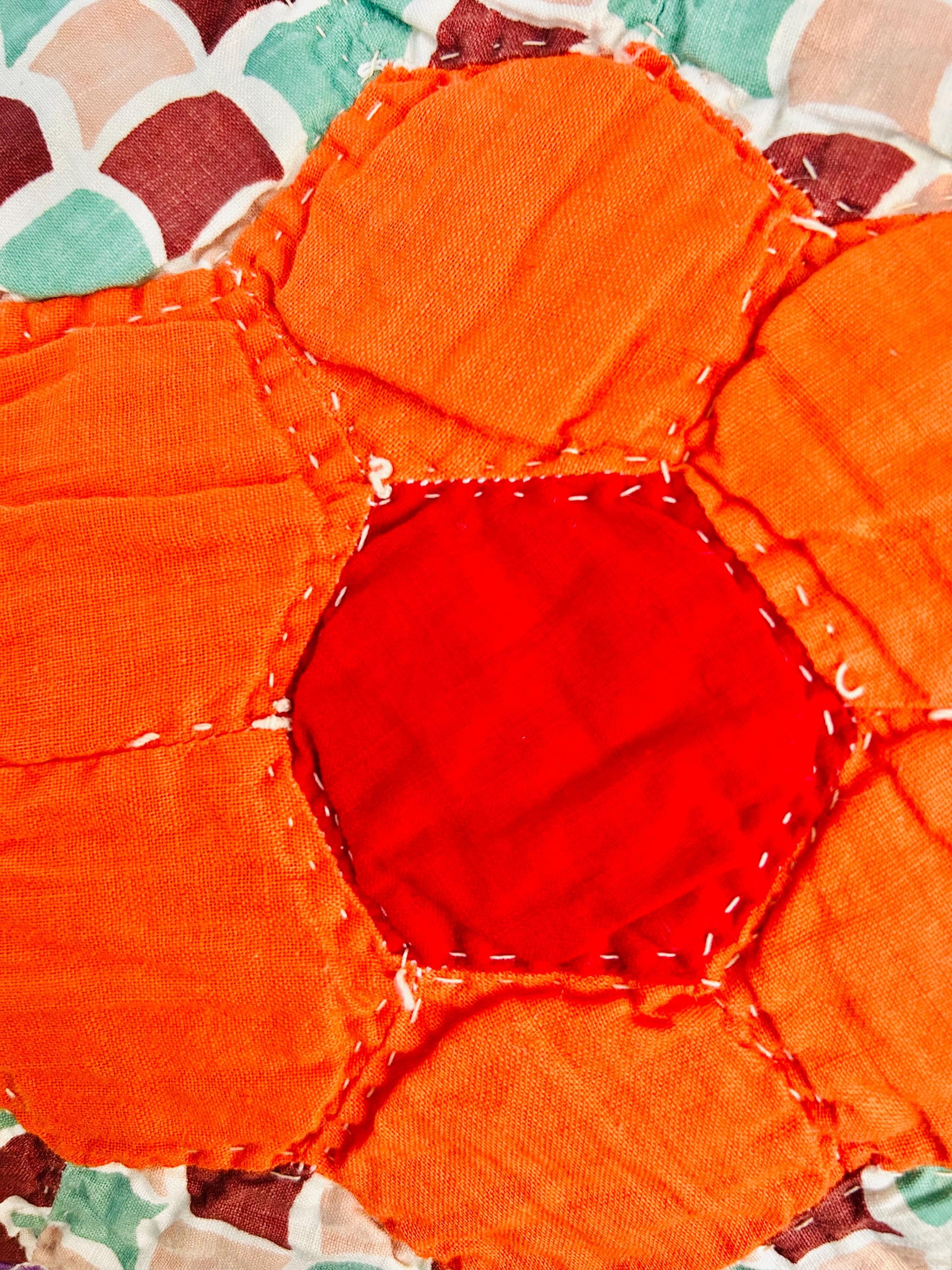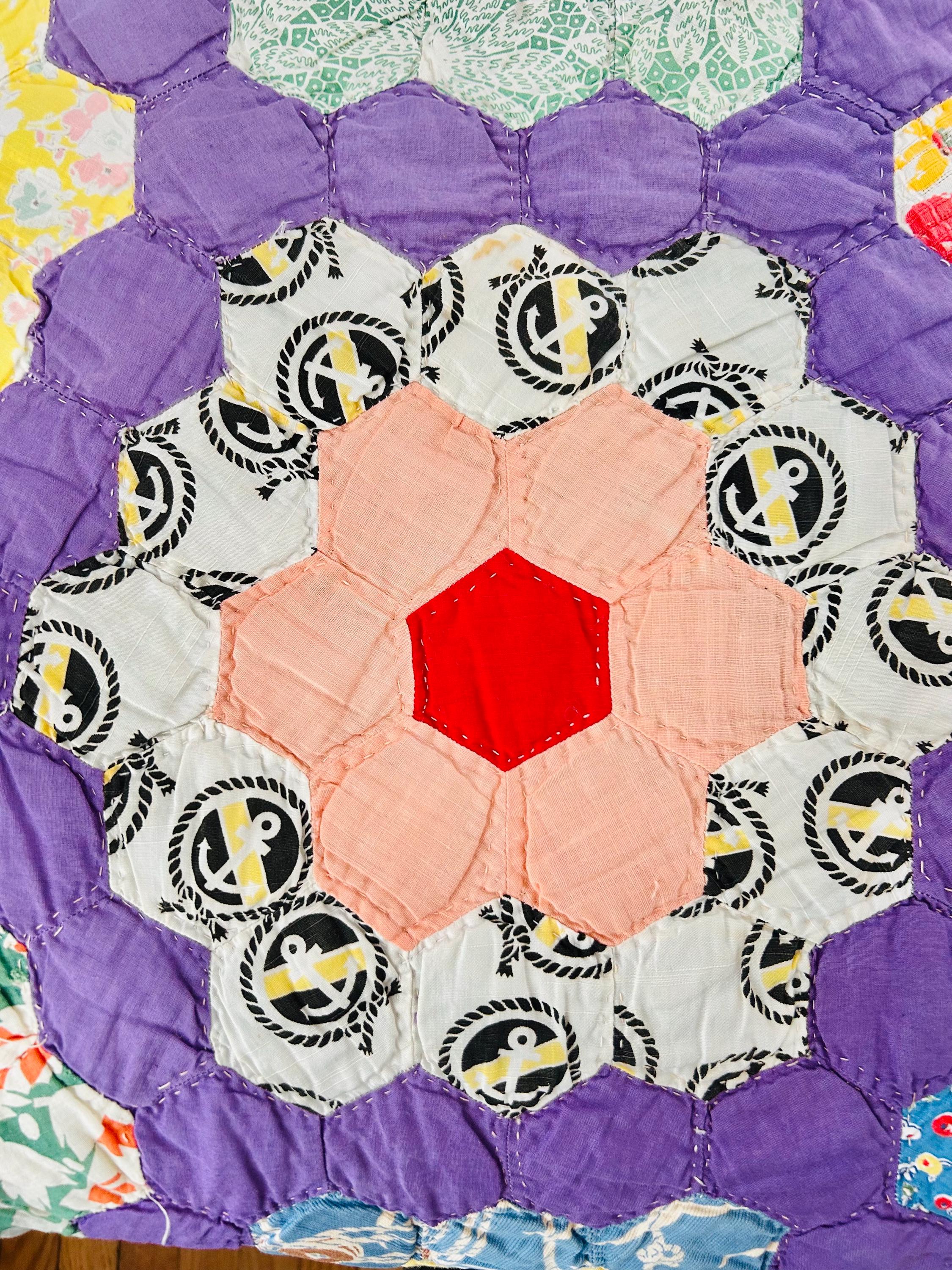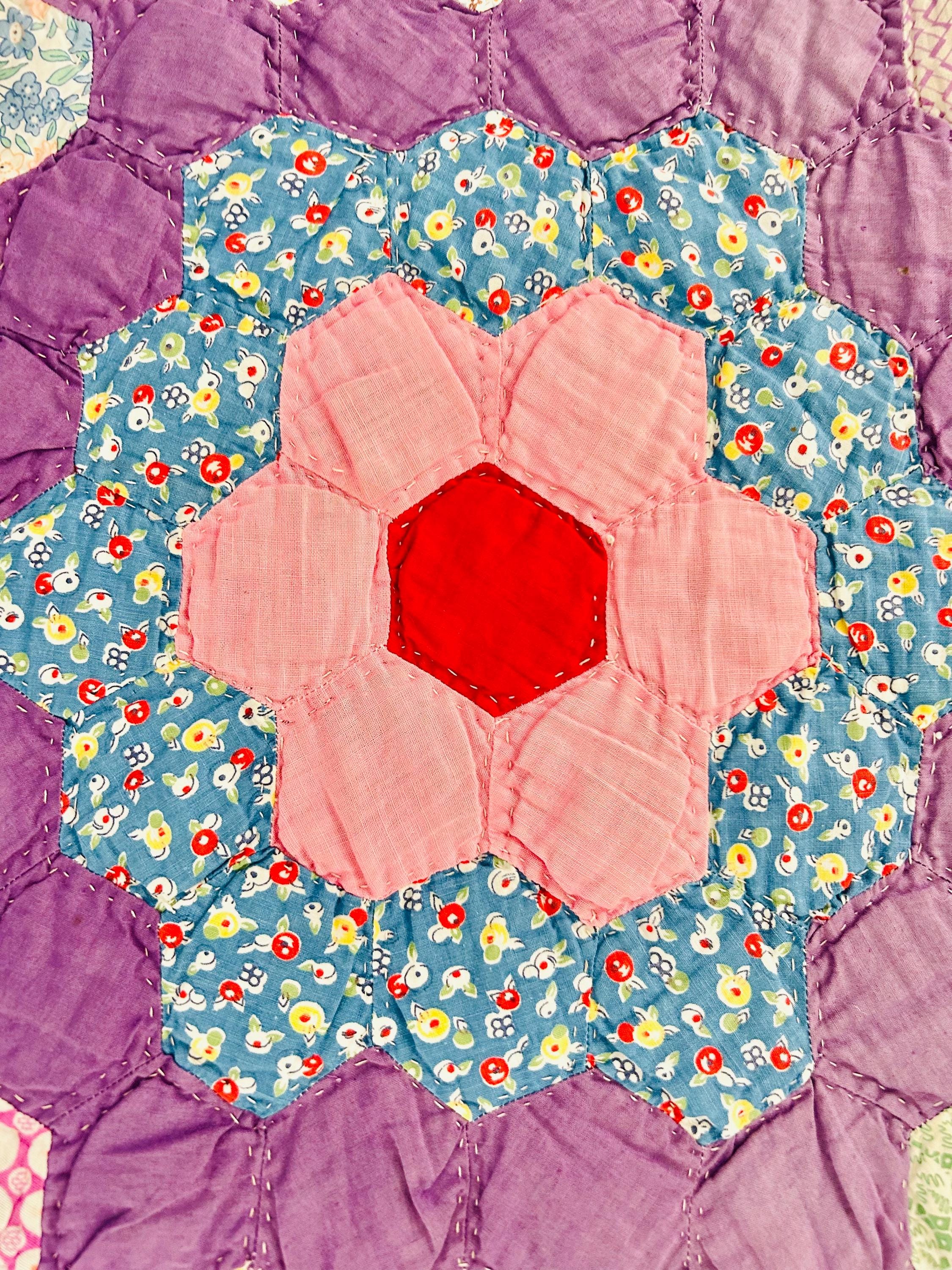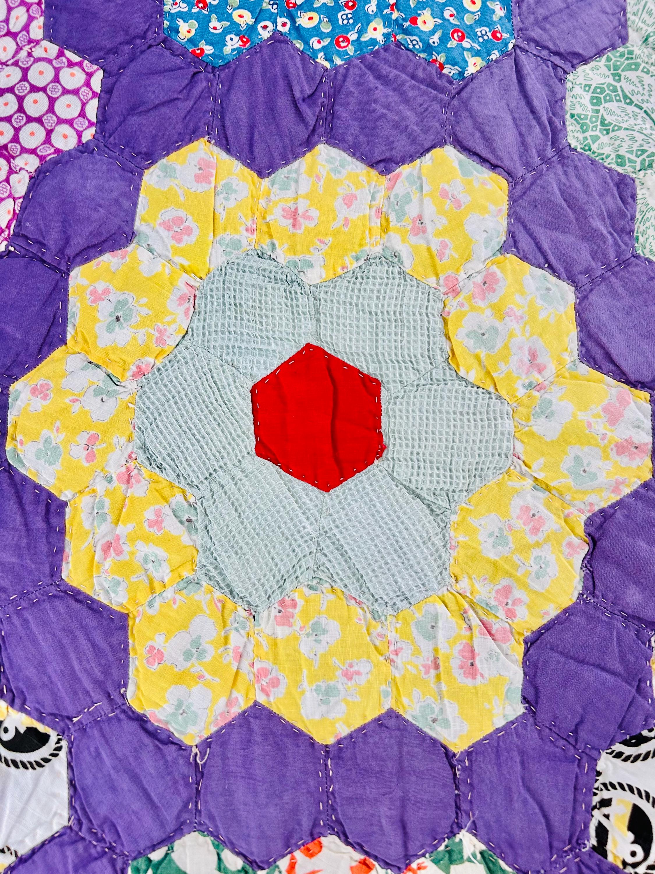 • Pattern: Grandmother’s Flower Garden • Age: 1930s • Size: 70"x86" • Era: Late Depression / early WWII era • Construction: Hand-pieced and hand-quilted • Materials: Cotton fabrics; lightweight cotton batting