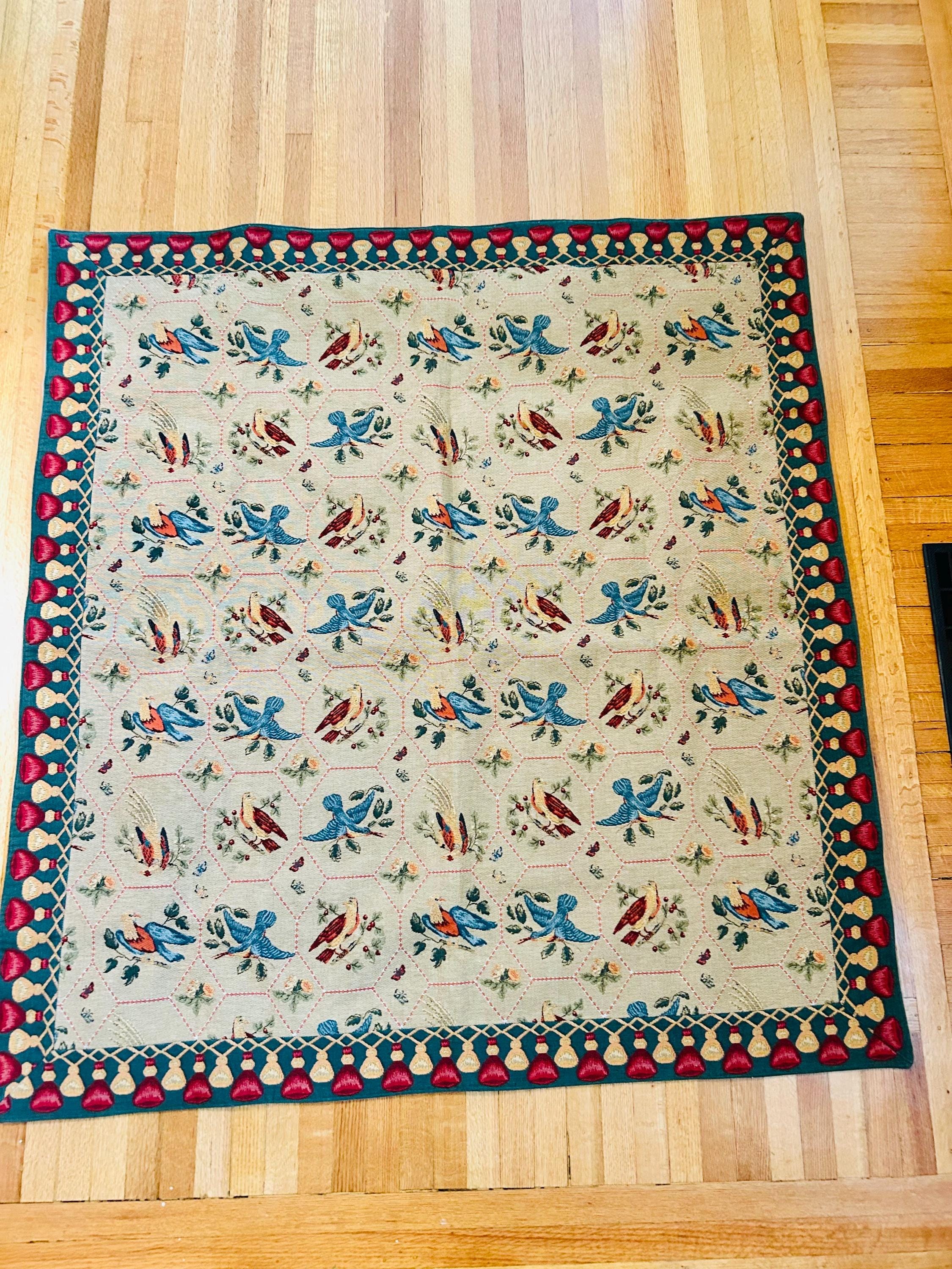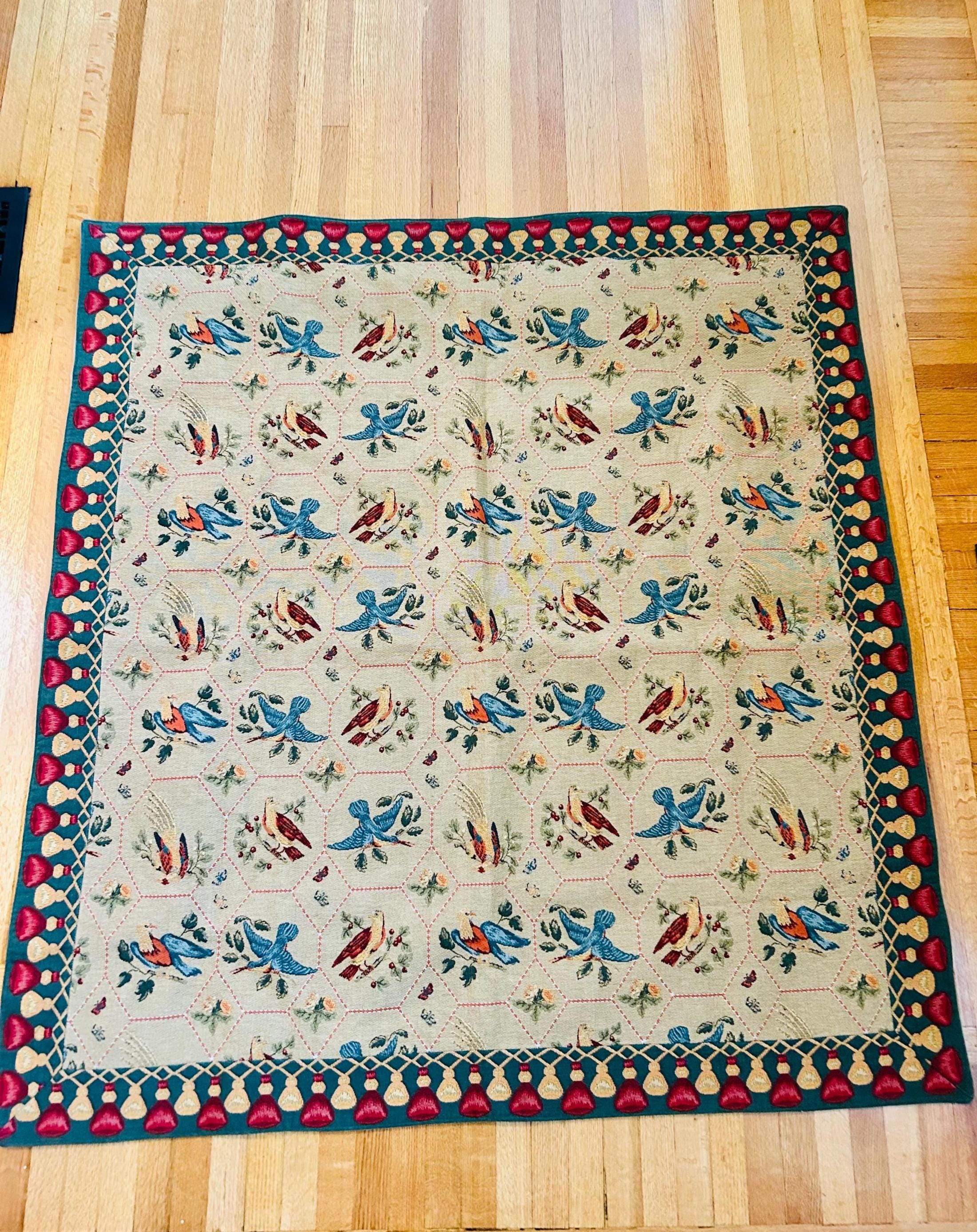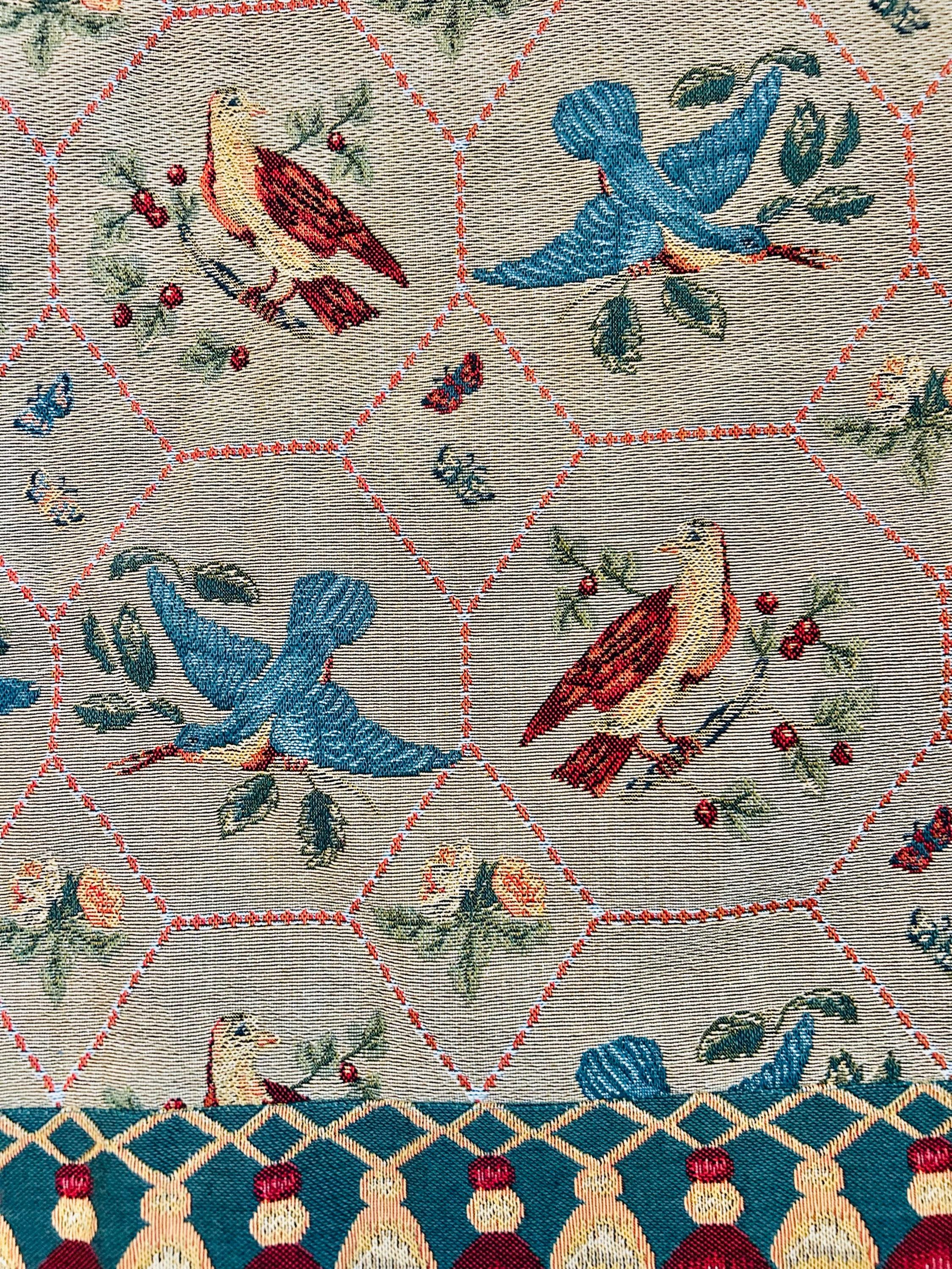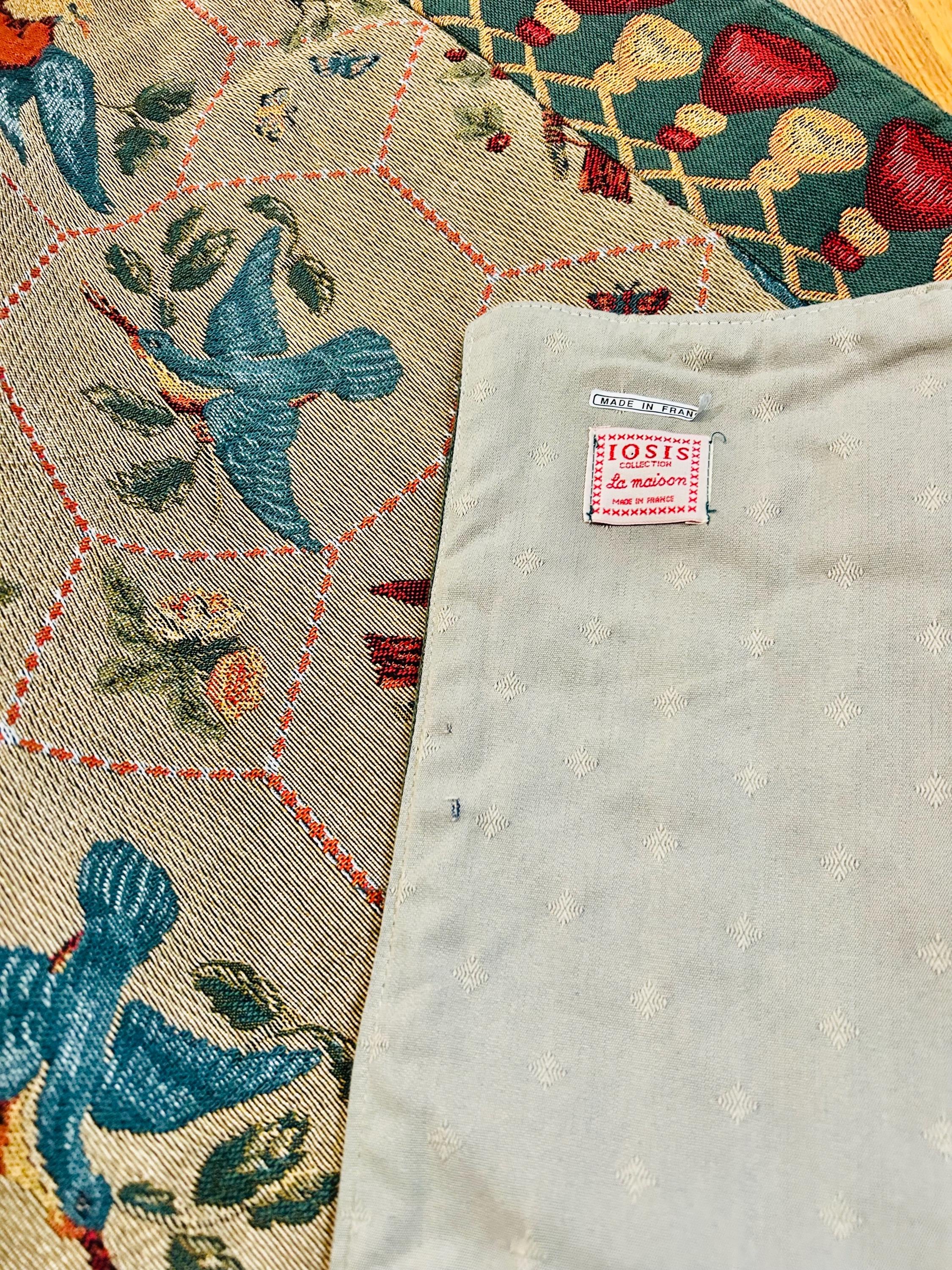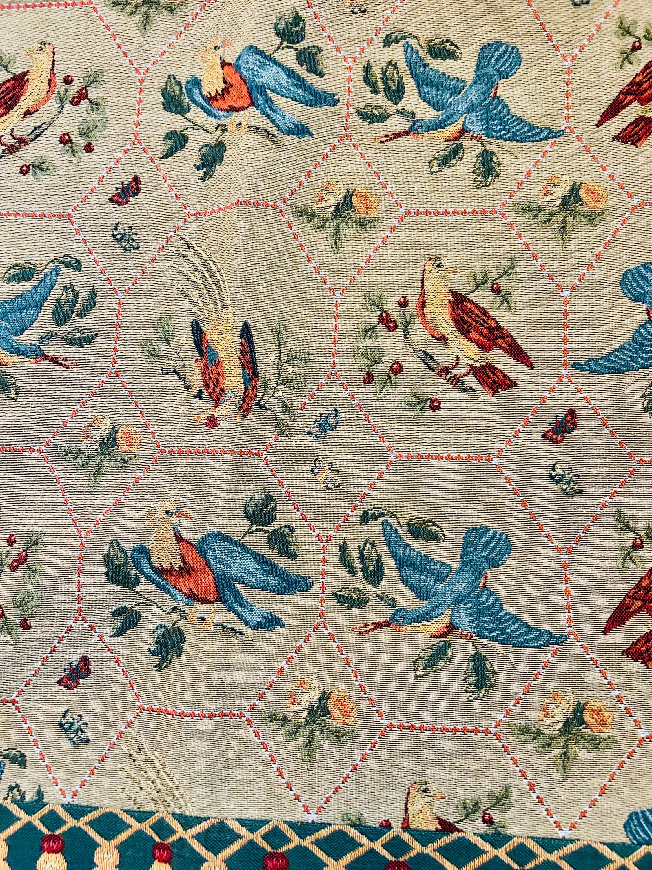 • Manufacturer: Iosis Paris – La Maison Collection • Country of Origin: France • Era: 1990s • Dimensions: 55” x 60” • Material: Heavy jacquard-woven cotton blend • Construction: High-density woven tapestry with finished border and backing • Design: Bird and floral hexagonal lattice with decorative border • Weight: Substantial, upholstery-grade feel
