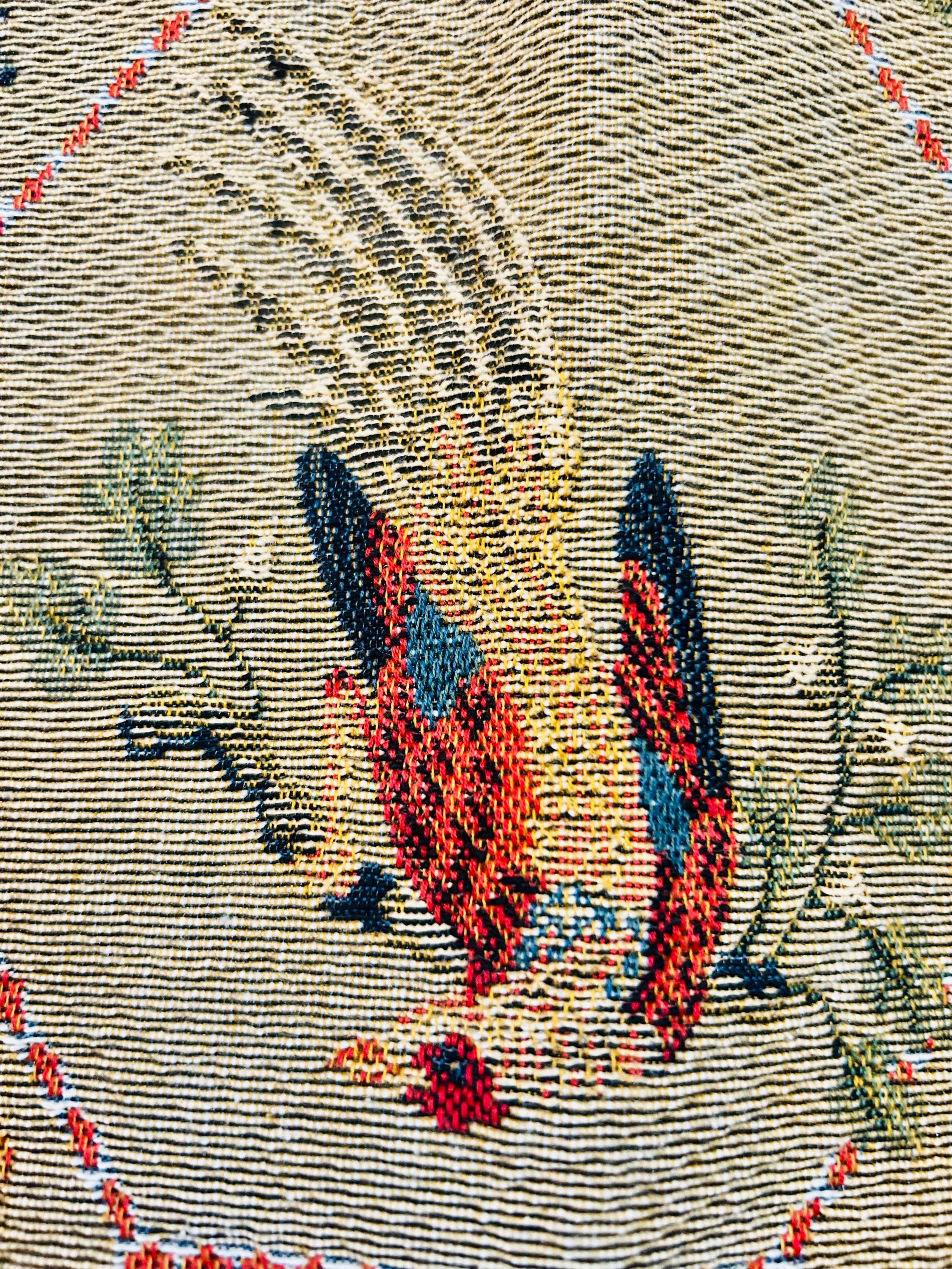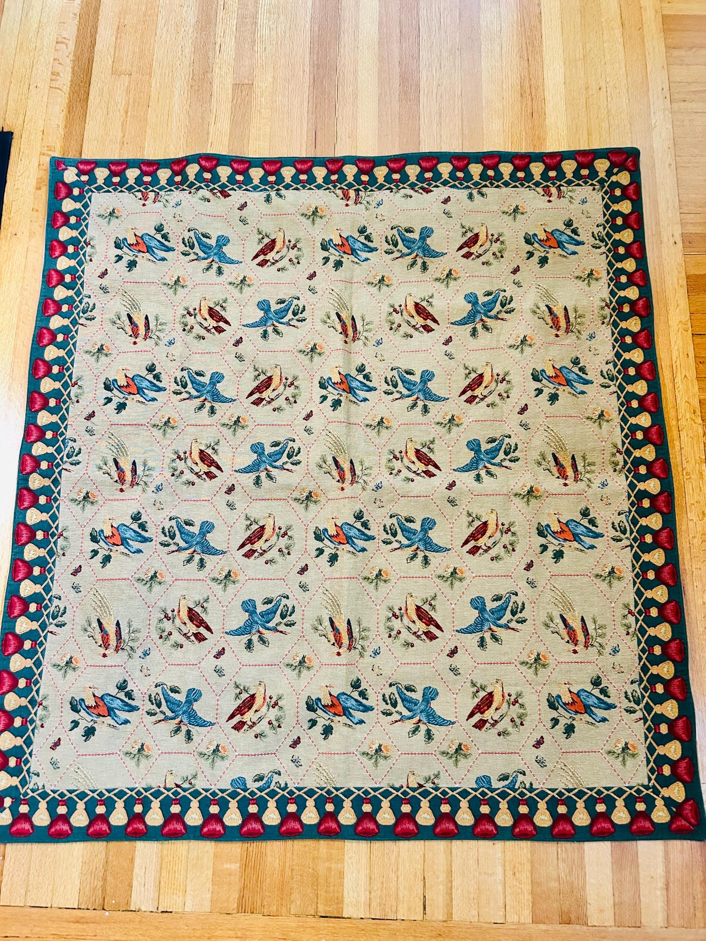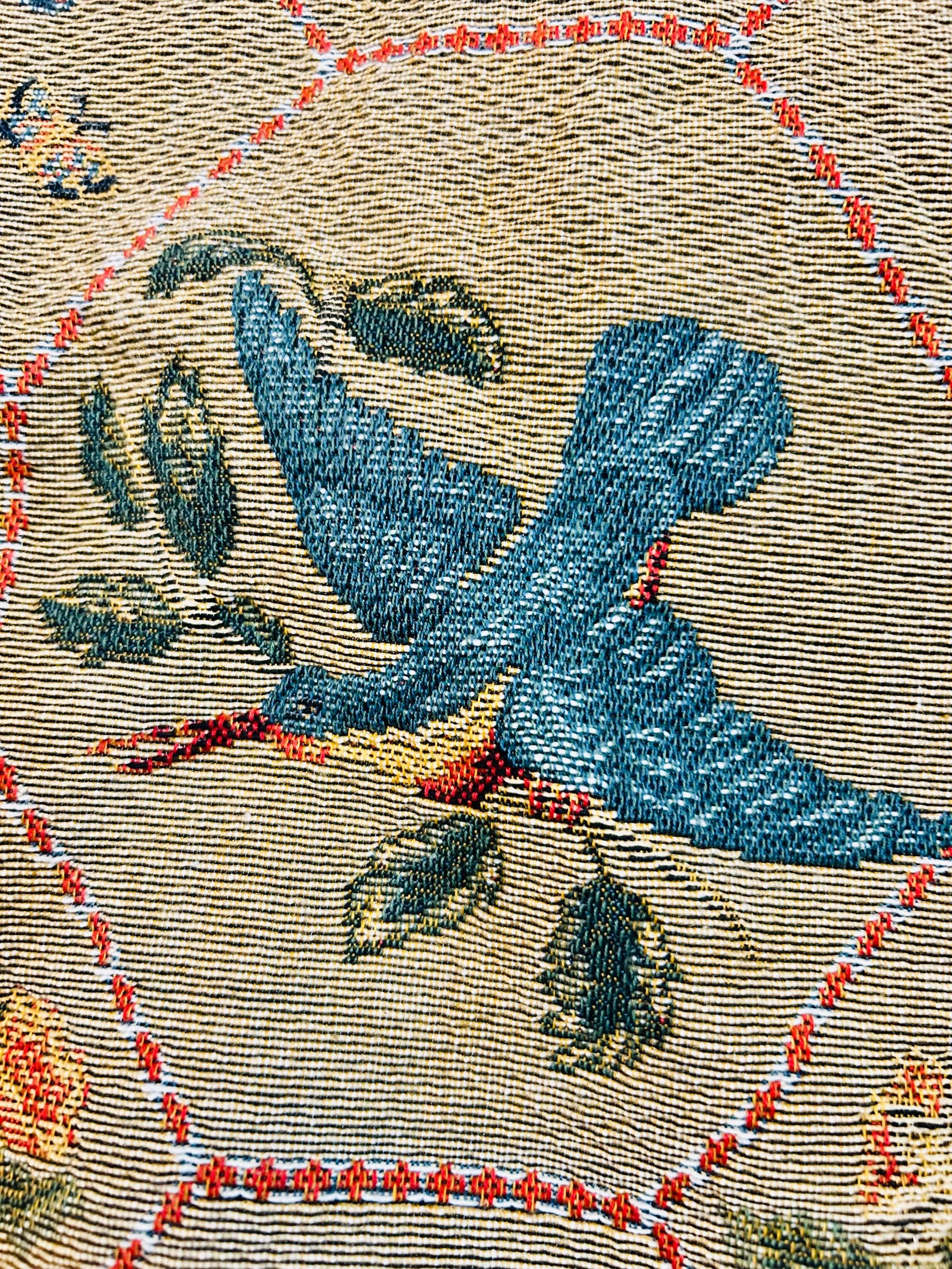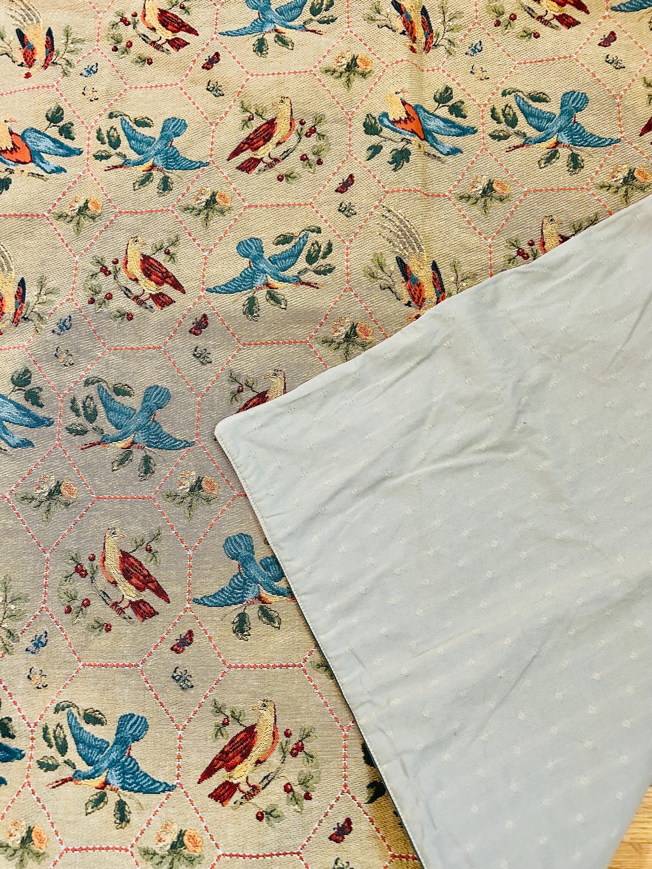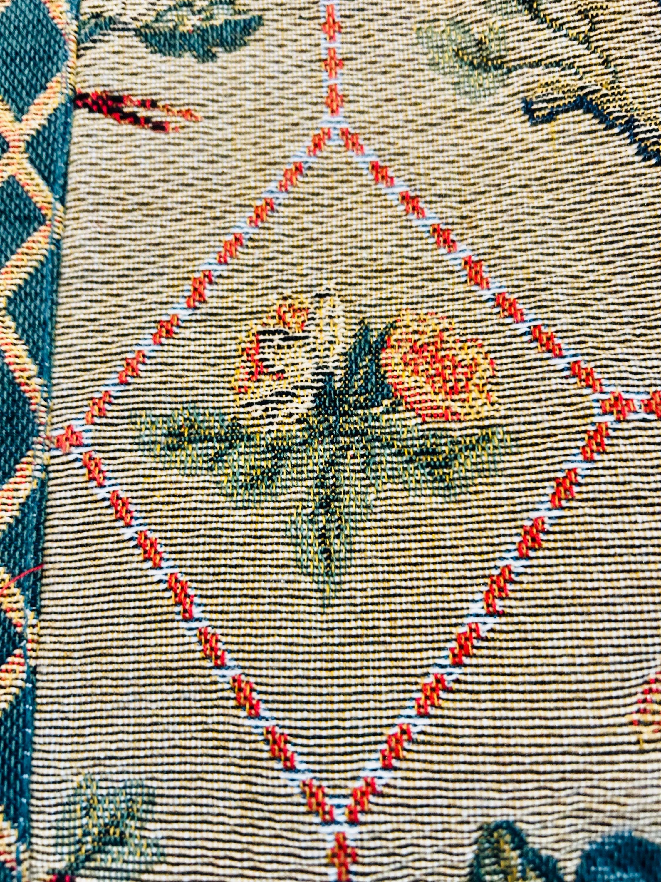 • Manufacturer: Iosis Paris – La Maison Collection • Country of Origin: France • Era: 1990s • Dimensions: 55” x 60” • Material: Heavy jacquard-woven cotton blend • Construction: High-density woven tapestry with finished border and backing • Design: Bird and floral hexagonal lattice with decorative border • Weight: Substantial, upholstery-grade feel