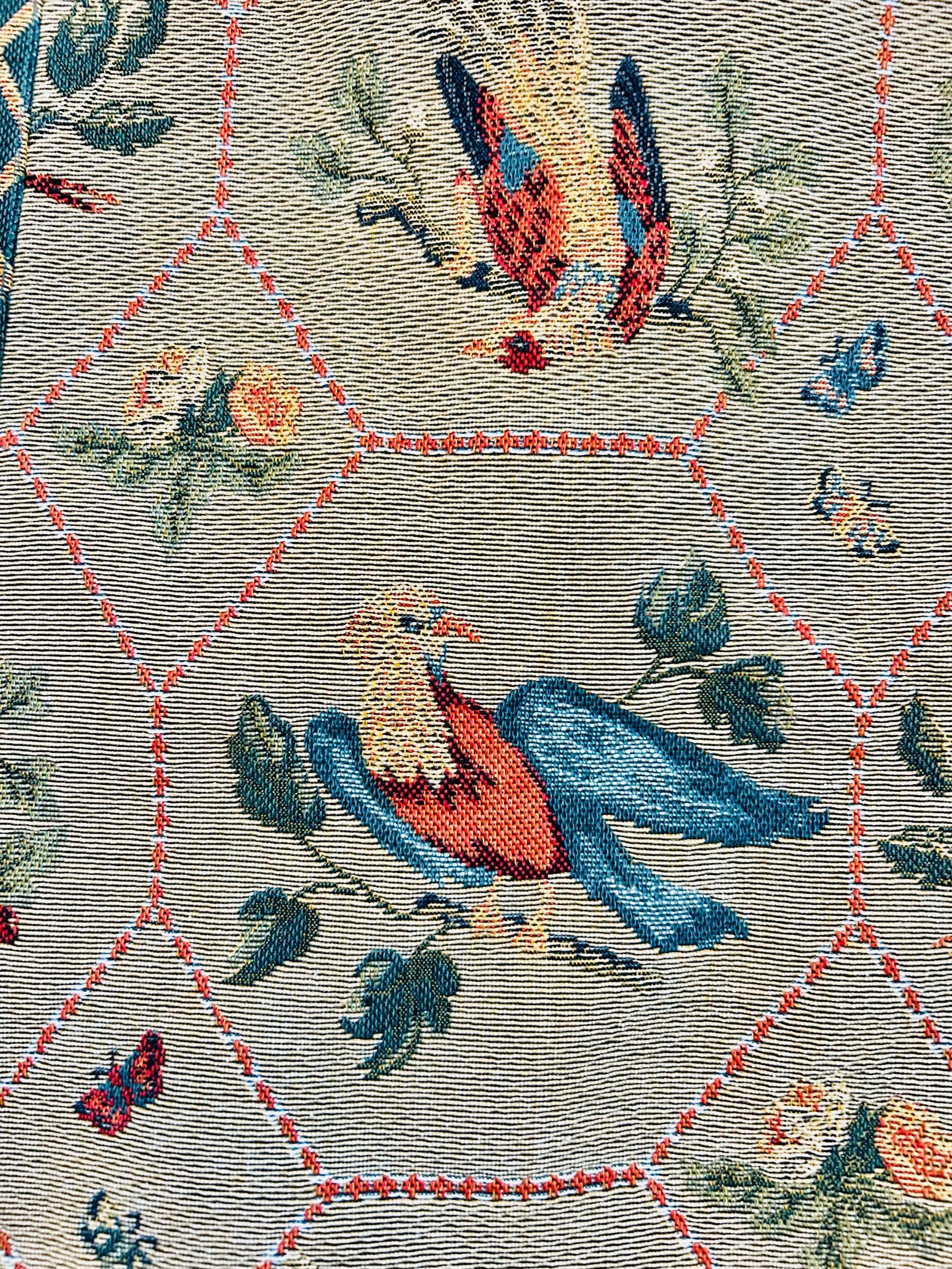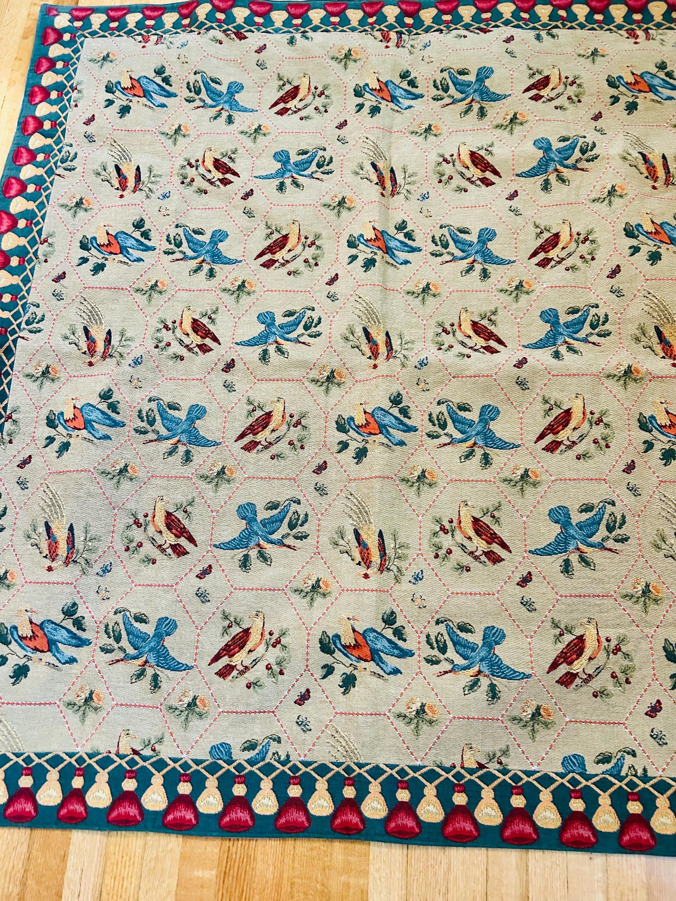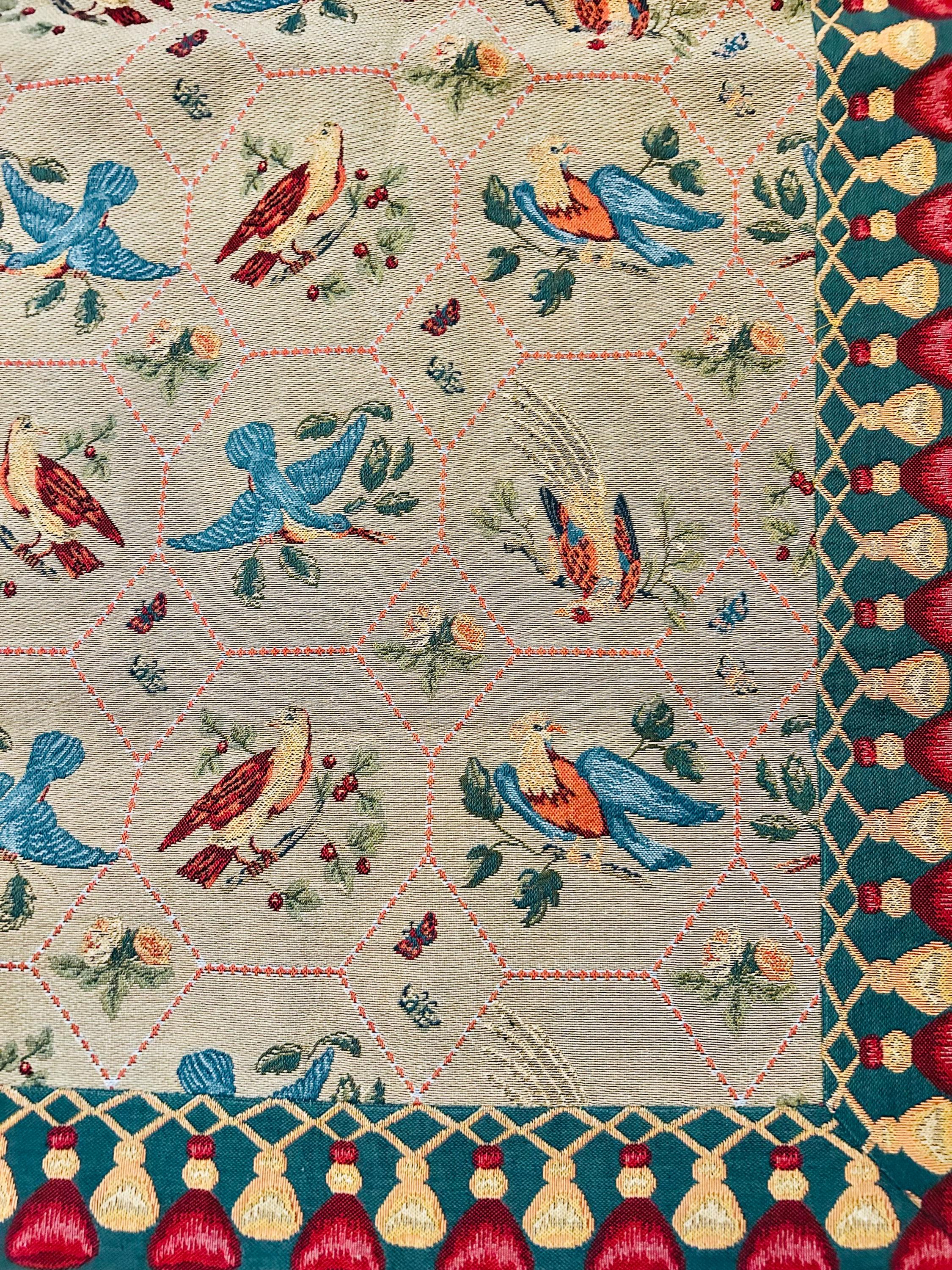This piece is densely woven, with the kind of weight and body associated with traditional French jacquard loom production. The intricate bird and lattice design is woven directly into the textile — not printed — and the hexagonal lattice frames stylized birds, florals, and berry motifs in teal, coral, cream, and red tones, finished with a bold geometric border. The back is a clean woven cotton backing with original “Made in France” label intact.