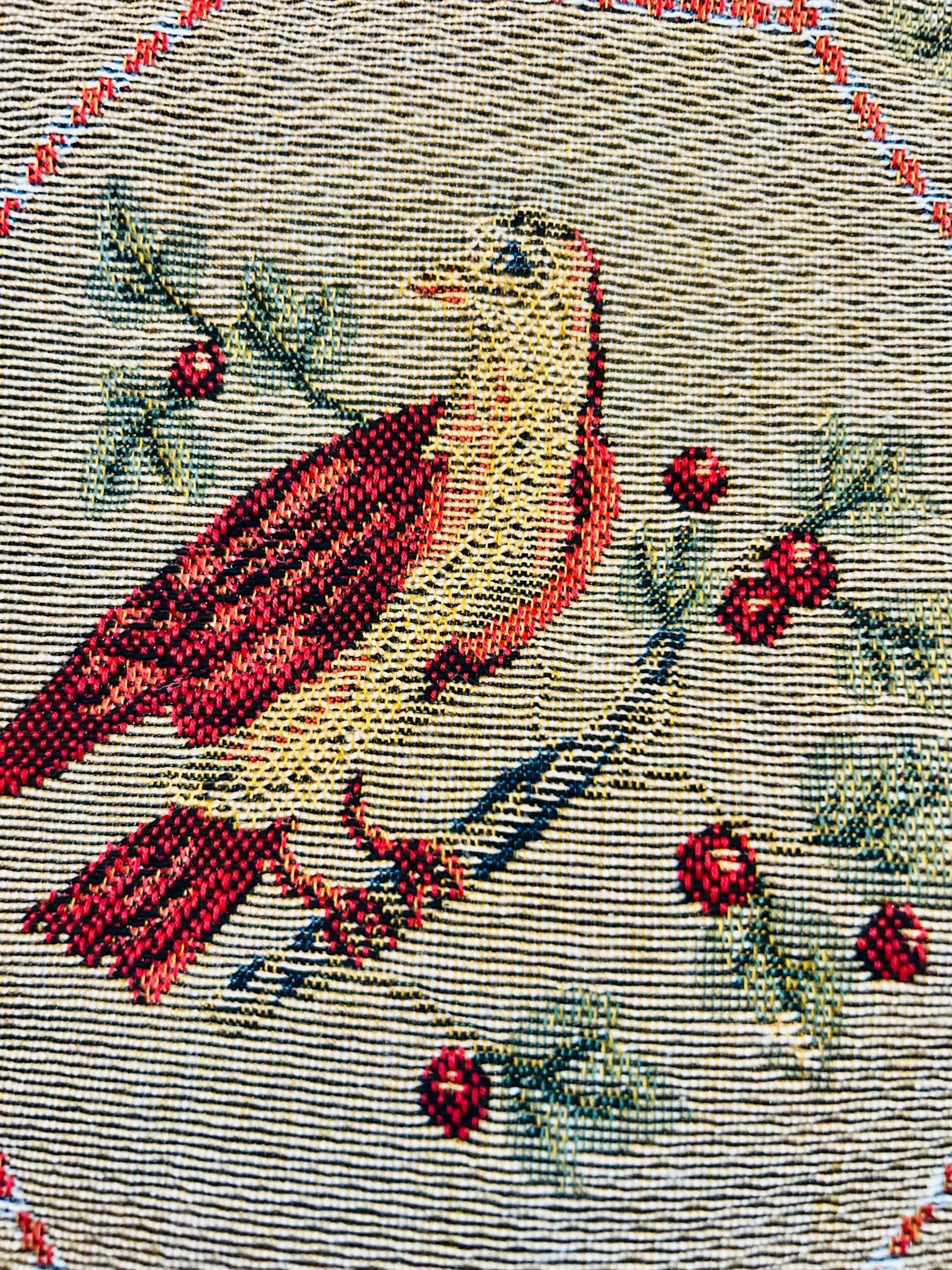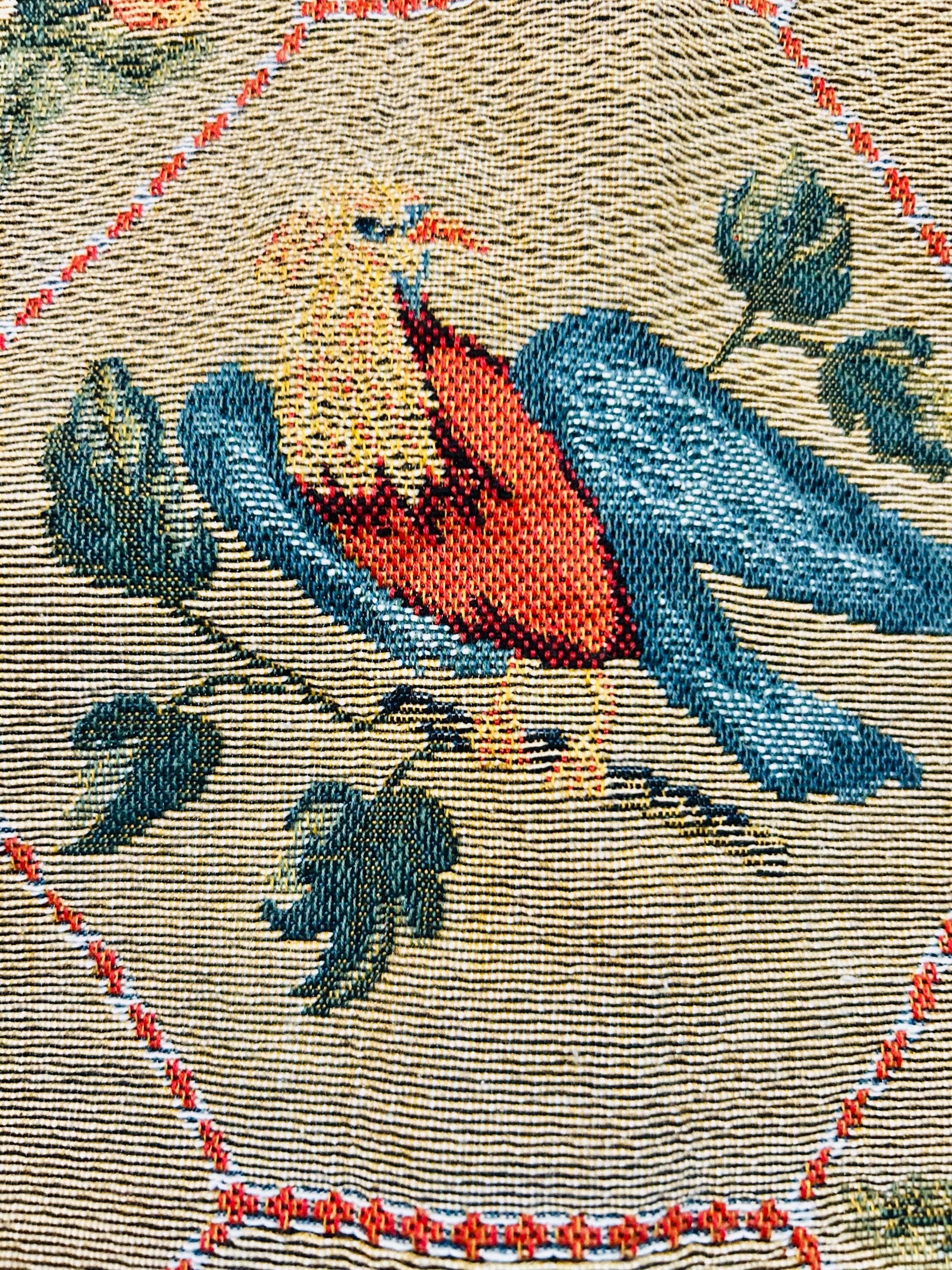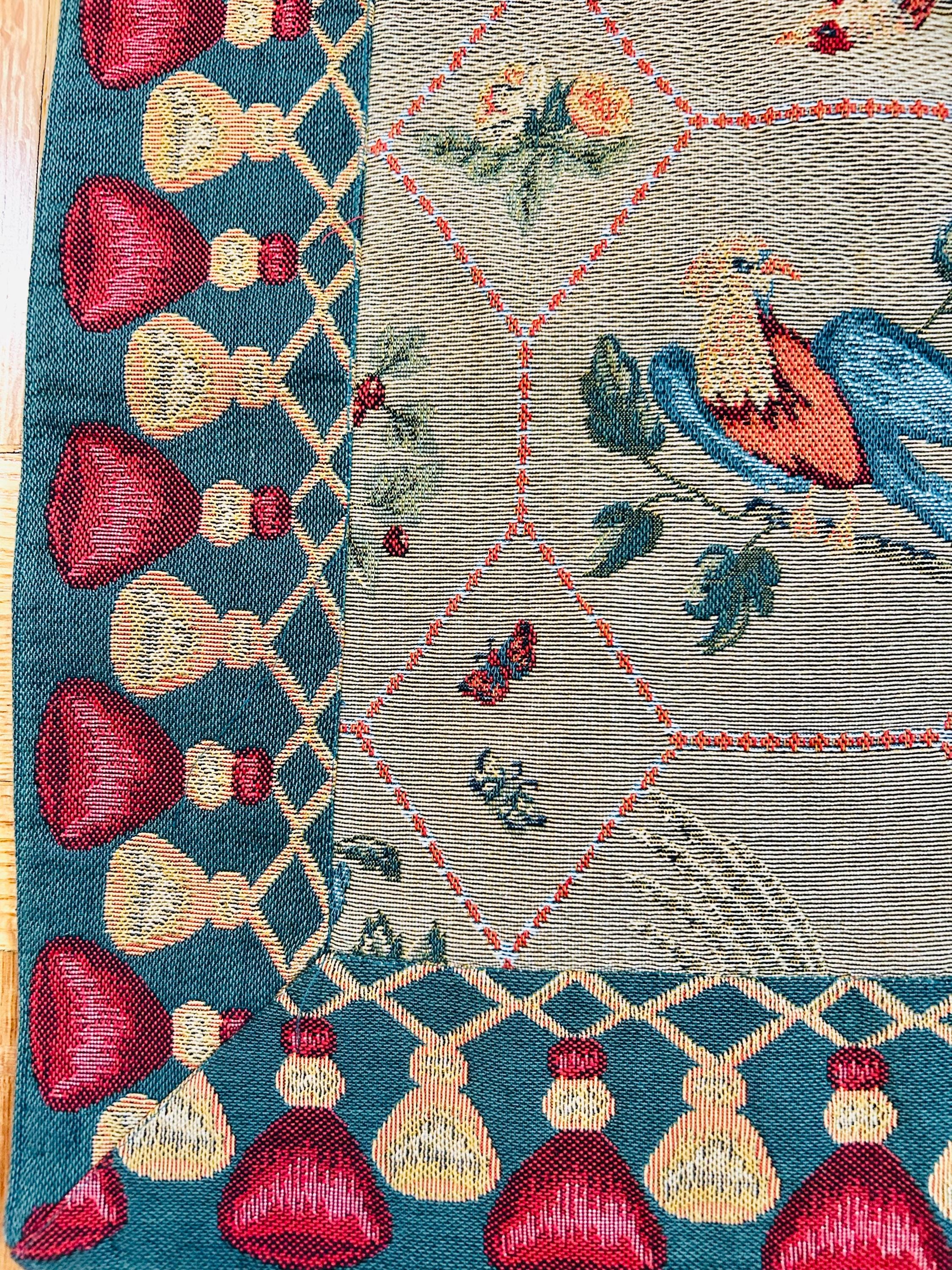 This piece is densely woven, with the kind of weight and body associated with traditional French jacquard loom production. The intricate bird and lattice design is woven directly into the textile — not printed — and the hexagonal lattice frames stylized birds, florals, and berry motifs in teal, coral, cream, and red tones, finished with a bold geometric border. The back is a clean woven cotton backing with original “Made in France” label intact.